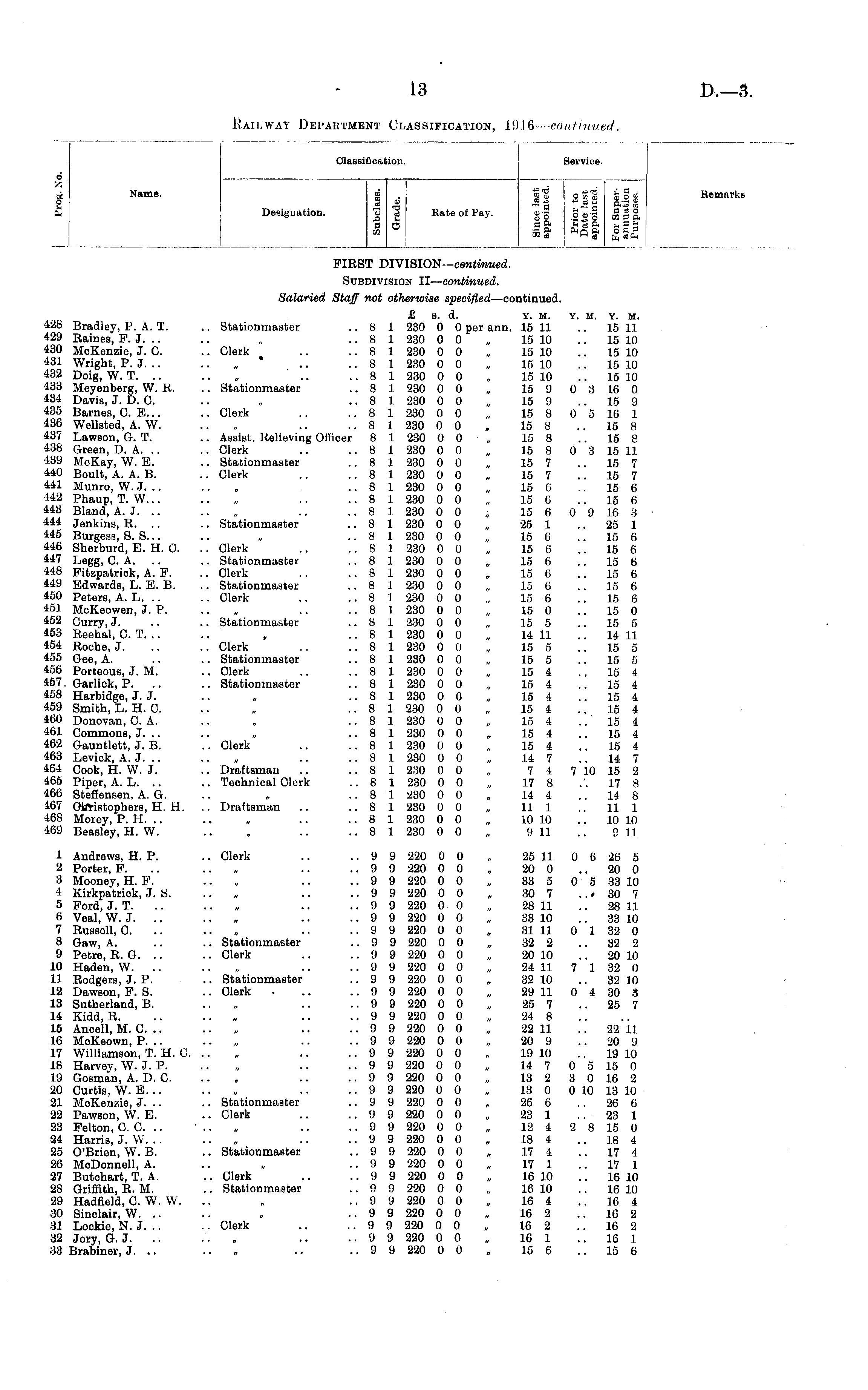 Classification. S Service. Classification. Service. uiassmcation. t d ,—_ A oi Name. % . gl S ™ £, -a a Designation. o « Rate of Pay. cj 5 3 a a a * ag 1 6 A ah p a t2 03 ,=. rr! .13S S o»S So» SB .3 "car. o-rOJ — ry S3 r a« so » .5 b't 3 3SO So 0 e 3 co 5 a a a > a a ■-. I B =a a q a oS3 01 ce ih g £ <*a service. S lf Hi a „ 3 3*0 003 co a a {13 a his ao a o 33 w ac fc, aa Remarks FIRST DIVISION— continued. Subdivision II— continued. Salaried Staff not otherwise specified —continued. £ s. d. Y. M. 428 Bradley, P. A. T. .. Stationmaster .. 8 1 230 0 0 per ann. 15 11 429 Raines, P. J. .. .. „ .. 8 1 230 0 0 „ 15 10 430 McKenzie, J. C. .. Clerk .. .. 8 1 230 0 0 „ 15 10 431 Wright, P. J. .. .. , .. .. 8 1 230 0 0 „ 15 10 432 Doig, W. T. .. .. „ .. .. 8 1 230 0 0 „ 15 10 433 Meyenberg, W. R. .. Stationmaster .. 8 1 230 0 0 „ 15 9 434 Davis, J. D. C. .. „ .. 8 1 230 0 0 15 9 435 Barnes, O. E... .. Clerk .. .. 8 1 230 0 0 „ 15 8 436 Wellsted, A. W. .. „ .. .. 8 1 230 0 0 „ 15 8 437 Lawson, G. T. .. Assist. Relieving Officer 8 1 230 0 0 „ 15 8 438 Green, D. A. .. .. Clerk .. .. 8 1 230 0 0 „ 15 8 439 McKay, W. E. .. Stationmaater .. 8 1 230 0 0 „ 15 7 440 Boult, A. A. B. .. Clerk .. .. 8 1 230 0 0 „ 15 7 441 Munro, W.J... .. „ .. 8 1 230 0 0 „ 15 6 442 Phaup, T. W... .. „ .. .. 8 1 230 0 0 „ 15 6 443 Bland, A. J. .. .. „ .. .. 8 1 230 0 0 „ 15 6 444 Jenkins, R. .. .. Stationmaster .. 8 1 230 0 0 „ 25 1 445 Burgess, S. S... .. „ .. 8 1 230 0 0 15 6 446 Sherburd, E. H. C. .. Clerk .. .. 8 1 230 0 0 „ 15 6 447 Legg, C. A. .. .. Stationmaster .. 8 1 230 0 0 „ 15 6 448 Fitzpatriok, A. F. .. Olerk .. .. 8 1 230 0 0 „ 15 6 449 Edwards, L. E. B. .. Stationmaster .. 8 1 230 0 0 „ 15 6 450 Peters, A. L. .. .. Olerk .. .. 8 1 230 0 0 „ 15 6 451 MoKeowen, J. P. .. „ .. .. 8 1 230 0 0 „ 15 0 452 Curry, J. .. .. Stationmaster .. 8 1 230 0 0 „ 15 5 453 Reehal, C. T. .. .. , .. 8 1 230 0 0 14 11 454 Roche, J. .. .. Clerk .. .. 8 1 230 0 0 „ 15 5 455 Gee, A. .. .. Stationmaster .. 8 1 230 0 0 „ 15 5 456 Porteous, J. M. .. Clerk .. .. 8 1 230 0 0 „ 15 4 457. Garlick, P. .. Stationmaster .. 8 1 230 0 0 „ 15 4 458 Harbidge, J. J. .. „ .. 8 1 230 0 0 „ 15 4 459 Smith, L. H. C. .. „ .. 8 1 230 0 0 15 4 460 Donovan, C. A. .. „ .. 8 1 230 0 0 „ 15 4 461 Commons, J. .. .. „ ..81 230 0 0 „ 15 4 462 Gauntlett, J. B. .. Clerk .. .. 8 1 230 0 0 „ 15 4 463 Leviok, A. J. .. .. „ .. .. 8 1 230 0 0 „ 14 7 464 Cook, H. W. 3. .. Draftsman .. .. 8 1 230 0 0 „ 7 4 465 Piper, A. L. .. .. Technical Clerk .. 8 1 230 0 0 „ 17 8 466 Stefiensen, A. G. .. „ .. 8 1 230 0 0 14 4 467 Ota-istophers, H. H. .. Draftsman .. .. 8 1 230 0 0 „ 11 1 468 Morey, P. H. .. .. „ .. .. 8 1 230 0 0 „ 10 10 469 Beaaley, H. W. .. „ .. .. 8 1 230 0 0 9 11 Y. M. Y. M. .. 15 11 .. 15 10 15 10 .. 15 10 .. 15 10 0 3 16 0 .. 15 9 0 5 16 1 .. 15 8 .. 15 8 0 3 15 11 15 7 .. 15 7 15 6 .. 15 6 0 9 16 8 .. 25 1 .. 15 6 .. 15 6 .. 15 6 .. 15 6 15 6 15 6 .. 15 0 .. 15 5 .. 14 11 .. 15 5 15 5 .. 15 4 .. 15 4 15 4 15 4 15 4 .. 15 4 .. 15 4 14 7 7 10 15 2 17 8 14 8 11 1 10 10 9 11 1 Andrews, H. P. .. Clerk .. .. 9 9 220 0 0 „ 25 11 2 Porter, P. .. „ .. .. 9 9 220 0 0 „ 20 0 3 Mooney, H. P. .. „ .. .. 9 9 220 0 0 33 5 4 Kirkpatriok, J. S. .. „ .. .. 9 9 220 0 0 » 30 7 5 Ford, 3. T. ... .. .. 9 9 220 0 0 „ 28 11 6 Veal, W. J. .. .. , .. .. 9 9 220 0 0 „ 33 10 7 Russell, C. .. .. „ .. .. 9 9 220 0 0 » 31 11 8 Gaw, A. .. .. Stationmaster .. 9 9 220 0 0 „ 32 2 9 Petre, R. G. .. .. Clerk .. .. 9 9 220 0 0 „ 20 10 10 Haden, W. .. .. „ .. .. 9 9 220 0 0 „ 24 11 11 Rodgers, J. P. .. Stationmastor .. 9 9 220 0 0 „ 32 10 12 Dawson, P. S. .. Clerk ■ .. .. 9 9 220 0 0 „ 29 11 13 Sutherland, B. .. „ .. .. 9 9 220 0 0 „ 25 7 14 Kidd, R. .. .. „ .. .. 9 9 220 0 0 „ 24 8 15 Anoell, M. C. .. .. „ .. .. 9 9 220 0 0 „ 22 11 16 McKeown, P. .. .. „ .. .. 9 9 220 0 0 , 20 9 17 Williamaon, T. H. O. .. „ .. .. 9 9 220 0 0 „ 19 10 18 Harvey, W. J. P. .. „ .. .. 9 9 220 0 0 „ 14 7 19 Gosman, A. D. C. .. „ .. .. 9 9 220 0 0 „ 13 2 20 Curtis, W. E... .. „ .. .. 9 9 220 0 0 „ 13 0 21 MoKenzie, J. .. .. Stationmaster ..99 220 0 0 26 6 22 Pawson, W. E. .. Clerk .. .. 9 9 220 0 0 , 23 1 23 Felton, O. C. .. • .. , .. .. 9 9 220 0 0 „ 12 4 24 Harris, J. W. .. .. „ .. .. 9 9 220 0 0 „ 18 4 25 O'Brien, W. B. .. Stationmaster .. 9 9 220 0 0 „ 17 4 26 McDonnell, A. .. „ .. 9 9 220 0 0 „ 17 1 27 Butohart, T. A. .. Clerk .. .. 9 9 220 0 0 „ 16 10 28 Griffith, R. M. .. Stationmaster .. 9 9 220 0 0 „ 16 10 29 Hadiield, C. W. W. .. „ ..99 220 0 0 16 4 30 Sinclair, W. .. .. „ .. 9 9 220 0 0 „ 16 2 31 Lookie, N. J. .. .. Clerk .. .. 9 9 220 0 0 „ 16 2 32 Jory, G. J. .. .'. .. • • 9 9 220 0 0 16 1 33 Brabiner, J. .. .. „ .. .. 9 9 220 0 0 „ 15 6 0 6 26 5 .. 20 0 0 5 33 10 ..» 30 7 28 11 .. 33 10 0 1 32 0 32 2 20 10 7 1 32 0 .. 32 10 0 4 30 3 .. 25 7 .. 22'il. 20 9 .. 19 10 0 5 15 0 3 0 16 2 0 10 13 10 .. 26 6 .. 23 1 2 8 15 0 18 4 17 4 .. 17 1 .. 16 10 .. 16 10 16 4 16 2 16 2 .. 16 1 15 6