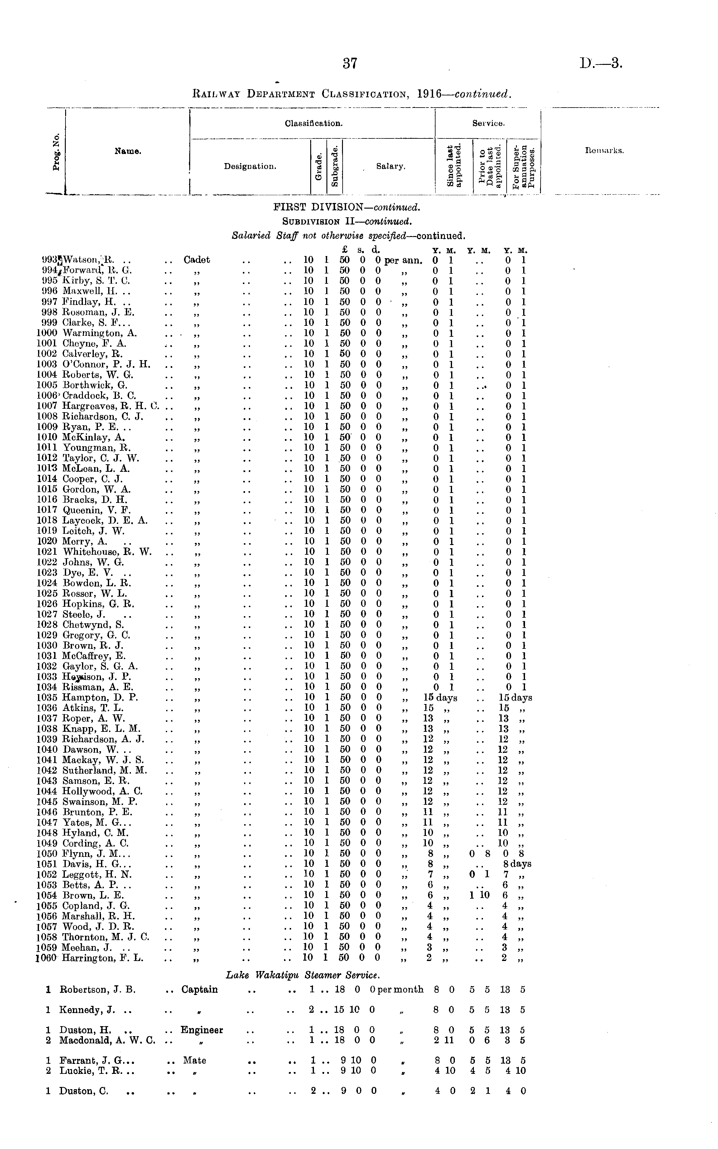 Classification. Service. d as Name. . » « a- & o« g £ * ~ S ? * £ ft~ £ p4 Designation. ■& & Salary. g'g 00-3 5 3 ft __[ j_ 5 1 i! Eai jail d ai o At : Remarks. FIRST DIVISION— continued. Subdivision II— continued. Salaried Staff not otherwise specified —continued. £ s. d. Y. m. Y. M. Y. M. 993JJWatson, R. .. .. Cadot .. .. 10 1 50 0 0 por ann. 0 1 .. 0 1 994jForwanC R. C. .. „ .. .. 10 1 50 0 0 „ 0 1 .. 0 1 995 Kjrby, S. T. C. .. „ .. .. 10 1 50 0 0 „ 0 1 .. 0 1 996 Maxwell, II. .. .. „ .. .. 10 1 50 0 0 „ 0 1 .. 0 1 997 Findlay, H. .. .. „ .. .. 10 1 50 0 0 ■ „ 0 1 .. 0 1 998 Rosoman, J. E. .. „ .. .. 10 1 50 0 0 „ 0 1 .. 0 1 999 Clarke, S. F... .. „ .. .. 10 1 50 0 0 „ 0 1 .. 0 1 1000 Warmington, A. .. .. 10 1 50 0 0 „ 0 1 .. 0 1 1001 Choyne, F. A. .. „ .. .. 10 1 50 0 0 „ 0 1 .. 0 1 1002 Calvorley, R. .. „ .. .. 10 1 50 0 0 „ 0 1 .. 0 1 1003 O'Connor, P. J. H. .. „ .. .. 10 1 50 0 0 „ 0 1 .. 0 1 1004 Roberts, W. G. .. „ .. .. 10 1 50 0 0 „ 0 1 .. 0 1 1005 Borthwick, G. .. „ .. .. 10 1 50 0 0 „ 0 1 ... 0 1 1006'Craddoek, B. C. .. „ .. .. 10 I 50 0 0 „ 0 1 .. 0 1 1007 Hargroaves, R. H. C. .. „ .. .. 10 I 50 0 0 „ 0 1 .. 0 1 1008 Richardson, C. J. .. „ .. .. 10 1 50 0 0 „ 0 1 .. 0 1 1009 Ryan, P. E. .. .. „ .. .. 10 I 50 0 0 „ 0 1 .. 0 1 1010 McKinlay, A. .. „ .. .. 10 1 50 0 0 „ 0 1 .. 0 1 1011 Youngman, R. .. „ .. .. 10 1 50 0 0 „ 0 1 .. 0 1 1012 Taylor, C. J. W. .. „ .. .. 10 1 50 0 0 „ 0 1 .. 0 1 10113 McLean, L. A. .. „ .. .. 10 1 50 0 0 „ 0 1 .. 0 1 1014 Cooper, C. J. .. „ .. .. 10 1 50 0 0 „ 0 1 .. 0 1 1015 Gordon, W. A. .. „ .. .. 10 I 50 0 0 „ 0 1 .. 0 1 1016 Bracks, D. H. .. „ .. .. 10 I 50 0 0 „ 0 1 .. 0 1 1017 Quoenin, V. F. .. „ .. .. 10 1 50 0 0 „ 0 1 .. 0 1 1018 Laycock, D. E. A. .. „ .. .. 10 1 50 0 0 „ 0 1 .. 0 1 1019 Loitch, J. W. .. „ .. .. 10 I 50 0 0 „ 0 1 .. 0 1 1020 Morry, A. .. .. „ .. .. 10 1 50 0 0 „ 0 1 .. 0 1 1021 Whitohouso, R. W. .. „ .. .. 10 I 50 0 0 „ 0 1 .. 0 1 1.022 Johns, W. G. .. „ .. .. 10 1 50 0 0 „ 0 1 .. 0 1 1023 Dye, E. V. .. .. „ .. .. 10 1 50 0 0 „ 0 1 .. 0 1 1024 Bowdon, L. R. .. „ .. .. 10 1 50 0 0 „ 0 1 .. 0 1 1025 Rossor, W. L. .. „ .. .. 10 1 50 0 0 „ 0 1 .. 0 1 1026 Hopkins, G. R. .. „ .. .. 10 1 50 0 0 „ 0 1 .. 0 1 1027 Steelo, J. • • ■ • „ .. .. 10 1 50 0 0 „ 0 1 .. 0 1 1028 Chetwynd, S. .. „ .. .. 10 1 50 0 0 „ 0 1 .. 0 1 1029 Grogory, G. C. .. „ .. .. 10 1 50 0 0 „ 0 1 .. 0 1 1030 Brown, R. J. .. „ .. .. 10 1 50 0 0 „ 0 1 .. 0 1 1031 McCaffrey, E. .. „ .. .. 10 1 50 0 0 „ 0 1 .. 0 1 1032 Gaylor, S. G. A. .. „ .. .. 10 1 50 0 0 „ 0 1 .. 0 1 1033 Httjsison, J. P. .. „ .. .. 10 1 50 0 0 „ 0 1 .. 0 1 1034 Rissman, A. E. .. „ .. .. 10 1 50 0 0 „ 0 1 .. 0 1 1035 Hampton, D. P. .. „ .. .. 10 1 50 0 0 „ 15 days .. 15 days 1036 Atkins, T. L. .. „ .. .. 10 1 50 0 0 „ 15 „ ..15 ,', 1037 Roper, A. W. .. „ .. .. 10 1 50 0 0 „ 13 „ .. 13 „ 1038 Knapp, E. L. M. .. „ .. .. 10 1 50 0 0 „ 13 „ .. 13 „ 1039 Richardson, A. J. .. „ .. ■„ 10 1 JO 0 0 „ 12 „ .. 12 „ 1040 Dawson, W. .. .. „ .. .. 10 1 50 0 0 „ 12 „ .. 12 „ 1041 Mackay, W. J. S. .. „ .. .. 10 1 50 0 0 „ 12 „ .. 12 „ 1042 Sutherland, M. M. .. „ .. .. 10 1 50 0 0 „ 12 „ .. 12 „ 1043 Samson, E. R. .. „ .. .. 10 1 50 0 0 „ 12 „ .. 12 „ 1044 Hollywood, A. C. .. „ .. .. 10 1 50 0 0 „ 12 „ .. 12 „ 1045 Swainson, M. P. .. „ .. .. 10 1 50 0 0 „ 12 „ .. 12 „ 1046 Brunton, P. E. .. „ .. .. 10 1 50 0 0 „ 11 „ .. 11 „ 1047 Yates, M. G... .. „ .. .. 10 1 50 0 0 „ 11 „ .. 11 „ 1048 Hyland, CM. .. „ .. .. 10 1 50 0 0 „ 10 „ .. 10 „ 1049 Cording, A. C. .. „ .. .. 10 1 50 0 0 „ 10 „ .. 10 „ 1050 Flynn, J. M... .. „ .. .. 10 1 50 0 0 „ 8 „ 0 8 0 8 1051 Davis, H. G... .. „ .. .. 10 1 50 0 0 „ 8 „ .. 8 days 1052 Leggott, H. N. .. „ .. .. 10 1 50 0 0 „ 7 „ 0 17,, 1053 Betts, A. P. .. .. „ .. .. 10 1 50 0 0 „ 6 ,, .. 6 „ 1054 Brown, L. E. .. „ .. .. 10 1 50 0 0 „ 6 „ 1 10 6 „ 1055 Copland, J. G. .. „ .. .. 10 1 50 0 0 „ 4 „ .. 4 „ 1056 Marshall, R. H. .. „ .. .. 10 1 50 0 0 „ 4 „ .. 4 „ 1057 Wood, J. D. R. .. „ .. .. 10 1 50 0 0 „ 4 „ .. 4 „ 1058 Thornton, M. J. C. .. „ .. .. 10 1 50 0 0 „ 4 „ .. 4 „ 1059 Meehan, J. .. .. „ .. .. 10 1 50 0 0 „ 3 „ .. 3 „ 1060 Harrington, F. L. .. „ .. .. 10 1 50 0 0 „ 2 „ .. 2 „ Lake Wakatipu Steamer Service. 1 Robertson, J. B. .. Captain .. .. 1 .. 18 0 0 per month 8 0 5 5 13 5 1 Kennedy, J. .. .. , .. .. 2 .. 15 10 0 „ 8 0 5 5 13 5 1 Duston, H. .. .. Engineer .. .. 1 .. 18 0 0 „ 8 0 5 5 13 5 2 Macdonald, A. W. C. .. „ .. .. 1 .. 18 0 0 „ 2 11 0 6 3 5 1 Farrant, J. G... .. Mate .. .. 1 .. 9 10 0 , 8 0 5 5 13 5 2 Luokie, T. R. .. .. „ .. .. 1 .. 9 10 0 , 4 10 4 5 4 10 1 Duston, C. .. .. .. ..2.. 900 „ 402140