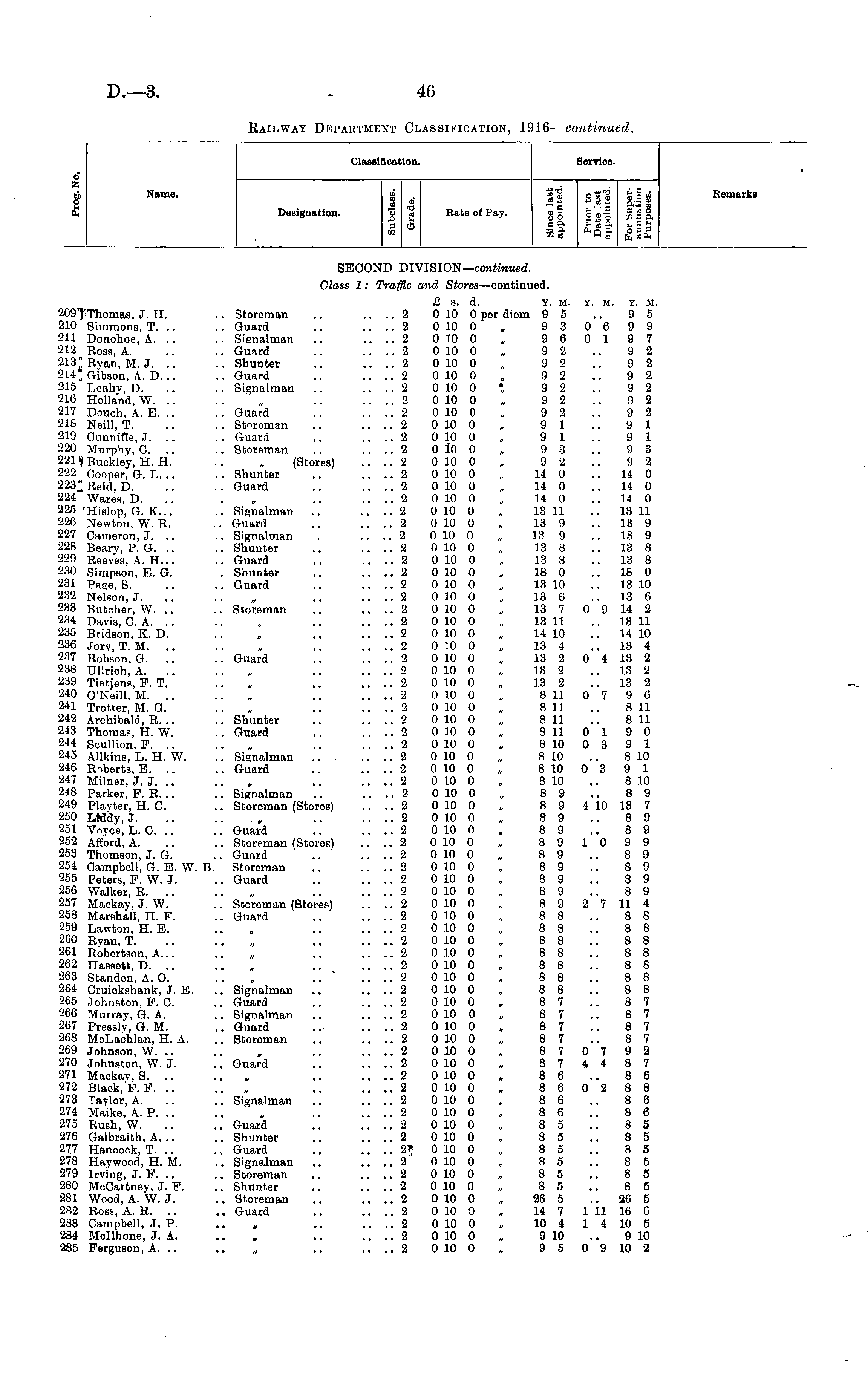 Classiflcal lien. Service. d tic o E ft • ~" a a ?- 39 d «4 O 05 05 9 S '3 ft,|ft W CO Ill fl *o o 5C d a .. a v. o a fl 4,3ft Remarks Name. Designation. a B CO 6 Rate of Pay. SECOND DIVISION— continued. Class 1: Traffic and Stores —continued. £ a. d. Y. M. 209y.Thomas, J. H. .. Storeman .. .... 2 0 10 0 per diem 9 5 210 Simmons, T. .. .. Guard .. ....2 0 10 0 „ 93 211 Donohoe, A. .. .. Sienalman .. .... 2 0 10 0 „ 96 212 Ross, A. .. .. Guard .. .... 2 0 10 0 „ 92 Ryan, M. J. .. .. Shunter .. .... 2 0 10 0 „ 9 2 Gibson, A. D. .. .. Guard .. ....2 0 10 0 „ 92 215 Leahy, D. .. .. Signalman .. .... 2 0 10 0 * 9 2 216 Holland, W. .. .. „ .. .... 2 0 10 0 „ 92 217-Demon, A. E. .. .. Guard .. .... 2 0 10 0 „ 9 2 218 Neill, T. .. .. Storeman .. .... 2 0 10 0 „ 91 219 Cunniffe, J. .. .. Guard .. .... 2 0 10 0 „ 9 1 220 Murphy, C. .. .. Storeman .. .... 2 0 10 0 „ 93 221 ■! Buckley, H. H. .. „ (Stores) .. ..2 0 10 0 „ 9 2 222 Cooper, G. L. .. .. Shunter .. .... 2 0100 „ 14 0 Reid, D. .. . Guard .. .... 2 0 10 0 „ 14 0 224 Wares, D. .. .. „ .. .... 2 0 10 0 „ 14 0 225 'Hislop, G. K... .. Signalman .. .. ..2 0 10 0 „ 13 11 220 Newton, W. R. .. Guard .. .... 2 0 10 0 „ 13 9 227 Cameron, J. .. .. Signalman .. .... 2 0 10 0 „ 13 9 228 Beary, P. G. .. .. Shunter .. .... 2 0 10 0 „ 13 8 229 Reeves, A. H... .. Guard .. .... 2 0 10 0 „ 138 230 Simpson, E. G. .. Shunter .. .... 2 0 10 0 „ 18 0 231 Paee, S. .. .. Guard .. .... 2 0 10 0 „ 13 10 232 Nelson, J. .. .. „ .. .... 2 0 10 0 „ 13 6 233 Butcher, W. .. .. Storeman .. .... 2 0 10 0 „ 13 7 234 Davis, C. A. .. .. „ .. .... 2 0 10 0 „ 13 11 235 Bridson, K. D. .. „ .. .... 2 0 10 0 „ 14 10 236 Jory, T. M. .. .. „ .. .... 2 0 10 0 „ 13 4 237 Robson, G. .. .. Guard .. .... 2 0 10 0 „ 13 2 238 Ullrioh, A. .. .. „ .. .... 2 0 10 0 „ 13 2 239 Tietjens, F. T. .. „ .. .... 2 0 10 0 „ 13 2 240 O'Neill, M. .. .. „ .. .... 2 0 10 0 „ 8 11 241 Trotter, M. G. .. „ .. .... 2 0 10 0 „ 8 11 242 Archibald, R. .. .. Shunter .. .. ..2 0 10 0 „ 8 11 243 Thomas, H. W. .. Guard .. .... 2 0 10 0 „ 3 11 244 Scullion, F. .. .. , .. .... 2 0 10 0 „ 8 10 245 Allkins, L. H. W. .. Signalman .. .... 2 0 10 0 „ 8 10 246 Roberts, E. .. .. Guard .. .... 2 0 10 0 „ 8 10 247 Milner, J. J. .. .. , .. .... 2 0 10 0 „ 8 10 248 Parker, F. R. .. .. Signalman .. .... 2 0 10 0 „ 89 249 Playter, H. C. .. Storeman (Stores) .... 2 0 10 0 „ 89 250 ktddy, J. .. .. „ .. ....2 0 10 0 „ 89 251 Voyee, L. C. .. .. Guard .. .... 2 0 10 0 „ 89 252 Afford, A. .. .. Storeman (Stores) .... 2 0 10 0 „ 89 253 Thomson, J. G. .. Guard .. .... 2 0 10 0 „ 89 254 Campbell, G. E. W. B. Storeman .. .... 2 0 10 0 „ 89 255 Peters, F. W.J. .. Guard .. .... 2 0 10 0 „ 89 256 Walker, R. .. .. „ .. .... 2 0 10 0 „ 89 257 Mackay, J. W. .. Storoman (Stores) .... 2 0 10 0 „ 89 258 Marshall, H. F. .. Guard .. .... 2 0 10 0 „ 88 259 Lawton, H. E. .. „ .. .... 2 0 10 0 , 88 260 Ryan, T. .. .. „ .. .... 2 0 10 0 „ 88 261 Robertson, A... .. „ .. .... 2 0 10 0 „ 8 8 262 Hassett, D. .. .. , .. .... 2 0 10 0 . 88 263 Standen, A. O. .. „ .. * .... 2 0 10 0 „ 88 264 Cruickshank, J. E. .. 8ignalman .. .... 2 0 10 0 „ 8 8 265 Johnston, F. C. .. Guard .. .... 2 0 10 0 , 8 7 266 Murray, G. A. .. Signalman .. .... 2 0 10 0 „ 87 267 Pressly, G. M. .. Guard .. .... 2 0 10 0 „ 8 7 268 McLachlan, H. A. .. Storeman .. .... 2 0 10 0 „ 87 269 Johnson, W. .. .. . .. .... 2 0 10 0 „ 87 270 Johnston, W. J. .. Guard .. .... 2 0 10 0 , 8 7 271 Mackav, S. .. .. . .. .... 2 0 10 0 , 86 272 Black.'F. F. .. .. , .. .... 2 0 10 0 . 8 6 273 Taylor, A. .. .. Signalman .. ....2 0 10 0 , 86 274 Maike, A. P. .. .. . .. .... 2 0 10 0 , 86 275 Rush, W. .. .. Guard .. .... 2 0 10 0 , 8 5 276 Galbraith, A. .. .. Shunter .. .... 2 0 10 0 „ 8 5 277 Hanooek, T. .. .. Guard .. .. .. 2T» 0 10 0 „ 8 5 278 Haywood, H. M. .. Signalman .. .... 2' 0 10 0 „ 8 5 279 Irving, J. F. .. .. Storeman .. .... 2 0 10 0 „ 85 280 McCartney, J. F. .. Shunter .. .... 2 0 10 0 , 85 281 Wood, A. W. J. .. Storeman .. .... 2 0 10 0 „ 26 5 282 Ross, A. R. .. .. Guard .. .... 2 0 10 0 „ 14 7 283 Campbell, J. P. .. , .. .... 2 0 10 0 , 10 4 284 Mcllhone, J. A. .. , .. .... 2 0 10 0 „ 9 10 285 Ferguson, A. .. .. „ .. .... 2 0 10 0 „ 9 5 Y. M. Y. M. 9 5 0 6 9 9 0 19 7 9 2 9 2 9 2 9 2 9 2 9 2 9 1 9 1 9 3 9 2 14 0 .. 14 0 14 0 13 11 13 9 .. 13 9 13 8 13 8 .. 18 0 13 10 13 6 0 9 14 2 .. 13 11 14 10 .. 13 4 0 4 13 2 .. 13 2 .. 13 2 0 7 9 6 8 11 8 11 0 19 0 0 3 9 1 8 10 0 3 9 1 8 10 8 9 4 - 10 13 7 8 9 8 9 10 9 9 8 9 8 9 8 9 8 9 2 7 11 4 8 8 8 8 8 8 8 8 8 8 8 8 8 8 8 7 8 7 8 7 8 7 0 7 9 2 4 4 8 7 8 6 0 2 8 8 8 6 8 6 8 5 8 5 8 5 8 5 8 5 8 5 .. 26 5 1 11 16 6 1 4 10 5 9 10 0 9 10 2