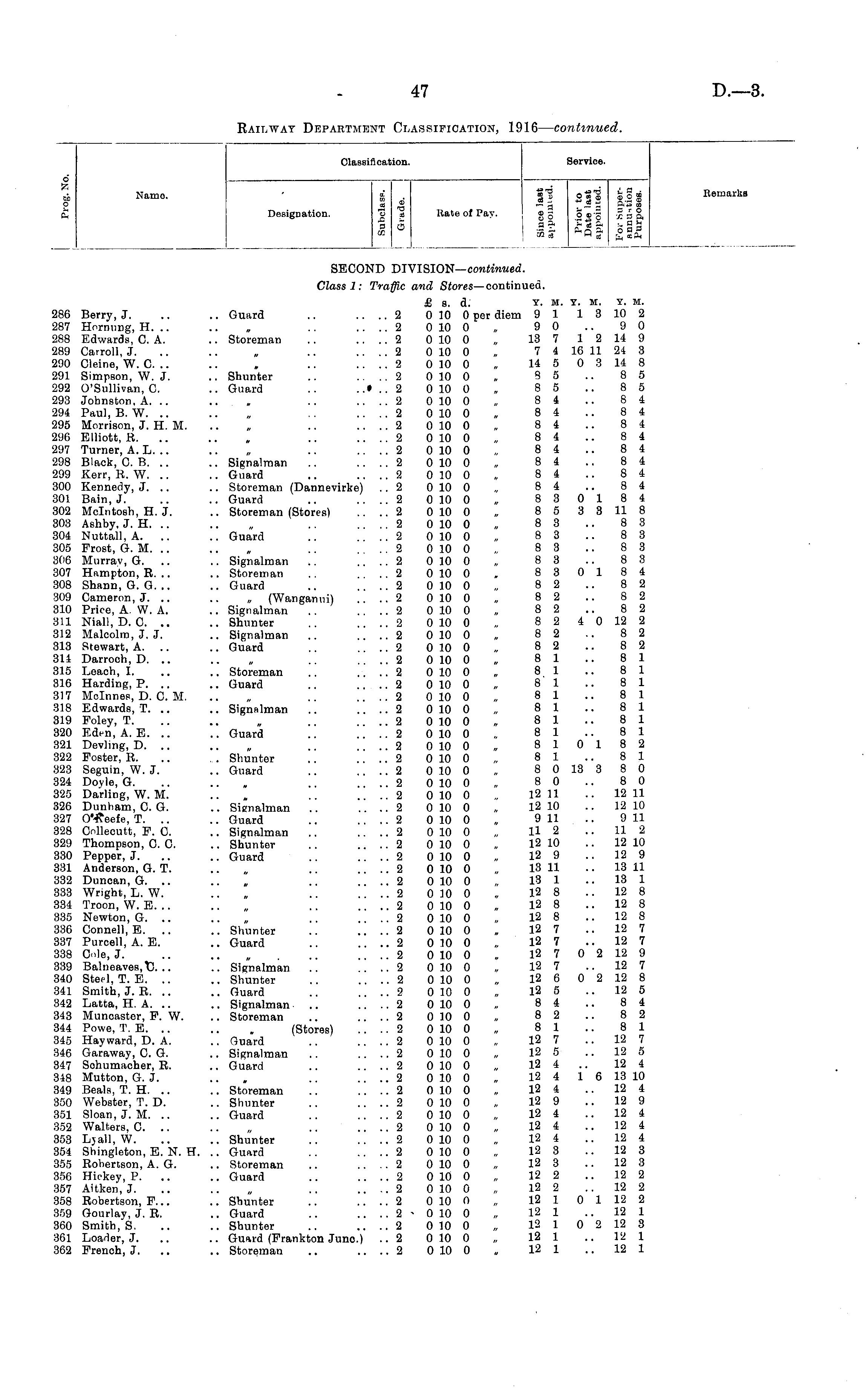 Classil 1 cation. Service. ah Name ■" || o%% & J $ P so £ 5 • - a - 31 a Designation. o j Rate of Pay. g j S ar§ J ,5 ° r -h 3 3. * a 3 C. <** ° I aa- 'aa- fi8fi d Z ah o a Name Remarks Designation. SECOND DIVISION— continued. Class 1: Traffic and Stores— continued. £ a. d. y. m. y. m. y. m. 286 Berry, J. .. .. Guard .. .... 2 0 10 0 per diem 9 1 1 3 10 2 287 Hornung, H. .. .. „ .. .... 2 0 10 0 „ 90 .. 90 288 Edwards, C. A. .. Storeman .. .... 2 0 10 0 „ 13 7 1 2 14 9 289 Carroll, J. .. .. „ .. .... 2 0 10 0 „ 7 4 16 11 24 3 290 Cleine, W. C. .. .. , .. .... 2 0 10 0 „ 14 5 0 3 14 8 291 Simpson, W. J. .. Shunter .. .... 2 0 10 0 „ 8 5 .. 8 5 292 O'Sullivan, C. .. Guard .. ..» .. 2 0 10 0 „ 8 5 .. 8 5 293 Johnston,A. .. .. „ .. .... 2 0 10 0 „ 8 4 .. 8 4 294 Paul, B. W. .. .. „ .. .... 2 0 10 0 „ 84 .. 84 295 Morrison, J. H. M. .. „ .. .... 2 0 10 0 „ 84 .. 84 296 Elliott, R. .. .. „ .. .... 2 0 10 0 „ 8 4 .. 8 4 297 Turner, A. L. .. .. „ .. .... 2 0 10 0 „ 84 .. 84 298 Black, O. B. .. .. Signalman .. .... 2 0 10 0 „ 8 4 .. 8 4 299 Kerr, R. W. .. .. Guard .. .... 2 0 10 0 „ 8 4 .. 8 4 300 Kennedy, J. .. .. Storeman (Dannevirke) .. 2 0 10 0 „ 8 4 .. 8 4 301 Bain, J. .. .. Guard .. .... 2 0 10 0 „ 83 0184 302 Mcintosh, H. J. .. Storeman (Stores) .... 2 0 10 0 „ 8 5 3 3 11 8 303 Ashby, J. H. .. .. „ .. .... 2 0 10 0 „ 83 .. 83 304 Nuttall, A. .. .. Guard .. .... 2 0 10 0 „ 8 3 .. 8 3 305 Frost, G. M. .. .. „ .. ... 2 0 10 0 „ 83 .. 83 306 Mnrrav, G. .. .. Signalman .. .... 2 0100 „ 83 .. 88 307 Hampton, R... .. Storeman .. ....2 0 10 0 . 83 0 184 308 Shann, G. G. .. .. Guard .. .... 2 0 10 0 „ 8 2 .. 8 2 309 Cameron, J. .. .. „ (Wanganui) .... 2 0 10 0 „ 8 2 .. 8 2 310 Price, A. W. A. .. Signalman .. .... 2 0 10 0 „ 8 2 .. 8 2 311 Niall, D. C. .. .. Shunter .. .... 2 0 10 0 ,. 8 2 4 0 12 2 312 Malcolm, J. J. .. Signalman .. ....2 0 10 0 „ 82 .. 82 313 Stewart, A. .. .. Guard .. ..2 0 10 0 „ 8 2 .. 8 2 314 Darroch, D. .. .. „ .. .... 2 0 10 0 „ 8 1 .. 8 1 315 Leach, I. .. .. Storeman .. .... 2 0 10 0 „ 81 .. 81 316 Harding, P Guard .. .... 2 0 10 0 „ 81 .. 81 317 Mclnnes, D. C. M, .. „ .. .... 2 0 10 0 „ 8 1 .. 8 1 318 Edwards, T. .. .. Signalman .. .... 2 0 10 0 „ 8 1 .. 8 1 319 Foley, T. .. .. „ .. 2 0 10 0 „ 8 1 .. 8 1 320 Eden, A. E. .. .. Guard .. .... 2 0 10 0 „ 8 1 .. 8 1 321 Devling, D. .. .. „ .... 2 0 10 0 „ 8 10 18 2 322 Foster, R. .. . . Shunter .. .... 2 0 10 0 „ 81 .. 81 323 Seguin, W. J. .. Guard .. .... 2 0 10 0 „ 8 0 13 3 8 0 324 Doyle, G. .. .. „ .. 2 0 10 0 „ 8 0 .. 8 0 325 Darling, W. M. ... .... 2 0 10 0 „ 1211 .. 1211 326 Dunham, C. G. .. Signalman .. .... 2 0 10 0 „ 12 10 .. 12 10 327 0*"£eefe, T. .. .. Guard .. .... 2 0 10 0 „ 911 .. 9 11 328 Cnllecutt, P. C. .. Signalman .. .... 2 0 10 0 „ H 2 .. 11 2 329 Thompson, C. 0. .. Shunter .. .... 2 0 10 0 „ 12 10 .. 12 10 330 Pepper, J. .. .. Guard .. .... 2 0 10 0 „ 12 9 .. 12 9 331 Anderson, G. T. .. „ .. .... 2 0100 „ 13 11 13 11 332 Duncan, G. .. .. „ .. ..2 0 10 0 „ 13 1 13 1 333 Wright, L. W. .. „ .. .... 2 0 10 0 „ 12 8 12 8 334 Troon, W. E. .. .. , .. .. 2 0 10 0 „ 12 8 12 8 335 Newton, G. .. .. „ .... 2 0 10 0 „ 12 8 12 8 336 Connell, E. .. .. Shunter .. .... 2 0 10 0 „ 12 7 .. 12 7 337 Purcell, A. E. .. Guard .. .... 2 0 10 0 „ 12 7 .. 12 7 338 0"le, J. .. .. „ .. .... 2 0 10 0 ., 12 7 0 2 12 9 339 Balneaves.t). .. .. Signalman .. .... 2 0 10 0 „ 12 7 .. 12 7 340 Steel, T. E. .. .. Shunter .. .... 2 0 10 0 „ 12 6 0 2 12 8 341 Smith, J. R. .. .. Guard .. .... 2 0 10 0 „ 12 5 .. 12 5 342 Latta, H. A. .. .. Signalman .. .... 2 0 10 0 „ 84 .. 84 343 Muncaster, F. W. .. Storeman .. .... 2 0100 „ 82 .. 82 344 Powe, T. E. .. .. , (Stores) .... 2 0 10 0 „ 81 .. 81 345 Hay ward, D. A. .. Guard .. .... 2 0 10 0 „ 12 7 .. 12 7 346 Garaway, C. G. .. Signalman .. .... 2 0 10 0 „ 12 5 .. 12 5 347 Sohumacher, R. .. Guard .. .... 2 0 10 0 „ 12 4 .. 12 4 348 Mutton, G. J. .. „ .. .... 2 0 10 0 „ 12 4 1 6 13 10 349 Beala, T. H. .. .. Storeman .. .... 2 0 10 0 „ 12 4 .. 124 350 Webster, T. D. .. Shunter .. .... 2 0 10 0 „ 12 9 .. 12 9 351 Sloan, J. M. .. .. Guard .. .... 2 0 10 0 „ 12 4 .. 12 4 352 Walters, C. .. .. „ .. .... 2 0 10 0 „ 12 4 .. 124 353 Ljall, W. .. .. Shunter .. .... 2 0 10 0 „ 12 4 .. 12 4 354 Shingleton, E. N. H. .. Guard .. .... 2 0 10 0 „ 12 3 .. 12 3 355 Robertson, A. G. .. Storeman .. .... 2 0 10 0 „ 123 .. 12 3 356 Hickey, P. .. .. Guard .. .... 2 0 10 0 „ 122 .. 122 357 Aitken, J. .. .. „ .. .... 2 0 10 0 „ 12 2 12 2 358 Robertson, P... .. Shunter .. .... 2 0 10 0 „ 12 1 0 1 12 2 359 Gourlay, J. R. .. Guard .. .... 2 - 0 10 0 „ 12 1 .. 12 1 360 Smith, S, .. .. Shunter .. .... 2 0 10 0 „ 12 1 0 2 12 3 361 Loarler, J. .. .. Guard (Frankton Juno.) ..2 0 10 0 „ 12 1 .. 12 1 362 French, J. .. .. Storeman .. .... 2 0 10 0 „ 12 1 .. 12 1