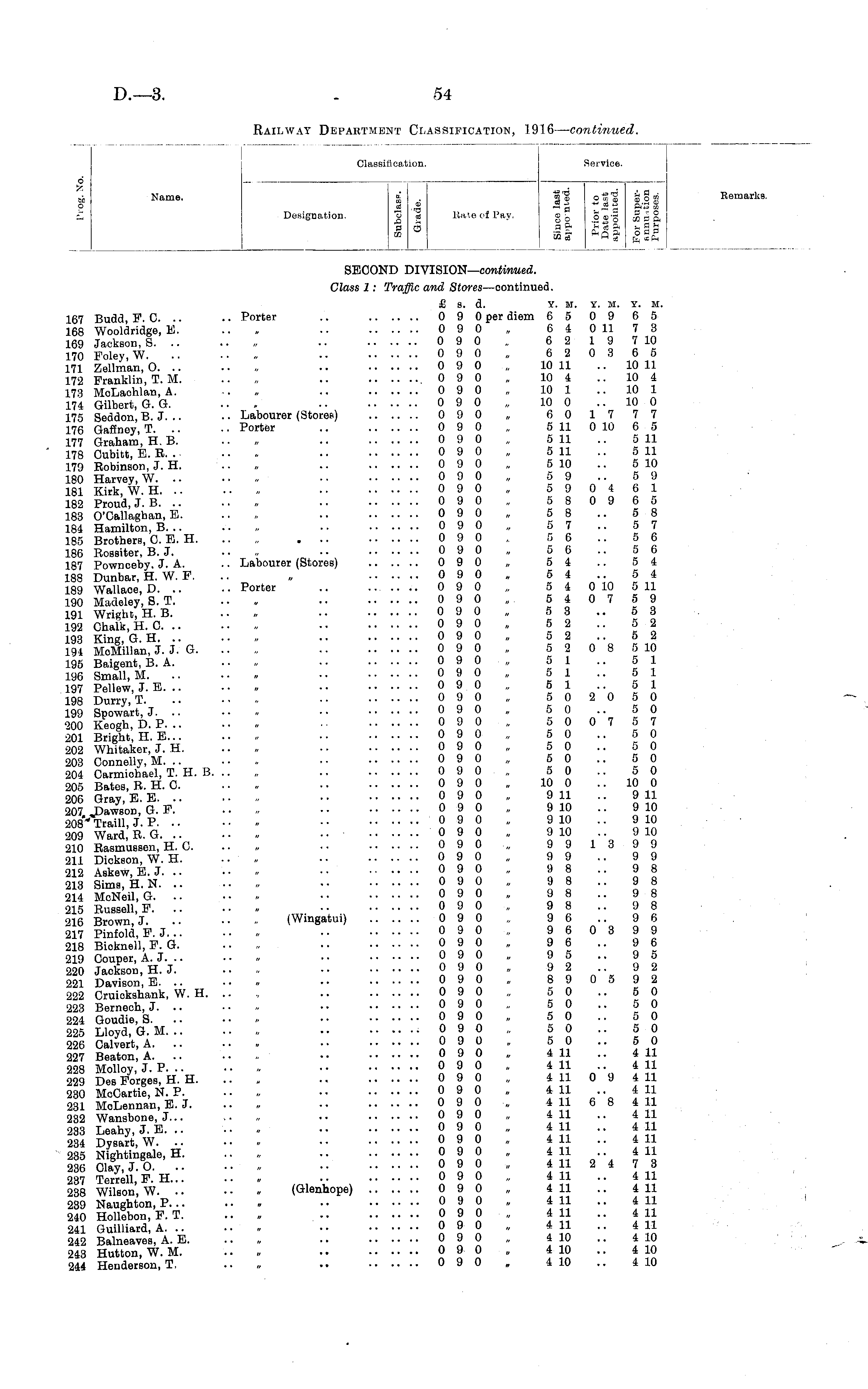 ClasBifl cation. Service. ■_, — 1——— „b Name. j |'l ij o g P 3 « .Sg "-a f? S S a Designation. o sa lln,-,o of Pay. o 001-3 a, 3 & SB a? JaJ 1.3s o' A p Name. : Remarks. SECOND DIVISION— continued. Class 1: Traffic and Stores —continued. £ s. d. Y. M. Y. M. Y. M. 167 Budd, P. C. .. . • Porter .. 0 9 0 per diem 6 5 0 9 6 5 168 Wooldridge, E. .. . 0 9 0 „ 6 4 0 11 7 3 169 Jackson, S 0 9 0 ,. 6 2 1 9 7 10 170 Foley, W 0 9 0 „ 6 2 0 3 6 5 171 Zellman, O 0 9 0 „ 10 11 .. 10 11 172 Franklin, T. M. .. „ .090 „ 10 4 .. 10 4 173 McLaohlan, A. ■. „ .. 0 9 0 „ 10 1 .. 10 1 174 Gilbert, G. G. .. . 0 9 0 „ 10 0 .. 10 0 175 Seddon, B. J. .. .. Labourer (Stores) 090 ,, 60 17 77 176 Gafiney, T. .. • • Porter .. 0 9 0 „ 5 11 0 10 6 5 177 Graham, H. B. .. „ .. 0 9 0 „ 5 11 .. 5 11 178 Cubitt, E. R ,. 0 9 0 „ 5 11 .. 5 11 179 Robinson, J. H. .. „ .. 0 9 0 „ 5 10 .. 5 10 180 Harvey, W 0 9 0 „ 5 9 .. 5 9 181 Kirk.W.H 0 9 0,, 590461 182 Proud, J. B ,, 0 9 0 . 5 8 0 9 6 5 183 O'Callaghan, E. .. „ .. 0 9 0 „ 5 8 .. 5 8 184 Hamilton, B. .. .. „ .. 0 9 0 „ 5 7 .. 5 7 185 Brothers, C. E. H 0 9 0 ,. 5 6 .. 5 6 186 Rossiter, B.J. .. ., • • 0 9 0 „ 5 6 .. 5 6 187 Pownceby, J. A. .. Labourer (Stores) 090 „ 54 .. 54 188 Dunbar, H. W. P. .. ,, 0 9 0 „ 5 4 .. 5 4 189 Wallace, D. .. .. Porter .. 0 9 0 „ 5 4 0 10 5 11 190 Madeley, S. T. .. . 0 9 0 „ . 5 4 0 7 5 9 191 Wright, H. B. .. „ .. 0 9 0 „ 5 3 .. 5 3 192 Chalk, H. C 0 9 0 „ 5 2 .. 5 2 193 King, G. H 0 9 0,, 5 2 .. 5 2 191 McMillan, J. J. G. .. ,. 0 9 0 „ 5 2 0 8 5 10 195 Baigent, B. A. .. „ 0 9 0 „ 5 1 .. 5 1 196 Small, M -- 0 9 0,, 5 1 .. 5 1 197 Pellew, J. E. .. .. „ . • 0 9 0 „ 5 1 .. 5 1 198 Durry.T 0 9 0 . 5 0 2 0 5 0 199 Spowart, J 0 9 0 „ 5 0 .. 5 0 200 Keogh, D. P ,, 0 9 0 , 5 0 0 7 5 7 201 Bright, H.E 0 9 0,, 5 0 .. 5 0 202 Whitaker, J. H. .. „ .. 0 9 0 „ 5 0 .. 5 0 203 Connelly, M. .. ■ ■ . • • 0 9 0 „ 5 0 .. 5 0 204 Garmichael, T. H. B .. 0 9 0,, 50 .. 50 205 Batea.R.H. C. .. ,- 0 9 0 „ 10 0 .. 10 0 206 Gray.E.E 0 9 0 „ 9 11 .. 9 11 207 Dawson, G. F 0 9 0 „ 9 10 .. 9 10 208-Traill, J. P 0 9 0 „ 9 10 .. 9 10 209 WardR.G . •• 0 9 0 „ 9 10 .. 9 10 210 Rasmussen, H. C. .. „ 0 9 0,, 991399 211 Dickson, W. H. -. „ • • 0 9 0 „ 9 9 .. 9 9 212 Askew, E.J •• 0 9 0,, 9 8 .. 9 8 213 Sims, H.N 0 9 0,, 98.-98 214 McNeil, G 0 9 0 „ 9 8 .. 9 8 215 Russell, F 0 9 0 „ 9 8 .. 9 8 216 Brown, J. .. •• . (Wingatui) 090 „ 96 .. 96 217 Pinfold, F.J 0 9 0,, 960399 218 Bioknell, P. G. • • „ • • 0 9 0 „ 9 6 .. 9 6 219 Couper, A. J . 0 9 0 „ 9 5 .. 9 5 220 Jackson, H.J 0 9 0,, 92 .. 9 2 221 Davison, E . 0 9 0,, 890592 222 Cruiokshank, W. H. .. , .. 0 9 0 „ 5 0 .. 5 0 223 Bernech, J •• 0 9 0 „ 5 0 .. 5 0 224 Goudie, S. .. •• » •• 0 9 0 „ 5 0 .. 5 0 225 Lloyd, G. M .090 „ 50 .. 50 226 Calvert, A 0 9 0 „ 5 0 .. 5 0 227 Beaton, A. .. •• . •• 0 9 0 „ 4 11 .. 4 11 228 Molloy, J. P 0 9 0 „ 4 11 .. 4 11 229 Des Forges, H. H. .. , 0 9 0 „ 4 11 0 9 4 11 230 McCartie, N. P • • 0 9 0 „ 4 11 .. 4 11 231 MoLennan, E. J. .. „ 0 9 0 „ 4 11 0 8 4 11 232 Wansbone, J 0 9 0 , 4 11 .. 4 11 233 Leahy, J. E... •• ., 0 9 0 „ 4 11 .. 4 11 234 Dysart.W 0 9 0 „ 4 11 .. 4 11 235 Nightingale, H. .. „ 0 9 0 „ 4 11 .. 4 11 236 Clay, J. O. 0 9 0,, 4 11 2 4 7 3 237 Terrell,P. H „ 0 9 0 „ 4 11 .. 4 11 238 Wilson, W (Glenhope) 0 9 0 „ 4 11 .. 4 11 239 Naughton,P . 0 9 0 „ 4 11 .. 4 11 240 Hollebon, P. T. .. „ 0 9 0 „ 4 11 .. 4 11 241 Guilliard, A ,, ■■ 0 9 0 „ 4 11 .. 4 11 242 Balneaves, A. E. .. „ .. 0 9 0 „ 4 10 .. 4 10 243 Hutton, W. M. .. „ 0 9 0 „ 4 10 .. 4 10 244 HendetBon.T, .. „ 0 9 0 „ 4 10 .. 4 10 ■ ' '■ I I