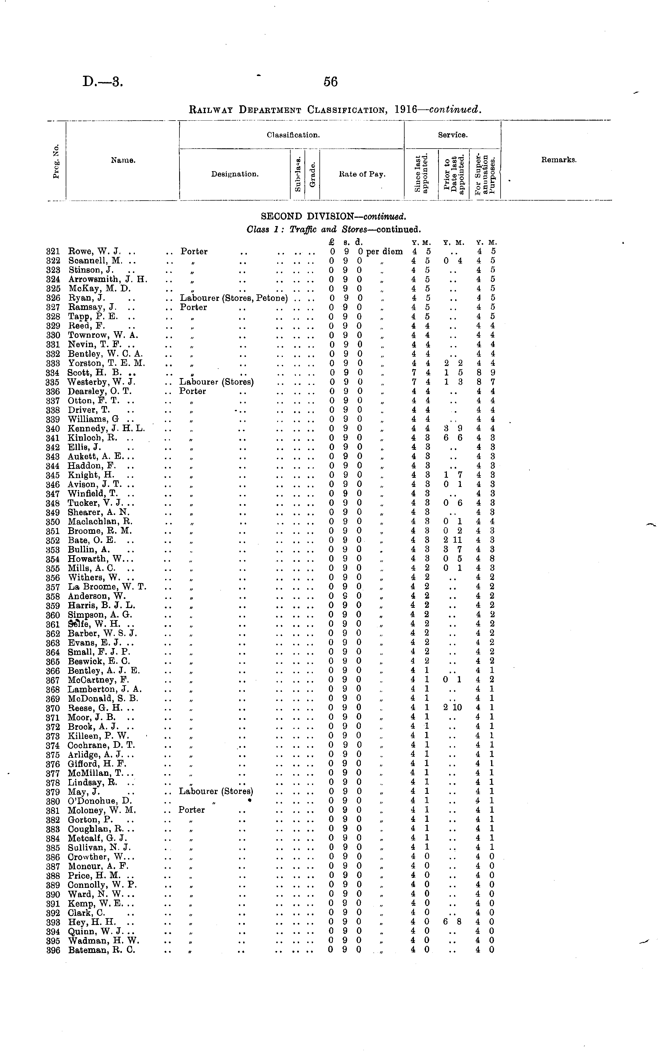 d Y. oi Name. £ a Classification. Service. '. OJ sa -n *c <,, Z ft —' Designation. Kate of Pay. g-g o o-| co S g, Service. Remarks. SECOND DIVISION— continued. Class 1 : Traffic and Stores —continued. 321 Rowe, W. J. 322 Scannell, M. .. 323 Stinson, J. 324 Arrowsmith, J. H. 325 McKay, M. D. 326 Ryan, J. 327 Ramsay, J. 328 Tanp, P. E. 329 Reed, F. 330 Townrow, W. A. 331 Nevin, T. P. .. 332 Bentley, W. C. A. 333 Yorston, T. E. M. 334 Scott, H. B. .. 335 Westerby, W. J. 336 Dearaley, 0. T. 337 Otton, P. T. .. 338 Driver, T. 339 Williams, G .. 340 Kennedy, J. H. L. 341 Kinloch, R. .. 342 Ellis, J. 343 Aukett, A. E. .. 344 Haddon, F. .. 345 Knight, H. .. 346 Avison, J. T. 347 Winfield, T. .. 348 Tucker, V. J. .. 349 Shearer, A. N. 350 Maclachlan, R. 351 Broome, R. M. 352 Bate, 0. E. 353 Bullin, A. 354 Howarth, W... 355 Mills, A. C. 356 Withers, W. .. 357 La Broome, W. T. 358 Anderson, W. 359 Harris, B. J. L. 360 Simpson, A. G. 361 S*lfe, W.H. .. 362 Barber, W. S. J. 363 Evans, E.J. 364 Small, F. J. P. 365 Beswiok, E. C. 366 Bentley, A. J. B. 367 MoCartney, F. 368 Lamberton, J. A. 369 McDonald, S. B. 370 Reese, G. H. 371 Moor, J. B. 372 Brock, A. J. 373 Killeen, P. W. 374 Coohrane, D. T. 375 Arlidge, A. J. .. 376 Gifford, H. P. 377 McMillan, T. .. 378 Lindsay, R. . .' 379 May, J. 380 O'Donohue, D. 381 Moloney, W. M. 382 Gorton, P. .. 383 Coughlan,R. .. 384 Metoalf, G. J. 385 Sullivan, N. J. 386 Crowther, W... 387 Monour, A. F. 388 Price, H. M. 389 Connolly, W. P. 390 Ward, N. W. .. 391 Kemp, W. E. .. 392 Clark, C. 393 Hey, H. H. .. 394 Quinn, W. J. .. 395 Wadman, H. W. 396 Bateman, R. C. £ B. d. Y. M. Y. M. Y. M. .. Porter .. 0 9 0 per diem 4 5 .. 4 5 0 9 0 „ 4 5 0 4 4 5 0 9 0 „ 4 5 .. 4 5 0 9 0 „ 4 5 .. 4 5 0 9 0 „ 4 5 .. 4 5 .. Labourer (Stores, Petone) .... 090 „ 45 .. 45 .. Porter .. 0 9 0 „ 4 5 .. 4 5 0 9 0 „ 4 5 .. 4 5 0 9 0 „ 4 4 .. 4 4 0 9 0 „ 4 4 .. 4 4 0 9 0 „ 4 4 .. 4 4 0 9 0 „ 4 4 .. 4 4 0 9 0 „ 4 4 2 2 4 4 0 9 0 „ 7 4 15 8 9 .. Labourer (Stores) 0 9 0 „ 7 4 13 8 7 .. Porter .. 0 9 0 .. 4 4 .. 4 4 0 9 0 „ 4 4 .. 4 4 0 9 0 „ 4 4 .. 4 4 0 9 0 „ 4 4 ., 4 4 0 9 0 „ 4 4 3 9 4 4 0 9 0 „ 4 3 6 6 4 3 0 9 0 „ 4 3 .. 4 3 0 9 0 „ 4 3 .. 4 3 0 9 0 „ 4 3 .. 4 3 0 9 0 „ 4 3 17 4 3 0 9 0 „ 4 3 0 14 3 0 9 0 ., 4 3 .. 4 3 0 9 0 ., 4 3 0 6 4 3 0 9 0 „ 4 3 .. 4 3 090 „ 430144 0 9 0 ., 4 3 0 2 4 3 0 9 0 „ 4 3 2 11 4 3 ... .. 0 9 0 ., 4 3 3 7 4 3 0 9 0 „ 4 3 0 5 4 8 0 9 0 ., 4 2 0 14 3 0 9 0 „ 4 2 .. 4 2 0 9 0 „ 4 2 .. 4 2 0 9 0 „ 4 2 .. 4 2 0 9 0 „ 4 2 .. 4 2 0 9 0 „ 4 2 .. 4 2 0 9 0 „ 4 2 .. 4 2 0 9 0 „ 4 2 .. 4 2 0 9 0 „ 4 2 .. 4 2 0 9 0 „ 4 2 .. 4 2 090 „ 42 .. 42 0 9 0 „ 4 1 .. 4 1 0 9 0 „ 4 10 14 2 0 9 0 ,. 4 1 .. 4 1 0 9 0 „ 4 1 .. 4 1 0 9 0 4 1 2 10 4 1 0 9 0 „ 4 1 .. 4 1 0 9 0 ., 4 1 .. 4 1 0 9 0 „ 4 1 .. 4 1 0 9 0 „ 4 1 .. 4 1 0 9 0 .. 4 1 .. 4 1 0 9 0 „ 4 1 .. 4 1 0 9 0 „ 4 1 .. 4 1 0 9 0 „ 4 1 .. 4 1 .. Labourer (Stores) 090 „ 41 .. 41 • 0 9 0 „ 4 1 .. 4 1 .. Porter .. 090 „ 41 .. 41 090 „ 41 .. 41 0 9 0 „ 4 1 .. 4 1 0 9 0 „ 4 1 .. 4 1 0 9 0 „ 4 1 .. 4 1 0 9 0 „ 4 0 .. 4 0 0 9 0 „ 4 0 .. 4 0 0 9 0 ., 4 0 .. 4 0 090 „ 40 .. 40 0 9 0 „ 4 0 .. 4 0 0 9 0 „ 4 0 .. 4 0 0 9 0 „ 4 0 .. 4 0 0 9 0 „ 4 0 6 8 4 0 0 9 0 „ 4 0 .. 4 0 0 9 0 „ 4 0 .. 4 0 0 9 0 „ 4 0 .. 4 0