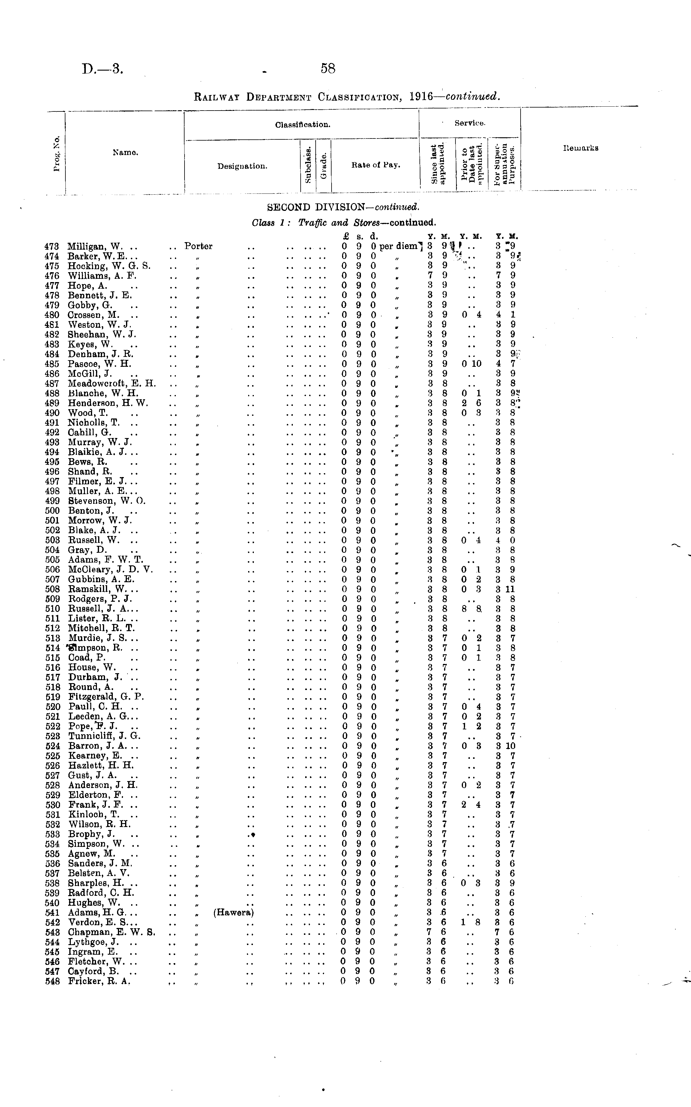 6" Y. rjV Name. o 6 A at G Classification. Service. rJ rrj *» rC -L P ■ OI &ZiOtt. vvOf 'J £ -a "*= !'-,§ Designation. o u Rate of Pay. gg o ejg n 3 a s 9 B g W? o a 3 co enc? rt Qcr iZ§a Classification. Remark SECOND DIVISION— continued. Class 1 : Traffic and Scores—continued. 473 Milligan, W. .. 474 Barker, W.E... 475 Hocking, W. G. S. 476 Williams, A. P. 477 Hope, A. 478 Bennett, J. E. 479 Gobby, G. 480 Crossen, M. .. 481 Weston, W. J. 482 Sheehan, W. J. 483 Keyes, W. 484 Denhain, J. R. 485 Pasooe, W. H. 486 McGill, J. 487 Meadowcroft, E. H. 488 Blanche, W. H. 489 Henderson, H. W. 490 Wood, T. 491 Nioholls, T. .. 492 Cahill, G. 493 Murray, W. J. 494 Blaikie, A. J. .. 495 Bews, R. 496 Shand, R. 497 Pilmer, E. J. .. 498 Muller, A. E... 499 Stevenson, W. O. 500 Benton, J. 501 Morrow, W. J. 502 Blake, A. J. .. 503 Russell, W. .. 504 Gray, D. 505 Adams, F. W. T. 506 McOleary, J. D. V. 507 Gubbins, A. E. 508 Ram skill, W. .. 509 Rodgers, P. J. 510 Russell, J. A... 511 Lister, R. L. 512 Mitohell, R. T. 513 Murdie, J. S. .. 514 "Simpson, R. .. 515 Coad, P. 516 House, W. .. 517 Durham, J. '.. 518 Round, A. 519 Fitzgerald, G. P. 520 Paull, C. H. 521 Leeden, A. G... 522 Pope, P. J. .. 523 Tunnicliff, J. G. 524 Barron, J. A. .. 525 Kearney, E. .. 526 Hazlett, H. H. 527 Gust, J. A. 528 Anderson, J. H. 529 Elderton, F. .. 530 Frank, J. P. 531 Kinloch, T. .. 532 Wilson, R. H. 533 Brophy, J. 534 Simpson, W. .. 535 Agnew, M. 536 Sanders, J. M. 537 Belsten, A. V. 538 Sharpies, H. .. 539 Radford, C. H. 540 Hughes, W. .. .541 Adams, H. G. .. 542 Verdon.E. S... 543 Chapman, E. W. S. 544 Lythgoe, J. .. 545 Ingram, E. 546 Fletcher, W. .. 547 Cayford, B. .. 548 Fricker, R. A. .. Porter £ s. d. Y. M. Y. M. Y. M. : .. 090 per diem"] 3 9 8 t .. 3 y 0 9 0 „ 3 9 ■■) .. 3 9r" 0 9 0 „ 3 9 ".. 3 9 090 . 79 .. 7 9 0 9 0 „ 3 9 .. 3 9 090 „ 39 .. 39 0 9 0 „ 3 9 .. 8 9 -090 „ 3 9 04 41 090 . 3 9 .. 39 090 „ 3 9 .. 39 0 9 0 „ 3 9 .. 3 9 0 90 , 39 .. 3 9j: 0 9 0 , 3 9 0 10 4 7 090 „ 39 .. 3 9 0 9 0 , 3 8 .. 3 8 0 9 0 „ 3 8 0 1 3 9S 0 9 0 . 3 8 2 6 3 8" 0 9 0 „ 3 8 0 3 3 8 090 „ 38 .. 3 8 090 „ 38 .. 38 0 9 0 '„ 3 8 .. 3 8 0 9 0 •„ 3 8 .. 3 8 0 9 0 „ 3 8 .. 3 8 0 9 0 „ 3 8 .. 3 8 0 9 0 „ 3 8 .. 3 8 0 9 0 „ 3 8 .. 3 8 0 9 0 , 3 8 .. 3 8 090 „ 38 .. 38 0 9 0 . 3 8 .. 3 8 090 , 3 8 .. 38 090 „ 38 04 40 0 9 0 , 3 8 .. 3 8 0 9 0 „ 3 8 .. 3 8 090 , 3 8 01 3 9 0 9 0 „ 3 8 0 2 3 8 0 9 0 „ 3 8 0 3 3 11 0 9 0 „ 3 8 .. 3 8 0 9 0 , 3 8 8 8 3 8 0 9 0 „ 3 8 .. 3 8 0 9 0 „ 3 8 .. 3 8 09 0 , 37 02 3 7 090 „ 37 01 3 8 0 9 0 , 3 7 0 1 3 8 .. 0 9 0 „ 3 7 .. 3 7 0 9 0 „ 3 7 .. 3 7 0 9 0 „ 3 7 .. 3 7 090 „ 3 7 .. 37 0 9 0 , 3 7 0 4 3 7 090 „ 3 7 02 3 7 0 90 „ 37 12 37 090 , 37 .. 37 090 , 37 03 3 10 090 „ 3 7 .. 37 0 9 0 „ 3 7 .. 3 7 0 9 0 „ 3 7 .. 3 7 0 9 0 „ 3 7 0 2 3 7 0 9 0 „ 3 7 .. 3 7 090 , 3 7 24 37 0 9 0 , 3 7 .. 3 7 0 9 0 „ 3 7 .. 3 7 .♦ 0 9 0 „ 3 7 .. 3 7 0 9 0 „ 3 7 .. 3 7 0 9 0 „ 3 7 .. 3 7 090 , 36 .. 3 6 090 „ 36 .. 36 0 9 0 „ 3 6 0 3 3 9 0 9 0 „ 3 6 .. 3 6 0 9 0 „ 3 6 .. 8 6 (Hawera) 0 9 0 „ 3 6 .. 3 6 090 „ 36 18 3 6 090 „ 76 .. 76 0 9 0 „ 3 6 .. 3 6 0 9 0 „ 3 6 .. 3 6 0 9 0 „ 3 6 .. 3 6 0 9 0 „ 3 6 .. 3 6 0 9 0 „ 3 6 .. 8 6