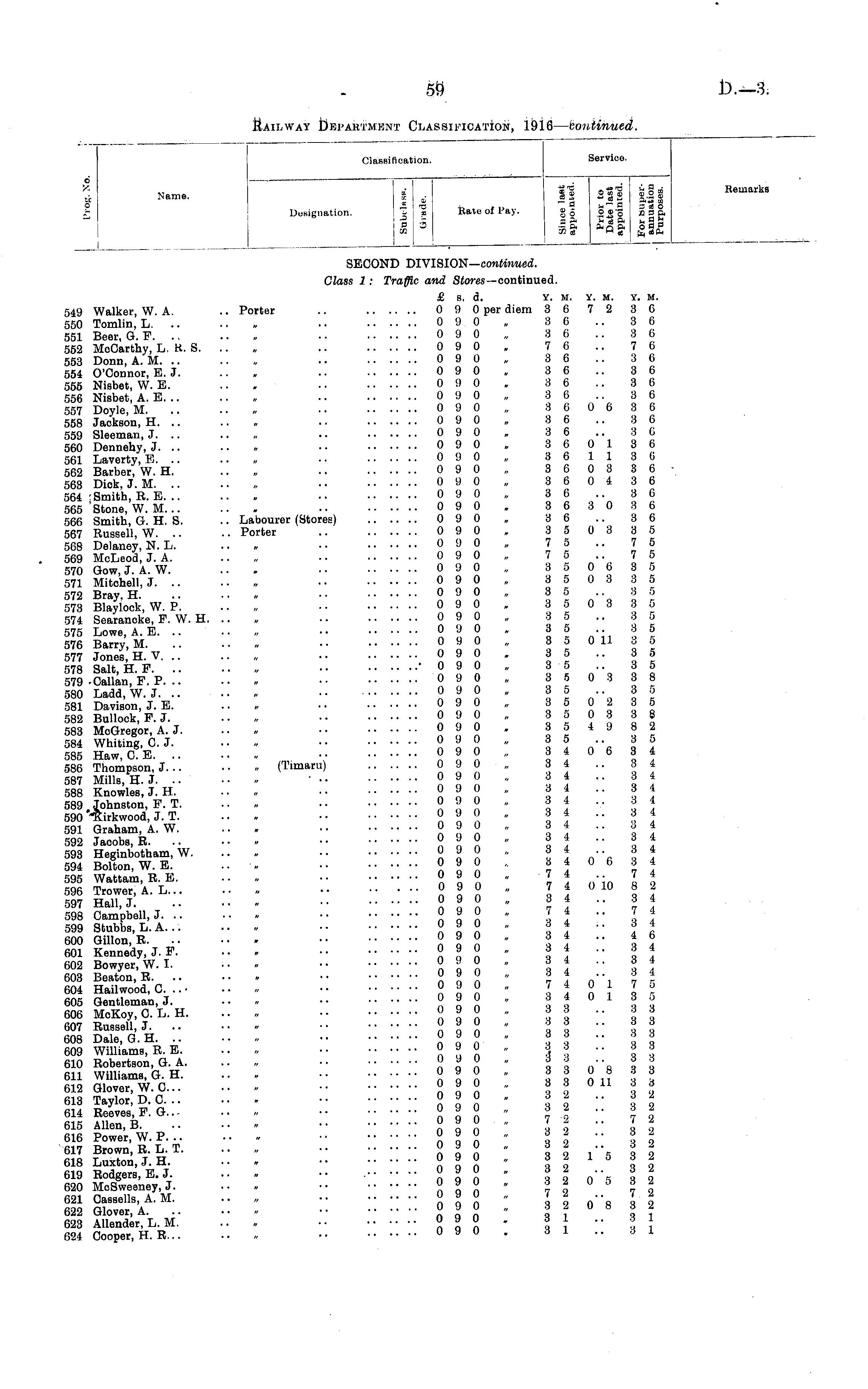 6 o Name. Cl! Du&iguatloti. Classification. lassihcation. r= T3 r5 5 9 3 cX Kate of Pay. So Service. _ -*= rw u 9 u -- £ 3 s6 O & ; n 9 a Remarks SECOND DIVISION— continued. Glass 1 : Traffic and Stores— continued. £ s. d. Y. m. 549 Walker, W. A. .. Porter .. 0 9 0 per diem 3 6 550 Tomlin, L. .. .. „ .. 0 9 0 „ 3 6 551 Beer, G. F ,- • • 0 9 0 „ 3 6 552 McCarthy, L, K. S. .. „ .. 0 9 0 , 7 6 553 Donn, A. M. .. .. „ .. 0 9 0 „ 3 6 554 O'Connor, E. J. .. . .. 090 . 36 555 Niabet, W. E. .. , .. 0 9 0 » 3 6 556 NiBbet, A. E. .. .. „ .. 0 9 0 „ 3 6 557 Doyle, M. .. .. „ •. 0 9 0 „ 3 6 558 Jackson, H. .. .. „ .. 0 9 0 „ 3 6 559 Sleeman, J. .. .. „ .. 0 9 0 „ 3 6 560 Dennehy, J. .. .. „ ■■ 0 9 0 „ 3 6 561 Laverty, E. .. .. „ .. 0 9 0 „ 3 6 562 Barber, W. H. .. „ .. 0 9 0 „ 3 6 563 Diok, J. M. .. .. „ ■ • 0 9 0 „ 3 6 564 I Smith, R. E. .. .. . .. 0 9 0 „ 3 6 565 Stone, W. M. .. .. . .. 0 9 0 , 3 6 566 Smith, G. H. S. .. Labourer (Stores) 0 9 0 , 3 6 567 Russell, W. .. .. Porter .. 090 . 35 568 Delaney, N. L. .. „ 0 9 0 „ 7 5 569 MoLeod, J. A. .. „ •• 0 9 0 „ 7 5 570 Gow, J. A. W. .. . ■ • 0 9 0 „ 3 5 571 Mitchell, J. .. .. „ • • 0 9 0 „ 3 5 572 Bray. H. .. .. ,, • ■ 0 9 0 „ 3 5 573 Blaylock, W. P 0 9 0 , 3 5 574 Searancke, P. W. H. .. „ 0 9 0 „ 3 5 575 Lowe, A. E. .. .. „ • • 0 9 0 „ 3 5 576 Barry, M. .. .. „ • ■ 0 9 0 „ 3 5 577 Jones, H. V 0 9 0 . 3 5 578 Salt, H. F ° 9 ° • °° 579 -Callan, F. P 0 9 0 „ 3 5 580 Ladd, W. J. .. ■ • . 0 9 0 „ 3 5 581 Davison, J. E. .. , • • 0 9 0 „ 3 5 582 Bullock, F.J. •• ,- 0 9 0 „ 3 5 583 McGregor, A. J. .. „ • • 0 9 0 . 3 5 584 Whiting, C. J. .. ,. 0 9 0 „ 3 5 585 Haw, CE 0 9 0 „ 3 4 586 Thompson, J. .. • • . (Timaru) 0 9 0 „ 34 587 Mills, H. J ' ?-, n n " it 588 Knowles.J. H. .. „ 0 9 0 „ 6 A 589 Johnston, F.T. .. „ 0 9 0 „ 3 4 590 "Kirkwood, J. T. .. .- • • 0 9 0 „ 3 4 591 Graham, A. W. .. . S H „ 592 Jacobs, R 0 9 0 " i t 593 Heginbotham, W. .. ,, •• » " - f * 594 Bolton, W. E. .. ,, » - 6 „ * 595 Wattam.RE. .. „ 0 9 0 „ 7 4 596 Trower, A. L 1 o n " It 597 Hall, J 0.9 0 . 3 4 598 Campbell, J ° g ° - < \ 599 Stubbs, L. A. .. •• „ ° „ ,°, " It 600 Gillon, R r, I I " It 601 Kennedy, J. F. .. . 0 9 0 „ 3 < 602 Bowyer.W.L .. . n 9 n " 3 4 603 Beaton, R n n n " ? A 604 Hailwood,C. ..- •• . n , 0 " 3 4 605 Gentleman, J. •• . no " % % 606 MoKoy,C.L. H. .. „ 0 9 0 „ 3 3 607 Russell, J ll o " I 3 608 Dale, G. H ° \ ° ■■ \ \ 609 Williams, R. E. .. „ n t n " i a 610 Robertson, G. A. .. ,. on " a I 611 Williams, G. H. ... 0 9 0 „ 3 3 612 Glover, W. C n 9 0 " 3 2 613 Taylor, D. C n fl 0 * 3 2 614 Reeves,F. G ° 9 ° - » J 615 Allen, B nan" 3 o 616 Power, W. P . a I o " 3 9 617 Brown, R. L. T. .. „ O 9 0 " 3 2 618 Luxton, J. H. .. . 0 9 0 " 3 2 619 Rodgers.E.J. .. . •• ° 9 ° ■ g \ 620 McSweeney, J. •■ . " \ " " % i 621 Cassells, A. M. •• ,, n n " Li 622 Glover, A nan " R 1 623 Allender, L. M. .. . n n n " a 7 624 Cooper, H. R 0 9 0 . .3 1 Y. M. 7 2 o'o o"i 1 1 0 8 0 4 8 0 0 8 0 6 0 8 o"3 o'ii 0 *3 0 2 0 3 4 9 o"e o"e o io o 1 0 1 0 8 0 11 1 5 0 5 o"a Y. M. 3 6 3 6 3 6 7 0 3 6 3 6 3 6 3 6 8 6 8 6 3 6 3 6 8 6 3 6 3 6 3 6 8 6 3 6 3 5 7 5 7 5 8 5 3 5 8 5 3 5 8 5 8 5 3 5 3 5 8 5 3 8 3 5 3 5 8 8 8 2 3 5 3 4 3 4 3 4 3 1 3 4 8 4 3 A 3 4 3 4 3 4 7 4 8 2 3 4 7 4 3 4 A 6 3 4 3 4 8 A 7 5 3 5 8 8 3 3 8 3 3 8 3 3 8 3 8 3 8 2 3 2 7 2 3 2 3 2 3 2 3 2 8 2 7 2 3 2 3 1 8 1