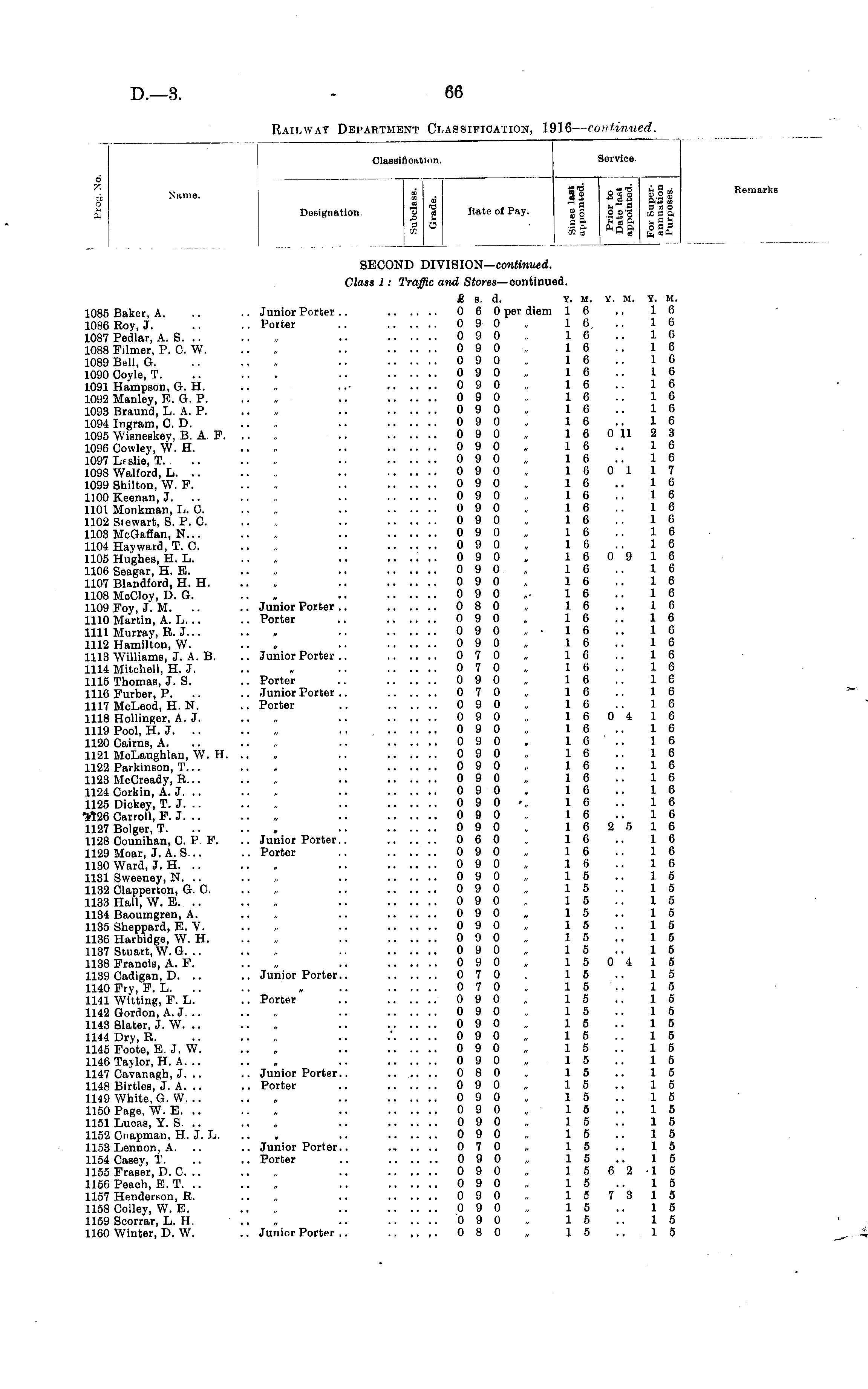 Classification. o _ —— ■ —— Classification. Service. Service. o — — ■ —■ Y, it Name. £ . O £ i03 £ Designation. u _> Rate of Pay. 3 5 cr: d A 11 sit III $5 .2 So ce 3 a -a H« a S.BJ-. af 1 £Sa 11 — a g5 s a ico rfh 2 MS 2.2 3 oa b a Remi iarli3 oi p Remarks SECOND DIVISION— continued. Class 1 : Traffic and Stores —oontinui led. £ s. d. 1085 Baker, A. .. .. Junior Porter .. 0 6 0 per diem 1086 Roy, J. .. .. Porter .. 0 9 0 1087 Pedlar, A. S. .. .. „ .. 0 9 0 1088 Firmer, P. C. W. .. „ .. 0 9 0,, 1089 Bell, G. .. .. ,, .. 0 9 0 1090 Coyle, T. .. .. . .. 0 9 0 1091 Hampson, G. H. .. „ - .-• 0 9 0 1092 Manley, E. G. P. .. „ .. 0 9 0 1093 Braund, L. A. P. .. „ .. 0 9 0 1094 Ingram, CD. .. ,, .. 0 9 0 1095 Wisneskey, B. A. F. .. „ .. 0 9 0 1096 Cowley, W. H. .. „ .. 0 9 0 1097 Lrslie, T. . .. .. „ .. 0 9 0 1098 Walford, L. .. .. „ .. 0 9 0 1099 Shilton, W. P. .. ,, . • 0 9 0 1100 Keenan, J. .. .. „ .. 0 9 0 1101 Monkman, L. C. .. „ .. 0 9 0 1102 Stewart, S. P. C .. „ .. 0 9 0 1103 McGaffan, N... .. „ .. 0 9 0 1104 Hayward, T. C. .. „ .. 0 9 0 1105 Hughes, H. L. .. „ .. ...... 0 9 0 1106 Seagar, H. E. .. „ .. 0 9 0 1107 Blandford, H. H. .. ,, .. 0 9 0 1108 MoCloy, D. G. .. „ .. 0 9 0 1109 Foy, J. M. .. .. Junior Porter .. 0 8 0 1110 Martin, A. L. .. .. Porter .. 0 9 0 1111 Murray, R.J... .. . .. 0 9 0 1112 Hamilton, W. .. „ . • 0 9 0 1113 Williams, J. A. B. .. Junior Porter .. 0 7 0 1114 Mitchell, H. J. .. „ .. 0 7 0 1115 Thomas, J. S. .. Porter .. 0 9 0 1116 Furber, P. .. .. Junior Porter .. 0 7 0 1117 McLeod, H. N. .. Porter .. 0 9 0 1118 Hollinger, A. J. .. „ .. 0 9 0 1119 Pool, H. J .. . 0 9 0 1120 Cairns, A. .. .. „ .. 0 9 0 1121 McLaughlan, W. H. .. „ .. 0 9 0 1122 Parkinson, T... .. , .. 0 9 0 1123 McCready, R... .. „ .. 0 9 0 1124 Corkin, A. J. .. .. ,. .. 0 9 0 1125 Dickey, T. J. .. .. „ .. 0 9 0 »„ "M26 Carroll, P. J. .. .. „ .. 0 9 0 1127 Bolger, T. .. .. . .. 0 9 0 1128 Counihan, C. P F. .. Junior Porter.. 0 6 0 1129 Moar, J. A. S... .. Porter .. 0 9 0 1130 Ward, J. H. .. .. . .. 0 9 0 1131 Sweeney, N. .. .. „ .. 0 9 0 1132 Clapperton, G. C .. 0 9 0 1133 Hall, W. E .. 0 9 0 1134 Baoumgren, A. .. „ .. 0 9 0 1135 Sheppard, E. V .. 0 9 0 1136 Harbidge, W. H .. 0 9 0 1137 Stuart, W. G .. 0 9 0 1138 Francis, A. F. .. „ .. 0 9 0 1139 Cadigan, D. .. .. Junior Porter.. 0 7 0 1140 Fry, P. L. .. .. „ .. 0 7 0 1141 Witting, F. L. .. Porter .. 0 9 0 1142 Gordon, A. J. .. .. „ .. 0 9 0 1143 Slater, J. W. .. .. „ .. 0 9 0 1144 Dry, R. .. .. „ .. .' 0 9 0 1145 Fobte, E. J. W. .. „ .. 0 9 0 1146 Taylor, H. A. .. .. „ .. 0 9 0 1147 Cavanagh, J. .. .. Junior Porter.. ...... 0 8 0 1148 Birtles, J. A. .. .. Porter .. 0 9 0 1149 White, G. W .. 0 9 0 1150 Page, W. E. .. .. ,, .. 0 9 0 1151 Lucas, Y. S. .. .. „ .. 0 9 0 1152 Cnapman, H. J. L. .. „ .. 0 9 0 1153 Lennon, A. .. .. Junior Porter.. ...... 0 7 0 1154 Casey, T. .. .. Porter .. 0 9 0 1155Fraser, D. C. .. .. „ .. 0 9 0 1156 Peach, E. T. .. .. „ .. 0 9 0 1157 Henderson, R. .. „ .. 0 9 0 1158 Colley, W. E. .. „ .. 0 9 0 1159Scorrar, L. H. .. „ .. 0 9 0 1160 Winter, D. W. .. Junior Porter .. 0 8 0 Y. M. Y. M. Y. M. 1 1 6 .. 16 16 .. 16 16 .. 16 16 .. 16 16 .. 16 16 .. 16 16 .. 16 16 .. 16 16 .. 16 16 .. 16 16 0 11 2 3 16 .. 16 16 .. 16 16 0 1 17 16 .. 16 16 .. 16 16 .. 16 16 .. 16 16 .. 16 16 .. 16 16 0 9 16 16 .. 16 16 .. 16 16 .. 16 16 .. 16 16 .. 16 16 .. 16 16 .. 16 16 .. 16 16 .. 16 16 .. 16 16 .. 16 16 .. 16 16 0 4 16 16 .. 16 16.. 16 16 .. 16 16 .. 16 16 .. 16 16 .. 16 16 .. 16 16 .. 16 16 2 5 16 16 .. 16 16 .. 16 16 .. 16 15 .. 15 15 .. 15 15 .. 15 15 .. 15 15 .. 15 15 .. 15 15 .. 15 15 0 4 15 15 .. 15 15 .. 15 15 .. 15 15 .. 15 15 .. 15 15 .. 15 15 .. 15 15 .. 15 15 .. 15 15 .. 15 15 .. 15 15 .. 15 15 .. 15 15 .. 15 15 .. 15 15 .. 15 15 6 2 15 15 .. 15 15 7 3 15 15 .. 15 15 .. 15 15 ., 15