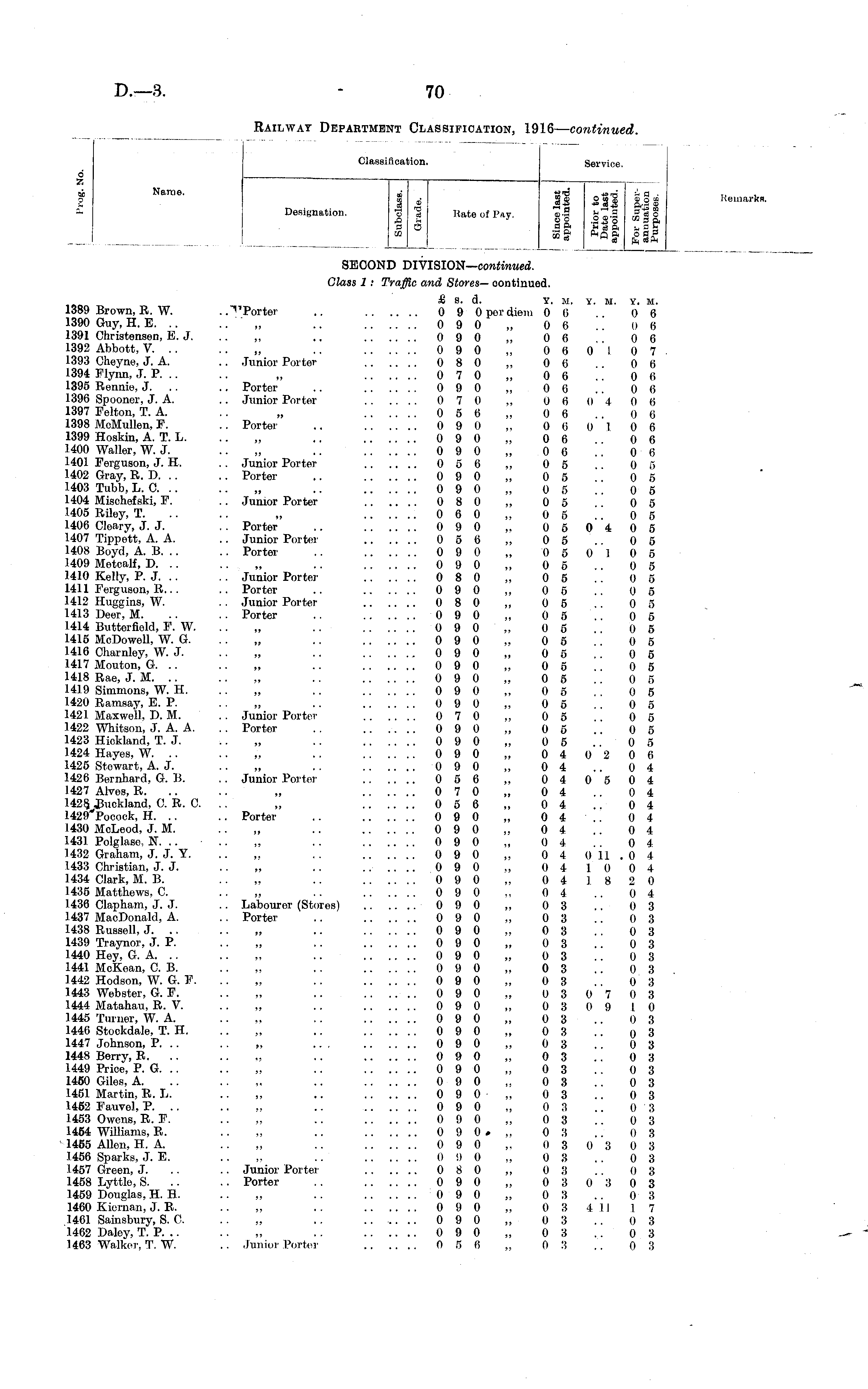 Classification. Service. A ah Name. p d Y, ah o 1 £ %t sit lis Designation. J | Rate'of Pay, || g-| Jj | co to& & oaoa3 d H sa ft, a a Keuaarks. SECOND DIVISION— continued. Glass 1 : Traffic and Stores— oontinued. 1389 Brown, R. W. 1390 Guy, H. E. 1391 Christensen, E. J. 1392 Abbott, V. .. 1393 Cheyne, J. A. 1394 Flynn, J. P. 1395 Rennie, J. . . 1396 Spoonor, J. A. 1397 Folton, T. A. 1398 McMullen, P. 1399 Hoskin, A. T. L. 1400 Waller, W. J. 1401 For-guson, J. H. 1402 Gray, R. D. .. 1403 Tubb, L. C. 1404 Mischefski, F. 1405 Riloy, T. 1406 Cloary, J. J. 1407 Tippett, A. A. 1408 Boyd, A. B. .. 1409 Metcalf, D. .. 1410 Kelly, P. J. 1411 Ferguson, R.. . 1412 Huggins, W. 1413 Deer, M. 1414 Butterfiold, F. W. 1415 McDowell, W. G. 1416 Charnley, W. J. 1417 Mouton, G. .. 1418 Rae, J. M. 1419 Simmons, W. H. 1420 Ramsay, E. P. 1421 Maxwoll, D. M. 1422 Whitson, J. A. A. 1423 Hickland, T. J. 1424 Hayes, W. .. 1425 Stewart, A. J. 1426 Bornhard, G. B. 1427 Alves, R. J3uckland, C. R. C. 1429*Pocock, H. .. 1430 McLeod, J. M. 1431 Polglase. N. .. 1432 Graham, J. J. Y. 1433 Christian, J. J. 1434 Clark, M. B. 1435 Matthews, C. 1436 Clapham, J. J. 1437 MacDonald, A. 1438 Russell, J. .. 1439 Traynor, J. P. 1440 Hey, G. A. 1441 McKean, C. B. 1442 Hodson, W. G. P. 1443 Webster, G. F. 1444 Matahau, R. V. 1445 Turner, W. A. 1446 Stockdale, T. H. 1447 Johnson, P. .. 1448 Berry, R. .. 1449 Price, P. G. 1450 Giles, A. 1451 Martin, R. L. 1462 Fauvel, P. .. 1453 Owens, R. F. 1464 Williams, R. 1455 Allen, H. A. 1456 Sparks, J. E. 1457 Green, J. 1458 Lyttlo, S. 1459 Douglas, H. H. 1460 Kiornan, J. R. 1461 Sainsbury, S. C. 1462 Daloy, T. P. .. 1463 Walker-, T. W. £ 8. d. Y. M. Y. M. Y. M. .. 0 9 0 por diem 0 6 .. 0 6 • • ' ., .. 0 9 0 „ 0 6 .. 0 6 0 9 0 „ 0 6 .. 0 6 090 „ 060107 .. Junior Porter 080 ,, 06 .. 06 070 „ 06 06 .. Porter .. 0 9 0 „ 0 6 .. 0 6 .. Junior Porter 0 7 0 ,, 0 6 0 4 0 6 0 5 6 „ 0 6 .. 0 6 .. Porter .. 0 9 0 ,, 0 6 0 1 0 6 0 9 0 „ 0 6 .. 0 6 0 9 0 „ 0 6 .. 0 6 . . Junior Porter 0 5 6 „ 0 5 .. 0 5 .. Porter .. 090 „ 05 .. 05 090 „ 05 .. 05 .. Junior Porter 080 ,, 05 .. 05 0 6 0 „ 0 5 .. 0 5 . . Porter .. 090 „ 05 04 05 .. Junior Porter 056 ,, 05 .. 05 .. Porter .. 0 9 0 „ 0 5 0 1 0 5 -..„ .. 090 „ 05 .. 05 .. Junior Porter 080 „ 05 .. 05 .. Porter .. 090 „ 05 .. 05 . . Junior Porter 0 8 0 „ 0 5 .. 0 5 . . Porter .. 090 „ 05 .. 05 0 9 0 „ 0 5 .. 0 5 090 „ 05 .. 05 0 9 0 „ 0 5 .. 0 5 090 „ 05 .. 05 0 9 0 „ 0 5 .. 0 5 0 9 0 „ 0 5 .. 0 5 0 9 0 „ 0 5 .. 0 5 . . Junior Porter 0 7 0 „ 0 5 .. 0 5 . . Porter .. 0 9 0 „ 0 5 .. 0 5 0 9 0 „ 0 5 .. 0 5 0 9 0 „ 0 4 0 2 0 6 090 „ 04 .. 04 . . Junior Porter- 056 ,, 0 4 05 04 070 „ 04 .. 04 056 „ 04 .. 04 .. Porter .. 0 9 0 „ 0 4 .. 0 4 090 „ 04 .. 04 0 9 0 „ 0 4 .. 0 4 0 9 0 „ 0 4 0 11 . 0 4 090 „ 041004 0 9 0 „ 0 4 18 2 0 0 9 0 ,, 0 4 .. 0 4 .. Labourer (Stores) 0 9 0 „ 0 3 .. 0 3 . . Porter .. 0 9 0 „ 0 3 .. 0 3 0 9 0 „ 0 3 . . 0 3 0 9 0 „ 0 3 .. 0 8 0 9 0 „ 0 3 .. 0 3 0 9 0 „ 0 3 .. 0 3 0 9 0 „ 0 3 .. 0 3 0 9 0 „ 0 3 0 7 0 3 0 9 0 „ 0 3 0 9 10 0 9 0 „ 0 3.. 0 3 0 9 0 „ 0 3 .. o 3 0 9 0 „ 0 3 .. 0 3 0 9 0 „ 0 3 .. 0 3 090 „ 03 .. 03 090 „ 03 .. 03 0 9 0,, 03 .. 03 0 9 0 „ 0 3 .. 0 :i 0 9 0 „ 0 3 .. 0 3 0 9 0*,, 03 .. 03 0 9 0 ,, 0 3 0 3 0 3 0 9 0 „ 0 3 .. 0 3 .. Junior Porter- 0 8 0 ,, 0 8 .. 0 3 .. Porter .. 0 9 0 „ 0 3 0 8 0 3 0 9 0 „ 0 3 .. 0 3 0 9 0 „ 0 3 4 11 17 0 9 0 „ 0 3 .. 0 3 0 9 0 „ 0 3 .. 0 3 .. Junior Porter 0 5 6 „ 0 3 .. 0 3