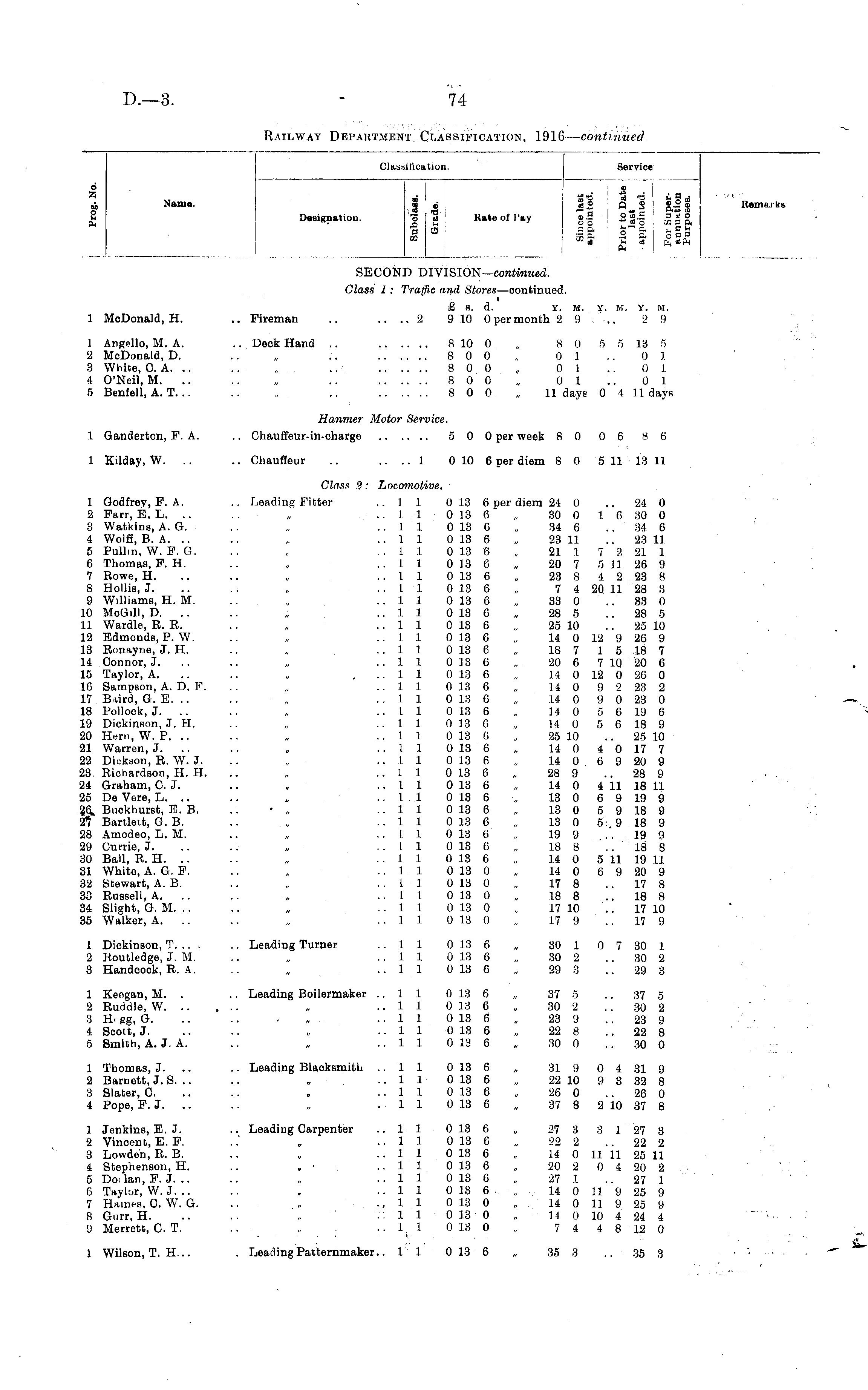 d A ,4 Names o vc a 6 ft oc o u £ Classification. Service 3> » ' . »'S ' 3 s a §» Designation. o «i Kate of Pay 3)3 S3 -a 35 2 a a a a § ft fa a fa £ 53 a .3 a o c a "* -"cefasOfcrCta I * - Clas: uficaUon. no I 5 e - , "3 cj ed ■§ Si CO I Hate of Pay Renrnrba Designation. SECOND DIVISION— continued. Class 1 : Traffic and Stores —oontinued. 1 McDonald, H. £ 8. d. Y. M. Y. M. Y. M. .. Fireman .. .... 2 9 10 Opermonth 2 9 .. 2 9 1 Angpllo, M. A. 2 McDonald, D. 3 White, CA. .. 4 O'Neil, M. .. 5 Benfell, A. T. .. .. Deck Hand .. 8 10 0 „ 8 0 5 5 13 6 8 0 0 „ 0 1 .. 0 1 8 0 0 , 0 1 .. 0 1 8 0 0 „ 0 1 .. 0 1 8 0 0 „ 11 days 0 4 11 days Hanmer Motor Service. 1 Ganderton, F. A. .. Chauffeur-in-charge 5 0 0 per week 8 0 0 6 8 6 1 Kilday, W. .. .. Chauffeur .. .... 1 0 10 6 per diem 8 0 5 11 13 11 Class 2: Locomotive. 1 Godfrey, P. A. 2 Parr, E. L. .. 3 Watkins, A. G. 4 Wolff, B. A. .. 5 Pullm, W. P. G. 6 Thomas, P. H. 7 Bowe, H. 8 Hollis, J. 9 Williams, H. M. 10 MoGill, D. 11 Wardle, R. R. 12 Edmonds, P. W. 13 Ronayne, J. H. 14 Connor, J. 15 Taylor, A. 16 Sampson, A. D. F. 17 Baird, G. E. .. 18 Pollock, J. .. 19 Dickinson, J. H. 20 Hern, W. P. .. 21 Warren, J. 22 Dickson, R. W. J. 23 Richardson, H. H. 24 Graham, C J. 25 De Vere, L. .. 2A Buokhurst, E. B. 27 Bartlett, G. B. 28 Amodeo, L. M. 29 Currie, J. 30 Ball, R. H. 31 White, A. G. F. 32 Stewart, A. B. 33 Russell, A. 34 Slight, G. M. .. 35 Walker, A. .. .. Leading Fitter ..11 0 13 6 per diem 24 0 .. 24 0 .... 1 1 0 13 6 „ 30 0 1 0 30 0 ..11 0 13 6 34 6 34 6 ..11 0 13 6 „ 23 11. 23 11 .. I 1 0 13 6 2117 2 21 1 .. 1 1 0 13 6 20 7 5 11 26 9 .. 1 1 0 13 6 23 8 4 2 23 8 ..110 18 6 „ 7 4 20 11 28 3 ..11 0 13 6 „ 33 0 .. 83 0 ,, ..11 0 13 6 „ 28 5 28 5 .. 1 1 0 18 6 25 10 .. 25 10 .. 1 1 0 13 6 „ 14 0 12 9 26 9 .. 1 1 0 18 6 18 7 1 5 18 7 ..11 0136 „ 20 6 7 10 20 6 ... 1 1 0 13 6 „ 14 0 12 0 26 0 .. 1 1 0 13 6 „ 1.4 0 9 2 23 2 ..11 0 IB 6 14 0 9 0 23 0 .. 1 1 0 13 6 „ 14 0 5 6 19 6 .. 1 1 0 13 6 „ 14 0 5 6 18 9 .. 1 1 ■ 0 18 6 , 25 10 .. 25 10 .. 1 1 0 13 6 14 0 4 0 17 7 „ ..11 0 13 6 „ 14 0 6 9 20 9 ..11 0 13 6 „ 28 9 .. 28 9 .. 1 . 1 0 18 6 14 0 4 11 18 11 ..1,1 0 13 6 „ 13 0 6 9 19 9 ..11 0 13 6 „ 13 0 5 9 18 9 .. 1 1 0 13 6 „ 13 0 5 9 18 9 ..11 0 13 6 ,, 19 9 ..199 ..11 0 13 0 „ 18 8 .. 18 8 .11 0 13 6 14 0 5 11 19 11 . ■ 1 1 0 13 0 „ 14 0 6 9 20 9 ..11 0 13 0 „ 17 8 .. 17 8 ..110130,, 18 8 .. 18 8 ..11 0 13 0 „ 17 10 17 10 .. 1 1 0 1.3 0 „ 1.7 9 17 9 1 Dickinson, T. .. » 2 Routledge, J. M. 3 Handoock, R. A. .. Leading Turner ..11 0 18 6 „ 30 1 0 7 30 1 .. 1 1 0 18 6 30 2 30 2 .. 1 1 0 13 6 „ 29 3 .. 29 3 1 Kengan, M. . 2 Ruddle, W. .. 3 H, gg, G. 4 Scoit, J. 5 Smith, A. J. A. .. Leading Boilermaker ..11 0 18 6 „ 37 5 .. 37 5 ... „ ..11 0 18 6 , 30 2 .. 30 2 ..11 0 13 6 „ 23 9 23 9 .. 1 1 0 13 6 22 8 .. 22 8 .. 1 1 • 0 18 6 30 0 30 0 1 Thomas, J. 2 Barnett, J. S. .. 3 Slater, 0. 4 Pope, P. J. .. Leading Blacksmith ..11 0 13 6 „ 31 9 0 4 31 9 .. 1 1 0 13 6 22 10 9 3 32 8 ..11 0 13 6 „ 26 0 .. 26 0 .. 1 1 0 18 6 37 8 2 10 37 8 1 Jenkins, E. J. 2 Vincent, E. F. 3 Lowdeh, R. B. 4 Stephenson, H. 5 Doilan, P. J. .. 6 Taylor, W. J. .. 7 Haines, C W. G. 8 Gurr, H. 9 Merrett, C. T. 1 Wilson, T. H... .. Leading Carpenter ..11 0 13 6 „ 27 3 3 1 27 3 .. 1 1 0 13 6 „ 22 2 .. 22 2 .. 1 1 0 13 6 „ 14 0 11 11 25 11 ..11 0 13 6 „ 20 2 0 4 20 2 .'.-, •• 1 1 0 13 6 27 1 .. 27 1 ..11 013 6, , 14 0 11 9 25 9 ... 1 1 0 13 0 „ 14 0 11 9 25 9 .--. 1 1 0 13- 0 ,,14 0 10 4 24 4 .. 11 0 13 0 „ 7 4 4 8 12 0 . Leading Patternmaker.. 11 0 13 6 ,, 35 3 .. 35 3