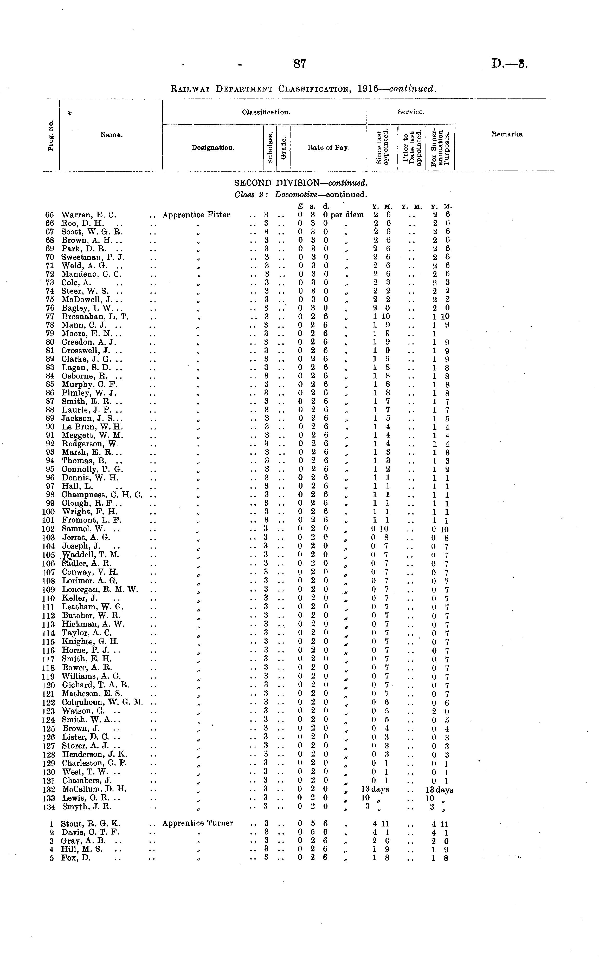 H- Classification. Service. Classification. Service. o , — -- ■ —■ Z , j a » Name - i 6 si sll $si £ ip — a — s -y'.^ m a Designation. "3 ce Kate of Fay. g-g eSs-a co g g, co ° ■•? & £ Q a o a a * ''- cd M cC [jq C3 rH 6 Z ah 5 u a i* a ■ CJ o a,— ® CO .5 cd o 5 a oaa a «Sr. R„ Remarks, lemur' rk ks, 1, SECOND DIVISION— continued. Class 2 : Locomotive —oontinued. £ s. d. Y. M. Y. M. Y. M. 65 Warren, E. C. .. Apprentice Fitter .. 3 .. 0 3 0 ner diem 2 6 .. 2 6 66 Roe, D. H. .. .. „ .. 8 .. 0 8 0 2 6 .. 2 6 67 Scott, W. G. R. .. „ .. 3 .. 0 3 0 „ 2 6 .. 2 6 68 Brown, A. H... .. , .. 3 .. 0 3 0 „ 2 6 .. 2 6 69 Park, D. R. .. .. „ .. 3 .. 0 3 0 „ 2 6 .. 2 6 70 Sweetman, P. J. .. „ .. 3 .. 0 3 0 „ 2 6 .. 2 6 71 Weld, A. G. .. .. „ .. 3 .. 0 3 0 „ 2 6 .. 2 6 72 Mandeno, 0. C .. „ .. 3 .. 0 3 0 „ 2 6 ..26 73 Cole, A. .. .. , .. 8 .. 0 8 0 2 3 .. 2 3 74 Steer, W. S. .. .. „ .. 3 .. 0 3 0 „ 2 2 .. 2 2 75 MoDowell, J. .. .. , .. 3 .. 0 3 0 „ 2 2 .. 2 2 76 Bagley, I. W. .. .. „ .. 3 ..' 0 3 0 „ 2 0 .. 2 0 77 Brosnahan, L. T. .. „ .. 3 .. 0 2 6 „ 1 10 .. 1 10 78 Mann, 0. J. .. .. „ .. 3 .. 0 2 6 „ 19 .. 19 79 Moore, E.N. .. .. „ .. 8 .. 0 2 6 1. 9 .. 1 80 Creedon. A. J. .. „ .. 3 .. 0 2 6 „ 19 .. 19 81 Crosswell, 3. .. .. „ .. 3 .. 0 2 6 „ 19 .. 19 82 Clarke, J. G. .. .. „ .. 3 .. 0 2 6 „ 19 .. 19 83 Lagan, S. D. .. .. „ .. 3 .. 0 2 6 „ 18 .. 18 84 Osborne, R. .. .. „ .. 3 .. 0 2 6 „ 18 .. 18 85 Murphy, C. P. .. . .. 3 .. 0 2 6 1 8 .. 1 8 86 Pimley, W. J. .. „ .. 3 .. 0 2 6 „ 18 .. 18 87 Smith, E. R. .. .. , .. 3 .. 0 2 6 „ 17 .. 17 88 Laurie, J. P. .. .. „ .. 3 .. 0 2 6 „ 17 .. 17 89 Jackson, J. S... .. . .. 3 .. 0 2 6 „ 15 .. 15 90 Le Bran, W. H. .. „ .. 3 .. 0 2 6 „ 14 .. 14 91 Meggett, W. M. .. „ .. 3 .. 0 2 6 , 14 .. 14 92 Rodgerson, W. .. „ .. 8 .. 0 2 6 1 4 .. 1 4 93 Marsh, E. R. .. .. „ .. 3 .. 0 2 6 „ 13 .. 13 94 Thomas, B. .. .. „ .. 3 .. 0 2 6 „ 13 .. 13 95 Connolly, P. G. .. „ .. 3 .. 0 2 6 1 2 .. 1 2 96 Dennis, W. H. .. „ .. 3 .. 0 2 6 1 1 .. 1 1 97 Hal), L. .. .. . .. 3 .. 0 2 6 1 1 .. 1 1 98 Champness, C. H. C. .. „ .. 3 .. 0 2 6 „ 11 .. 11 99 Clough, R. F... .. „ .. 3 .. 0 2 6 „ 11 .. 11 100 Wright, P. H. .. „ .. 3 .. 0 2 6 11 .. 11 101 Fromont, L. F. .. „ .. 3 .. 0 2 6 „ 11 .. 1 i 102 Samuel, W. .. .. „ .. 3 .. 0 2 0 , 0 10 .. 0 10 103 Jerrat, A. G. .. „ .. 3 .. 0 2 0 0 8 .. 0 8 104 Joseph, J. .. .. „ .. 3 .. 0 2 0 0 7 .. 0 7 105 Waddell, T. M. .. .. 3 .. 0 2 0 , 0 7 .. 0 7 106 Batter, A. R. .. „ .. 3 .. 0 2 0 „ 0 7 .. 07 107 Conway, V. H. .. , .. 3 .. 0 2 0 , 0 7 .. 07 108 Lorimer, A. G. .. „ .. 3 .. 0 2 0 ■„ 0 7 .. 0 7 109 Lonergan, R. M. W. .. „ -. 3 .. 0 2 0 0 7 .. 0 7 110 Keller, J. .. .. „ .. 3 .. 0 2 0 , 0 7 .. 07 111 Leatham, W. G. .. „ .. 3 .. 0 2 0 0 7 .. 07 112 Butcher, W. R. .. „ • • 3 .. 0 2 0 0 7 .. 07 113 Hickman, A. W. .. ,, .. 3 .. 0 2 0 „ 0 7 .. 07 114 Taylor, A. C .. „ .. 3 .. 0 2 0 0 7 .. 0 7 115 Knights, G. H. .. .. 3 .. 0 2 0 , 0 7 ..0 7 116 Home, P. J... .. „ .. 3 .. 0 2 0 . 0 7 .. 0 7 117 Smith, E. H. .. „ .. 3 .. 0 2 0 „ 07 .. 0 7 118 Bower, A. R. .. „ .. 3 .. 0 2 0 07 .. 07 119 Williams, A. G. .. „ .. 3 .. 0 2 0 0 7 .. 07 120 Gichard, T. A. R. .. , .. 3 .. 0 2 0 „ 0 7.. 0 7 ] 21 Matheson, E. S. .. „ .. 3 .. 0 2 0 „ 0 7 .. 0 7 122 Colquhoun, W. G. M. .. .. 3 .. 0 2 0 „ 0 6 .. 0 6 123 Watson, G. .. .. „ .. 3 .. 0 2 0 0 6 .. 2 0 124 Smith, W. A... .. „ .. 3 .. 0 2 0 „ 0 5 .. 0 5 125 Brown, J. .. „ .. 3 .. 0 2 0 „ 0 4 .. 0 4 126 Lister, D. C. .. .. „ .. 3 .. 0 2 0 „ 0 3 .. 0 3 127 Storer, A. J. .. .. .. 3 .. 0 2 0 „ 0 3 .. 0 3 128 Henderson, J. K. .. „ .. 3 .. 0 2 0 „ 0 3 .. 0 3 129 Charleston, G. P. .. „ .. 3 .. 0 2 0 •„ 0 1 . . 0 1 130 West, T. W. •• •• „ .. 3 .. 0 2 0 „ 0 1 .. 0 1 131 Chambers, J. .. „ .. 3 .. 0 2 0 0 1 .. 0 1 132 McCallum, D. H. .. „ .. 3 .. 0 2 0 „ 13 days .. 13 days 133 Lewis, O. R. .. .. „ .. 3 .. 0 2 0 „, 10 „ .. ]0 „ 134 Smyth, J. R. .. , .. 3 .. 0 2 0 , 3 t .. 3 1 Stout, R. G. K. .. Apprentice Turner .. 3 .. 0 5 6 „ 4 11 .. 4 11 2 Davis, C. T. P. .. „ .. 3 .. 0 5 6 „ 4 1 .. 4 1 3 Gray, A. B. .. .. „ .. 3 .. 0 2 6 „ 2 0 .. 2 0 4 Hill, M. S. .. .. „ .. 3 .. 0 2 6 „ 19 .. 19 5 Pox, D. .. .. „ -. 3 .. 0 2 6 1 8 .. 1 8