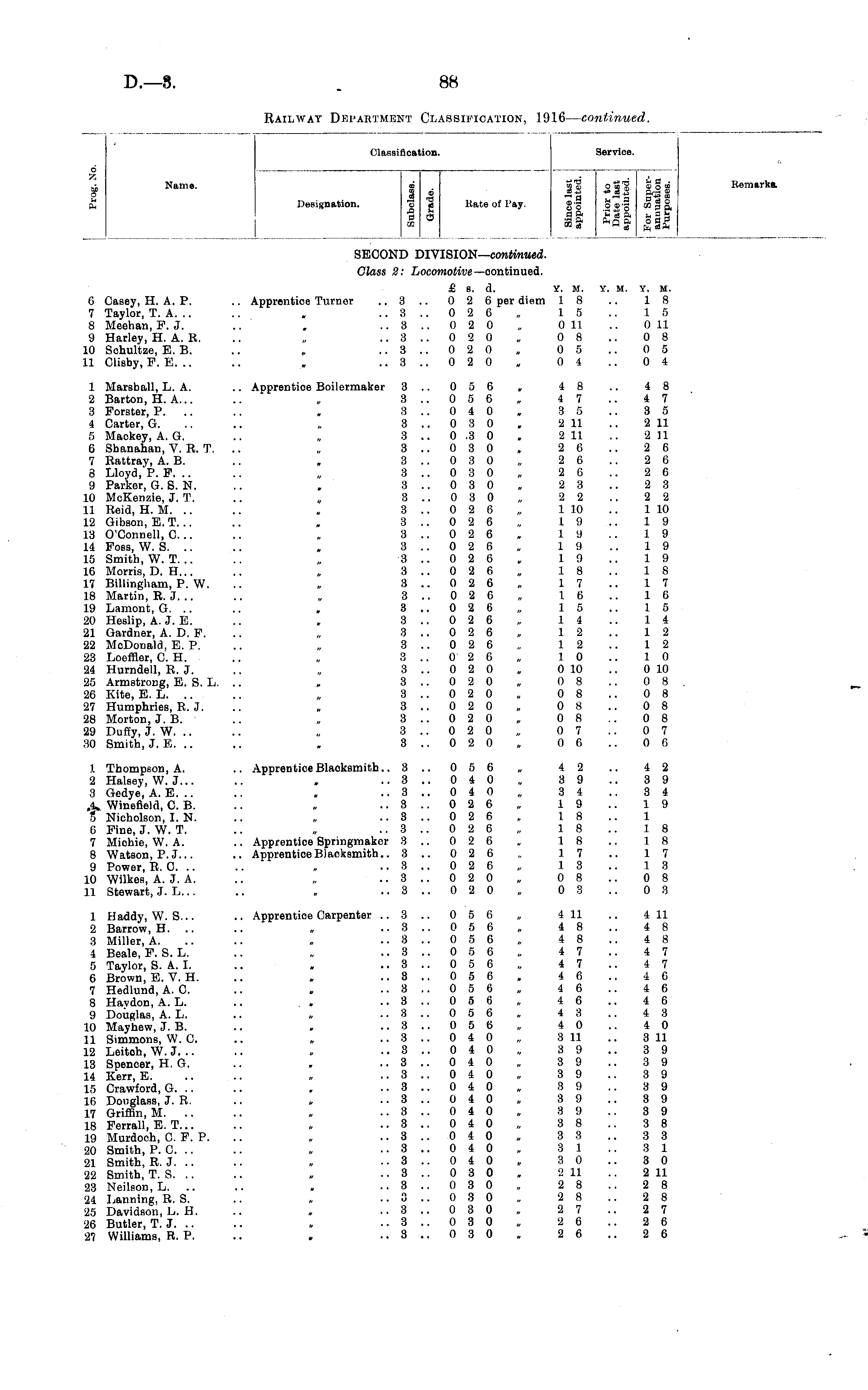 Classification. Service. ti Name. ft 6 V, i wrj 00 W q i m a Designation. o «e Kate of Pay. g-g a 5 II co co S SECOND DIVISION— continued. Glass 2: Locomotive— oontinued. ft sis So og'o a a B|i »it a-2Si >4"a a-gg .2 .go °°BP, C« a 54 a b ft q ft o a a W (4 £j cjft 54 fl . 05 o * 0..55 CD 3-55. 5 CO B p. n ° a o a a ft aft RemarkB. 6 Casey, H. A. P. 7 Taylor, T. A. .. 8 Meehan, F. J. 9 Harley, H. A. R. 10 Schultze, E. B. 11 Clisby, F. E. .. £ s. d. y. m. .. Apprentice Turner .. 3 .. 0 2 6 per diem 1 8 .. 3 .. 0 2 6 15 .. 3 .. 0 2 0 0 11 .. 3 .. 0 2 0 „ 0 8 .. 3 .. 0 2 0 0 5 .. 3 .. 0 2 0 0 4 Y. M. Y. M. 18 15 0 11 0 8 0 5 0 4 1 Marshall, L. A. 2 Barton, H. A... 3 Forster, P. .. 4 Carter, G. 5 Mackey, A. G. 6 Shanahan, V. R. T. 7 Rattray, A. B. 8 Lloyd, P. F. 9 Parker, G. S. N. 10 McKenzie, J. T. 11 Reid, H. M. 12 Gibson, E. T... 13 O'Connell, C... 14 Fosa, W. S. 15 Smith, W. T. .. 16 Morris, D. H... 17 Billingham, P. W. 18 Martin, R. J. .. 19 Lamont, G. .. 20 Heslip, A. J. E. 21 Gardner, A. D. F. 22 McDonald, E. P. 23 Loeffler, C. H. 24 Hurndell, R. J. 25 Armstrong, E. S. L. 26 Kite, E. L. 27 Humphries, R. J. 28 Morton, J. B. 29 Duffy, J. W. 30 Smith, J. E. .. Apprentice Boilermaker 3 .. 0 5 6 , 4 8 3 .. 0 5 6 „ 47 3 .. 0 4 0 3 5 3 .. 0 3 0 2 11 3 .. 0 .3 0 2 11 3 .. 0 3 0 2 6 3 .. 0 3 0 2 6 3 .. 0 3 0 2 6 3 .. 0 3 0 2 3 3 .. 0 3 0 2 2 3 .. 0 2 6 1 10 3 .. 0 2 6 19 3..026. 19 3 .. 0 2 6 19 3 .. 0 2 6 19 3 .. 0 2 6 18 3 .. 0 2 6 17 3 .. 0 2 6 16 3 .. 0 2 6 15 3 .. 0 2 6 14 3 .. 0 2 6 12 3 .. 0 2 6 „ 12 3 .. 0 2 6 10 3 .. 0 2 0 0 10 3..020„ 0 8 3 .. 0 2 0 0 8 3.. 020,, 08 3 .. 0 2 0 0 8 3 .. 0 2 0 0 7 3 .. 0 2 0 0 6 4 8 4 7 3 5 2 11 2 11 2 6 2 6 2 6 2 3 2 2 1 10 19 19 19 19 IS 17 16 15 14 12 12 10 0 10 0 8 0 8 0 8 0 8 0 7 0 6 1 Thompson, A. 2 Halsey, W. J... 3 Gedye, A. E. .. ,4» Wineneld, C. B. 5 Nicholson, I. N. 6 Fine, J. W. T. 7 Miohie, W. A. 8 Watson, P. J... 9 Power, R. C. .. 10 Wilkes, A. J. A. 11 Stewart, J. L... .. Apprentice Blacksmith.. 3 .. 0 5 6 „ 4 2 ..3.. 040,, 39 ..3.. 040,, 34 .. 3 .. 0 2 6 19 .. 3 .. 0 2 6 18 .. 3 .. 0 2 6 18 .. Apprentice Springmaker 3 .. 0 2 8 „ 18 .. Apprentice Blacksmith.. 3 .. 0 2 6 „ 17 .. 8 .. 0 2 6 13 ..3..020„ 08 .. 3 .. 0 2 0 0 3 4 2 3 9 3 4 19 1 18 18 17 13 0 8 0 3 1 Haddy, W. S... 2 Barrow, H. 3 Miller, A. 4 Beale, F. S. L. 5 Taylor, S. A. I. 6 Brown, E. V. H. 7 Hedlund, A. C. 8 Haydon, A. L. 9 Douglas, A. L. 10 Mayhew, J. B. 11 Simmons, W. C. 12 Leitoh, W. J. .. 13 Spencer, H. G. 14 Kerr, E. 15 Crawford, G. .. 16 Douglass, J. R. 17 Griffin, M. .. 18 Ferrall, E. T... 19 Murdoch, C. F. P. 20 Smith, P. C. 21 Smith, R. J. 22 Smith, T. S. 23 Neilson, L. 24 Lanning, R. S. 25 Davidson, L. H. 26 Butler, T. J. 27 Williams, R. P. .. Apprentice Carpenter .. 8 .. 0 5 6 „ 4 11 .. 3 .. 0 5 6 4 8 .. 3 .. 0 5 6 „ 4 8 .. 3 .. 0 5 6 4 7 ..3.. 056,, 47 .. 3 .. 0 5 6 4 6 ..3.. 056,, 46 ..3.. 056,, 46 .. 3 .. 0 5 6 4 3 ..3.. 056,, 40 .. 3 .. 0 4 0 3 11 ..3..040,, 39 ..3.. 040,, 39 ,.3..040„ 39 .. 8 .. 0 4 0 3 9 .. 3 .. 0 4 0 „ 39 .. 3 .. 0 4 0 3 9 .. 3 .. 0 4 0 3 8 ..3..040, 33 .. 8 .. 0 4 0 8 1 .. 3 .. 0 4 0 8 0 .. 3 .. 0 3 0 2 11 ..8.. 030,, 28 .. 3 .. 0 3 0 „ 2 8 ..3.. 030,, 27 ..3.. 030,, 26 .. 3 .. 0 8 0 2 6 4 11 4 8 4 8 4 7 4 7 4 6 4 6 4 6 4 3 4 0 3 11 3 9 3 9 3 9 3 9 3 9 3 9 3 8 3 3 8 1 3 0 2 11 2 8 2 8 2 7 2 6 2 6