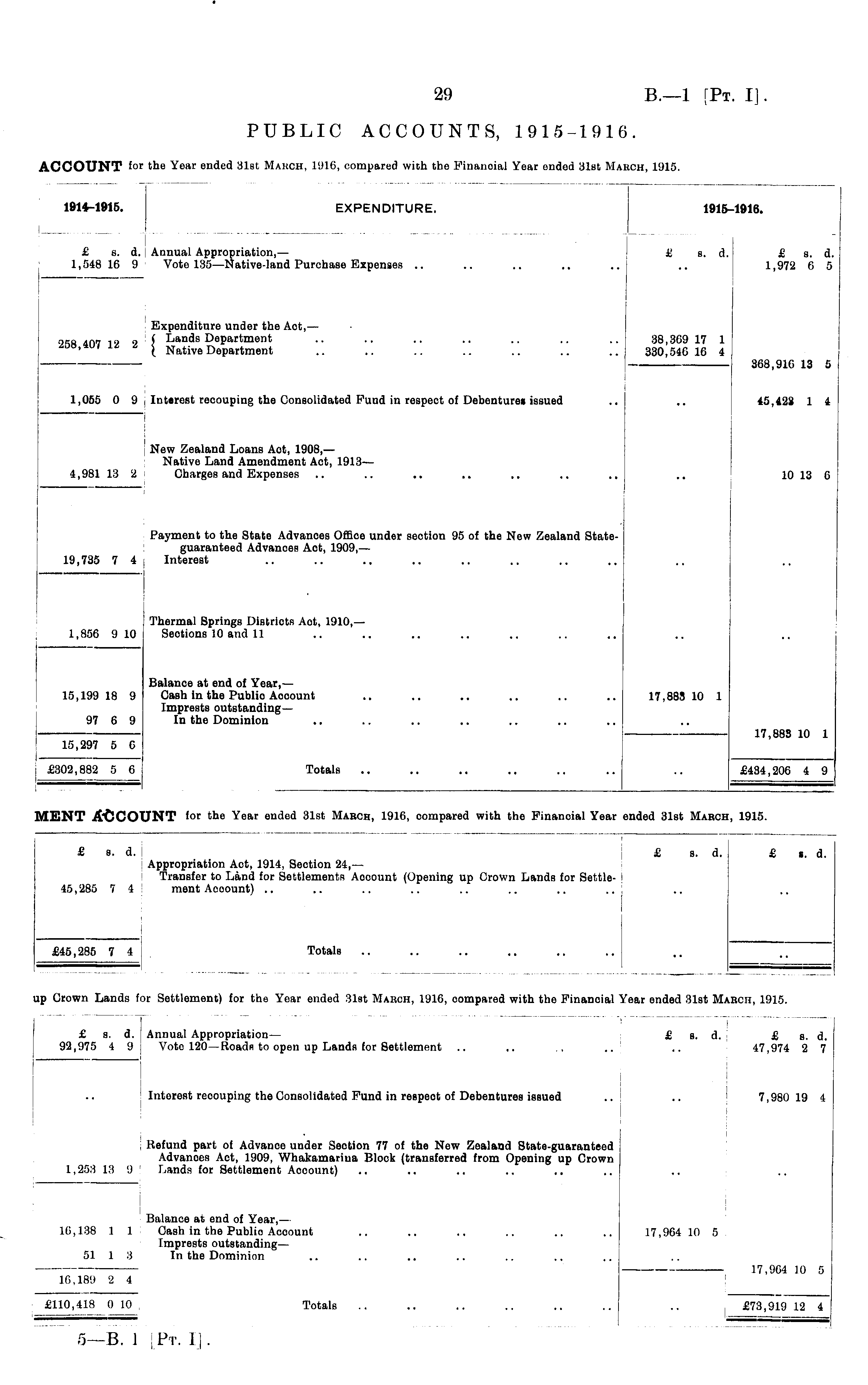 1914-1915. EXPENDITURE. 19151916. £ s. d. Annual Appropriation,— 1,548 16 9 Voto 135—Native-land Purchase Expenses .. £ s. d. £ s. d. 1,972 6 5 Expenditure under the Aot, — <)tvt ±cn 19 9 i Lands Department 258,407 12 2 £ Native Department 38,309 17 1 330,546 16 4 368,916 13 5 1,065 0 9 Interest recouping the Consolidated Fund in respect of Debentures issued 45,423 1 4 New Zealand Loans Aot, 1908, — Native Land Amendment Act, 1913 — 4,981 13 2 : Charges and Expenses .. 10 13 6 Payment to the State Advanoes Office under section 95 of the New Zealand Stateguaranteed Advanoea Aot, 1909, — 19,735 7 4 | Interest Thermal Springs Districts Aot, 1910,— 1,856 9 10 Sections 10 and 11 1,856 9 10 Balance at end of Year, — 15,199 18 9 Cash in the Publio Aocount Imprests outstanding— 97 6 9 In the Dominion 1 K. 297 f> fi 15,199 18 9 17,888 10 1 17,888 10 1 97 6 9 10,297 5 6 £302,882 5 6 Totals .. 15,297 5 6 £302,882 5 6 £434,206 4 9 ENT A-CCO NT for the Year ended 31st March, 1916, compared with the Finanoial Year onded 31st Mabc: , 1915. £ a. d. £ s. d. £ s. d. £ s. d. Appropriation Act, 1914, Section 24, — Transfer to Land for Settlements Aocount (Opening up Crown Lands for Settle45,285 7 4 j ment Acoount) .. 45,285 7 4 £46,285 7 4 Totals £45,285 7 4 ip Crown Lands fi p Crown Lands for Settlement) for the Year ended 31st March, 1916, compared with the Financial ' ('ear onded 31st March, 1915. I l £ s. d. 92,975 4 9 £ s. d. Annual Appropriation— 92,975 4 9 Vote 120—Roads to open up Landa for Settlement .. £ s. d. £ s. d. 47,974 2 7 Intorost recouping the Consolidated Fund in respeot of Debentures issued 7,980 19 4 Refund part of Advance under Section 77 of the New Zoaland State-guaranteed Advanoes Act, 1909, Whakamariua Block (transferred from Opening up Crown 1,253 13 9 Lands for Settlement Account) Balance at end of Year, — 16,138 1 1 Cash in the Publio Acoount Imprests outstanding— 51 1 3 In the Dominion 17,904 10 0 16,189 2 4 ■ 17,964 10 0 £110,418 0 10 Totals £73,919 12 4
