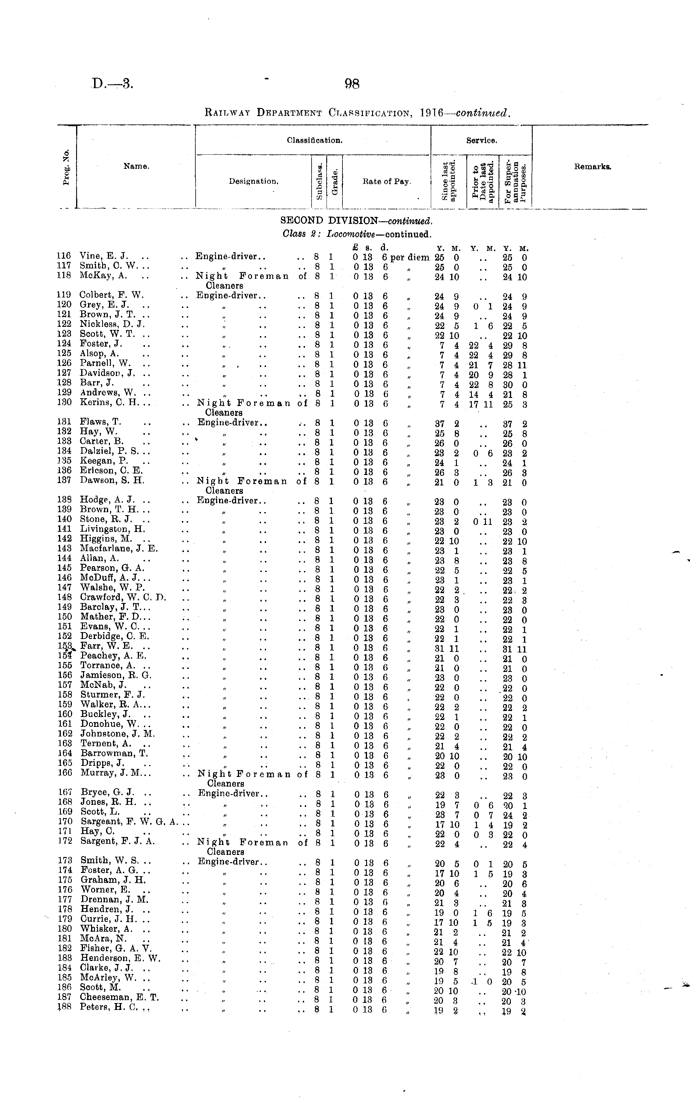 Classii ication. Service. tz - n ."""] TT".. ti Name. oi . (■'8 owl? cj § « Remarks. o j0 a ,rt 2 a Designation. -3 « Rate of Pay. *| i3o-§ coll rO rH '&* +5 " 3C3 .8 S 1 rT cc -r S- a q a o a 3 J - -^car-l^r^raa <3 Y) A o u a SECOND DIVISION— continued. Glass 2 : Locomotive —continued. £ s. d. Y. M. Y. M. Y. M. 116 Vine, E. J. .. .. Engine-driver.. ..8 1 0 13 6 per diem 25 0 .. 25 0 117 Smith, 0. W. .. .. „ .. ..8 1 0 13 6 „ 25 0 25 0 118 MoKay, A. .. ..Night Foreman of 8 1 0 13 6 „ 24 10 .. 24 10 Cleaners 119 Colbert, F. W. .. Engine-driver.. ..8 1 0 13 6 „ 24 9 .. 24 9 120 Grey, E. J. .. .. „ .. ..81 0 13 6 „ 24 9 0 1 24 9 121 Brown, J. T. .. .. „ .. ..8 1 0 13 6 „ 24 9 24 9 122 Nickless, I). J. .. „ .. ..8 1 0 13 6 „ 22 5 1 6 22 5 123 Scott, W. T. .. .. „ .. ..81 0 13 6 „ 22 10 .. 22 10 124 Foster, J. .. .. „ . .. ..81 0 13 6 „ 7 4 22 4 29 8 125 Alsop, A. .. .. „ .. ..81 0 13 6 „ 7 4 22 4 29 8 126 Parnell, W. .. .. „ , .. ..8 1 0 13 6 „ 7 4 21 7 28 11 127 Davidson, J. .. .. „ .. ..8 1 0 13 6 „ 7 4 20 9 28 1 128 Barr, J. .. .. „ .. ..81 0 13 6 „ 7 4 22 8 30 0 129 Andrews, W. .. .. „ .. ..81 0 13 6 „ 7 4 14 4 21 8 130 Kerins, 0. H. .. ..NightPoremanof8 1 0 13 6 „ 7 4 17 11 25 3 Cleaners 181 Flaws, T. .. .. Engine-driver.. ..8 1 0 13 6 37 2 37 2 132 Hay, W. .. .. „ .. ..81 0 13 6 „' 25 8 .. 25 8 133 Carter, B. .. .. ■» „ .. ..81 0 13 6 „ 26 0 .. 26 0 134 Dalziel, P. S. .. .. „ .. ..8 1 0 13 6 „ 23 2 0 6 23 2 335 Keegan, P. .. .. „ .. ..8 1 0 13 6 „ 24 1 24 1 136 Erioson, CE. .. , .. ..81 0 13 6 „ 26 3 26 3 137 Dawson, S. H. .. Night Foreman of 8 1 0 13 6 „ 21 0 1 8 21 0 Cleaners 138 Hodge, A. J. .. .. Engine-driver.. ..8 1 0 13 6 „ 23 0 .. 28 0 139 Brown, T. H. .. .. „ .. ..81 0 13 6 „ 23 0 23 0 140 Stone, R. J. .. .. „ .. ..81 0 13 6 „ 23 2 0 11 23 2 141 Livingston, H. .. „ .. ..8 1 0 13 6 „ 23 0 23 0 142 Higgins, M. .. .. „ ., ..8 1 0 13 6 „ 22 10 ..22 10 143 Macfarlane, J. E. .. „ .. ..81 0 13 6 „ 23 1 23 1 144 Allan, A. .. .. , .. ..81 0 13 6 „ 23 8 23 8 145 Pearson, G. A. .. „ .. .. 8 1 0 13 6 „ 22 5 22 5 146 MoDuff, A. J. .. .. „ .. ..81 0 13 6 „ 23 1 .. 23 1 147 Walsbe, W. P. .. „ .. .. 8 1 0 13 6 „ 22 2 22 2 148 Crawford, W. CD... „ .. .. 8 1 0 13 6 „ 22 3 22 3 149 Barclay, J. T... .. , .. .. 8 1 013 6 „ 23 0 23 0 150 Mather, P. D... .. „ .. ..8 1 0 13 6 „ 22 0 22 0 1.51 Evans, W. C .. .. , .. ..81 0 13 6 „ 22 1 22 1 152 Derbidge, 0. E. .. „ .. ..81 0 13 6 „ 22 1 .. 22 1 158. Farr, W. E. .. .. „ .. ..81 0 13 6 „ 31 11 .. 31 11 15? Peaohey, A. E. .. „ .. .. 8 1 0 18 6 „ 21 0 21 0 155 Torrance, A. .. ... „ .. .. 8 1 013 6 „ 21 0 21 0 156 Jamieson, R. G. .. „ .. .. 8 1 0 13 6 „ 23 0 23 0 157 McNab, J. .. „ .. ..81 0 13 6 „ 22 0 .. 22 0 158 Sturmer, P. J. .. , .. ..81 0 13 6 , 22 0 . 22 0 159 Walker, R. A... .. „ .. ..8 1 0 13 6 „ 22 2 .. 22 2 160 Buckley, J. .. .. „ .. ..81 0136 „ 22 1 .. 22 1 161 Donohue, W. .. .. „ .. .. 8 1 0 13 6 „ 22 0 22 0 162 Johnstone, J. M. .. „ .. ..81 0 13 6 „ 22 2 22 2 163 Ternent, A. .. .. „ .. .. 8 1 0 13 6 „ 21 4 21 4 164 Barrowman, T. ,., „ .. ..8 1 0 13 6 „ 20 10 .. 20.10 165 P"PP8, 3. . .. „ .. ..81 0 13 6 „ 22 0 .. 22 0 166 Murray, J. M... .. N igh t P o r em a n o f 8 1 0 1.3 6 „ 23 0 .. 23 0 Cleaners 167 Bryce, G. J. .. .. Engine-driver.. ..8 1 0 13 6 „ 22 3 22 3 168 Jones, R. H. .. .. , .. ..81 0 13 6 „ 19 7 0 6 20 1 169 Scott, L. .. .. „ .. ..8 1 0 13 6 „ 23 7 0 7 24 2 170 Sargeant, P. W. G. A. .. , .. ..8 1 0 18 6 „ 17 10 14 19 2 171 Hay, 0. .. .. „ .. ..8 1 0 13 6 „ 22 0 0 3 22 0 172 Sargent, P. J. A. .. Night Foreman of 8 1 0 13 6 „ 22 4 22 4 CleanerB 173 Smith, W. S. .. .. Engine-driver.. ..8 1 0 13 6 „ 20 5 0 1 20 5 174 Foster, A. G „ .. ..81 0 13 0 „ 17 10 1 5 19 3 175 Graham, J. H. 8 1 0 13 6 „ 20 6 .. 20 6 176 Worner, E „ .. ..81 0 13 6 „ 20 4 . 20 4 III £ re T a "' ?■ M 8 1 ° 13 <> » 21 3 .. 21 8 178 Hendren, 3. 8 1 0 13 6 „ 19 0 1 6 19 5 on wmI' 3 '? ■' 8 " ° 18 6 • " 10 1 5 19 3 1.80 Whisker, A „ .. .. 8 1 0 13 6 „ 21 2 21 2 ,ao ra, ?-A * '■ 8 1 0 13 6 . 21 4 .. 21 4 82 Fisher, G. A V 8 , 0 18 6 „ 22 10 .. 22 10 183 Henderson, E. W. .. „ .. .. 8 1 0 13 6 20 7 20 7 !«r M la A k ?' J 'w 8 1 0 I 3 6 • IS § •■ 19 8 185 McArley W f ,, .. 8 1 0 13 6 „ 19 5 .1 0 20 5 186 Scott, M „ ... ..8 1 0 13 6 „ 20 10 20 10 187 Cheeseman, E. T. .. „ .. ..8 1 0 13 6 oq q qq ... 188 Peters, H.C,,, ,. „ .. ,',8 1 0 18 6 ",, 19 2 ',', 19 2
