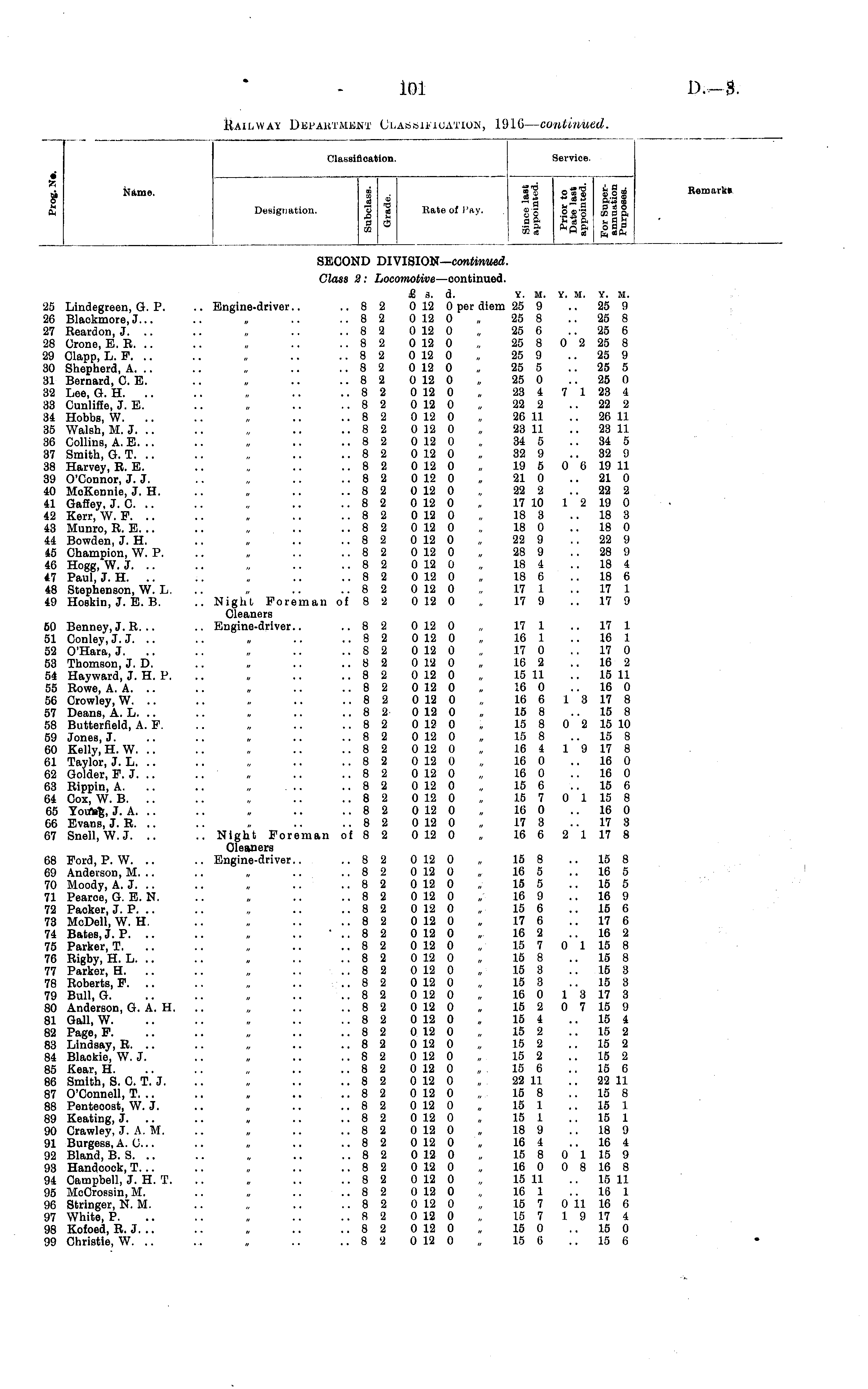 Olassi! I cation. Service. i to a Name. EC CO cd rO 02 "S -3 _ *»ro 81 2 § 2 "S X" 3 So oa-g a a E Tt a i 3 • II8 ft-t=> CO 3 * O 32 3 ft Jh fi h O IP Remark* Denigiiatiorr. 9 IB g 5 Kate of 1'ay. SECOND DIVISION— continued. 25 Lindegreen, G. P. 26 Blackmore, J... 27 Reardon, J. .. 28 Crone, E. R. 29 Clapp, L. P. 30 Shepherd, A. .. 31 Bernard, 0. E. 32 Lee, G. H. 33 Cunliffe, J. E. 34 Hobbs, W. .. 35 Walsh, M. J. 36 Collins, A. E. .. 37 Smith, G. T. 38 Harvey, R. E. 39 O'Connor, J. J. 40 McKennie, J. H. 41 Gaffey, J. 0. 42 Kerr, W. F. 43 Munro, R. E. .. 44 Bowden, J. H. 45 Champion, W. P. 46 Hogg, W. J. .. 47 Paul, J. H. 48 Stephenson, W. L. 49 Hoskin, 3. E. B. 50 Benney, J. R. .. 51 Conley, J. J. 52 O'Hara, J. 53 Thomson, J. D. 54 Hayward, J. H. P. 55 Rowe, A. A. 56 Crowley, W. .. 57 Deans, A. L. 58 Butterfield, A. F. 59 Jones, J. 60 Kelly, H. W. .. 61 Taylor, J. L. 62 Golder, P. J. 63 Rippin, A. 64 Cox, W. B. 65 Youttg, J. A. 66 Evans, J. R. 67 Snell, W.J. .. 68 Ford, P. W. 69 Anderson, M. .. 70 Moody, A. J. 71 Pearoe, G. E. N. 72 Packer, J. P. 73 McDell, W. H. 74 Bates, J. P. 75 Parker, T. 76 Rigby, H. L. 77 Parker, H. .. 78 Roberts, F. .. 79 Bull, G. 80 Anderson, G. A. H. 81 Gall, W. 82 Page, F. 83 Lindsay, R. .. 84 Blaokie, W. J. 85 Kear, H. 86 Smith, S. 0. T. J. 87 O'Connell, T. .. 88 Penteoost, W. J. 89 Keating, J. .. 90 Crawley, J. A. M. 91 Burgess, A. C.. 92 Bland, B. S. 93 Handcook, T... 94 Campbell, 3. H. T. 95 MoCrossin, M. 96 Stringer, N. M. 97 White, P. 98 Kofoed, R. J. .. 99 Christie, W. .. Class 2: Locomotive —continued. £ s. d. Y. M. Y. M. Y. M. .. Engine-driver.. ..8 2 0 12 0 per diem 25 9 .. 25 9 ..8 2 0 12 0 „ 25 8 25 8 ..82 0 12 0 „ 25 6 25 6 ..82 0 12 0 „ 25 8 0 2 25 8 ..82 0 12 0 „ 25 9 25 9 ..82 0 12 0 „ 25 5 .. 25 5 ..82 0 12 0 „ 25 0 25 0 ..82 0 12 0 „ 23 4 7 1 23 4 ..82 0 12 0 „ 22 2 22 2 ..82 0 12 0 „ 26 11 26 11 ..8 2 0 12 0 „ 23 11 .. 23 11 ..8 2 0 12 0 „ 34 5 34 5 ..82 0 12 0 „ 32 9 .. 32 9 ..8 2 0 12 0 „ 19 5 0 6 19 11 ..82 0 12 0 „ 21 0 21 0 ..82 0 12 0 „ 22 2 22 2 ..8 2 0 12 0 „ 17 10 1 2 19 0 ..82 0 12 0 „ 18 3 18 3 ..8 2 0 12 0 „ 18 0 .. 18 0 ..82 0 12 0 „ 22 9 .. 22 9 ..82 0 12 0 „ 28 9 28 9 ..82 0 12 0 „ 18 4 18 4 ..82 0 12 0 „ 18 6 ' .. 18 6 ..82 0 12 0 „ 17 1 17 1 .. Night Foreman of 8 2 0 12 0 . 17 9 17 9 Cleaners .. Engine-driver.. ..8 2 0 12 0 „ 17 1 .. 17 1 ..82 0 12 0 „ 16 1 16 1 ..82 0 12 0 „ 17 0 .. 17 0 ..8 2 0 12 0 „ 16 2 16 2 ..82 0 12 0 „ 15 11 15 11 ..82 0 12 0 „ 16 0 16 0 ..82 0 12 0 „ 16 6 1 3 17 8 .. 8 2 0 12 0 „ 15 8 15 8 ..82 0 12 0 „ 15 8 0 2 15 10 ..82 0 12 0 „ 15 8 15 8 ..82 0 12 0 „ 16 4 1 9 17 8 ..8 2 0 12 0 „ 16 0 .. 16 0 .. „ .. ..8 2 0 12 0 , 16 0 16 0 ..82 0 12 0 „ 15 6 .. 15 6 ..82 0 12 0 „ 15 7 0 1 15 8 ..82 0 12 0 „ 16 0 16 0 ..8 2 0 12 0 „ 17 3 .. 17 8 .. Night Foreman of 8 2 0 12 0 „ 16 6 2 1 17 8 OI oii.n fly n .. Engine-driver.. ..8 2 0 12 0 „ 15 8 .. 15 8 ..8 2 0 12 0 „ 16 5 16 5 ..8 2 0 12 0 „ 15 5 .. 15 5 ..8 2 0 12 0 „ 16 9 16 9 ..8 2 0 12 0 „ 15 6 15 6 ..8 2 0 12 0 „ 17 6 .. 17 6 '..82 0 12 0 „ 16 2 16 2 ..8 2 0 12 0 „ 15 7 0 1 15 8 ..82 0 12 0 „ 15 8 .. 15 8 ..82 0 12 0 „ 15 3 15 3 ..82 0 12 0 „ 15 3 .. 15 3 ..8 2 0 12 0 „ 16 0 1 3 17 3 ..8 2 0 12 0 „ 15 2 0 7 15 9 ..82 0 12 0 „ 15 4 .. 15 4 ..82 0 12 0 „ 15 2 15 2 ..82 0 12 0 „ 15 2 15 2 ..82 0 12 0 „ 15 2 .. 15 2 ..82 0 12 0 „ . 15 6 15 6 ..8 2 0 12 0 „ 22 11 .. 22 11 ..8 2 0 12 0 „ 15 8 .. 15 8 ..8 2 0 12 0 „ 15 1 15 1 ..8 2 0 12 0 „ 15 1 .. 15 1 ..8 2 0 12 0 „ 18 9 18 9 ..82 0120,, 16 4 16 4 ..82 0 12 0 „ 15 8 0 1 15 9 ..82 0 12 0 , 16 0 0 8 16 8 ..8 2 0 12 0 „ 15 11 .. 15 11 ..8 2 0 12 0 „ 16 1 .. 16 1 ..8 2 0 12 0 „ 15 7 0 11 16 6 ..82 0 12 0 „ 15 7 1 9 17 4 ..82 0 12 0 „ 15 0 .. 15 0 ..8 2 0 12 0 „ 15 6 15 6 •