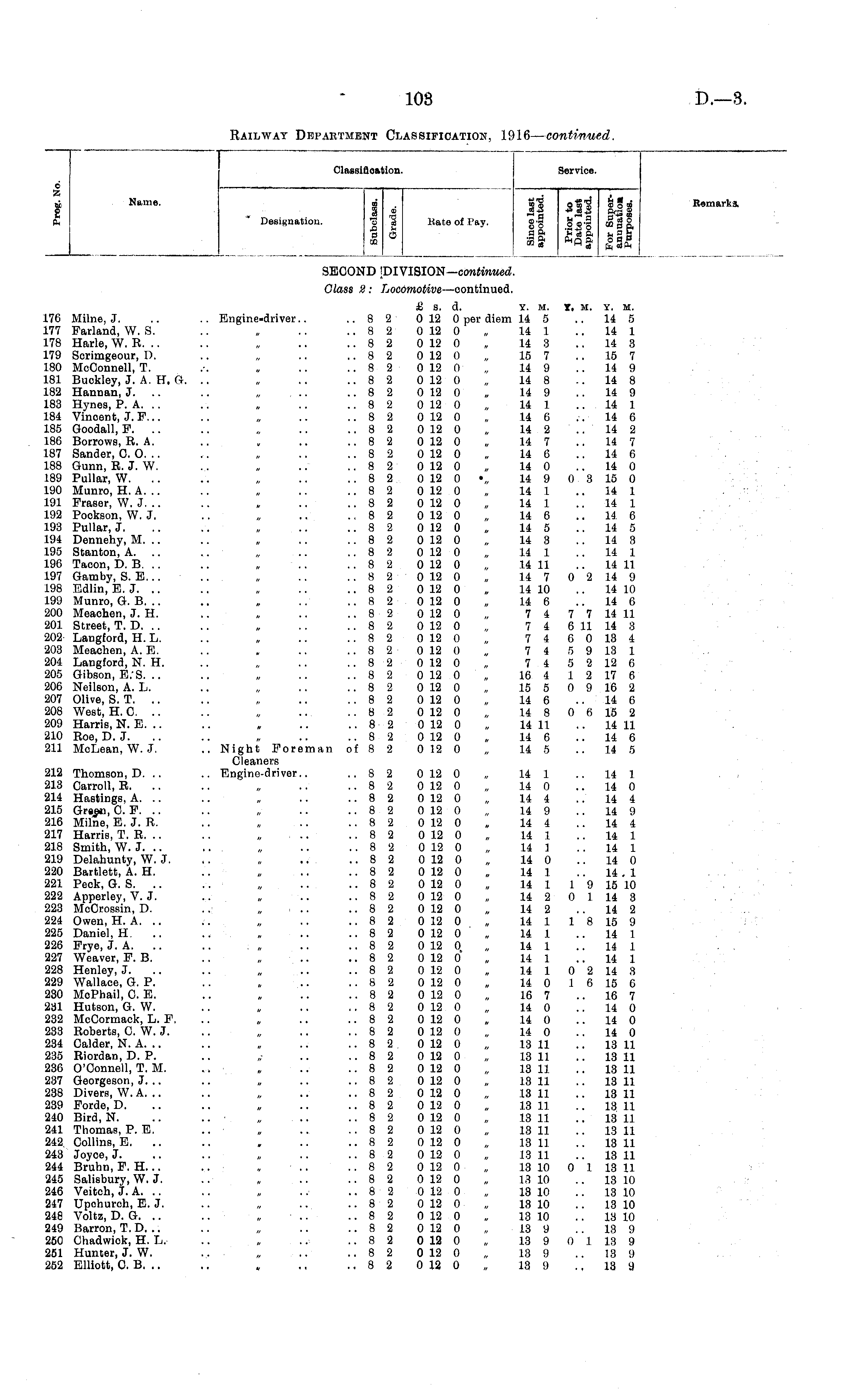 Classifleation. Service. A Name. 6 Y, I a a . f°\ .*._.. C8 _- r. r ri 8 "3 A 3 CO 31 a £ a a 33 g 1 tit I"8 £•£ ft+3 a «12-a SSa u" a SS'S If £ a u M . 33 O S Q..H CD 3 "S 9 rr S3 O CO a a u a E o P? 'm«Cf Remark 3. a Designation. "3 'S Rate of Pay. g'g if si 9 2 Kate of Pay. u"a s-gg SSo m 3a Qjao, r, a P Designation. co 33 £ . . a p a s a p M ca fi caa SECOND [DIVISION— continued. Class 2: fjocomotive —continued. 176 Milne, J. 177 Farland, W. S. 178 Harle, W. R. 179 Scrimgeour, I). 180 McConnell, T. 181 Buckley, J. A. H. G. 182 Hannan, J. 183 Hynes, P. A. 184 Vinoent, J. F... 185 Goodall, F. .. 186 Borrows, R. A. 187 Sander, CO... 188 Gunn, R. J. W. 189 Pullar, W. .. 190 Munro, H. A. .. 191 Praser, W. J. .. 192 Pookson, W. J. 193 Pullar, J. 194 Dennehy, M. .. 195 Stanton, A. .. 196 Tacon, D. B. 197 Gamby, S. E... 198 Edlin, E. J. 199 Munro, G. B. .. 200 Meaohen, J. H. 201 Street, T. D. 202 Langford, H. L. 203 Meaohen, A. E. 204 Langford, N. H. 205 Gibson, E.'S. .. 206 Neilson, A. L. 207 Olive, S. T. 208 West, H. 0. 209 Harris, N. E. .. 210 Roe, D. J. 211 McLean, W. J. 212 Thomson, D. .. 213 Carroll, R. .. 214 Hastings, A. .. 215 Green, 0. F. .. 216 Milne, E. J. R. 217 Harris, T. R. .. 218 Smith, W. J. 219 Delahunty, W. J. 220 Bartlett, A. H. 221 Peok, G. S. 222 Apperley, V. J. 223 McCrossin, D. 224 Owen, H. A. 225 Daniel, H. .. 226 Frye, J. A. 227 Weaver, F. B. 228 Henley, J. 229 Wallace, G. P. 230 MoPhail, C. E. 231 Hutson, G. W. 232 McCormack, L. F. 233 Roberts, O. W. J. 234 Calder, N. A. .. 235 Riordan, D. P. 236 O'Connell, T. M. 237 Georgeson, J. .. 238 Divers, W. A. .. 239 Forde, D. 240 Bird, N. 241 Thomas, P. E. 242 Collins, E. .. 243 Joyce, J. 244 Bruhn, P. H... 245 Salisbury, W. J. 246 Veitch, J. A. .. 247 Upohurch, E. J. 248 Voltz, D. G. 249 Barron, T. D. .. 250 Chadwiok, H. L, 251 Hunter, J. W. 252 Elliott, 0. B. .. £ a. d. Y. M. .. Engine-driver.. .. 8 2 0 12 0 per diem 1.4 5 ..82 0 12 0 „ 14 1 ..8 2 0 12 0 „ 14 3 ..8 2 0 12 0 „ 15 7 .. 8 2 0 12 0 „ 14 9 ..8 2 0 12 0 „ 14 8 ..8 2 0 12 0 „ 14 9 ..82 0 12 0 „ 14 1 ..82 0 12 0 „ 14 6 ..82 0 12 0 „ 14 2 ..8 2 0 12 0 „ 14 7 .. „ .. ..82 0 12 0 „ 14 6 ..82 0 12 0 „ 14 0 ..82 0 12 0 •„ 14 9 ..8 2 0 12 0 „ 14 1 ..82 0 12 0 „ 14 1 ..82 0 12 0 „ 14 6 ..8 2 0 12 0 „ 14 5 ..8 2 0 12 0 „ 14 3 .. , .. ..8 2 0 12 0 „ 14 1 ..82 0 12 0 „ 14 11 ... „ .. ..82 0 12 0 „ 1.4 7 ..82 0 12 0 „ 14 10 ..8 2 0 12 0 „ 14 6 ..8 2 0 12 0 „ 7 4 .. 8 2 0 12 0 7 4 ..82 0 12 0 „ 74 ..82 0 12 0 „ 74 ..8 2 0 12 0 „ 7 4 ..82 0 12 0 „ 16 4 ..8 2 0 12 0 „ 15 5 ..82 0 12 0 , 14 6 8 2 0 12 0 „ 14 8 ..82 0 12 0 „ 14 11 ..82 0 12 0 „ 14 6 .. Night Foreman of 8 2 0 12 0 „ 14 5 Cleaners .. Engino-driver.. ..8 2 0 12 0 „ 14 1 ..8 2 0 12 0 „ 14 0 ..8 2 0 12 0 „ 14 4 ..8 2 0 12 0 „ 14 9 ..82 0 12 0 , 14 4 ..82 0 12 0 „ 14 1 ..82 0 12 0 „ 14 1 ..82 0 12 0 „ 14 0 .--. < „ .. ..82 0 12 0 „ 14 1 .. ..82 0 12 0 „ 14 1 : .. ..8 2 0 12 0 „ 14 2 ..82 0 12 0 „ 14 2 .-. . „ .. ..82 0120 „ 14 1 ..8 2 0 12 0 „ 14 1 ..82 0 12 0 „ 14 1 ..82 0120 „ 14 1 ..8 2 0 12 0 „ 14 1 ..82 0 12 0 , 14 0 ..8 2 0 12 0 „ 16 7 ..82 0 12 0 „ 14 0 .. 8 2 0 12 0 „ 14 0 ..82 0 12 0 „ 14 0 ..8 2 0 12 0 „ 13 11 ..8 2 0 12 0 „ 13 11 ..8 2 0 12 0 „ 13 11 ..82 0 12 0 „ 1.3 11 ..8 2 0 12 0 „ 13 11 ..82 0 12 0 ,, 13 11 .. ■ „ ... ..82 0 12 0 „ 13 11 .. „ .. ..82 0 12 0 „ 18 11 ..8 2 0 12 0 „ 13 11 ..82 0 12 0 „ 13 11 ... : „ ■ .. ..82 012 0 , 13 10 ..8 2 0 12 0 „ 13 10 .. 8 2 0 12 0 13 10 ..8 2 0 12 0 „ 13 10 .. „ .. ..8 2 0 12 0 „ 13 10 ..8 2 0 12 0 „ 13 9 ..82 0 12 0 „ 13 9 ... „ .. ..82 0 12 0 „ 1.3 9 ..8 2 0 12 0 „ 13 9 T, M. Y. M. 14 5 14 1 .. 14 3 15 7 14 9 14 8 14 9 14 1 .-.-■ 14 6 .. 14 2 14 7 .. 14 6 14 0 0 3 15 0 14 1 14 1 14 6 .. 14 5 14 3 .. 14 1 14 11 0 2 14 9 14 10 .. 14 6 7 7 14 11 6 11 14 3 6 0 13 4 5 9 13 1 5 2 12 6 1 2 17 6 0 9 16 2 .. 14 6 0 6 15 2 .. 14 11 14 6 14 5 14 1 .. 14 0 .. 14 4 14 9 14 4 .. 14 1 14 1 14 0 14 . 1 1 9 1.5 10 0 1 14 3 .. 14 2 1 8 15 9 14 1 14 1 14 1 0 2 14 3 1 6 15 6 .. 16 7 .. 14 0 .. 14 0 14 0 .. 13 11 .. 13 11 .. 13 11 .. 13 11 13 11 .. 13 11 13 11 .. 18 11 .. 13 11 13 11 0 1 13 11 .. 13 10 13 10 .. 13 10 .. 13 10 .. 13 9 0 1 18 9 13 9 13 9