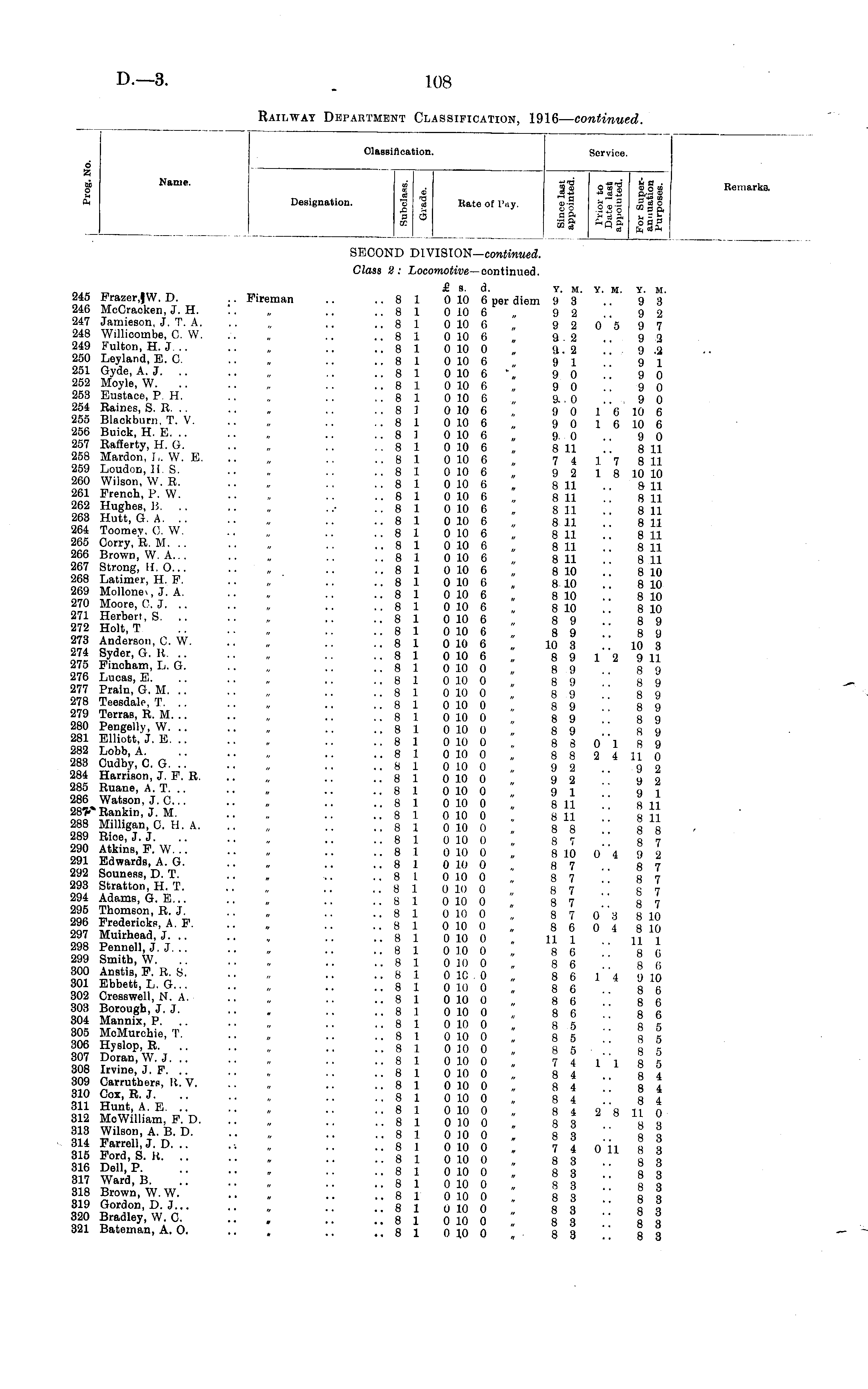 Classification. Service. d o £ Name. Designation. CO 9 oj Rate of Pay. it 9 O q a 2|| l-S'f *0* •-. a • 33 O «l ft--. 9 CCy-rsr id m a o m 3 ft oaa a ■ « Remarks. SECOND DIVISlON-continued. Ctoss 2: Locomotive— continued. 245 Frazer,|W. D. 246 McCracken, J. H. 247 Jamieson, J. T. A. 248 Willicombe, 0. W. 249 Fulton, H. J. .. 250 Leyland, E. C 251 Gyde, A. J. 252 Moyle, W. 253 Eustace, P. H. 254 Raines, S. R. .. 255 Blackburn. T. V. 256 Buick, H. E. .. 257 Rafferty, II. G. 258 Mardon, I,. W. E. 259 Loudon, 11. S. 260 Wilson, W. R. 261 French, P. W. 262 Hughes, B. .. 263 Hutt, G. A. .. 264 Toomev, 0. W. 265 Corry, R. M. .. 266 Brown, W. A... 267 Strong, tl. O... 268 Latimer, H. F. 269 Mollones J. A. 270 Moore, 0. J. .. 271 Herbert, S. .. 272 Holt, T 273 Anderson, C W. 274 Syder, G. R. .. 275 Fincham, L. G. 276 Lucas, E. 277 Prain, G. M. 278 Teesdale, T. 279 TerraB, R. M. .. 280 Pengelly, W. .. 281 Elliott, J. E. .. 282 Lobb, A. 283 Cudby, O. G. 284 Harrison, J. F. R. 285 Ruane, A. T. .. 286 Watson, J. C... 28>" Rankin, J. M. 288 Milligan, C H. A. 289 Rice, J. J. 290 Atkins, F. W. .. 291 Edwards, A. G. 292 Souness, D. T. 293 Stratton, H. T. 294 Adams, G. E... 295 Thomson, R. J. 296 Fredericks, A. P. 297 Muirhead, J. .. 298 Pennell, J.J... 299 Smith, W. 300 Anstis, P. R. S. 301 Ebbett, L. G... 302 Cresewell, N. A. 303 Borough, J. J. 304 Mannix, P. .. 305 MoMurchie, T, 306 Hyslop, R. .. 307 Doran, W. J. .. 308 Irvine, J. K. .. 309 Carruthers, R. V. 310 Cox, R. J. 311 Hunt, A. E. .. 312 MoWilliam, F. D. 313 Wilson, A. B. D. 314 Farrell, J. D. .. 315 Ford, S. it. .. 316 Dell, P. 317 Ward, B. 318 Brown, W. W. 319 Gordon, D. J... 320 Bradley, W. C. 321 Bateman, A. O. ; . Fireman £ 8. d. Y. M. Y. M. Y. M. ..81 0 10 6 per diem 93 .. 93 ..8 1 0 10 6 „ 9 2 .. 9 2 • •81 0 10 6 „ 92 05 97 ..81 0 10 6 „ a. 2 .. 92 ..81 0 10 0 „ a. 2 .. 9 .2 • ■8 1 0 10 6 „ 9 1 .. 9 1 ..81 0 10 6 ", 90 .. 90 • •81 0 10 6 „ 90 .. 90 • •8 1 0 10 6 „ 9. 0 .. 9 0 ■ • 8 1 0 10 6 „ 9 0 1 6 10 6 • •81 0 10 6 „ 9 0 1 6 10 6 ••8 1 0 10 6 , 9 0 .. 9 0 ..8 1 0 10 6 , 8 11 .. 8 11 ••81 0 10 6 „ 7 4 1 7 8 11 ••81 0 10 6 , 9 2 1 8 10 10 • ■81 0 10 6 „ 8 11 .. 8 11 ■•81 0 10 6 „ 8 11 .. 8 11 • •8 1 0 10 6 „ 8 11 .. 8 11 ••81 0 10 6 „ 8 11 .. 8 11 ••8 1 0 10 6 , 8 11 .. 8 11 • ■81 0 10 6 „ 8 11 .. 8 11 ■•81 0 10 6 „ 8 11 .. 8 11 ■•8 1 0 10 6 „ 8 10 .. 8 10 ••81 0 10 6 „ 8 10 .. 8 10 •■8 1 0 10 6 „ 8 10 .. 8 10 •■81 0 10 6 „ 8 10 .. 8 10 ..81 0 10 6 „ 89 .. 89 ••81 0 10 6 „ 89 .. 89 •■81 0 10 6 „ 10 3 .. 10 3 ••81 0 10 6 „ 8 9 1 2 9 11 ••81 0 10 0 , 89 .. 89 ■•81 0 10 0 „ 89 .. 89 ••8 1 0 10 0 „ 8 9 .. 8 9 ••8 1 0 10 0 „ 8 9 .. 8 9 ■•81 0 10 0 , 89 .. 89 ••81 0 10 0 „ 89 .. 89 ••81 0 10 0 „ 88 0189 ••8 1 0 10 0 „ 8 8 2 4 11 0 ..8 1 0 10 0 „ 9 2 .. 9 2 •■8 1 0 10 0 , 9 2 .. 9 2 ..8 1 0 10 0 „ 9 1 9 1 • •81 0 10 0 „ 8 11 .. 8 11 ••8 1 0 10 0 „ 8 11 .. 8 11 ••8 1 0 10 0 , 8 8 .. 8 8 ..8 1 0 10 0 „ 8 7 8 7 -.81 0 10 0 , 8 10 0 4 9 2 ..8 1 0 10 0 „ 8 7 8 7 ••8 1 0 10 0 „ 8 7 .. 8 7 ••8 1 0 10 0 „ 8 7 .. 8 7 ..81 0 10 0 „ 87 .. 87 ••81 0 10 0 „ 8 7 0 3 8 10 ..8 1 0 10 0 „ 8 6 0 4 8 10 ••8 1 0 10 0 „ 11 1 .. 11 1 ••8 1 0 10 0 „ 8 6 .. 8 6 ••8 1 0 10 0 „ 8 6 .. 8 6 •■81 0 10 0 „ 8 6 1 4 9 10 ■•81 0 10 0 „ 86 .. 86 ••81 0 10 0 „ 86 .. 86 ••81 0 10 0 „ 86 .. 86 ••81 0 10 0 „ 85 .. 85 ••81 0 10 0 „ 85 .. 85 ••8 1 0 10 0 „ 8 5.. 8 5 ..81 0 10 0 , 741185 ••8 1 0 10 0 „ 8 4 .. 8 4 ..81 0 10 0 „ 84 .. 84 ••81 0 10 0 „ 84 .. 84 •■8 1 0 10 0 „ 8 4 2 8 11 0 ••8 1 0 10 0 , 8 3 .. 8 3 ■•8 1 0 10 0 „ 8 3 .. 8 3 ■•8 1 0 10 0 „ 7 4 0 11 8 3 ••81 0 10 0 „ 83 .. 83 ••81 0 10 0 , 83 .. 83 •■81 0 10 0 „ 83 .. 83 ••81 0 10 0 , 83 .. 83 •■81 0 10 0 , 83 .. 83 ••81 0 10 0 „ 83 .. 83 ••81 0 10 0 „ 83 .. 83