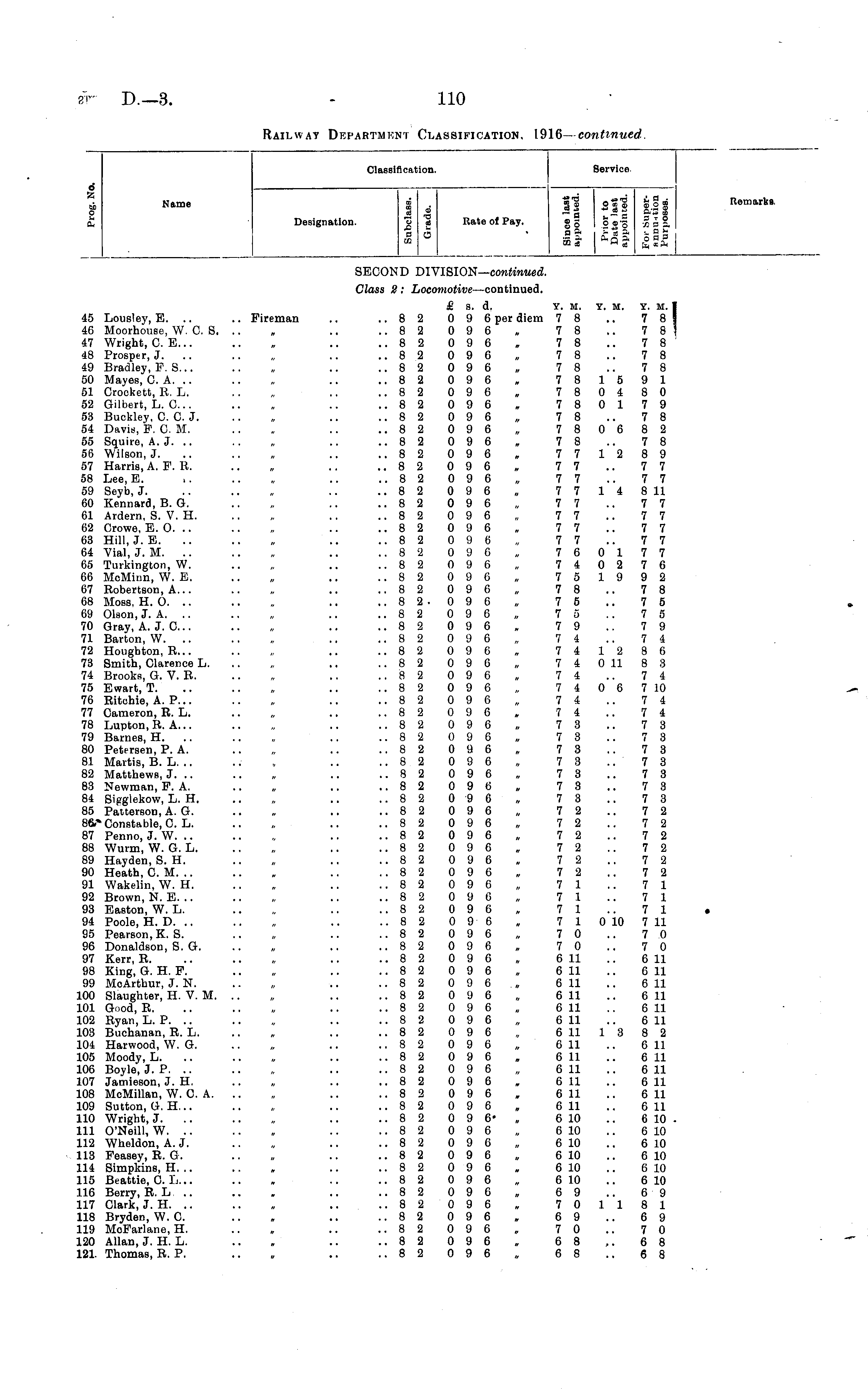 Classification. Service. 0 /. A o u & Name Designation. OS a £ •— -a 3 o 02 Rate of Pay. ■£-a r.a'a j-,a. §2 22 8 8.2™ ™ S - " ft 3 ii a u a 3to S5 'JO S 3 ft ■02's °-o& £55 Remarks. SECOND DIVISION— continued. Class 2 : Locomotive —continued. 45 Lousley, E. .. 46 Moorhouse, W. C S. 47 Wright, CE... 48 Prosper, J. 49 Bradley, F. S... 50 Mayes, 0. A. 51 Crockett, R. L. 52 Gilbert, L. 0... 53 Buckley, C. 0. J. 54 Davis, F. 0. M. 55 Squire, A.J. 56 Wilson, J. 57 Harris, A. F. R. 58 Lee.E. 59 Seyb, J. 60 Kennard, B. G. 61 Ardern, S. V. H. 62 Crowe, E. 0. 63 Hill, J. E. 64 Vial, J. M. .. 65 Turkington, W. 66 McMinn, W. E. 67 Robertson, A... 08 Moss, H. 0. 69 Olson, J. A. 70 Gray, A. J. 0... 71 Barton, W. .. 72 Houghton, R... 73 Smith, Clarence L. 74 Brooks, G. V. R. 75 Ewart, T. 76 Ritchie, A. P... 77 Cameron, R. L. 78 Lupton.R. A... 79 Barnes, H. 80 Petersen, P. A. 81 Martis, B. L. .. 82 Matthews, J. .. 83 Newman, P. A. 84 Sigglekow, L. H. 85 Patterson, A. G. 86'Constable, 0. L. 87 Penno, J. W. 88 Wurm, W. G. L. 89 Hayden, S. H. 90 Heath, CM... 91 Wakelin, W. H. 92 Brown, N. E. .. 93 Easton, W. L. 94 Poole, H. D. 95 Pearson, K. S. 96 Donaldson, S. G. 97 Kerr, R. 98 King, G. H. F. 99 MoArthur, J. N. 100 Slaughter, H. V. M. 101 Good, R. 102 Ryan, L. P. 103 Buchanan, R. L. 104 Harwood, W. G. 105 Moody, L. 106 Boyle, J. P. 107 Jamieson, J. H. 108 McMillan, W. C A. 109 Sutton, G. H... 110 Wright, J. .. ill O'Neill, W. .. 112 Wheldon, A. J. 113 Feasey, R. G. 114 Simpkins, H. .. 115 Beattie, 0. L... 116 Berry, R. L .. 117 Clark, J. H. .. 118 Bryden, W. C 119 MoFarlane, H. 120 Allan, J. H. L. 121. Thomas, R. P. .. Fireman £ s. d. Y. M. ..82 0 9 6 per diem 7 8 ..8 2 0 9 6 „ 7 8 ..8 2 0 9 6 „ 7 8 ..8 2 0 9 6 „ 7 8 ..8 2 0 9 6 „ 7 8 ..82 096 , 78 ..82 090 „ 78 ..82 096 „ 78 ..8 2 0 9 6 „ 7 8 ..8 2 0 9 6 „ 7 8 ..8 2 0 9 6 „ 7 8 ..82 096 „ 77 ..8 2 0 9 6 „ 7 7 ..8 2 0 9 6 „ 7 7 ..8 2 0 9 6 „ 7 7 ..8 2 0 9 6 „ 7 7 ..8 2 0 9 6 „ 7 7 ..8 2 0 9 6 „ 7 7 ..8 2 0 9 6 „ 7 7 ..8 2 0 9 6 „ 7 6 ..8 2 0 9 6 „ 7 4 ..8 2 0 9 6 „ 7 5 ..8 2 0 9 6 „ 7 8 ..82-090 „ 75 ..8 2 0 9 6 „ 7 5 ..8 2 0 9 6 „ 7 9 ..8 2 0 9 6 „ 7 4 ..8 2 0 9 6 „ 7 4 ..8 2 0 9 6 „ 7 4 ..8 2 0 9 0 „ 7 4 ..8 2 0 9 6 „ 7 4 ..8 2 0 9 6 „ 7 4 ..8 2 0 9 6 „ 7 4 ..8 2 0 9 6 „ 7 3 ..8 2 0 9 6 „ 7 3 ..8 2 0 9 6 „ 7 3 ..8 2 0 9 6 „ 7 3 ..8 2 0 9 6 „ 7 3 ..8 2 0 9 0 „ 7 3 ..8 2 0 9 6 „ 7 3 ..8 2 0 9 6 „ 7 2 ..8 2 0 9 6 „ 7 2 ..8 2 0 9 6 „ 7 2 ..82 096 „ 72 ..82 096 „ 72 ..8 2 0 9 6 „ 7 2 ..8 2 0 9 6 „ 7 1 ..8 2 0 9 6 „ 7 1 ..8 2 0 9 6 „ 7 1 ..8 2 0 9 6 „ 7 1 ..8 2 0 9 6 „ 7 0 ..8 2 0 9 6 „ 7 0 ..8 2 0 9 6 „ 6 11 ..8 2 0 9 6 „ 6 11 ..8 2 0 9 6 „ 6 11 ..8 2 0 9 6 „ 6 11 ..8 2 0 9 6 „ 6 11 ..8 2 0 9 6 „ 6 11 ..8 2 0 9 6 „ 6 11 ..82 096 „ 6 11 ..8 2 0 9 6 „ 6 11 ..8 2 0 9 6 „ 6 11 ..8 2 0 9 6 „ 6 11 ..8 2 0 9 6 , 6 11 ..82 096 „ 6 11 ..8 2 0 9 6' 6 10 ..82 090 „ 6 10 ..8 2 0 9 0 „ 6 10 ..8 2 0 9 6 „ 6 10 ..8 2 0 9 6 „ 6 10 ..8 2 0 9 6 „ 6 10 ..8 2 0 9 6 „ 6 9 ..8 2 0 9 6 „ 7 0 ..82 096 „ 69 ..8 2 0 9 6 „ 7 0 ..8 2 0 9 6 „ 6 8 ..8 2 0 9 6 „ 6 8 Y. M. i"b 0 4 0 1 o"6 1 '2 l'*4 01 0 2 1 9 l"2 0 11 o"tJ o'io 1 "3 1 "l Y. M. I 7 8 \ 7 8 7 8 7 8 7 8 9 1 8 0 7 9 7 8 8 2 7 8 8 9 7 7 7 7 8 11 7 7 7 7 7 7 7 7 7 7 7 6 9 2 7 8 7 5 7 5 7 9 7 4 8 6 8 3 7 4 7 10 7 4 7 4 7 3 7 3 7 3 7 3 7 3 7 3 7 3 7 2 7 2 7 2 7 2 7 2 7 2 7 1 7 1 7 1 7 11 7 0 7 0 6 11 6 11 6 11 6 11 6 11 6 11 8 2 6 11 6 11 6 11 6 11 6 11 6 11 6 10 • 6 10 6 10 6 10 6 10 6 10 6 9 8 1 6 9 7 0 6 8 6 8 •