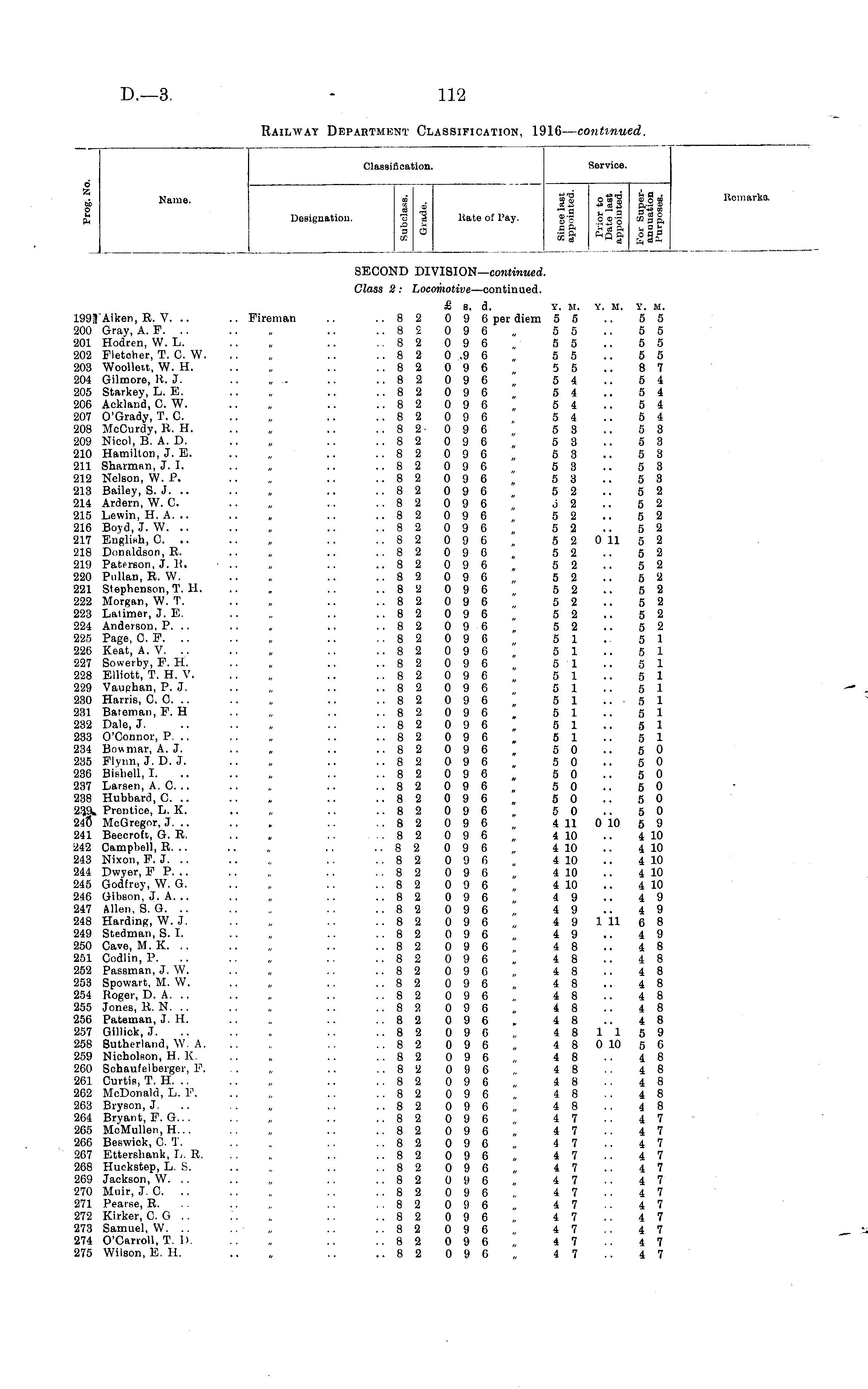 Classification. Service. O IS ,i Name. o E d Y, ah o E Name. Designation. £ . <»a o«» a o g! ■3 f Rate of Pay. J-| Saj-g co $ | 03 CC of M Q §• gas 1 Romark3. SECOND DIVISION— continued. Glass 2 : Locomotive —continued. .991'Aiken, R. V. .. !00 Gray, A. F. !01 Hodren, W. L. !02 Fletcher, T. C W. !03 Woollett, W. H. !04 Gilmore, R. J. !05 Starkey, L. E. !06 Ackland, C. W. !07 O'Grady, T. C. !08 McCurdy, R. H. !09 Nicol, B. A. D. !10 Hamilton, J. E. ill SharniRn, J. I. 112 Nelson, W. P. !13 Bailey, S. J. .. !14 Ardern, W. C. 115 Lewin, H. A. .. 116 Boyd, J. W. .. 117 English, 0. .. !18 Donaldson, R. !19 Paterson, J. R. 120 Pullan, R. W. !21 Stephenson, T. H. !22 Morgan, W. T. !23 Latimer, J. E. !24 Anderson, P. .. !25 Page, 0. F. .. !26 Keat, A. V. .. 127 Soworby, F. H. !28 Elliott, T. H. V. !29 Vauphan, P. J. !30 Harris, CO. !31 Batoman, P. H !32 Dale, J. !33 O'Connor, P. .. 134 Bowmar, A. J. !35 Plynn, J. D. J. !36 Bishell, I. !37 Larsen, A. 0. .. !38 Hubbard, C. .. !$9» Prentice, L. K. !4(3 McGregor, J. .. !41 Beecroft, G. R. 142 Campbell, R. .. !43 Nixon, P. J. .. !44 Dwyer, PP... !45 Godfrey, W. G. !46 Gibson, J. A. .. 147 Allen, S. G. .. !48 Harding, W. J. 149 Stedman, S. I. 150 Cave, M. K. .. !51 Codlin, P. !52 Passman, J. W. !53 Spowart, M. W. !54 Roger, D. A. .. !55 Jones, R. N. .. !56 Pateman, J. H. !57 Gillick, J. !58 Sutherland, W, A. !59 NicholBon, H. K. !60 Schaufelberger, F. 161 Curtis, T. H. .. !62 McDonald, L. F. !63 Bryson, J. !64 Bryant, F. G.. . 165 MoMullen, H... 166 Beswick, C T. 167 Ettershank, L. R. 168 Huckstep, L. S. 169 Jackson, W. .. !70 Muir, J. 0. 171 Pearse, R. !72 Kirker, 0. G .. !73 Samuel, W. .. !74 O'Carroll, T. 1). !75 Wilson, E. H. .. Fireman £ a. d. Y. M. Y. M. Y. M. ..82 0 9 6 per diem 55 .. 55 ..82 096 „ 55 .. 55 ..82 096 55 .. 55 ..82 0.9 6 „ 55 .. 55 ..82096 55 .. 87 ..82 096 „ 54 .. 54 ..82 096 54 .. 54 ..82 09 6 , 54 .. 54 ..82 09 6 54 .. 54 ..82 096 ,' 53 .. 53 ..82 09 6 , 53 .. 53 ..82 090 , 53 .. 53 ..82 096 53 .. 53 ..82 096 „ 53 .. 53 ..82 096 , 5 2 .. 52 ..82 09 6 „ o 2 .. 52 ..82 096 „ 52 .. 52 ..82 096 „ 52 .. 5 2 ..8 2 0 9 6 „ 5 2 0 11 5 2 ..82 090 , 52 .. 52 ..82 09 6 „ 52 .. 52 ..82 096 „ 52 .. 52 ..82 09 6 52 .. 52 ..82096 52 .. 52 ..82 096 52 .. 52 ..82 096 , 52 .. 52 ..82 096 „ 51 .. 51 ..82 096 „ 51 .. 51 ..82 096 , 51 .. 51 ..82 096 „ 51 .. 51 ..82 096 „ 51 .. 51 ..82 096 „ 51 ..51 ..82 09 6 , 51 .. 51 ..82 096 , 5 1 .. 51 ..82 09 6 , 51 .. 51 ..82 096 , 50 .. 50 ..82 09 6 , 50 .. 50 ..82 096 „ 50 .. 50 ..82 096 „ 50 .. 50 ..82 09 6 „ 50 .. 50 ..82 096 „ 50 .. 50 ..82 096 „ 4 11 0 10 5 9 ..8 2 0 9 6 „ 4 10 .. 4 10 ..82 096 „ 4 10 .. 4 10 ..8 2 0 9 6 „ 4 10 .. 4 10 ..82 090 „ 4 10 .. 4 10 ..82 096 „ 4 10 .. 4 10 ..8 2 0 9 6 , 4 9 .. 4 9 ..82 096 „ 49 .. 49 ..8 2 0 9 0 „ 4 9 1 11 6 8 ..82 096 „ 49 .. 49 ..82 096 „ 48 .. 48 ..82 096 „ 48 .. 48 ..82 09 6 „ 48 .. 48 ..82 096 „ 48 .. 48 ..8 2 0 9 6 „ 4 8 .. 4 8 ..82 096 „ 48 .. 48 ..82 096 „ 48 .. 48 ..82 096 „ 48 1159 ..82 096 „ 48 0 10 56 ..82 096 „ 48 .. 48 ..8 2 096 „ 48 .. 48 ..82 096 „ 48 .. 48 ..82 096 „ 48 .. 48 ..82 096 „ 48 .. 48 ..82 09 6 „ 47 .. 47 ..82 096 „ 47 .. 47 ..82 096 „ 47 .. 47 ..8 2 0 9 6 „ 4 7 .. 4 7 ..82 096 „ 47 .. 47 ..82 096 „ 47 .. 47 ..82 096 „ 47 .. 47 ..82 096 „ 47 .. 47 ..82 096 „ 47 .. 47 ..82 096 „ 47 .. 47 ..82 096 „ 47 .. 47 ..82 096 „ 47 .. 47