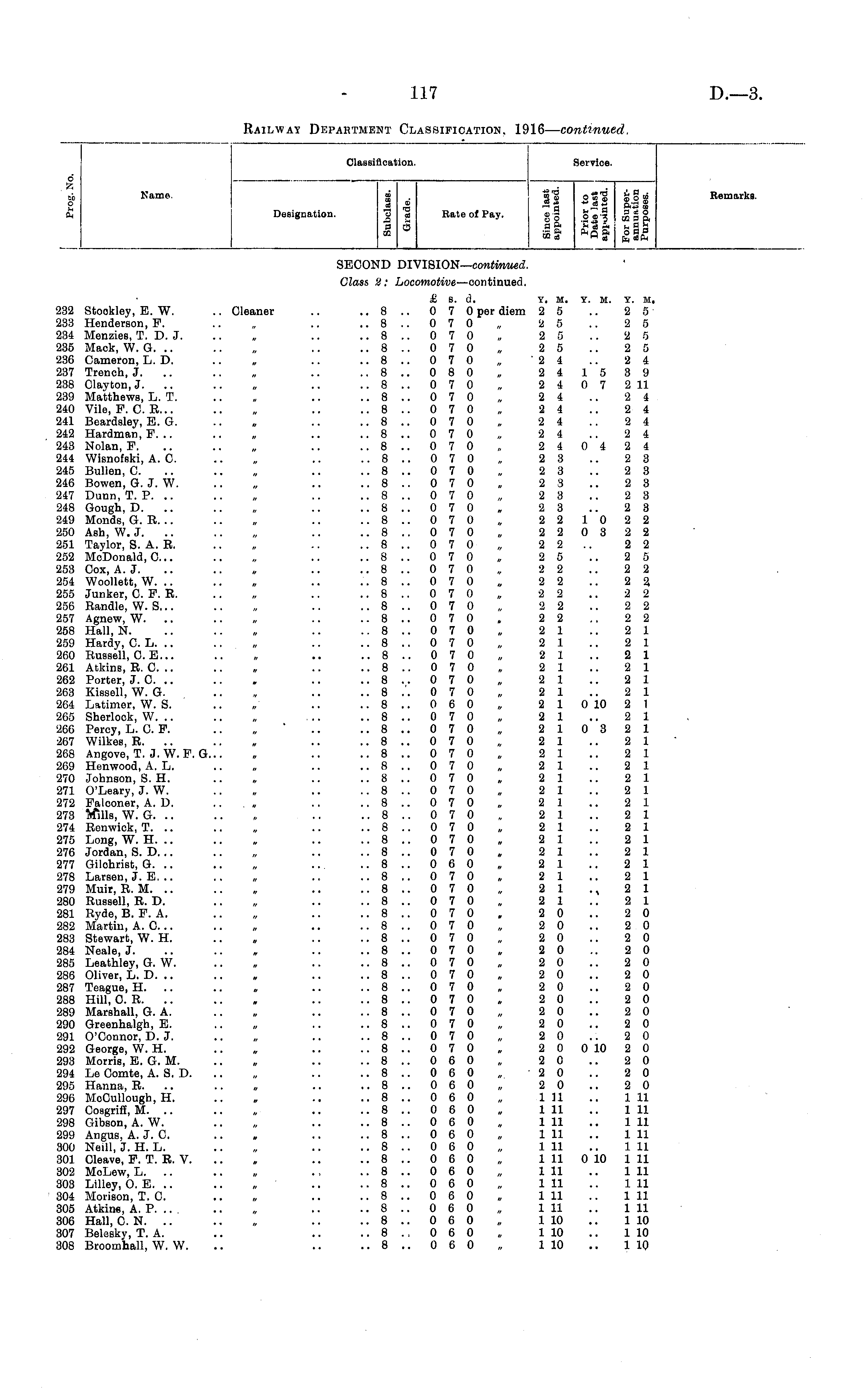 Classification. Service. 6 ft I? St Name. 00 a rS 0 Kate of Fay. ™ a 81 Ig sfs |ls ■p~3 5"S| ,2 * j cB B & M « (£] «ft Remarks. Designation. 9 5 SECOND DIVISION— continued. Glass 2: Locomotive —continued. !32 Stockley, E. W. .. Cleaner 188 Henderson, P. 134 Menzies, T. D. J. 135 Mack, W. G. .. 136 Cameron, L. D, 137 Trench, J. 138 Clayton, J. .. S89 Matthews, L. T. 140 Vile, P. C. R... !41 Beardsley, E.G. 142 Hardman, F. .. 143 Nolan, P. .. 144 Wisnofski, A. C. 145 Bullen, 0. 146 Bowen, G. J. W. 147 Dunn, T. P. .. 148 Gough, D. .. 149 Monds, G. R. .. 150 Ash, W. J. 151 Taylor, S. A. R. 152 McDonald, C... 153 Cox, A.J. 154 Woollett, W. .. 155 Junker, 0. P. R. 156 Randle, W. S... 157 Agnew, W. .. 158 Hall, N. 159 Hardy, 0. L. .. 160 Russell, CE... 161 Atkins, R. 0. .. 162 Porter, J. 0. .. 163 Kissell, W. G. 164 Latimer, W. S. 165 Sherlock, W. .. 166 Percy, L. 0. F. 167 Wilkes, R. .. 168 Angove, T. J. W. F. G... 269 Henwood, A. L. 170 Johnson, S. H. 171 O'Leary, J. W. 172 Falooner, A. D. 173 Wills, W. G. .. 174 Renwiok, T. .. 275 Long, W. H. .. 276 Jordan, S. D. .. 277 Gilchrist, G. .. 278 Larsen, J. E. .. 279 Muir, R. M. .. 280 Russell, R. D. 281 Ryde, B. F. A. 282 Martin, A. C... 283 Stewart, W. H. 284 Neale, J. 285 Leathley, G. W. 286 Oliver, L. D. .. 287 Teague, H. .. 288 Hill, 0. R. .. 289 Marshall, G. A. 290 Greenhalgh, E. 291 O'Connor, D.J. 292 George, W. H. 293 Morris, E. G. M. 294 Le Oomte, A. S. D. 195 Hanna, R. .. .. „ 296 MoCullougb, H. 197 Cosgriff, M. .. 298 Gibson, A. W. 299 Angus, A. J. 0. 100 Neill, J. H. L. 101 Cleave, F. T. R. V. 102 McLew, L. .. 103 Lilley, 0. E. .. 104 Morison, T. 0. 105 Atkins, A. P 106 Hall, C.N... 107 Belaskv, T. A. 108 Broomhall, W. W. £ S. d. Y. M. Y. M. Y. M. .. 8 .. 0 7 0 per diem 2 5 .. 2 5 ..8.. 070 „ 25 .. 25 .. 8 .. 0 7 0 „ 2 5 .. 2 5 ..8.. 070 „ 25 .. 25 .. 8 .. 0 7 0 „ '24 .. 24 ..8.. 080 „ 24 15 39 ..8.. 070 „ 24 07 2 11 .. 8 .. 0 7 0 „ 2 4 .. 2 4 ..8.. 070 „ 24 .. 24 .. 8 .. 0 7 0 „ 2 4 .. 2 4 .. 8 .. 0 7 0 „ 2 4 .. 2 4 .. 8 .. 0 7 0 „ 2 4 0 4 2 4 .. 8 .. 0 7 0 „ 2 3 .. 2 3 .. 8 .. 0 7 0 „ 2 3 .. 2 3 .. 8 .. 0 7 0 „ 2 3 .. 2 3 .. 8 .. 0 7 0 „ 2 3 .. 2 3 ..8.. 070 „ 23 .. 23 ..8.. 070 „ 22 10 22 ..8.. 070 „ 220322 ..8.. 070 „ 22 .. 22 .. 8 .. 0 7 0 „ 2 5 .. 2 5 .. 8 .. 0 7 0 ,, 2 2 .. 2 2 ..8.. 070 „ 22 .. 22 .. 8 .. 0 7 0 „ 2 2 .. 2 2 ..8.. 070 , 22 .. 22 .. 8 .. 0 7 0 . 2 2 .. 2 2 ..8.. 070 „ 21 .. 21 ..8.. 070 „ 21 .. 21 .. 8 .. 0 7 0 „ 2 1 .. 2 1 ..8.. 070 „ 21 .. 21 ..8.. 070 „ 21 .. 21 ..8.. 070 „ 21 .. 21 .. 8 .. 0 6 0 „ 2 1 0 10 2 1 .. 8 .. 0 7 0 „ 2 1 .. 2 1 ..8.. 070 „ 21 03 21 ..8.. 070 „ 21 .. 21 ..8.. 070 . 21 .. 21 .. 8 .. 0 7 0 „ 2 1 .. 2 1 ..8.. 070 „ 21 .. 21 ..8.. 070 „ 21 .. 21 ..8.. 070 „ 21 .. 21 ..8.. 070 „ 21 .. 21 ..8.. 070 , 21 .. 21 ..8.. 070 , 21 .. 21 .. 8 .. 0 7 0 , 2 1 .. 2 1 .. 8 .. 0 6 0 „ 2 1 .. 2 1 ..8.. 070 „ 21 .. 21 ..8.. 070 „ 21 ., 21 ..8.. 070 „ 21 .. 21 .. 8 .. 0 7 0 , 2 0 .. 2 0 ..8.. 070 „ 20 .. 20 ..8.. 070 „ 20 .. 20 ..8.. 070 „ 20 .. 20 ..8.. 070 „ 20 .. 20 ..8.. 070 „ 20 .. 20 ..8.. 070 „ 20 .. 20 .. 8 .. 0 7 0 „ 2 0 .. 2 0 ..8.. 070 „ 20 .. 20 ..8.. 070 „ 20 .. 20 ..8.. 070 „ 20 .. 20 ..8.. 070 „ 20 010 20 ..8.. 060 „ 20 .. 20 ..8.. 060 „ 20 .. 20 .. 8 .. 0 6 0 „ 2 0 .. 2 0 .. 8 .. 0 6 0 „ 1 11 .. 1 11 .. 8 .. 0 6 0 „ 1 11 .. 1 11 .. 8 .. 0 6 0 „ 1 11 .. 1 11 .. 8 .. 0 6 0 „ 1 11 .. 1 11 .. 8 .. 0 6 0 „ 1 11 .. 1 11 .. 8 .. 0 6 0 „ 1 11 0 10 111 .. 8 .. 0 6 0 „ 1 11 .. 1 11 .. 8 .. 0 6 0 „ 1 11 .. 1 11 .. 8 .. 0 6 0 „ 1 11 .. 1 11 .. 8 .. 0 6 0 , 1 11 .. 1 11 .. 8 .. 0 6 0 „ 1 10 .. 1 10 .. 8 ., 0 6 0 . 1 10 .. 1 10 .. 8 .. 0 6 0 „ 1 10 .. 1 10