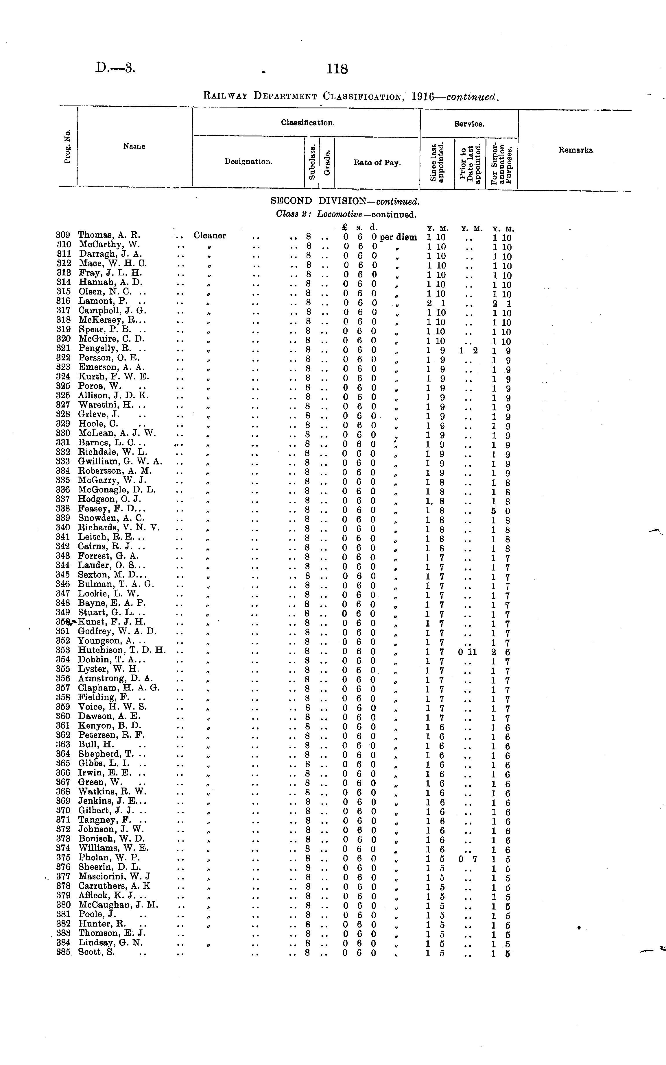 Classification. Service, d ft p ft | Name £ CJ £ CD 3 o -*-"d ss o o a a sit >*~~ a .2 So ."dft ftpft •3 * ■ O O 03 ft-™ a •5 °* 9 m S3 ft ij a h Bap feaj ft Remarks. Designation. Kate of Pay. SECOND DIVISION— continued. Glass 2: Locomotive —continued. 309 Thomas, A. R. 310 McCarthy, W. 311 Darragh, J. A. 312 Mace, W. H. 0. 313 Fray, J. L. H. 314 Hannah, A. D. 315 Olsen, N. C. 316 Lamont, P. .. 317 Campbell, J. G. 318 McKersey, R... 319 Spear, P. B. 320 McGuire, C D. 321 Pengelly, R. .. 322 Persson, 0. E. 323 Emerson, A. A. 324 Kurth, F. W. E. 325 Poroa, W. 326 Allison, J. D. K. 327 Waretini, H. .. 328 Grieve, J. 329 Hoole, 0. 330 McLean, A. J. W. 331 Barnes, L. C. .. 332 Richdale, W. L. 333 Gwilliam, G. W. A. 834 Robertson, A. M. 335 McGarry, W. J. 336 McGonagle, D. L. 337 Hodgson, O. J. 338 Feasey, P. D... 339 Snowden, A. 0. 340 Richards, V. N. V. 341 Leitoh, RE. .. 342 Cairns, R. J. .. 343 Forrest, G. A. 344 Lauder, O. S... 345 Sexton, M. D... 346 Bulman, T. A. G. 347 Lockie, L. W. 348 Bayne, E. A. P. 349 Stuart, G. L. .. 35,V»Kunst, P. J. H. 351 Godfrey, W. A. D. 352 Youngson, A. .. 353 Hutchison, T. D. H. 354 Dobbin, T. A... 355 Lyster, W. H. 356 Armstrong, D. A. 357 Clapham, H. A. G. 358 Fielding, F. .. 359 Voice, H. W. S. 360 Dawson, A. E. 361 Kenyon, B. D. 362 Petersen, R. F. 363 Bull, H. 364 Shepherd, T. .. 365 Gibbs, L. I. 366 Irwin, E. E. .. 367 Green, W. 368 Watkins, R. W. 369 Jenkins, J. E... 370 Gilbert, J. J. 371 Tangney,F. .. 372 Johnson, J. W. 373 Bonisch, W. D. 374 Williams, W. E. 375 Phelan, W. P. 376 Shoerin, D. L. 377 Masciorini, W. J 378 Carruthers, A. K 379 Affleck, K. J. .. 380 McCaughan, J. M. 381 Poole, J. 382 Hunter, R. .. 383 Thomson, E. J. 384 Lindsay, G. N. 385 Scott, S. .. I Cleaner £ s. d. Y. M. .. 8 .. 0 6 0 per diem 1 10 .. 8 .. 0 6 0 „ 1 10 .. 8 .. 0 6 0 „ 1 10 .. 8 .. 0 6 0 „ 1 10 .. 8 .. 0 6 0 „ 1 10 .. 8 .. 0 6 0 „ 1 10 .. 8 .. 0 6 0 „ 1 10 .. 8 .. 0 6 0 „ 2 1 •. 8 .. 0 6 0 , 1 10 .. 8 .. 0 6 0 „ 1 10 .. 8 .. 0 6 0 „ 1 10 .. 8 .. 0 6 0 , 1 10 .. 8 .. 0 6 0 „ 19 .. 8 .. 0 6 0 „ 19 .. 8 .. 0 6 0 „ 19 .. 8 .. 0 6 0 „ 19 •• 8 .. 0 6 0 , 19 .. 8 .. 0 6 0 „ 19 .. 8 .. 0 6 0 „ 19 .. 8 .. 0 6 0 „ 19 .. 8 .. 0 6 0 , 19 .. 8 .. 0 6 0 „ 19 .. 8 .. 0 6 0 I, 19 •• 8 .. 0 6 0 „ 19 .. 8 .. 0 6 0 „ 19 •. 8 .. 0 6 0 „ 19 .. 8 .. 0 6 0 , 18 .. 8 .. 0 6 0 „ 18 • • 8 .. 0 6 0 „ 1. 8 .. 8 .. 0 6 0 „ 18 .. 8 .. 0 6 0 „ 18 .. 8 .. 0 6 0 , 18 .. 8 .. 0 6 0 „ 18 .. 8 .. 0 6 0 „ 18 .. 8 .. 0 6 0 „ 17 .. 8 .. 0 6 0 „ 17 .. 8 .. 0 6 0 „ 17 .. 8 .. 0 6 0 „ 17 .. 8 .. 0 6 0 „ 17 .. 8 .. 0 6 0 , 17 .. 8 .. 0 6 0 , 17 .. 8 .. 0 6 0 „ 17 .. 8 .. 0 6 0 „ 17 .. 8 .. 0 6 0 „ 17 .. 8 .. 0 6 0 „ 17 .. 8 .. 0 6 0 „ 17 .. 8 .. 0 6 0 , 17 .. 8 .. 0 6 0 , 17 .. 8 .. 0 6 0 „ 17 .. 8 .. 0 6 0 „ 17 .. 8 .. 0 6 0 „ 17 .. 8 .. 0 6 0 ,, 17 .. 8 .. 0 6 0 „ 16 .. 8 .. 0 6 0 „ 16 .. 8 .. 0 6 0 „ 16 .. 8 .. 0 6 0 „ 16 .. 8 .. 0 6 0 „ 16 .. 8 .. 0 6 0 „ 16 .. 8 .. 0 6 0 „ 16 .. 8 .. 0 6 0 , 16 .. 8 .. 0 6 0 , 16 .. 8 .. 0 6 0 „ 16 .. 8 .. 0 6 0 , 16 .. 8 .. 0 6 0 „ 16 .. 8 .. 0 6 0 „ 16 .. 8 .. 0 6 0 , 16 .. 8 .. 0 6 0 „ 15 .. 8 .. 0 6 0 „ 15 .. 8 .. 0 6 0 „ 15 .. 8 .. 0 6 0 „ 15 .. 8 .. 0 6 0 „ 15 .. 8 .. 0 6 0 „ 15 .. 8 .. 0 6 0 „ 15 .. 8 .. 0 6 0 „ 15 .. 8 .. 0 6 0 , 15 .. 8 .. 0 6 0 „ 15 .. 8 .. 0 6 0 „ 15 Y. II, Y. M. 1 10 1 10 I 10 1 10 1 10 1 10 1 10 2 1 1 10 1 10 1 10 1 10 12 19 ...19 19 19 19 19 1.9 1 9 19 19 19 1 9 1 9 19 18 18 18 5 0 1 8 18 18 18 17 17 1 7 1 7 17 17 17 1 7 17 17 0 11 2 6 17 17 17 17 1 7 1 7 1 7 16 1 6 16 1 6 1 6 16 16 16 1 6 1 6 16 1 6 1 6 16 0 7 15 15 15 15 15 1 5 15 15 15 15 1 5 »