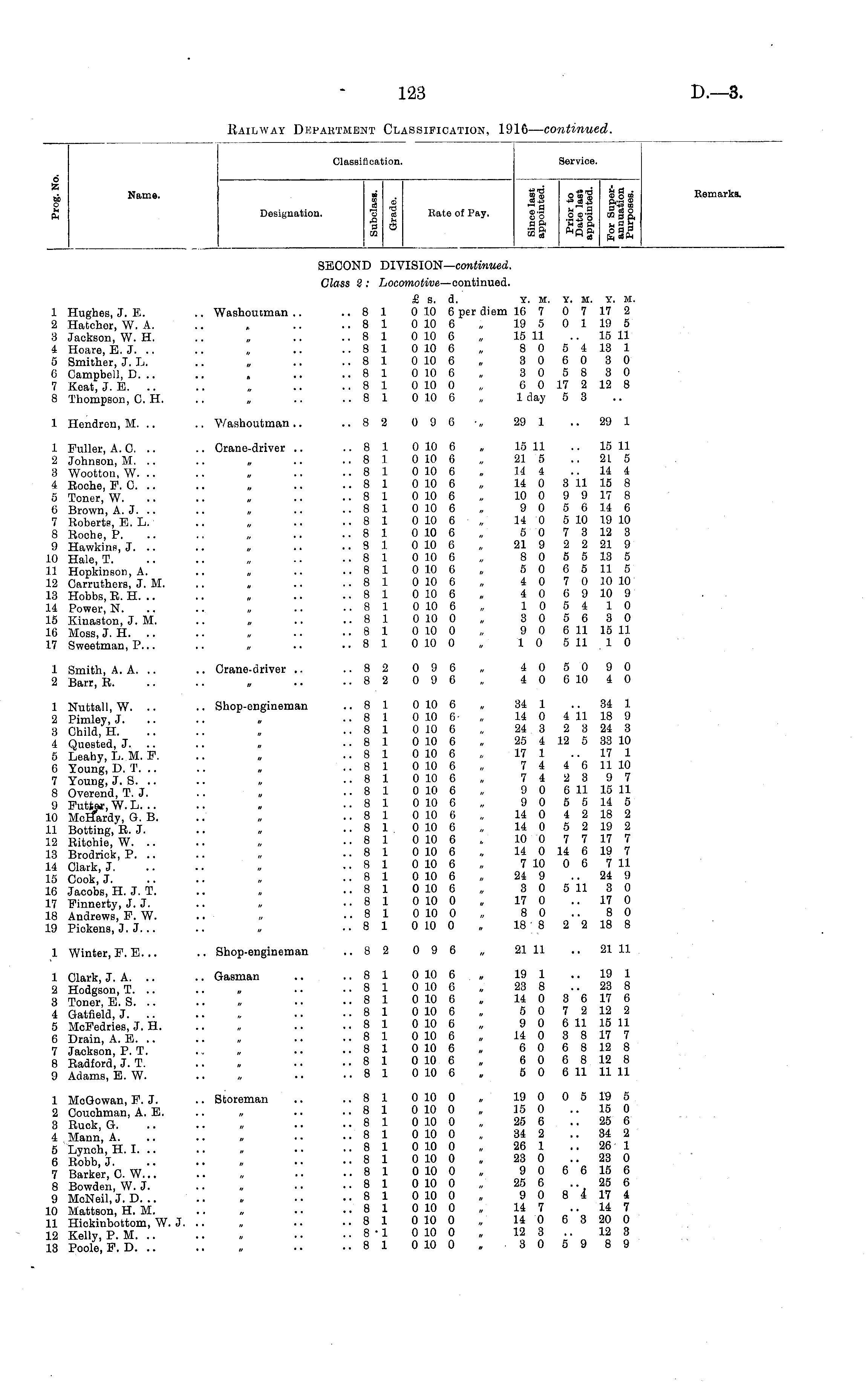 Classification. Service. d DO o M ft Name. Designation. BO CC £ PI A 3 02 Wirt 43iri Ufl . 5° © o fen e3 -JS 4»cd S 5..B as -a §•■§» S3 o»-g togS, oft „"caft a 2 a S ft ftoft oaf m C8 M 03 fCi "P* Remarks. £ '■; ci <3 Rate of Pay. SECOND DIVISION— continued. Class 2 : Locomotive— continued. 1 Hughes, J. E. .. Washoutman .. 2 Hatcher, W. A. 3 Jackson, W. H. 4 Hoare, E.J... 5 Smither, J. L. .. „ 6 Campbell, D. .. .. „ 7 Koat, J. E. .. 8 Thompson, C H. £ S. d. Y, M. Y. M. Y. M. ..8 1 0 10 6 per diem 16 7 0 7 17 2 ..8 1 0 10 6 „ 19 5 0 1 19 5 ..8 1 0 10 6 „ 15 11 .. 15 11 ..8 1 0 10 6 „ 8 0 5 4 13 1 ..81 0 10 6 „ 30 60 30 ..8 1 0 10 6 „ 3 0 5 8 3 0 ..8 1 0 10 0 „ 6 0 17 2 12 8 ..81 0 10 6 „ 1 day 5 3 1 Hendron, M. .. .. Washoutman .. ..82 096 ■ „ 29 1 .. 29 1 1 Fuller, A. 0. .. .. Crane-driver .. 2 Johnson, M. .. 3 Wootton, W. .. 4 Roche, F. 0. .. 5 Toner, W. .. 6 Brown, A. J. .. 7 Roberts, E. L. 8 Roche, P. 9 Hawkins, J. .. 10 Hale, T. 11 Hopkinson, A. 12 Carruthers, J. M. 13 Hobbs, R. H. .. 14 Power, N. .. .. „ 15 Kinaston, J. M. 16 Moss, J. H. .. 17 Sweetman, P... .. „ ..8 1 0 10 6 „ 15 11 .. 15 11 ..8 1 0 10 6 „ 21 5 .. 21 5 ..8 1 0 10 6 „ 14 4 .. 14 4 ..8 1 0 10 6 „ 14 0 3 11 15 8 ..8 1 0 10 6 „ 10 0 9 9 17 8 ..8 1 0 10 6 „ 9 0 5 6 14 6 ..8 1 0 10 6 „ 14 0 5 10 19 10 ..8 1 0 10 6 „ 5 0 7 3 12 3 ..8 1 0 10 6 „ 21 9 2 2 21 9 ..8 1 0 10 6 ,, 8 0 5 5 13 5 ..81 0 10 6 „ 5 0 6 5 11 5 ..81 0 10 6 „ 4 0 7 0 10 10 ..8 1 0 10 6 „ 4 0 6 9 10 9 ..8 1 0 10 6 „ 10 5 4 10 ..8 1 0 10 0 „ 3 0 5 6 3 0 ..81 0 10 0 „ 9 0 6 11 15 11 ..8 1 0 10 0 „ 10 5 11 10 1 Smith, A. A. .. .. Crane-driver .. 2 Barr, R. ..8 2 0 9 6 „ 4 0 5 0 9 0 ..8 2 0 9 6 „ 4 0 6 10 4 0 1 Nuttall, W. .. •• Shop-engineman 2 Pimley, J. .. ,, 3 Child, H. .. 4 Quested, J. .. » 5 Leahy, L. M. F. 6 Young, D. T. .. 7 Young, J. S. .. 8 Overend, T. J. 9 Futtar, W. L. .. 10 MoHardy, G. B. 11 Botting, R. J. 12 Ritchie, W. .. 13 Brodrick, P. .. 14 Clark, J. 15 Cook, J. 16 Jacobs, H. J. T. 17 Finnerty, J.J. 18 Andrews, F. W. 19 Pickens, J.J... ..8 1 0 10 6 „ 34 1 .. 34 1 ..8 1 0 10 6 „ 14 0 4 11 18 9 ..8 1 0 10 6 „ 24 3 2 3 24 3 ..8 1 0 10 6 „ 25 4 12 5 33 10 ..8 1 0 10 6 „ 17 1 .. 17 1 ..8 1 0 10 6 „ 7 4 4 6 11 10 ..81 0 10 6 „ 74 23 97 ..81 0 10 6 „ 9 0 6 11 15 11 ..8 1 0 10 6 „ 9 0 5 5 14 5 ..8 1 0 10 6 „ 14 0 4 2 18 2 ..8 1 0 10 6 „ 14 0 5 2 19 2 ..8 1 0 10 6 „ 10 0 7 7 17 7 ..8 1 0 10 6 „ 14 0 14 6 19 7 ..8 1 0 10 6 „ 7 10 0 6 7 11 ..81 0 10 6 „ 24 9 .. 24 9 ..81 0 10 6 „ 3 0 5 11 3 0 ..8 1 0 10 0 . 17 0 .. 17 0 ..81 0 10 0 „ 80 .. 80 ..81 0 10 0 „ 18 8 2 2 18 8 1 Winter, F. E. .. .. Shop-engineman ..8 2 0 9 6 „ 21 11 .. 21 11 1 Clark, J. A. .. .. Gasman 2 Hodgson, T. .. 3 Toner, E. S. .. 4 Gatfield, J. .. 5 McFedries, J. H. 6 Drain, A. E. .. 7 Jackson, P. T. 8 Radford, J. T. 9 Adams, E. W. ..81 0 10 6 . 19 1 .. 19 1 ..8 1 0 10 6 „ 23 8 .. 23 8 ..8 1 0 10 6 „ 14 0 3 6 17 6 ..81 0 10 6 „ 5 0 7 2 12 2 ..8 1 0 10 6 „ 9 0 6 11 15 11 ..8 1 0 10 6 „ 14 0 3 8 17 7 ..81 0 10 6 „ 6 0 6 8 12 8 ..8 1 0 10 6 „ 6 0 6 8 12 8 ..8 1 0 10 6 „ 5 0 6 11 11 11 1 MoGowan, P. J. .. Storeman 2 Couohman, A. E. .. „ 3 Ruck, G. 4 Mann, A. 5 Lynch, H.I... 6 Robb, J. 7 Barker, C. W... 8 Bowden, W. J. 9 McNeil, J. D. .. 10 Mattson, H. M. 11 Hickinbottom, W. J. .. 12 Kelly, P. M. .. 13 Poole, F. D. .. ..8 1 0 10 0 „ 19 0 0 5 19 5 ..8 1 0 10 0 „ 15 0 .. 15 0 ..8 1 0 10 0 „ 25 6 .. 25 6 ..8 1 0 10 0 „ 34 2 .. 34 2 ..8 1 0 10 0 „ 26 1 .. 26- 1 ..8 1 0 10 0 „ 23 0 .. 23 0 ..8 1 0 10 0 „ 9 0 6 6 15 6 ..8 1 0 10 0 „ 25 6 .. 25 6 ..8 1 0 10 0 „ 9 0 8 4" 17 4 ..8 1 0 10 0 „ 14 7 .. 14 7 ..81 0 10 0 „ 14 0 6 3 20 0 .. 8 - 1 0 10 0 „ 12 3 .. 12 3 ..81 0 10 0 „ 30 59 89