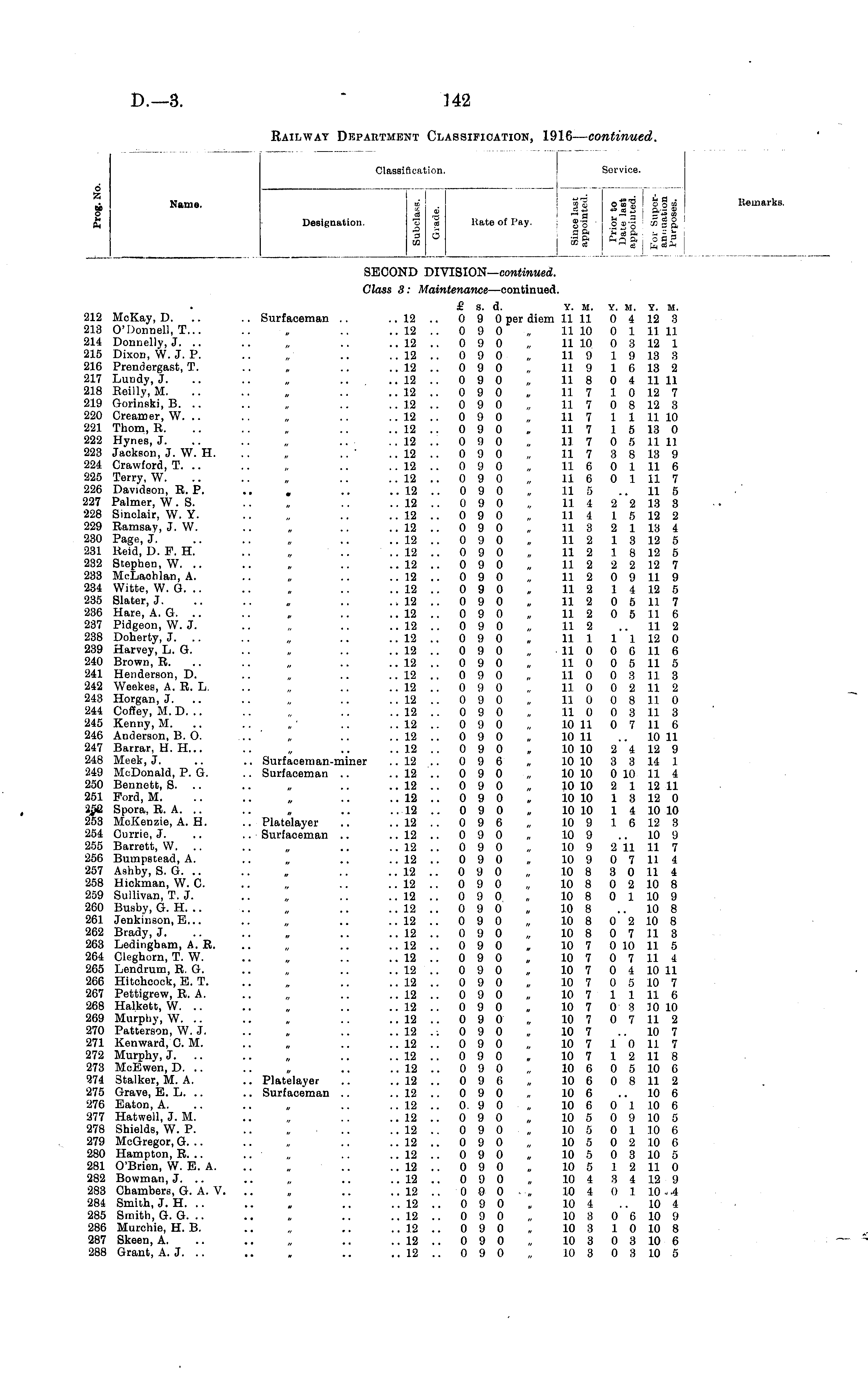 6 Z ti Name. 8 ft 6 Z i ft Name. Classification. Sorvice. _ . ------- cc «ojO'lo r 5loo t o f- 01 C- +4 44 (0 J5 ft —' O . i : — a . " - I -5 co Designation. o as Kate of Pay. g-g ■ 3 o-g ! co § g, a a . a a '3 S a .._ 55 j. 5 ° j sj fi o& j£gft Classification. Remarks. SECOND DIVISION— continued. Class 3: Maintenance —continued. 212 MoKay, D. .. 213 O'Donnell, T... 214 Donnelly, J. .. 215 Dixon, W. J. P. 216 Prendergast, T. 217 Lundy, J. 218 Reilly, M. 219 Gorinski, B. .. 220 Creamer, W. .. 221 Thorn, R. 222 Hynes, J. 223 Jackson, J. W. H. 224 Crawford, T. .. 225 Terry, W. 226 Davidson, R. P. 227 Palmer, W . S. 228 Sinolair, W. Y. 229 Ramsay, J. W. 230 Page, J. 231 Reid, D. F. H. 232 Stephen, W. .. 233 McLaohlan, A. 234 Witte, W. G. .. 235 Slater, J. 236 Hare, A. G. 237 Pidgeon, W. J. 238 Doherty, J. .. 239 Harvey, L. G. 240 Brown, R. 241 Henderson, D. 242 Weekes, A. R. L. 243 Horgan, J. 244 Coffey, M. D. .. 245 Kenny, M. 246 Anderson, B. 0. 247 Barrar, H. H... 248 Meek, J. 249 McDonald, P. G. 250 Bennett, S. .. 251 Ford, M. S52 Spora, R. A. 253 McKenzie, A. H. 254 Currie, J. 255 Barrett, W. .. 256 Bumpstead, A. 257 Ashby, S. G. 258 Hickman, W. C. 259 Sullivan, T. J. 260 Busby, G. H. .. 261 Jenkinson, E... 262 Brady, J. 263 Ledingham, A. R. 264 Cleghorn, T. W. 265 Lendrum, R. G. 266 Hitchcock, E. T. 267 Pettigrew, R. A. 268 Halkett, W. .. 269 Murphy, W. .. 270 Patterson, W. J. 271 Kenward, C. M. 272 Murphy, J. .. 273 McEwen, D. .. 274 Stalker, M. A. 275 Grave, E. L. 276 Eaton, A. 277 Hatwell, J. M. 278 Shields, W. P. 279 McGregor, G. .. 280 Hampton, R. .. 281 O'Brien, W. E. A. 282 Bowman, J. .. 283 Chambers, G. A. V. 284 Smith, J. H. 285 Smith, G. G. .. 286 Murchie, H. B. 287 Skeen, A. 288 Grant, A. J. £ s. d. Y. M. Y. M. Y. M. .. Surfaceman .. .. 12 .. 0 9 0 per diem 1.1 11 0 4 12 3 .. 12 .. 0 9 0 „ 11 10 0 1 11 11 .. 12 .. 0 9 0 „ 11 10 0 3 12 1 .. 12 .. 0 9 0 „ 11 9 1 9 13 3 .. 12 .. 0 9 0 „ 11 9 1 6 13 2 .. 12 .. 0 9 0 „ 11 8 0 4 11 11 .. 12 .. 0 9 0 „ 11 7 1 0 12 7 .. 12 .. 0 9 0 „ 11 7 0 8 12 3 .. 12 .. 0 9 0 „ 11 7 1 1 11 10 .. 12 .. 0 9 0 „ 11 7 1 5 13 0 .. 12 .. 0 9 0 „ 11 7 0 5 11 11 .. 12 .. 0 9 0 „ 11 7 3 8 13 9 .. 12 .. 0 9 0 „ 11 6 0 1 11 6 .. 12 .. 0 9 0 „ 11 6 0 1 11 7 .. 12 .. 0 9 0 „ 11 5 11 5 .. 12 .. 0 9 0 „ 11 4 2 2 13 3 .. 12 .. 0 9 0 „ 11 4 1 5 12 2 .. 12 .. 0 9 0 „ 11 3 2 1 13 4 .. 12 .. 0 9 0 „ 11 2 1 3 12 5 .. 12 .. 0 9 0 „ 11 2 1 8 12 5 .. 12 .. 0 9 0 „ 11 2 2 2 12 7 .. 12 .. 0 9 0 „ 11 2 0 9 11 9 .. 12 .. 0 9 0 „ 11 2 1 4 12 5 ., 12 .. 0 9 0 „ 11 2 0 5 11 7 .. 12 .. 0 9 0 „ 11 2 0 5 11 6 .. 12 .. 0 9 0 „ 11 2 11 2 .. 12 .. 0 9 0 „ 11 1 1 1 12 0 .. 12 .. 0 9 0 „ 11 0 0 6 11 6 .. 12 .. 0 9 0 „ 11 0 0 5 11 5 .. 12 .. 0 9 0 „ 11 0 0 3 11 3 .. 12 .. 0 9 0 „ 11 0 0 2 11 2 .. 12 .. 0 9 0 „ 11 0 0 8 11 0 .. 12 .. 0 9 0 „ 11 0 0 3 11 3 .. 12 .. 0 9 0 „ 10 11 0 7 11 6 ... ' „ .. .. 12 .. 0 9 0 „ 10 11 .. 10 11 .. 12 .. 0 9 0 „ 10 10 2 4 12 9 .. Surfaoeman-miner .. 12 .. 0 9 6 „ 10 10 3 3 14 1 .. Surfaceman .. .. 12 .. 0 9 0 „ 10 10 0 10 11 4 .. 12 .. 0 9 0 „ 10 10 2 1 12 11 .. 12 .. 0 9 0 „ 10 10 1 3 12 0 .. 12 .. 0 9 0 „ 10 10 1 4 10 10 .. Platelayer .. .. 12 . . 0 9 6 „ 10 9 1 6 12 3 .. Surfaceman .. .. 12 .. 0 9 0 „ 10 9 .. 10 9 .. 12 .. 0 9 0 „ 10 9 2 11 11 7 .. 12 .. 0 9 0 „ 10 9 0 7 11 4 .. 12 .. 0 9 0 „ 10 8 3 0 11 4 .. 12 .. 0 9 0 „ 10 8 0 2 10 8 .. 12 .. 0 9 0 „ 10 8 0 1 10 9 .. 12 .. 0 9 0 „ 10 8 .. 10 8 .. 12 .. 0 9 0 „ 10 8 0 2 10 8 .. 12 .. 0 9 0 „ 10 8 0 7 11 3 .. 12 .. 0 9 0 „ 10 7 0 10 11 5 .. 12 .. 0 9 0 „ 10 7 0 7 11 4 .. 12 .. 0 9 0 „ 10 7 0 4 10 11 .. 12 .. 0 9 0 „ 10 7 0 5 10 7 .. 12 .. 0 9 0 „ 10 7 1 1 11 6 .. 12 .. 0 9 0 „ 10 7 0' 8 10 10 .. 12 .. 0 9 0 „ 10 7 0 7 11 2 .. 12 .. 0 9 0 „ 10 7 .. 10 7 .. 12 .. 0 9 0 „ 10 7 1 0 11 7 .. 12 .. 0 9 0 „ 10 7 1 2 11 8 .. 12 .. 0 9 0 „ 10 6 0 5 10 6 .. Platelayer .. .. 12 .. 0 9 6 „ 10 6 0 8 11 2 .. Surfaceman .. .. 12 .. 0 9 0 „ 10 6 .. 10 6 .. 12 .. 0. 9 0 „ 10 6 0 1 10 6 .. 12 .. 0 9 0 „ 10 5 0 9 10 5 .. 12 .. 0 9 0 „ 10 5 0 1 10 6 .. 12 .. 0 9 0 „ 10 5 0 2 10 6 .. 12 .. 0 9 0 „ 10 5 0 3 10 5 .. 12 .. 0 9 0 „ 10 5 1 2 11 0 .. 12 .. 0 9 0 „ 10 4 3 4 12 9 .. 12 .. 0 9 0 - „ 10 4 0 1 10.4 .. 12 .. 0 9 0 „ 10 4 .. 10 4 .. 12 .. 0 9 0 „ 10 3 0 6 10 9 .. 12 .. 0 9 0 „ 10 3 1 0 10 8 .. 12 .. 0 9 0 „ 10 3 0 3 10 6 .. 12 .. 0 9 0 „ 10 3 0 3 10 5