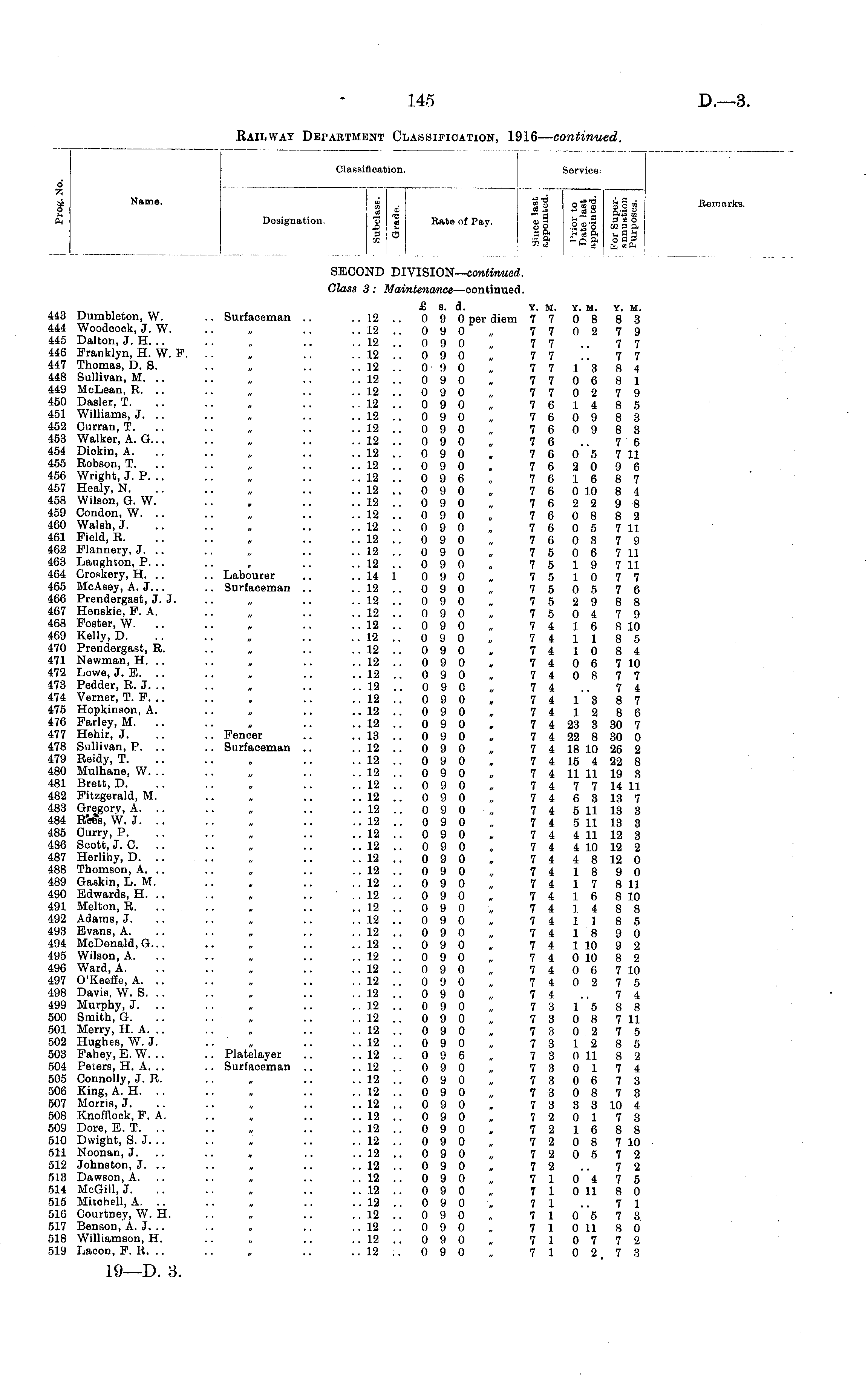 o" S5 i Sh ft 6 A A Name. ft Designation. Classification. Service. i £ It 2 is Hi I « Rate of Pay. gg 5„-= 3 g o 0 9 3ftSH-Sftc,3rH CO a a ft Q ft O 3 3 J- S3 " _r rj. SC ft .Remarks. SECOND DIVISION— continued. Class 3: Maintenance —continued. 143 Dumbleton, W. 144 Woodcock, J. W. 145 Dalton, J. H. .. 146 Franklyn, H. W. F. 147 Thomas, D. S. 148 Sullivan, M. .. 149 McLean, R. .. 150 Dasler, T. 151 Williams, J. .. 152 Curran, T. 153 Walker, A. G... 154 Dickin, A. 155 Robson, T. 156 Wright, J. P. .. 157 Healy, N. 158 Wilson, G. W. 159 Condon, W. .. 160 Walsh, J. 161 Field, R. 162 Plannery, J. .. 163 Laughton, P. .. 164 Cronkery, H. .. 165 McAsey, A. J... 166 Prendergast, J. J. 167 Henskie, F. A. 168 Foster, W. .. 169 Kelly, D. 170 Prendergast, R. 171 Newman, H. .. 172 Lowe, J. E. 173 Pedder, R. J. .. 174 Verner, T. P. .. 175 Hopkinson, A. 176 Parley, M. 177 Hehir, J. 178 Sullivan, P. .. 179 Reidy, T. 180 Mulhane, W. .. 181 Brett, D. 182 Fitzgerald, M. 183 Gregory, A. 184 R*e*?B, W. J. 185 Curry, P. 186 Scott, J. 0. 187 Herlihy, D. .. 188 Thomson, A. .. 189 Gaskin, L. M. 190 Edwards, H. .. 191 Melton, R. 192 Adams, J. 193 Evans, A. 194 McDonald, G... 195 Wilson, A. 196 Ward, A. 197 O'Keeffe, A. .. 198 Davis, W. S. 199 Murphy, J. .. 500 Smith, G. 101 Merry, H. A. .. ,02 Hughes, W. J. 103 Fahey, E.W. .. >04 Peters, H. A. .. 505 Connolly, J. R. >06 King, A. H. .. )07 Morris, J. 508 Knolllock, P. A. 509 Dore, E. T. .. ilO Dwight, S. J. .. ill Noonan, J. 512 Johnston, J. .. 513 Dawson, A. 514 McGill, J. 515 Mitohell, A. .. 116 Courtney, W. H. 517 Benson, A. J. .. ,18 Williamson, H. S19 Lacon, P. R. .. .. Surfaceman .. .. Labourer .. Surfaceman .. .. Fencer .. Surfaceman .. .. Platelayer .. Surfaceman .. £ s. d. Y. M. Y. M. Y. M. .. 12 .. 0 9 0 per diem 7 7 0 8 8 3 .. 12 .. 0 9 0 „ 7 7 0 2 7 9 • • 12 .. 0 9 0 „ 7 7 .. 7 7 • • 12 .. 0 9 0 „ 7 7 .. 7 7 • • 12 .. 0 9 0 „ 7 7 13 8 4 • • 12 .. 0 9 0 „ 7 7 0 6 8 1 .. 12 .. 0 9 0 „ 11 0 2 7 9 ■ ■ 12 .. 0 9 0 „ 7 6 14 8 5 .. 12 .. 0 9 0 „ 7 6 0 9 8 3 • •12.. 090 „ 76 09 83 • • 12 .. 0 9 0 „ 7 6 .. 7 6 • • 12 .. 0 9 0 „ 7 6 0 5 7 11 • •12.. 090 „ 76 20 96 -.12.. 096 „ 76 16 87 . • 12 .. 0 9 0 „ 7 6 0 10 8 4 • • 12 .. 0 9 0 „ 7 6 2 2 9-8 ..12.. 090 „ 76 08 82 • • 12 .. 0 9 0 „ 7 6 0 5 7 11 • • 12 .. 0 9 0 „ 7 6 0 3 7 9 • • 12 .. 0 9 0 „ 7 5 0 6 7 11 • • 12 .. 0 9 0 „ 7 5 19 7 11 • • 14 1 0 9 0 „ 7 5 10 7 7 • •12.. 090 „ 75 05 76 • •12.. 090 „ 75 29 88 • • 12 .. 0 9 0 „ 7 5 0 4 7 9 .. 12 .. 0 9 0 „ 7 4 16 8 10 • • 12 .. 0 9 0 „ 7 4 11 8 5 • •12.. 090 . 74 10 84 • • 12 .. 0 9 0 . 7 4 0 6 7 10 ..12.. 090 „ 74 08 77 .. 12 .. 0 9 0 „ 7 4 .. 7 4 • •12.. 090 „ 74 13 87 • •12.. 090 „ 74 12 8 6 • • 12 .. 0 9 0 , 7 4 23 3 30 7 .. 13 .. 0 9 0 „ 7 4 22 8 30 0 • • 12 .. 0 9 0 „ 7 4 18 10 26 2 • • 12 .. 0 9 0 . 7 4 15 4 22 8 • • 12 .. 0 9 0 „ 7 4 11 11 19 3 • • 12 .. 0 9 0 „ 7 4 7 7 14 11 .. 12 .. 0 9 0 „ 7 4 6 3 13 7 • • 12 .. 0 9 0 „ 7 4 5 11 13 3 • • 12 .. 0 9 0 „ 7 4 5 11 13 3 • • 12 .. 0 9 0 „ 7 4 4 11 12 3 • • 12 .. 0 9 0 „ 7 4 4 10 12 2 • • 12 .. 0 9 0 „ 7 4 4 8 12 0 • • 12 .. 0 9 0 „ 7 4 18 9 0 • • 12 .. 0 9 0 „ 7 4 17 8 11 .. 12 .. 0 9 0 , 7 4 16 8 10 .. 12 .. 0 9 0 „ 7 4 14 8 8 .. 12 .. 0 9 0 . 7 4 11 8 5 ..12.. 090 , 74 18 90 .. 12 .. 0 9 0 . 7 4 1 10 9 2 • • 12 .. 0 9 0 „ 7 4 0 10 8 2 . • 12 .. 0 9 0 „ 7 4 0 6 7 10 .. 12 .. 0 9 0 „ 7 4 0 2 7 5 • • 12 .. 0 9 0 , 7 4 .. 7 4 • • 12 .. 0 9 0 „ 7 3 15 8 8 .. 12 .. 0 9 0 „ 7 3 0 8 7 11 ..12.. 090 „ 7 3 02 75 • • 12 .. 0 9 0 „ 7 3 12 8 5 .. 12 .. 0 9 6 „ 7 3 0 1.1 8 2 ..12.. 090 , 73 01 74 .. 12 .. 0 9 0 „ 7 3 0 6 7 3 .. 12 .. 0 9 0 „ 7 3 0 8 7 3 ..12.. 090 , 73 33 10 4 ..12.. 090 , 72 01 7 3 • • 12 .. 0 9 0 -, 7 2 16 8 8 .. 12 .. 0 9 0 „ 7 2 0 8 7 10 .. 12 .. 0 9 0 „ 7 2 0 5 7 2 ..12.. 090 . 72 .. 72 .. 12 .. 0 9 0 „ 7 1 0 4 7 5 .. 12 .. 0 9 0 „ 7 1 0 11 8 0 • •12.. 090 , 71 .. 71 .. 12 .. 0 9 0 „ 7 1 0 5 7 3 .. 12 .. 0 9 0 „ 7 1 0 11 8 0 -.12.. 090 „ 71 07 72 ..12.. 090 „ 71 02 73