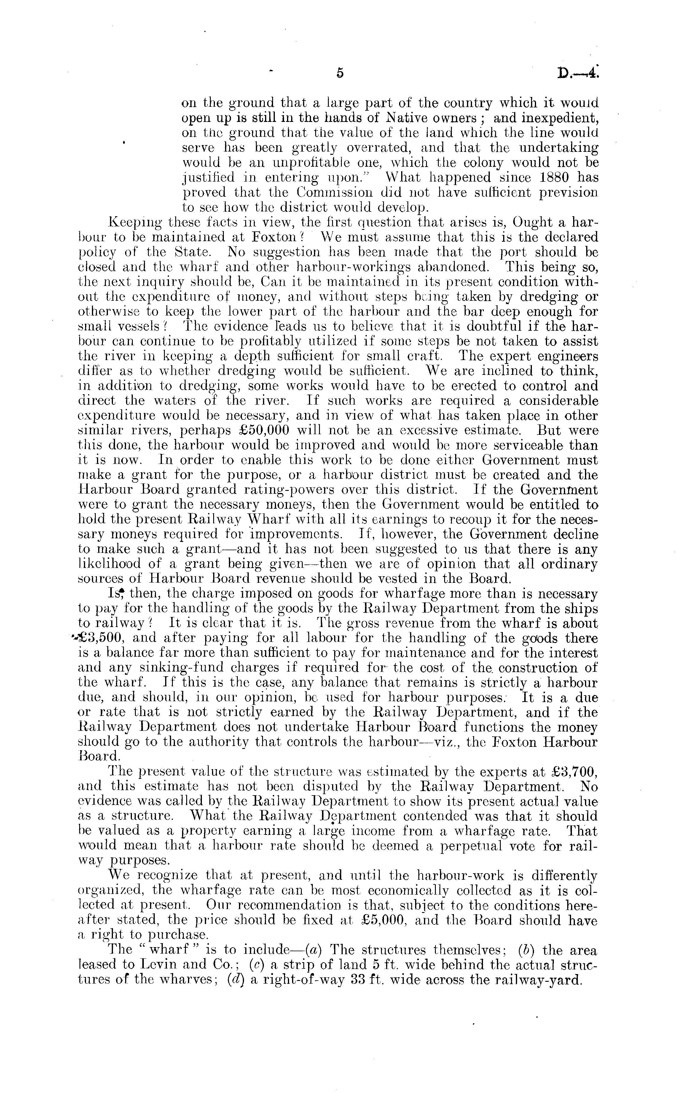 on the ground that a large part of the country which it would open up is still in the hands of Native owners ; and inexpedient, on the ground that the value of the land which the line would serve has been greatly overrated, and that the undertaking would be an unprofitable one, which the colony would not be justified in entering upon. ,. What happened since 1880 has proved that the Commission did not have sufficient prevision to see how the district would develop. Keeping these facts in view, the first question that arises is, Ought a harbour to be maintained at Foxton ? We must assume that this is the declared policy of the State. No suggestion has been made that the port should be closed and the wharf and other harbour-workings abandoned. This being so, the next inquiry should be, Can it be maintained in its present condition without the expenditure of money, and without steps being taken by dredging or otherwise to keep the lower part of the harbour and the bar deep enough for small vessels '{ The evidence leads us to believe that it is doubtful if the harbour can continue to be profitably utilized if some steps be not taken to assist the river in keeping a depth sufficient for small craft. The expert engineers differ as to whether dredging would be sufficient. We are inclined to think, in addition to dredging, some works would have to be erected to control and direct the waters of the river. If such works are required a considerable expenditure would be necessary, and in view of what has taken place in other similar rivers, perhaps £50,000 will not be an excessive estimate. But were this done, the harbour would be improved and would be more serviceable than it is now. fn order to enable this work to be done either Government must make a grant for the purpose, or a harbour district must be created and the Harbour Board granted rating-powers over this district. If the Government were to grant the necessary moneys, then the Government would be entitled to hold the present Railway Wharf with all its earnings to recoup it for the necessary moneys required for improvements. If, however, the Government decline to make such a grant —and it lias not been suggested to us that there is any likelihood of a grant being given—then we are of opinion that all ordinary sources of Harbour Board revenue should be vested in the Board. Is* then, the charge imposed on goods for wharfage more than is necessary to pay for the handling of the goods by the Railway Department from the ships to railway? It is clear that it is. The gross revenue from the wharf is about '-£3,500, and after paying for all labour for the handling of the goods there is a balance far more than sufficient to pay for maintenance and for the interest and any sinking-fund charges if required for the cost of the construction of the wharf. If this is the case, any balance that remains is strictly a harbour due, and should, in our opinion, be used for harbour purposes; It is a due or rate that is not strictly earned by the Railway Department, and if the Railway Department does not undertake Harbour Board functions the money should go to the authority that controls the harbour—viz., the Foxton Harbour Board. The present value of the structure was estimated by the experts at £3,700, and this estimate has not been disputed by the Railway Department, No evidence was called by the Railway Department to show its present actual value as a structure. What the Railway Department contended was that it should be valued as a property earning a large income from a wharfage rate. That would mean that a harbour rate should be deemed a perpetual vote for railway purposes. We recognize that at present, and until the harbour-work is differently organized, the wharfage rate can be most economically collected as it is collected at present. Our recommendation is that, subject to the conditions hereafter stated, the price should be fixed at £5,000, and the Board should have a right to purchase. The "wharf" is to include— (a) The structures themselves; (b) the area leased to Levin and Co.; (c) a strip of land 5 ft, wide behind the actual structures of the wharves; (d) a right-of-way 33 ft, wide across the railway-yard.