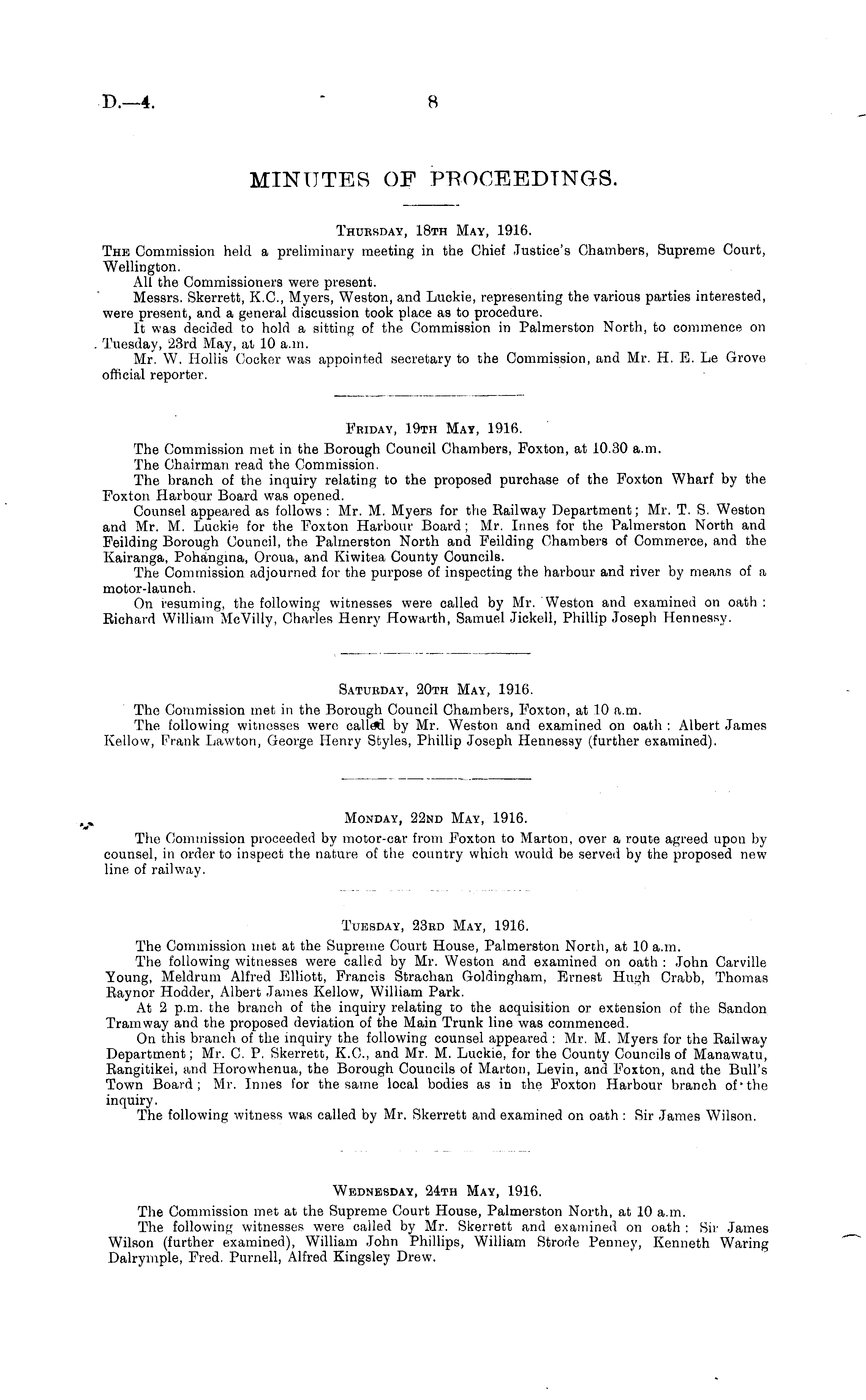 Thuksday, 18th May, 1916. The Commission held a preliminary meeting in the Chief Justice's Chambers, Supreme Court, Wellington. All the Commissioners were present. Messrs. Skerrett, K.C., Myers, Weston, and Luckie, representing the various parties interested, were present, and a general discussion took place as to procedure. It was decided to hold a sitting of the Commission in Palmerston North, to commence on . Tuesday, 23rd May, at 10 a.m. Mr. W. Ilollis Cocker was appointed secretary to the Commission, and Mr. H. E. Le Grove official reporter.