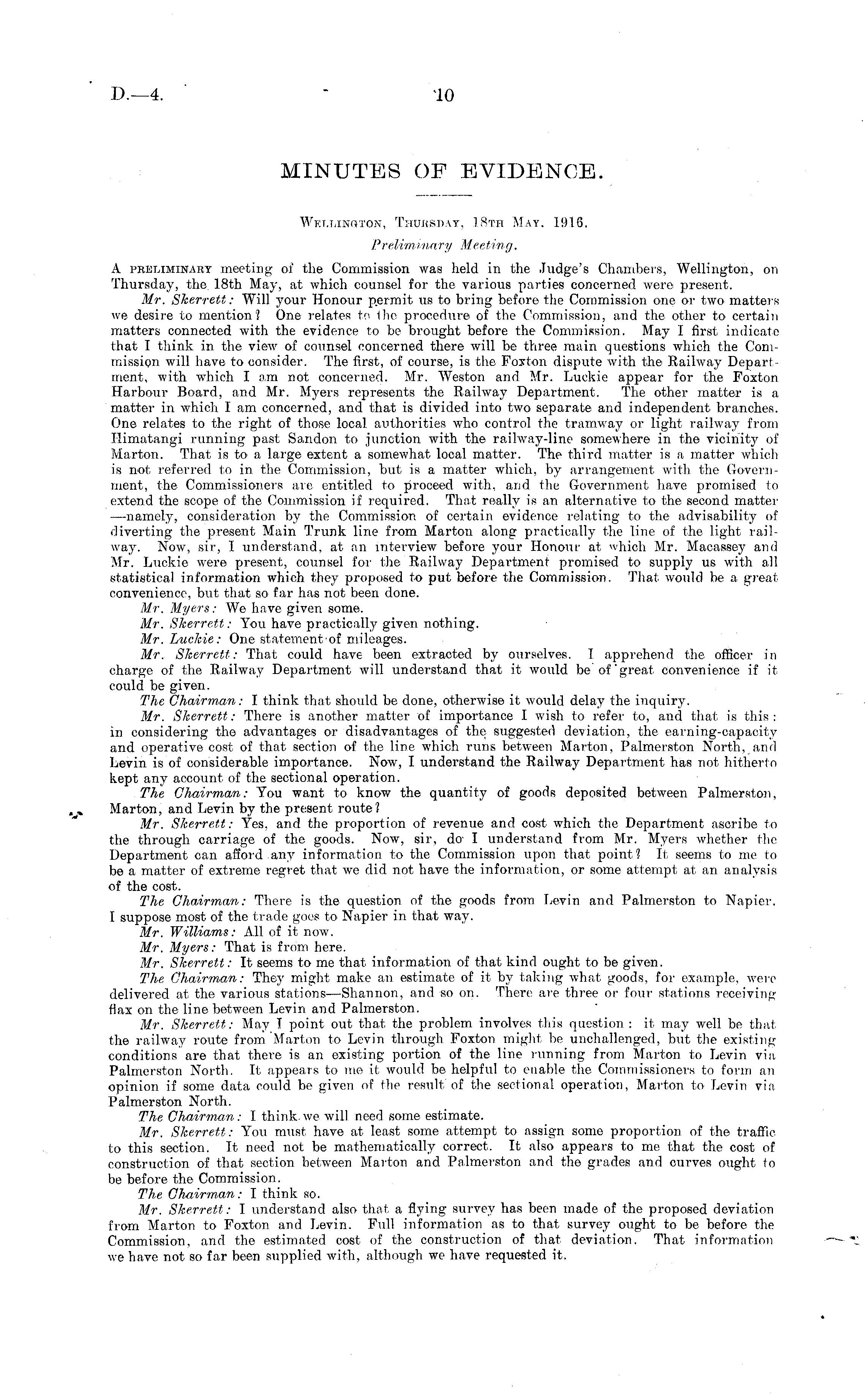 MINUTES OF EVIDENCE. Wellington, Thuksdat, 18th May. 1916. Preliminary Meeting, A preliminary meeting of the Commission was held in the Judge's Chambers, Wellington, on Thursday, the 18th May, at which counsel for the various parties concerned were present. Mr. Skerrett: Will your Honour permit us to bring before the Commission one or two matters we desire to mention'? One relates to the procedure of the Commission, and the other to certain matters connected with the evidence to be brought before the Commission. May I first indicate that I think in the view of counsel concerned there will be three main questions which the Commission will have to consider. The first, of course, is the Foxton dispute with the Railway Department, with which I am not concerned. Mr. Weston and Mr. Luckie appear for the Foxton Harbour Board, and Mr. Myers represents the Railway Department. The other matter is a matter in which I am concerned, and that is divided into two> separate and independent branches. One relates to the right of those local authorities who control the tramway or light railway from Himatangi running past Sandon to junction with the railway-line somewhere in the vicinity of Marton. That is to a large extent a somewhat local matter. The third matter is a matter which is not referred to in the Commission, but is a matter which, by arrangement with the Government, the Commissioners are entitled to proceed with, and the Government have promised 1o extend the scope of the Commission if required. That really is an alternative to the second matter —namely, consideration by the Commission of certain evidence relating to the advisability of diverting the present Main Trunk line from Marton along practically the line of the light railway. Now, sir, I understand, at an interview before your Honour at which Mr. Macassey and Mr. Luckie were present, counsel for the Railway Department promised to supply us with all statistical information which they proposed to put before the Commission. That would be a great convenience, but that so far has not been done. Mr. Myers: W© have given some. Mr. Skerrett,: You have practically given nothing. Mr. Luckie: One statement , of mileages. Mr. Skerrett: That could have been extracted by ourselves. T apprehend the officer in charge of the Railway Department will understand that it would be of"great convenience if it could be given. The Chairman: I think that should be done, otherwise it would delay the inquiry. Mr. Skerrett: There is another matter of importance I wish to refer to, and that is this: in considering the advantages or disadvantages of the suggested deviation, the earning-capacity and operative cost of that section of the line which runs between Marton, Palmerston North, and Levin is of considerable importance. Now, I understand the Railway Department has not hitherto kept any account of the sectional operation. The Chairman: You want to know the quantity of goods deposited between Palmerston, Marton, and Levin by the present route? Mr. Skerrett: Yes, and the proportion of revenue and cost which the Department ascribe to the through carriage of the goods. Now, sir, do- I understand from Mr. Myers whether the Department can afford any information to the Commission upon that point? It seems to me to be a matter of extreme regret that we did not have the information, or some attempt at an analysis of the cost. The, Chairman: There is the question of the goods from Levin and Palmerston to Napier. I suppose most of the trade goes to Napier in that way. Mr. Williams: All of it now. Mr. Myers: That is from here. Mr. Skerrett: It seems to me that information of that kind ought to be given. The Chairman: They might make an estimate of it by taking what goods, for example, were delivered at the various stations —Shannon, and so on. There are three or four stations receiving flax on the line between Levin and Palmerston. Mr. Skerrett: May T point out that the problem involves this question : it may well be that the railway route from Marton to Levin through Foxton might be unchallenged, but the existing conditions are that there is an existing portion of the line running from Marton to Levin via Palmerston North. It appears to me it would be helpful to enable the Commissioners to form an opinion if some data could be given of the result of the sectional operation, Marton to Levin via Palmerston North. The Chairman: I think, we will need some estimate. Mr. Skerrett: You must have at least some attempt to assign some proportion of the traffic to this section. It need not be mathematically correct. It also appears to me that the cost of construction of that section between Marton and Palmerston and the grades and curves ought to be before the Commission. The Chairman: I think so. Mr. Skerrett: I understand also that a flying survey has been made of the proposed deviation from Marton to Foxton and Levin. Full information as to that survey ought to be before the Commission, and the estimated cost of the construction of that deviation. That information we have not so far been supplied with, although we have requested it.