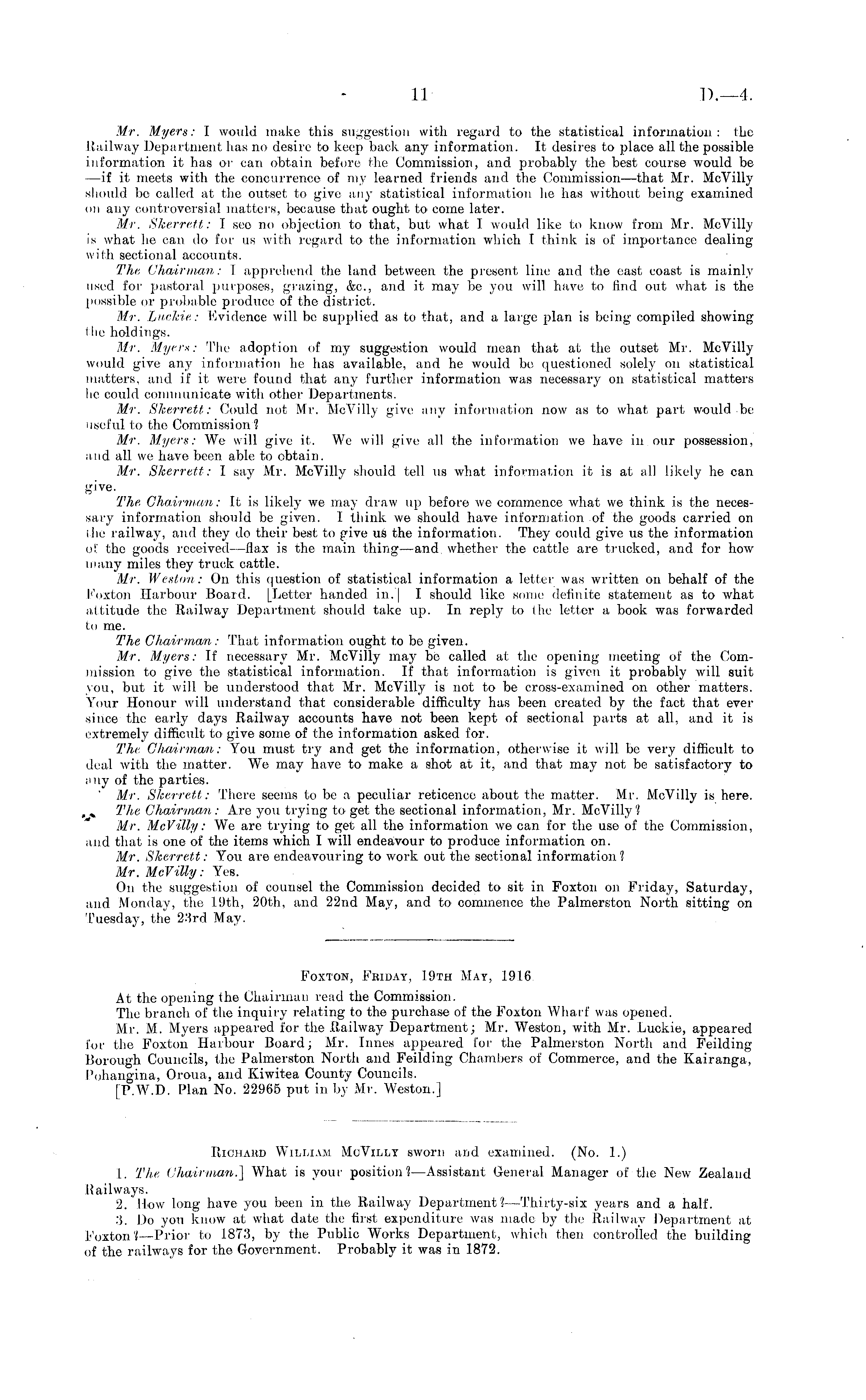 RIOHARD William McVilly sworn arid examined. (No. 1.) 1. The What is your position?'—Assistant G-eneral Manager of the New Zealand Railways. 2. How long have you been in the Railway Department?— Thirty-six years and a half. •S. Do you know at what date the first expenditure was made by the Railway Department at Foxton? —Prior to 1873, by the Public Works Department, which then controlled the building of the railways for the Government. Probably it was in 1872.