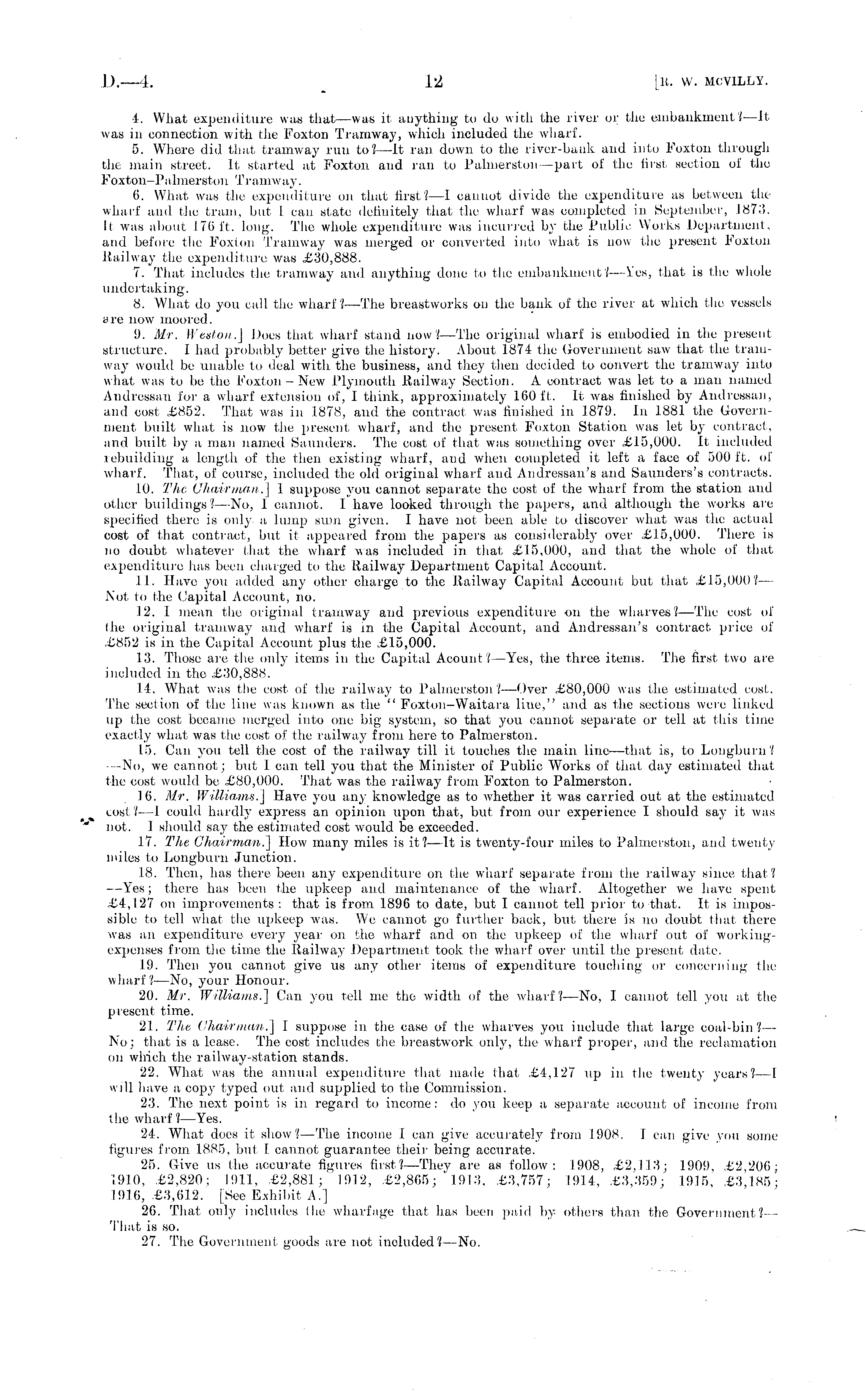 4. What expenditure was that—was it anything to do with the river or the embankment ?—lt was in connection with the Foxton Tramway, which included the wharf. 5. Where did that tramway run to?—lt ran down to the river-bank and into Foxton through the main street. It started at Foxton and ran to Palinerston —part, of the first section oil the Foxton-Palmerston Tramway. 6. What was the expenditure on that first?—l cannot divide the expenditure as between the wharf and the train, but I can state definitely that (lie wharf was completed in September, 1873, It was about 176 ft. long. The whole expenditure was incurred by the Public Works Department, and before the Foxton Tramway was merged or converted into what is now the present Foxton Railway the expenditure was ,£30,888. 7. That includes the tramway and anything done to the embankment? —Yes, that is the whole undertaking. 8. What do you call the wharf? —The breastworks on the bank of the river at which the vessels are now moored. 9. Mr. Western.] Does that wharf stand now?— The original wharf is embodied in the present structure. I had probably better give the history. About 1874 the Government saw that the tramway would be unable to deal with, the business, and they then decided to convert the tramway into what was to be the Foxton - New Plymouth Railway Section. A contract was let to a man named Andressan for a wharf extension of, I think, approximately 160 ft,. It was finished by Andressan, and cost £8821 That was in 1878, and the contract was finished in 1879. In 1881 the Government built what is now the present, wharf, and the present, Foxton Station was let by contract, and built by a man named Saunders. The cost of that was something over £15,000. it included rebuilding a length of the then existing wharf, and when completed it left a face of 500 ft. of wharf. That, of course, included the old original wharf and Andressan s and Saunders's contracts. 10. The Chairman.\ 1 suppose you cannot separate the cost of the wharf from the station and other buildings? —No, 1 cannot. I have looked through the papers, and although the works are specified there is only a lump stun given. I have not been able to discover what was the actual cost of that contract, but it appeared from the papers as considerably over .£1.5,000. There is no doubt whatever that the wharf was included in that £15,000, and that the whole of that expenditure has been charged to the Railway Department Capital Account. 11. Have you added any other charge to the Railway Capital Account, but that £15,000? — Not to the Capital Account, no. 12. I mean the original tramway and previous expenditure on the wharves?— The cost of Ihe original tramway and wharf is xn the Capital Account, and Andressan's contract price of £852 is in the Capital Account plus the £15,000. 13. Those are the only items in the Capital Acount? —Yes, the three items. The first two are included in the £30,888. 14. What was the cost of the railway to Palmerston ?—Over £80,000 was the estimated cosl. The section of the line was known as the " Foxton-Waitara Hue," and as the sections were linked up the cost became merged into one big system, so that you cannot separate or tell at this time exactly what was the cost of the railway front here to Palmerston. 15. Can you tell the cost of the railway till it touches the main lino—that is, to Longburn '! --No, we cannot; but I can tell you that the Minister of Public Works of that day estimated thai the cost would be .£BO,OOO. That was the railway from Foxton to Palmerston. I'd, Mr. Williams.] Have you any knowledge as to whether it was carried out at the estimated cos! I —l could hardly express an opinion upon that, but from our experience I should say it was not. 1 should say the estimated cost would be exceeded. 17. The Chairman.] How many miles is it? —lt is twenty-four miles to Palmerston, and twenty miles to Longburn Junction. 18. Then, has there been any expenditure on the wharf separate from the railway since that? —Yes; there has been the upkeep and maintenance of the wharf. Altogether we have spent £4,127 on improvements : that is from 1896 to date, but I cannot tell prior to that. It is impossible to tell what the upkeep was. We cannot go further back, but there is no doubt that there was an expenditure every year on the wharf and on the upkeep of the wharf out of workingexpenses from the time the Railway Department took the wharf over until the present date. 19. Then you cannot give us any other items of expenditure touching or concerning the wharf? —No, your Honour. 20. Mr. Williams.] Can you tell, me the width of the wharf?—No, I cannot (ell. you at the present time. 21. r fhe Chairman.] 1 suppose in the case of the wharves you include that large coal-bin? —■ No; that is a lease. The cost includes the breastwork only, the wharf proper, and the reclamation on which the railway-station stands. 22. What was the annual expenditure that made that £4,127 up in the twenty years?—l will have a copy typed out and supplied to the Commission. 23. The next point is in regard to income: do you keep a separate account of income from the wharf ?—Yes. 24. What does it show? —The income 1 can give accurately from 1908. I can give you some figures from 1885, but f. cannot guarantee their being accurate. 25. Give us the accurate figures first?— They are as follow: 1908, £2,11:!; 1909, £2,206; 19T6, £2,820; 1911, £2,881; 1912, ,£2,865; " 1913. £3.757; 1914, £3,359; 1915, £3,185; 1916, £3,612. [See Exhibit A.] 26. That only includes I lie wharfage that has been paid by others than the Government?— That is so. 27. The Government goods are not included?— No.