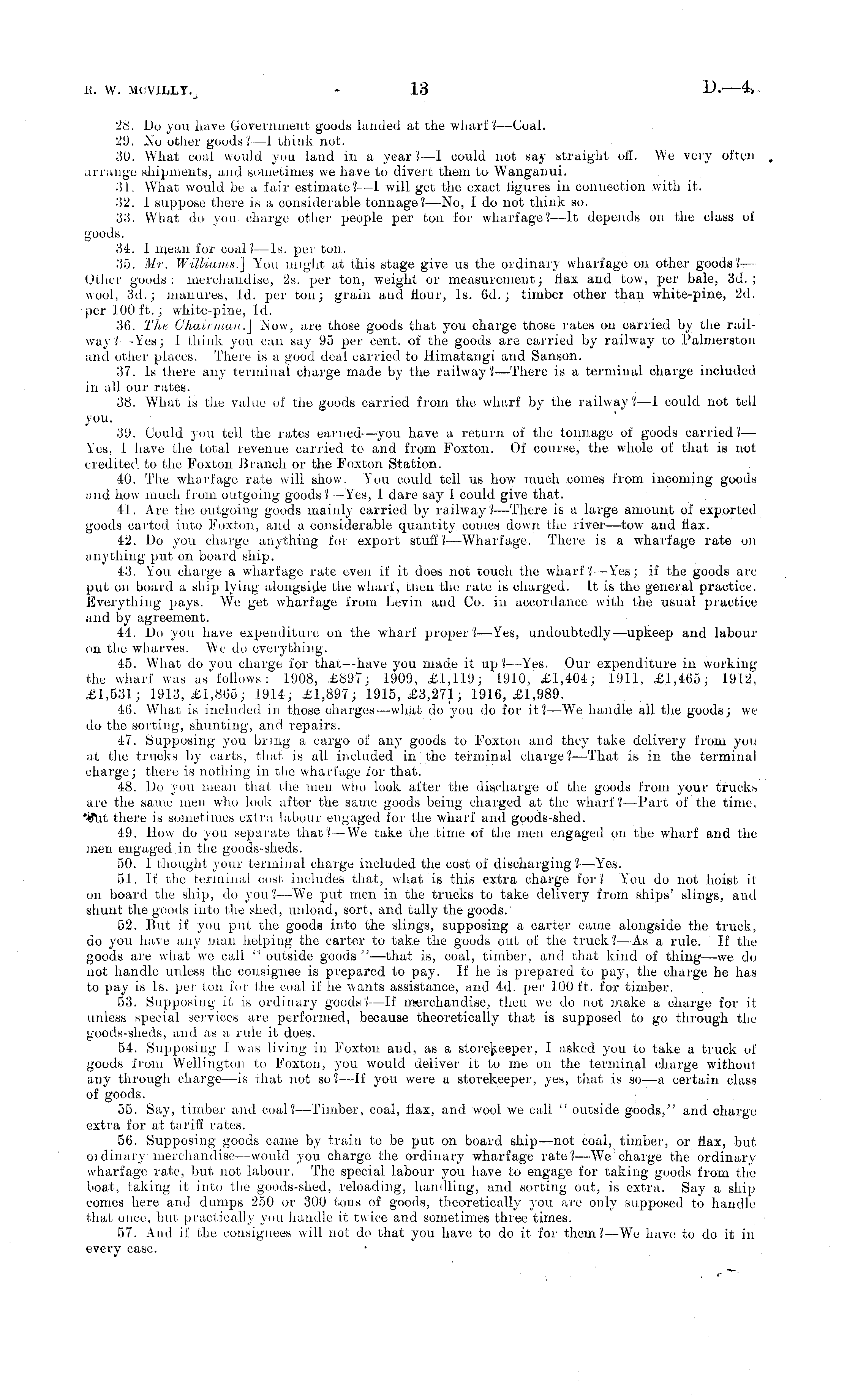 28. Do you have Government goods landed at the wharf'/—(Joal. 29. No other goods? —1 think not. 30. What coal would you land in a year?—l could not say straight off. We very often arrange shipments, and sometimes we have to divert them to Wanganui. 31. What would be a fair estimate?-—I will get the exact figures in connection with it. 32. L suppose there is a considerable tonnage?—No, 1 do not think so. 33. What do you charge other people per ton for wharfage?—lt depends on the class of goods. 34. 1 mean for coal?—ls. per ton. •■if). Mr. Williams.] You might at this stage give us the ordinary wharfage on other goods? — Other goods : merchandise, 2s. per ton, weight or measurement; flax and tow, per bale, 3d. ; wool, -'id.; manures, Id. per ton; grain and Hour, Is. (kl. ; timber other than white-pine, 2d. per 100 ft.; white-pine, Id. .'iC. The (Jhainnau .j Now, are those goods that you charge those rates on carried by the railway?— Yes; 1 think you can say 95 per cent, of the goods arc carried by railway to Palmerston and other places. There is a good deal carried to Himatangi and Sanson. 37. Is there any terminal charge made by the railway?— There is a terminal charge included in all our rates. 38. What is the value of the goods carried from the wharf by the railway? —I could not tell you. 39. Qould you tell (he rates earned-—you have a return of the tonnage of goods carried? — Yes, 1 have the total revenue carried to and from Foxton. Of OQ.UX'ge, the whole of that is not credited to the Foxton Branch or the Foxton Station. 4-0. The wharfage rate will show. You could tell us how much comes from incoming goods and how much from outgoing goods? -Yes, 1 dare say I could give that. 41. Are (lie outgoing goods mainly carried by railway? —There is a large amount of exported goods carted into Foxton, and a considerable quantity comes down the river—tow and llax. 42. Do you charge anything for export stuff? —Wharfage. There i.s a wharfage rate on anything put on board ship. 43. You charge a wharfage rate even if it does not touch the wharf? —Yes; if the goods are put-on board a ship lying alongside the wharf, then the rate is charged. It is the general practice. Everything pays. We get wharfage from Levin and Co. in accordance with the usual practice and by agreement. 44. JL)o you have expenditure on the wharf proper?— Yes, undoubtedly—upkeep and labour on the wharves. We do everything. 45. What do you charge for that—have you made it up?— Yes. Our expenditure in working the wharf was as' follows : 1908, £897; 1909, £1,119; 1910, .£1,404; 1911, £1,4(5,5.; 1912, .£1,531; 19;13, £1,81)5; 1911; .£1,897; 1915, £3,271; 1916, £1,989. 4(5. What is included in those charges—what do you do for it/.' -- -We handle all the goods; we do the sorting, shunting, and repairs. 47. Supposing you bring a cargo of any goods to Foxton and they take delivery from you at the trucks by carts, thai is all included in the terminal charge?— That is in the terminal charge; there is nothing in the wharfage for that. 48. Do you mean that the men who look after the discharge of the goods from your trucks are the same men who look after the same goods beiug charged at the wharf?— Pail, of the time. '■Wilt there is sometimes extra labour engaged for the wharf and goods-shed. 49. How do you separate that?—We take the time of the men engaged oil the wharf and the men engaged in the goods-sheds. 50. 1 thought your terminal charge included the cost of discharging?— Yes. 51. If the terminal cost includes that, what is this extra charge for? You do not hoist it on board the ship, do you?—We put men in the trucks to take delivery from ships' slings, and shunt the goods into the shed, unload, sort, and tally the goods. 52. But if you put the goods into the slings, supposing a carter came alongside the truck, do you have any man helping the carter to take the goods out of the truck ?—As a rule. If the goods are what wo call "outside goods"—that is, coal, timber, and that kind of thing—we do not handle unless the consignee is prepared to pay. If he is prepared to pay, the charge he has to pay is Is. per ton for the coal if he wants assistance, and 4d. per 100 ft. for timber. 53. Supposing it is ordinary goods?—lf merchandise, then yve do not, make a charge for it unless special services are performed, because theoretically that is supposed to go through the goods-sheds, and as a rule it does. 54. Supposing 1 was living in Foxtou and, as a storekeeper, 1 asked you to take a truck of goods from Wellington to Foxton, you would deliver it to me on the terminal charge without any through charge—is that not so? —If you were a storekeeper, yes, that is so —a certain class of goods. 55. Say, timber and coal?— Timber, coal, flax, and wool we call " outside goods," and charge extra for at tariff rates. SG. Supposing goods came by train to be put on board ship —not coal, timber, or flax, but ordinary merchandise—would you charge the ordinary wharfage rate?—We charge the ordinary wharfage rate, but not labour. The special labour you have to engage for taking goods from the boat, taking it into the goods-shed, reloading, handling, and sorting out, is extra. Say a ship conies here and dumps 250 or 300 tons of goods, theoretically you are only supposed to handle that once, but practically you handle it twice and sometimes three times. 57. And if the consignees will not do that you have to do it for them?—We have to do it in every case.