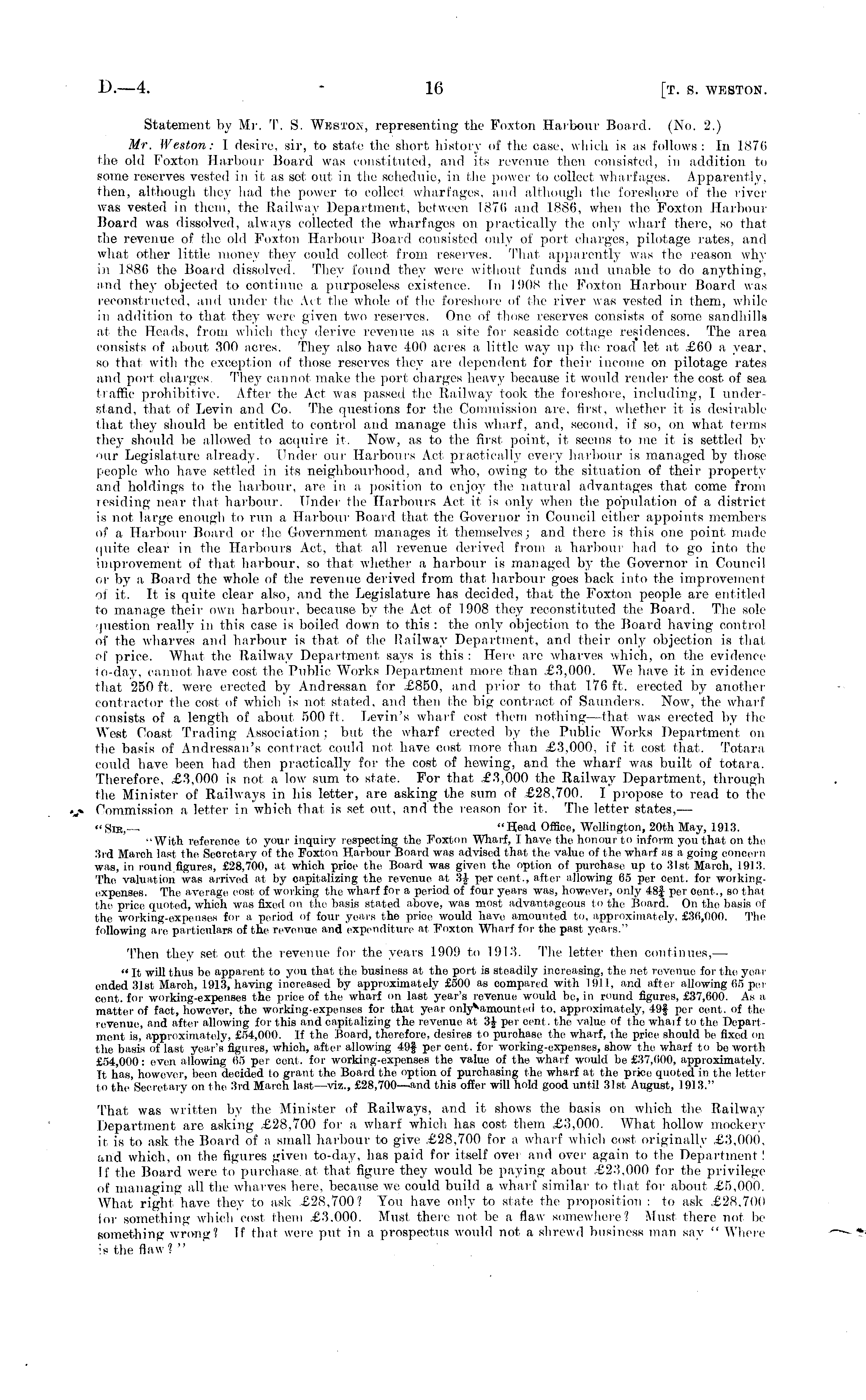 Statement, by Mi - . T. S. Wkston, representing the Foxton Harbour Board. (No. 2.) Mr, Weston: 1 desire, sir, to state the short history of the ease, which is as follows: in L'B76 the old Foxton Harbour Hoard was constituted, and its revenue then consisted, in addition to some reserves vested in it as set out in the schedule, in the power to collect wharfages. Apparent lv, then, although they had the power to collect wharfages, and although the foreshore of the river was vested in them, the Railway Department, between 1876 and 1886, when the Foxton Harbour Board was dissolved, always collected the wharfages on practically the only wharf there, so that the revenue of the old Foxton Harbour Board consisted only of port charges, pilotage rates, and what other little money they could collect from reserves. That apparently was the reason why in 1886 the Board dissolved. They found they Were without funds and unable to do anything, and they objected to continue a purposeless existence. In L9OB the Foxton Harbour Board was reconstructed, and under, the Act the whole of the foreshore of the river was vested in them, while in addition to that they were given two reserves. One of those reserves consists of some sandhills ait the Heads, from which they derive revenue as a site for seaside Cottage residences. The area consists of about 300 acres. They also have 400 acres a little way up the road let at £60 a year, so that with the exception of those reserves they are dependent for their income on pilotage rates and port charges. They cannot make the port charges heavy because it would render the cost of sea traffic prohibitive. Alter the Act was passed the Railway took the foreshore, including, 1 understand, that of Levin and Co. The questions for the Commission are, first, whether it is desirable that they should be entitled to control and manage this wharf, and, second, if so, on what terms they should be allowed to acquire it. Now, as to the first point, it seems to me it is settled by our Legislature already. Under our Harbours Act practically every harbour is managed by those people who have settled in its neighbourhood, and who, owing to the situation, of their property and holdings to the harbour, are in a position to enjoy the natural advantages that come from residing near that harbour. Tinder the Harbours Act it is only when the population of a district is not large enough to run a Harbour Board that the Governor in Council either appoints members of a Harbour Board or the Government manages it themselves; and. there is this one point made quite clear in the Harbours Act, that all revenue derived from a harbour had to go into the improvement of that harbour, so that whether a harbour is managed by the Governor in Council oi- by a. Board the whole of the revenue derived from that harbour goes back into the improvement of it. It is quite clear also, and the Legislature has decided, that the Foxton people are entitled to manage their own harbour, because by the Act of 1908 they reconstituted the Board. The sole question really in this case is boiled down to this : the only objection to the Board having control of the wharves and harbour is that of the Railway Department, and their only objection is that of price. What the Railway Department says is this : Here are wharves which, on the evidence io-day, cannot have cost the Public Works Department more than .£3,000. We have it in evidence that 250 ft. were erected by Andressan for £850, and prior to that 176 ft. erected by another contractor the cost of which is not stated, and then the big contract of Saunders. Now, the wharf consists of a length of about 500 ft. Levin's wharf cost them nothing—that was erected by the West Coast Trading Association ; but the wharf erected by the Public Works Department on the basis of Andressan's contract could not have cost more than £3,000, if it cost that. Totara could have been had then practically for the cost of hewing, and the wharf was built of totara. Therefore, £3,000 is not a low sum'to state. For that £3,000 the Railway Department, through the Minister of Railways in his letter, are asking the sum of £28,700. I propose to read to the «j» Commission a letter in which that is set out, and the reason for it. The letter states, — «Si B; "Head Office, Wellington, 20th May, 1913. ••With reference to your inquiry respecting the Foxton Wharf, 1 have the honour to inform you that on the .'ird March last the Secretary of the Foxton Harbour Board was advised that the value of the wharf us a going concern was, in round figures, £28,700, at which price the Board was given the option of purchase up to 31st March, 1913. The valuation was arrived at by capitalizing the revenue at 3J per cent., after allowing 65 per cent, for workingexpenses. The average cost of working the wharf for a period of four years was, however, only 48f per Cent., so that the price quoted, which was fixed on the basis stated above, was most advantageous to the Board. On the basis of the working-expenses for- a period of four years the price would have amounted to, approximately, £36,000. The following are particulars of the revenue and expenditure at Foxton Wharf for the past years." Then they set out the revenue for the years 1909 to 191-'!. The letter then continues, — " It will thus be apparent to you that the business at the port is stoadily increasing, the net revenue for the year ended 31st March, 1913, having increased by approximately £500 as compared with 1911, and after allowing (in per cent, for , working-expenses the price of the wharf on last year's revenue would be, in round figures, £37,(500. As a matter , of fact, howevor, the working-expenses for that year onlyVwnounted to. approximately, 49| per- cent, of the revenue, and after allowing for this and capitalizing the revenue at 3J per cent, the value of the wharf to the Department is, approximately, £54,000. If the Board, therefore, desires to pur