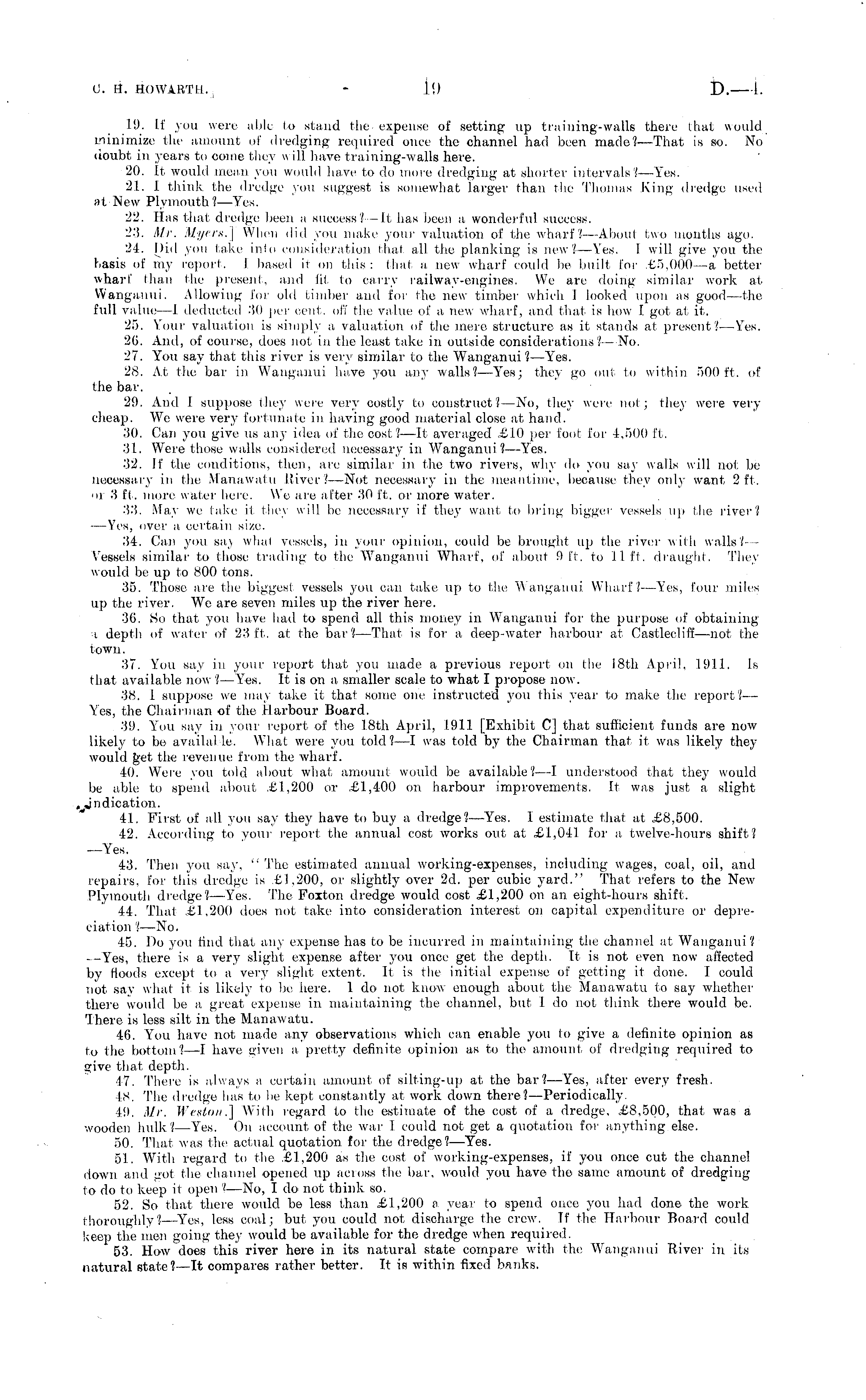 19. I i you were able to stand the expense of setting up training-walls there that would minimize the amount <>!' dredging required once the channel had been made'!—Thut is so. No (ioubt in years to come they v ill have training-walls here. 20. It would mean you would have to do more dredging at shorter intervals ? —Yes. 21. I think the dredge yon suggest is somewhat larger than the Thomas King dredge used at New Plymouth ?—Yes. 22. Has that dredge been a sucoees? — lt has been a wonderful success. 23. Mr. Myers.] When did you make your valuation of the wharf ?—Aboul two months ago. 24. Did you lake into consideration thai all the planking is new , /—Yes. I will give you the hasis of my report. I based it on this: thai a new wharf could be built for £5,000 —a better wharf than the present, and lif to carry i ailwav-engines. We are doing similar work at VVanganui. Allowing I'or old limber and for the new timber winch I looked upon us good—the full value—l deducted 30 per cent, off the value of a new wharf, and thai is how 1 got at it, 25. Your valuation is simply a valuation of the mere structure as it stands ai present.—Yes. 26. And, of course, does not in the least take in outside considerations'-—No. 27. You say that this river is very similar to the Wanganui ?—Yes. 28. At the bar in Wanganui have you any walls?— Yes; they go out to within 500 ft. of the bar. 29. And I suppose they were very costly to construct?—No, they were nol ; they were verycheap. We were very fortunate in having good material close at hand. 30. dan you give us any idea of the cost?—lt averaged £10 i>o) , loot I'or 4,500 ft. 31. Were those walls considered necessary in Wanganui?—Yes. 32. If the conditions, then, are similar in the two rivers, why do you say walls will not be necessary in the Manawatu I'iver?—Not necessary in the meantime, because they only want 2ft. 01 ■'( ft.. more water here. We are after 30 ft. or more water. 33. May we lake r( they will be necessary if they want to bring lugger vessels up the river? —Yes, over a certain size. 34. Can you sa\ whal Teasels, in your opinion, could be brought up the river with walls , / Vessels similar to those trading to the Wanganui Wharf, of about 9 ft. to II ft. draught. They would be up to 800 tons. 35. Those are the biggest vessels you can take up to the Wanganui Wharf/ —Yes, four miles up the river. We are seven miles up the river here. 36. So that you have had to spend all this money in Wanganui for the purpose of obtaining 1 depth of water of 23 ft. at the bar?— That is for a, deep-water harbour at Oastlecliff—not (he town. ■'57. You say in your report that you made a previous report on the 18th April, 1911. Is that available now ? —Yes. It is on a smaller scale to what I propose now. 38. L suppose we may take it that some one instructed you this year to make the report'/--Yes, the Chairman of the Harbour Board. •')9. You say in your report of the I.Bth April, 1.91.1 | Exhibit Cj that sufficient funds are now likely to be available. What were you told? —I was told by the Chairman that it was likely they would get the revenue from the wharf. 40. Were you told about what amount would be available?—l understood that they would be able to spend about .£1,200 or ,£1,400 on harbour improvements. It was just, a slight .^indication. 41. First of all you say they have to buy a dredge?— Yes. 1 estimate that at £8,500. 42. According to your report the annual cost works out at £1,041 for a twelve-hours shift? —Yes. 43. Then you say, "The estimated annual working-expenses, including wages, coal, oil, and repairs, for this dredge is £1,200, or slightly over 2d. per cubic yard. , ' That refers to the New Plymouth dredge?— Yes. The Foiton dredge would cost £1,200 on an eight-hours shift. 44. That £1,200 does not take into consideration interest on capital expenditure or depreciation?—No, 45. Do you find that any expense has to be incurred in maintaining the channel at Wanganui? --Yes, there is a very slight expense after you once get the depth. It is not even now affected by floods except to a very slight extent. It is the initial expense of getting it done. I could not siiv what il is likely to be here. 1 do not know enough about the Manawatu to say whether there would be a, great expense in maintaining the channel, but 1 do not think there would be. There is less silt in the Manawatu. 46. You have not made any observations which can enable you to give a definite opinion as to the bottom?- —I have given a pretty definite opinion as to the amount of dredging required to give that depth. 17. There is always a certain amount of silting-up at the bar? —Yes, after every fresh. 18. The dredge has to be kept constantly at work down there? —Periodically. 4!). Mr. Wesion.] With regard to the estimate of the cost of a dredge, £8.500, that was a wooden hulk? —Yes. On account of the war 1 could not get a quotation for anything else. 50. That was the actual quotation for the dredge?— Yes. 51. With regard to the .£1,200 as the cost of working-expenses, if you once cut the channel down and gal the channel opened up across the bar, would you have the same amount of dredging to do to keep it open !—No, I do not think so. 52. So that there would be less than £1,200 a year to spend once you had done the work thoroughly?— Yes, less coal; but you could not discharge Ihe crew. If the Harbour Board could keep the men going they would be available for the dredge when required. 53. How does this river here in its natural state compare with the Wanganui River in its natural state? —It compares rather better. It is within fixed banks.