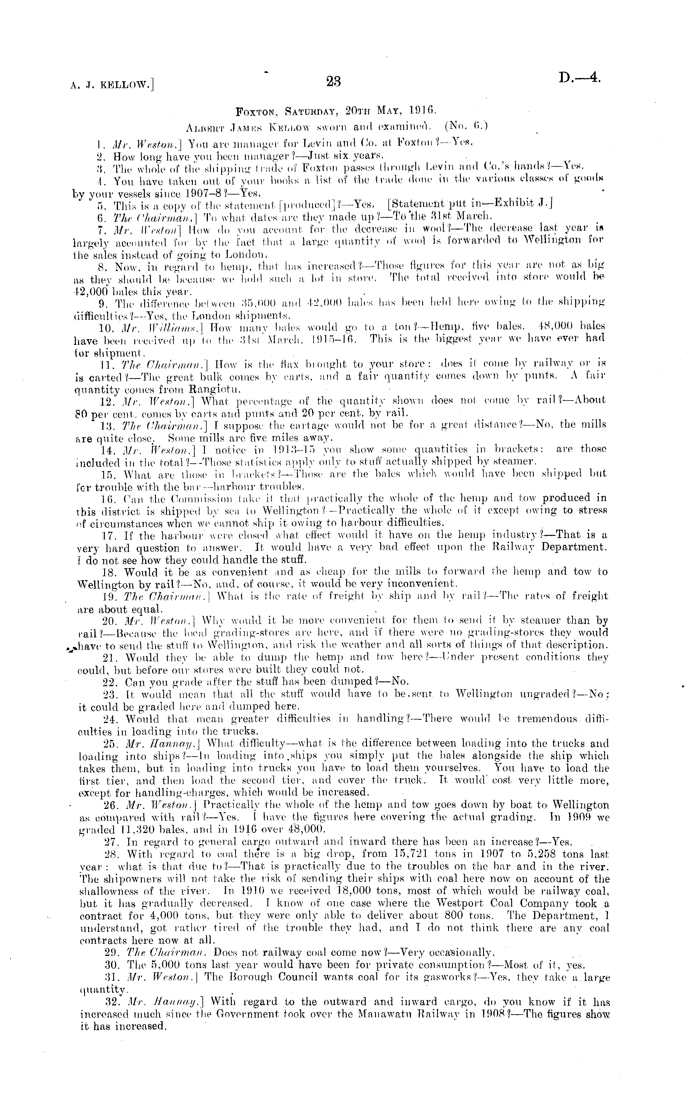 Foxton, Saturday, 20tii May, 11) Hi. Ai.moiiT Jamks Krlnow sworn and examined. (No, 6.) 1, Mr, Western,] You are manager for Levin utid Co, a( Foxtcaj 1 Vess. 2, How long have you been Manager ?— Juat six years, •'!. The whole of the shipping trade of froxton passes through Levin and Go.'s liiuid.s f— Yen. I. You bave taken out. of your books a list of the trade done in the various classes of pootle by your vessels since 1907—8.? —Yes, 0, This is a copy of the statement [produced] ?—Yes, [Statement put in—Exhibit i, \ (5. The C/iairman.] To what dates are they made Up? —IVthe 81st March. 7. Mr, U'r.itini] How d<; you accouni for the decrease in Wool I—Tlie decrease last year in largely accounted for by the fact that a large quantity of wool Is forwarded to Wellington for the sales instead of going bo London, 8. Now, in regard tp hemp, dial has increased.?— Those figures tot this yeai , are not as big as they should be because we hold such a lot in store, The total received into store would be 42,000 bales this pear. 9. The difference between 36,6d(5 and 42,000 bales has been held here owing to the shipping difficulties ?—;Yes, the London shipments, 10. Mr. William.] How many bales would go to a ton?— Hemp, nve hales. 18,000 hales have been received it'p to the .'list March, 1915-16, This is the biggest year we have ever had for shipment. 11. The Chairman . ] How is the flax brought to your store: iloes ii come by railway or is is carted?— The great bulk comes by carts, and a fair quantity comes down by punts, A fair quantity comes from Rangiotu. 12. Mr. Weston.] What percentage of the quantity shown does nol come by rail? —About 80 per cent, comes by carts and punts and 20 per cent, by rail. l.'i. The Cliainiiai> .] I suppose tlie cartage would not be for a great distance? —No, the mills are quite close... Some mills are five, miles away, 14. Mr. Weston.] 1 notice in 1913—15 you show some quantities in brackets: are those included in the total I—Those statistics apply only to stuff actually shipped by steamer. 15. What are those in brackets.?— Those are the bales which would have been shipped but for trouble with the bar - -harbour troubles. 16. Can the Commission take ii thai practically the whole of the hemp and tow produced in this district is shipped by sea to Wellington ?—Practically the whole of ii except owing to stress of circumstances when we cannot ship it owing to harbour difficulties. 17. If the harbour were closed ,vhal effect would it have on the hemp industry , ?— That is a very hard question to answer. Ii would have a very bad effect upon the Railway Department, i do not see how they could handle the stuff. 18. Would it be as convenient md as cheap for the mills to forward the hemp and tow to Wellington by rail? —No, and, of course, it would be very inconvenient. 19. The Chairman.] What is the rate of freight by ship and by rail.' -The rates of freight are about equal. 20. Mr. Wetton.] Why would it Be more convenient for them to semi it by steamer than by rail J Because the local grading-stores are here, and if there were no grading-stores they would . «have to send the stuff to Wellington, and risk the weather and all sorts of things of that description. 21. Would they be able to dump the hemp and tow here?— Under present conditions they could, but before our stores were built they could not. 22. Can you grade after the stuff has been dumped?— No. 23. It would mean that all the stuff would have to be.sent to Wellington ungraded ? — -No: it could be graded here and dumped here. 24. Would that mean greater difficulties in handling?— There would be tremendous difficulties in loading into the trucks. 25. Mr. fltmnay.] What difficulty—what is the difference between loading into the trucks and loading into ships?—ln loading into.ships you simply put the bales alongside the .ship which takes them, but in loading into trucks you have to load them yourselves. You have to load the first tier, and then load the second tier, and cover the truck. It would cost, very little more, except for handling-charges, which would be increased. 26. Mr. WetotOn.] Practically the whole of Ihe hemp and tow goes down by boat to Wellington as compared with rail? —Yes. l' have the figures here covering the actual grading. In 190(1 we graded 11,.'520 bales, and in 1916 over 48,000. 27. In regard to general cargo outward and inward there lias been an increase?— Yes. 28. With regard to coal there is a big drop, from 15,721 tons in [907 to 5,258 tons last year : what is that due to?— That is practically due to the troubles on the bar and in the river. The shipowners will not take the risk of sending their ships with coal here now on account of the shallowness of the river. In 1910 we received 18,000 tons, most of which would be railway coal, but it has gradually decreased. I know of one case where the Westport Coal Company took a contract for 4,000 tons, but they were only able to deliver about 800 tons. The Department, I understand, got rather tired of the trouble they had, and I do not think there are any coal contracts here now at all. 29. The Chairman. Does not. railway coal come now?— Very occasionally. 30. Tin , 5,000 tons last year would have been for private consumption ?—-Most of il, yes. 31. Mr. Weston.] The Borough Council wants coal for its gasworks?—-Yes, they lake a large quantity. .'52. Mr. liaiiiiaij.\ With regard to the outward and inward cargo, do you know if it has increased much since the Government took over the Manawatu Railway iti 1908?— The figures show it has increased,