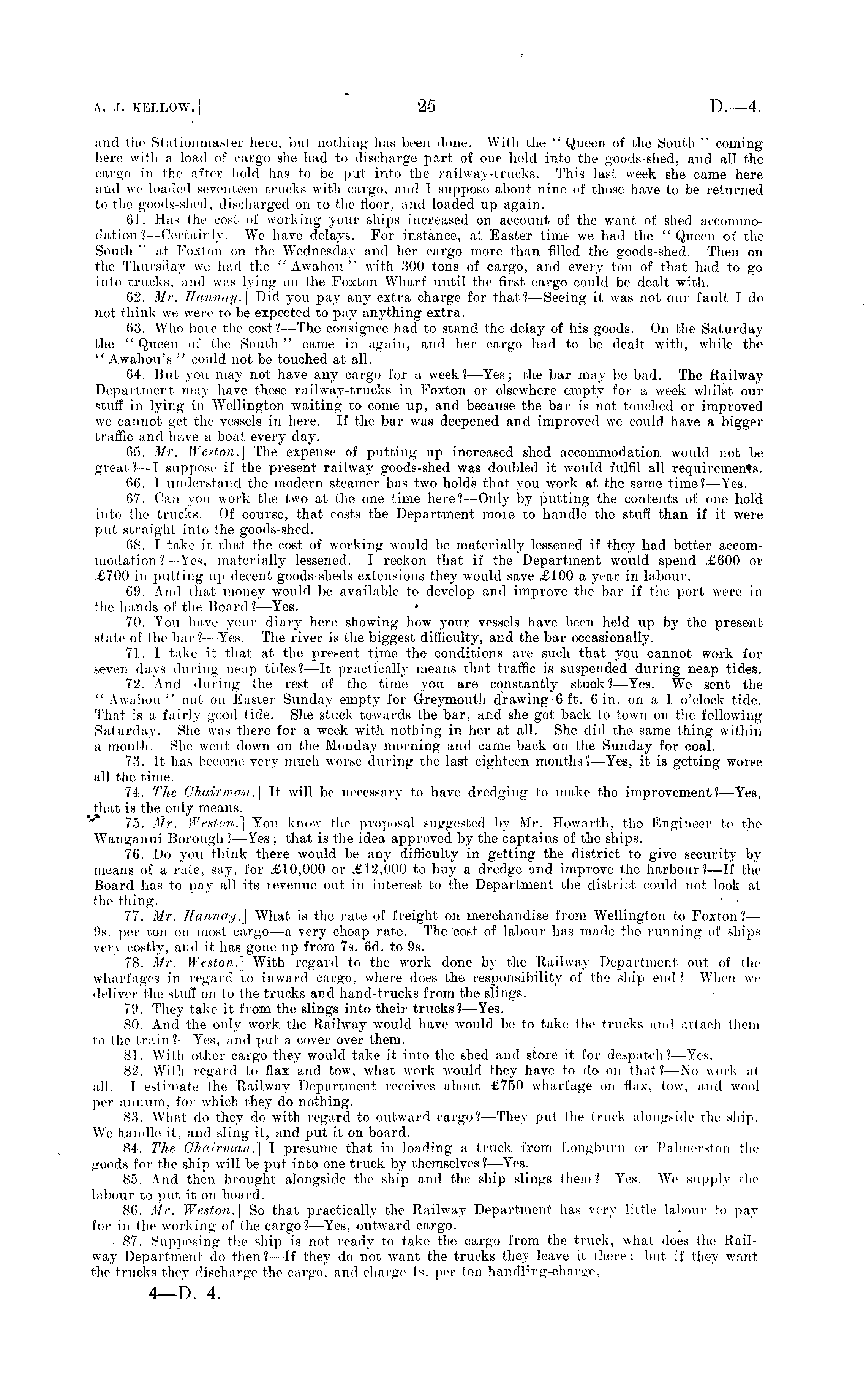 and the Stationmaster here, bui nothing has been (lone. With the " Queen of the South " coining here with a load of cargo she had to discharge part of one hold into the gbods-Shed, and all the cargo in the after hold has to be put into the railway-trucks. This last week she came here and we loaded seventeen trucks with cargo, and I suppose about nine of those have to be returned to the goods-shed, discharged on to the floor, and loaded up again. 01. Has the cost of working your ships increased on account of the want of shed accommodation? — Certainly. We have delays. For instance, at Easter time- we had the "Queen of the South " at Foxton on the Wednesday and her cargo more than filled the goods-shed. Then on the Thursday we had the " Awahou " with .'5OO tons of cargo, and every ton of that had to go into trucks, and was lying on the Foxton Wharf until the first cargo could be dealt with. 62. Mr. H ami ay.'] Did you pay any extra charge for that? —Seeing it was not our fault I do not think we were to be expected to pay anything extra. 63. Who bore the cost? —The consignee had to stand the delay of his goods. On the Saturday the " Queen of the South " came in again, and her cargo had to be dealt with, while the " Awahou's " could not be touched at all. 64. But you may not have any cargo for a week?— Yes; the bar may be had. The Railway Department may have these railway-trucks in Foxton or elsewhere empty for a week whilst our stuff in lying in Wellington waiting to come up, and because the bar is not touched or improved we cannot get the vessels in here. If the bar was deepened and improved we could have a bigger traffic and have a boat every day. DO. Mr. Westori.] The expense of putting up increased shed accommodation would not he great?—l suppose if the present railway goods-shed was doubled it would fulfil all requirements. 66. I understand the modern steamer has two holds that you work at the same time? —Yes. 67. Can you work the two at the one time here?— Only by putting the contents of one hold into the trucks. Of course, that costs the Department more to handle the stuff than if it were put straight into the goods-shed. 68. I take it that the cost of working would be materially lessened if they had better accommodation ? —Yes, materially lessened. I reckon that if the Department would spend ,£6OO or .£7OO in putting up decent goods-sheds extensions they would save ,£lOO a year in labour. 69. And that money would be available to develop and improve the bar if the port were in the hands of the Board ?—Yes. • 70. You have your diary here showing how your vessels have been held up by the present state of the bar The river is the biggest difficulty, and the bar occasionally. 71. 1 take it that at the present time the conditions are such that you cannot work for seven days during neap tides? —It practically means that traffic is suspended during neap tides. 72. And during the rest of the time you are constantly stuck?— Yes. We sent the "Awahou " out on Easter Sunday empty for Greymouth drawing 6 ft. 6 in. on a 1 o'clock tide. That is a fairly good tide. She stuck towards the bar, and she got back to town on the following Saturday. She was there for a week with nothing in her at all. She did the same thing within a month. She went down on the Monday morning and came back on the Sunday for coal. 73. It has become very much worse during the last eighteen months?— Yes, it is getting worse all the time. 74. The Chairman .] It will be necessary to have dredging to make the improvement?— Yes, that is the only means. 75. Mr. Weston,"] You know the proposal suggested by Mr. Howarth, the Engineer.to the Wanganui Borough I —Yes; that is the idea approved by the captains of the ships. 76. Do you think there would be any difficulty in getting the district to give security by means of a rate, say, for £10,000 or £12,000 to buy a dredge and improve the harbour?—lf the Board has to pay all its levenue out in interest to the Department the district could not look at the thing. 77. Mr. Hannay.] What is the rate of freight on merchandise from Wellington to Foxton?— 9s. per ton on most cargo—a very cheap rate. The cost of labour lias made the running of ships very costly, and it has gone up from 7s. 6d. to 9s. 78. Mr. Western.] With regard to the work done by the Railway Department out of the wharfages in regard to inward cargo, where does the responsibility of the ship end?— When we deliver the stuff on to the trucks and hand-trucks from the slings. 79. They take it from the slings into their trucks? —Yes. SO. And the only work the Railway would have would be to take the trucks ami attach them to the train? —Yes, and put a cover over them. 81. With other cargo they would take it into the shed and store it for despatch?— Yes. 82. With regard to flax and tow, what work would they have to do on that?—No work at all. I estimate the Railway Department receives about £750 wharfage on flax, tow, and wool per annum, for which they do nothing. 83. What do they do with regard to outward cargo?— They put (lie truck alongside the ship. Wo handle it, and sling it, and put it on board. 84. The Chairman.] I presume that in loading a truck from Longbmn or Palmerston (he goods for the ship will be put into one truck by themselves?— Yes. 85. And then brought alongside the ship and the ship slings (hem?— Yes. We supply the labour to put it on board. 86. Mr. Weston.] So that practically the Railway Department has very little labour to pay for in the working of the cargo?— Yes, outward cargo. 87. Supposing the ship is not ready to take the cargo from the truck, what does the Railway Department do then?—lf they do not want the trucks they leave it: there; but if (hey want the trucks they discharge the cargo, and charge Is. per ton handling-charge.
