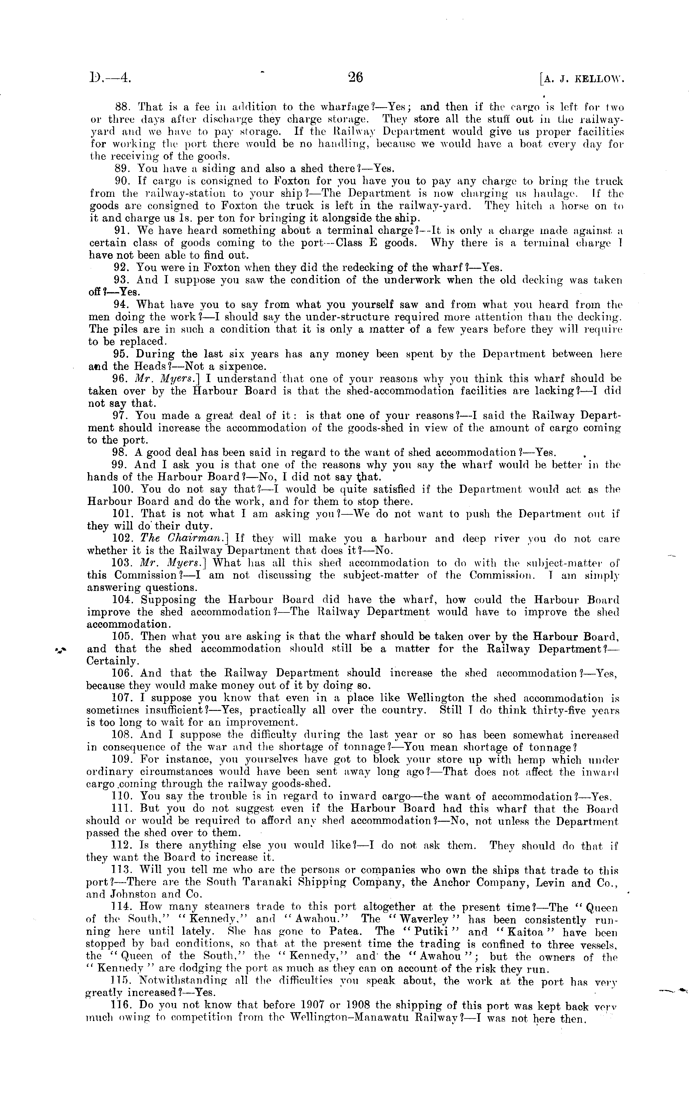 88. That is a fee in addition to the wharfage?— Yes; and then if the c.argo is loft for two or three days after discharge they charge storage. They store all the stuff out in the railwayyard and we have to pay storage. If the Railway Department would give us proper facilities for working the port there would be no handling, because we would have a boat every day for the receiving of the goods. 89. You have a siding and also a shed there ?—Yes. 90. If cargo is consigned to Foxton for you have you to pay any charge to bring the truck from the railway-station to your ship?— The Department is now charging us haulage. If the goods are consigned to Foxton the truck is left in the railway-yard. They hitch a horse on to it and charge us Is. per ton for bringing it alongside the ship. 91. We have heard something about a terminal charge?—lt is only a charge made against a certain class of goods coming to the port—Class E goods. Why there is a terminal charge 1 have not been able to find out. 92. You were in Foxton when they did the redecking of the wharf? —Yes. 93. And 1 suppose you saw the condition of the underwork when the old decking was taken off?— Yes. 94. What have you to say from what you yourself saw and from what you heard from the men doing the work?—l should say the under-structure required more attention than the decking. The piles are in such a condition that it is only a matter of a few years before they will require to be replaced. 95. During the last six years has any money been spent by the Department between here and the Heads?— Not a sixpence. 96. Mr. Myers.] I understand that one of your reasons why you think this wharf should be taken over by the Harbour Board is that the shed-accommodation facilities are lacking? —I did not say that. 97. You made a great deal of it : is that one of your reasons?—l said the Railway Department should increase the accommodation of the goods-shed in view of the amount of cargo coining to the port. 98. A good deal has been said in regard to the want of shed accommodation ? —Yes. 99. And I ask you is that one of the reasons why you say the wharf would be better in the hands of the Harbour Board ?—No, 1 did not say that. 100. You do not say that?—l would be quite satisfied if the Department would act as the Harbour Board and do the work, and for them to stop there. 101. That is not what I am asking you?—We do not want to push the Department out if they will do their duty. 102. The Chairman.] If they will make you a harbour and deep river you do not care whether it is the Railway Department that does it?— No. 103. Mr. Myers.] What has all this shed accommodation to do with the subject-matter of this Commission?—l am not discussing the subject-matter of the Commission. T am simply answering questions. 104. Supposing the Harbour Board did have the wharf, how could the Harbour Board improve the shed accommodation? —The Railway Department would have to improve the shed accommodation. 105. Then what you are asking is that the wharf should be taken over by the Harbour Board, and that the shed accommodation should still be a matter for the Railway Department?— Certainly. 106. And that the Railway Department should increase the shed accommodation ?—Yes, because they would make money out of it by doing so. 107. I suppose you know that even in a place like Wellington the shed accommodation is sometimes insufficient? —Yes, practically all over the country. Still T do think thirty-five years is too long to wait for an improvement. 108. And I suppose the difficulty during the last year or so has been somewhat increased in consequence of the war and the shortage of tonnage?— You mean shortage of tonnage? 109. For instance, you yourselves have got to block your store up with hemp which under ordinary circumstances would have been sent away long ago?— That does not affect the inward cargo .coming through the railway goods-shed. 110. You say the trouble is in regard to inward cargo—the want of accommodation?— Yes. 111. But you do not suggest even if the Harbour Board had this wharf that the Board should or would be required to afford any shed accommodation? —No, not unless the Department passed the shed over to them. 112. Is there anything else you would like? —I do not ask thorn. They should do that if they want the Board to increase it. 113. Will you tell me who are the persons or companies who own the ships that trade to this port? —There are the South Taranaki Shipping Company, the Anchor Company, Levin and Co., and Johnston and Co. 114. How many steamers trade to this port altogether at the present time? —The "Queen of the South," "Kennedy," and "Awahou." The " Waverley " has been consistently running here until lately. She has gone to Patea. The " Putiki " and " Kaitoa " have been stopped by bad conditions, so that at the present time the trading is confined to three vessels, the "Queen of the South," the "Kennedy," and' the "Awahou"; but the owners of the " Kennedy " are dodging the port as much as they can on account of the risk they run. 115. Notwithstanding all the difficulties you speak about, the work at the port has very greatly increased ?—Yes. 116. Do you not know that before 1907 or 1908 the shipping of this port was kept back very much owing to competition from the Wellington-Manawatu Railway?—l was not here then.
