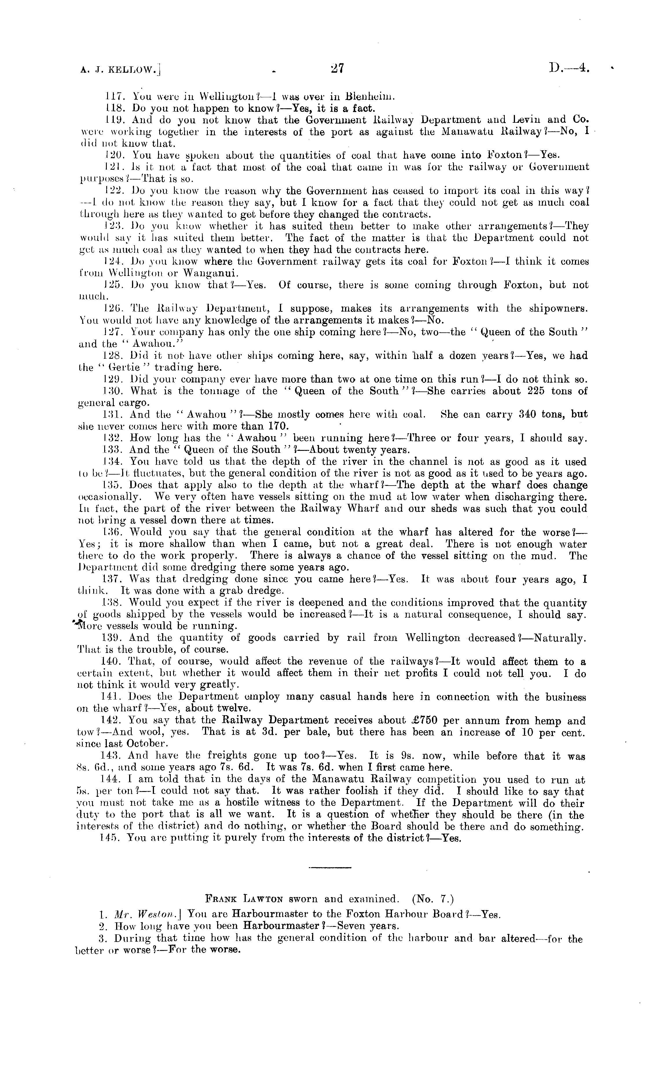 Frank Lawton sworn and examined. (No. 7.) 1. Mr. Wexlon.\ You arc Harbourmaster to the Foxton Harbour Board?— Yes. 2. How long have you been Harbourmaster?— Seven years. 3. During that time how lias the general condition of the harbour and bar altered—-for the Letter or worse I —For the worse.