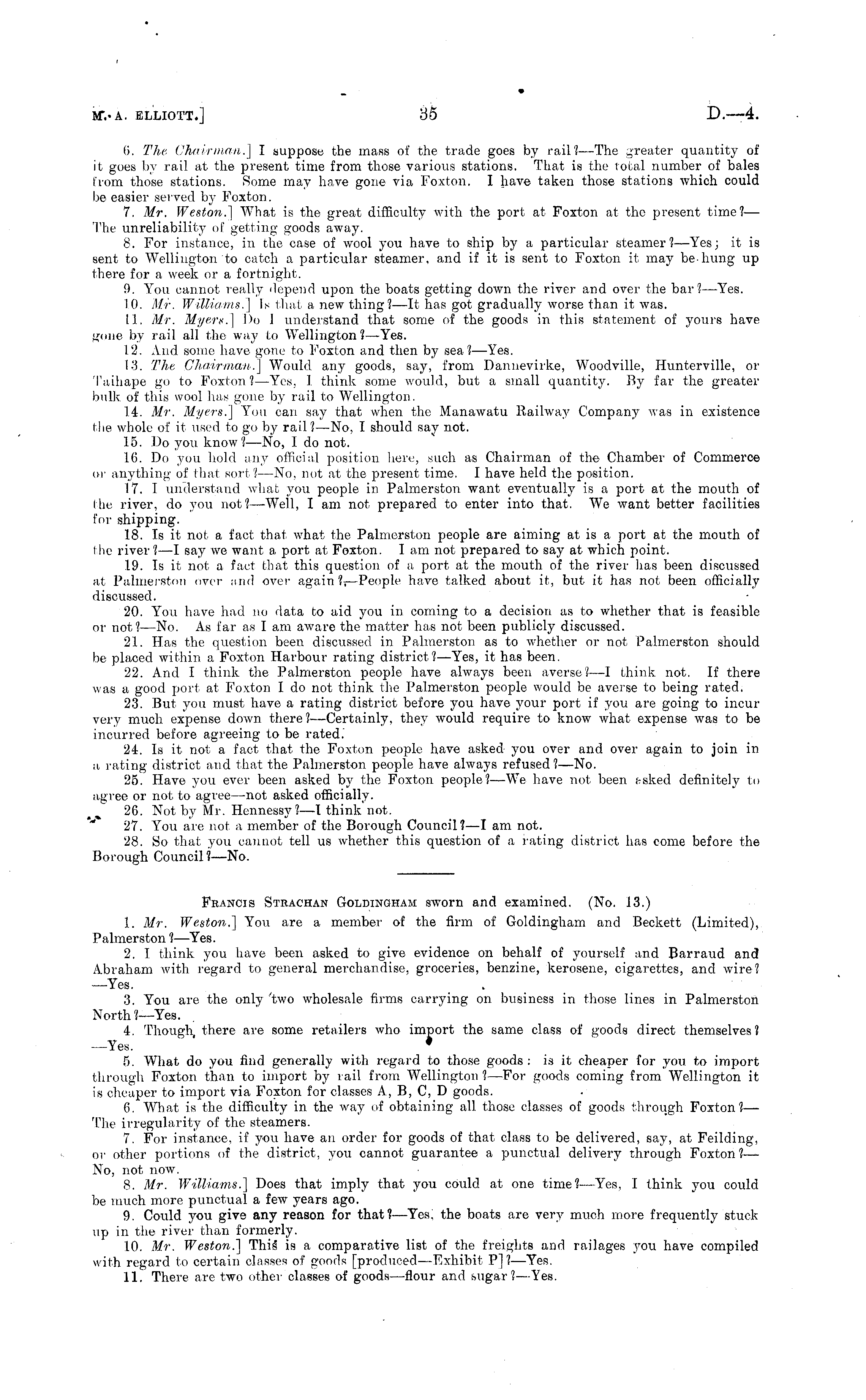 Francis Strachan Goldingham sworn and examined. (No. 13.) 1. Mr. Weston.] You are a member of the firm of Goldingham and Beckett (Limited), Palmerston I —Yes. 2. I think you have been asked to give evidence on behalf of yourself and Barraud and Abraham with regard to general merchandise, groceries, benzine, kerosene, cigarettes, and wire? —Yes. 3. You are the only 'two wholesale firms carrying on business in those lines in Palmerston North ?—Yes. 4 Though there are some retailers who import the same class of goods direct themselves? —Yes. * 5. AVhat do you find generally with regard to those goods : is it cheaper for you to import through Foxton than to import by rail from Wellington ?—For goods coming from Wellington it is cheaper to import via Foxton for classes A, B, C, D goods. fi. What is the difficulty in the way of obtaining all those classes of goods through Foxton?— The irregularity of the steamers. 7. For instance, if you have an order for goods of that class to be delivered, say, at Feilding, or other portions of the district, you cannot guarantee a punctual delivery through Foxton?— No, not now. 8. Mr. Williams. ] Does that imply that you could at one time?— Yes, I think you could be much more punctual a few years ago. 9. Could you give any reason for that?— Yes, the boats are very much more frequently stuck up in the river than formerly. 10. Mr. Weston.] This , is a comparative list of the freights and railages you have compiled with regard to certain classes of goods [produced—Exhibit P]? —Yes. 11. There are two other classes of goods —flour and sugar? —Yes.