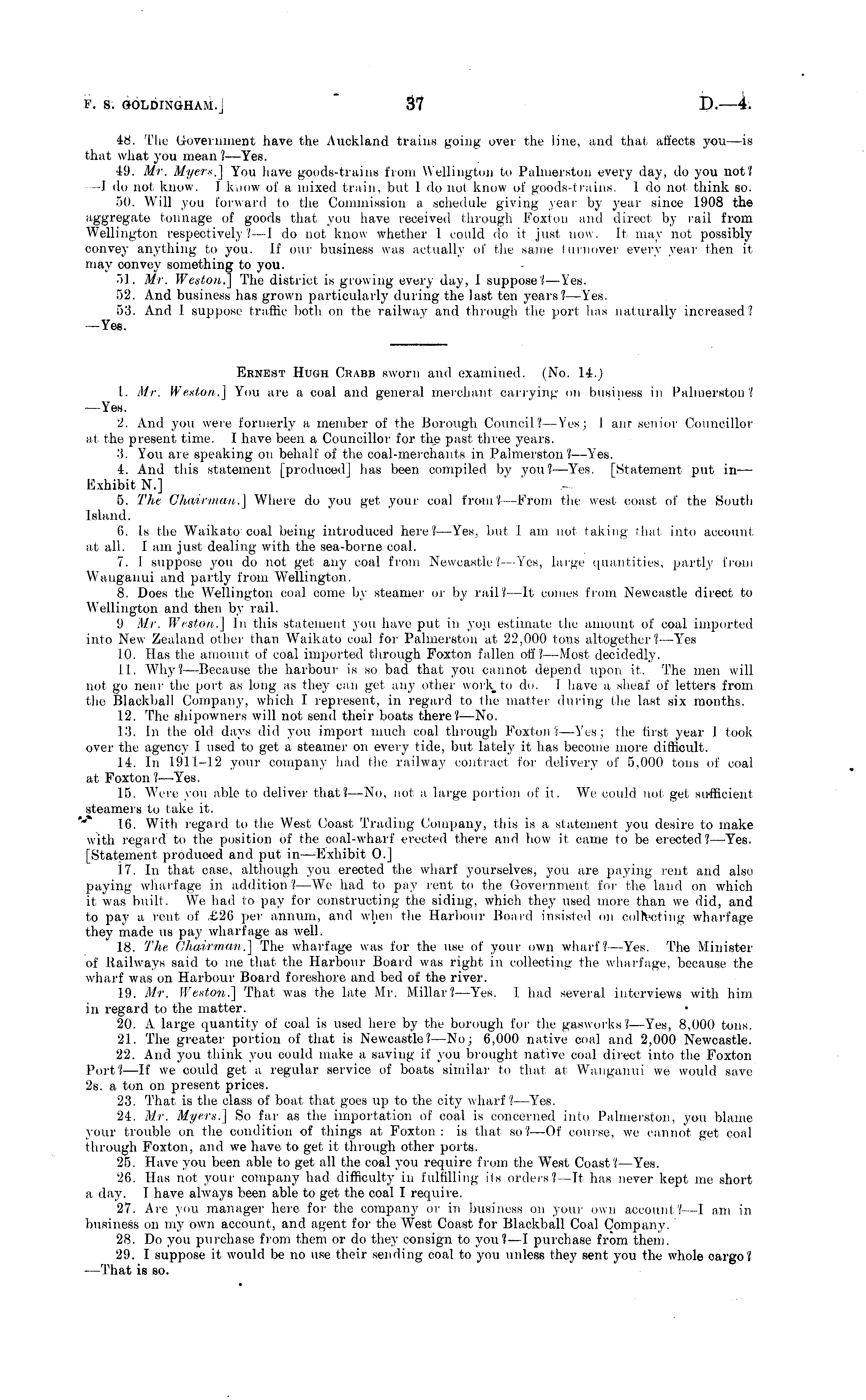 Ernest Hugh Crabb sworn and examined. (No. 14.) 1. Mr. Wen ton.] You are a coal and general merchant carrying on business in Palmerston? —Yes. 2. And you were formerly a member of the Borough Council? —Yes; I airr senior Councillor at the present time. I have been a Councillor for the past three years. •'). You are speaking on behalf of the coal-merchants in Palmerston ?—Yes. 4. And this statement [produced] lias been compiled by you?— Yes. [Statement put in— Exhibit N.] 5. The Chair/nan. \ Where do you get your coal from? —From the west coast of the South Island. f>. Is the Waikato coal being introduced here?— Yes, but 1 am mil taking that into account at all. lam just dealing with the sea-borne coal. 7. I suppose you do not get any coal from Newcastle ?—Yes, large quantities, partly from Wauganui and partly from Wellington. 8. Does the Wellington coal come by steamer or by rail? —It conies from Newcastle direct to Wellington and then by rail. 9 Mr. Wi-ston.] In this statement you have put in you estimate the amount of coal imported into New Zealand other than Waikato coal for Palmerston at 22,000 tons altogether?— Yes 10. Has the amount of coal imported through Foxton fallen off ?—Most decidedly. 11. Why?— Because the harbour is so bad that you cannot depend upon it. The men will not go near the port as long as they can get any other do. I have a sheaf of letters from the Blackball Company, which I represent, in regard to the matter during bhe last six months. 12. The shipowners will not send their boats there? —No. ].'!. In the old days did you import much coal through Foxton ';— Yes; the first year I took over the agency I used to get a steamer on every tide, but lately it has become more difficult. 14. In 1911—12 your company had the railway contract for delivery of 5,000 tons of coal at Foxton ?—Yes. 15. Were you able to deliver that? —No, not a large portion of it. We could not get sufficient steamers to take it. 16. With regard to the West Coast Trading Company, this is a statement you desire to make with regard to the position of the coal-wharf erected there and how it came to be ereoted? —Yes. [Statement produced and put in—Exhibit O.] i-7. In that case, although you erected the wharf yourselves, you are paying rent and also paying wharfage in addition ? —We had to pay rent to the Government for the bind on which it was built. We had to pay for constructing the siding, which they used more than we did, and to pay a rent of £20 per annum, and when the Harbour Board insisted on oollteoting wharfage they made us pay wharfage as well. 18. The, Chairman.] The wharfage was for the use of your own wharf? —Yes. The Minister of llailways said to me that the Harbour Board was right in collect]ng the wharfage, because the wharf was on Harbour Board foreshore and bed of the river. 19. Mr. W'eston.] That was the late Mr. Millar?—Yes. 1 had several interviews with him in regard to the matter. 20. A large quantity of coal is used here by the borough for the gasworks?— Yes, 8,000 tons. 21. The greater portion of that is Newcastle? —No; 6,000 native coal and 2,000 Newcastle. 22. And you think you could make a saving if you brought native coal direct into the Foxton Port?—lf we could get a regular service of boats similar to that at Wanganui we would save 2s. a ton on present prices. 23. That is the class of boat that goes up to the city wharf?— Yes. 24. Mr. Myers.] So far as the importation of coal is concerned into Palmerston, you blame your trouble on the condition of things at Foxton: is that so?—Of course, we cannot get coal through Foxton, and we have to get it through other ports. 25. Have you been able to get all the coal you require from the West Coast?— Yes. 26. Has not your company had difficulty in fulfilling its orders?—lt has never kept me short a day. I have always been able to get the coal I require. 27. Are you manager here for the company or in business on your own I am in business on my own account, and agent for the West Coast for Blackball Coal Company. 28. Do you purchase from them or do they consign to you?-—I purchase from them. 29. I suppose it would be no use their sending coal to you unless they sent you the whole cargo? ■ —That is so.