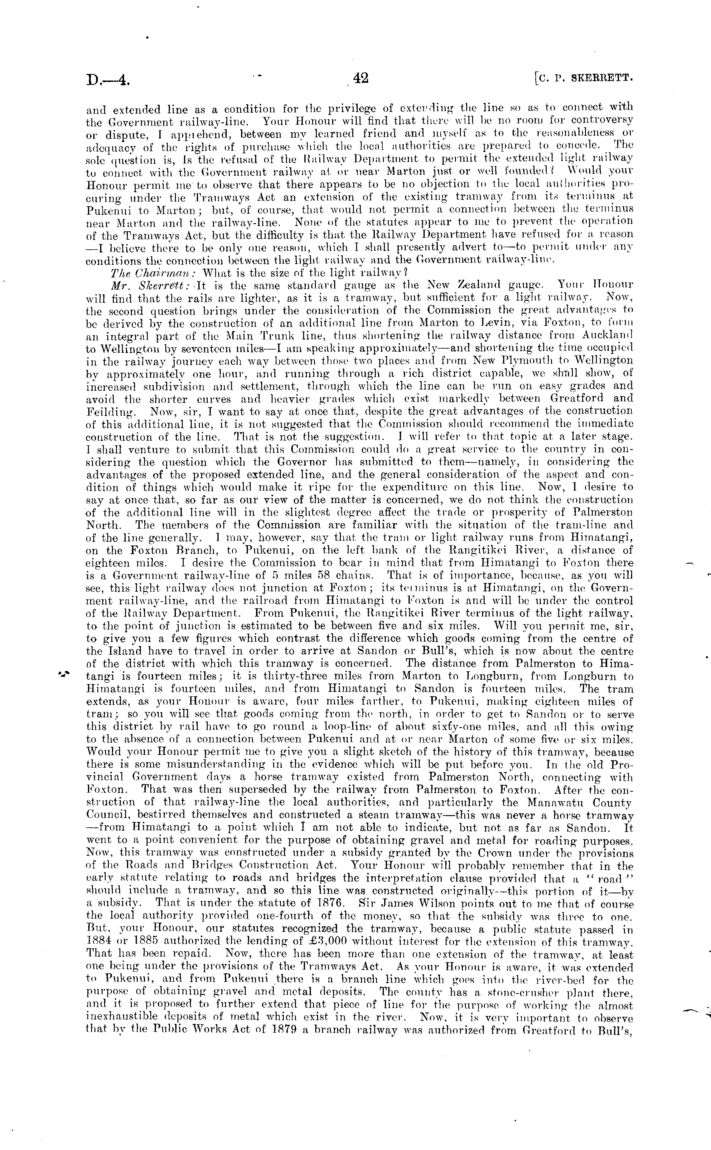 and extended line as a condition for the privilege of exterding the line so as to connect with the Government railway-line. Jour Honour will find that there will be no room for controversy or dispute, I appiehcnd, between my learned friend and myself as to the reasonableness or adequacy of the rights of purchase which the local authorities are prepared to concede. The sole question is, Is the refusal of the Railway Department to permit the extended lighi railway to connect with the Government railway at or near Marton just or well rounded? Would your Honour permit me'to observe that there appeal's to be no objection to the local authorities procuring under the Tramways Act an extension of the existing tramway from its terminus at Pukenui to Marton; but, of course, that would not permit a connection between the terminus near Marton and the railway-line. None of the statutes appear to me to prevent the operation of the Tramways Act, but the difficulty is that the Railway Department have refused for a reason —I believe there to be only one reason, which 1 shall presently advert to —to permit under any conditions the connection between the light railway and the Government railway-line. The Chairman: What is the size of the light railway? Mr, SkerreU: It is the same standard gauge as the New Zealand gauge. Your Honour will find that the rails are lighter, as it is a tramway, but sufficient for , a light railway. Now, the second question brings under the consideration of the Commission the great advantages to be derived by the construction of an additional line from Marton to Levin, via Foxton, to form an integral part of the Main Trunk line, thus shortening the railway distance from Auckland to Wellington by seventeen miles—l am speaking approximately—and shortening the time occupied in the railway journey each way between those two places and from New Plymouth to Wellington by approximately one hour, and running through a rich district capable, we slnill show, of increased subdivision and settlement, through which the line can be run on easy grades and avoid the shorter curves and heavier grades which exist markedly between Greatford and Feilding. Now, sir, I want to say at once that, despite the great advantages of the construction of this additional line, it is not suggested that the Commission should recommend the immediate construction of the line. That is not the suggestion. I will refer to that topic at a later stage. I shall venture to submit that this Commission could do a great service to the country in considering the question which the Governor has submitted to them —namely, in considering the advantages of the proposed extended line, and the general consideration of the aspect and condition of things which would make it ripe for the expenditure on this line. Now, I desire to say at once that, so far as our view of the matter is concerned, we do not think the construction of the additional line will in the slightest degree affect the trade or prosperity of Palmerston North. The members of the Commission are familiar with the situation of the tram-line and of the line generally. I may, however, say that, the tram or light railway runs from Himatangi, on the Foxton Branch, to Pukenui, on the left bank of the Rangitikei River, a distance of eighteen miles. I desire the Commission to bear in mind that from Himatangi to Foxton there is a Government railway-line of 5 miles 58 chains. That is of importance, because, as you will see, this light railway does not junction at Foxton; its terminus is at Himatangi, on the Government railway-line, and the railroad from Himatangi to Foxton is and will be under the control of the Railway Department. From Pukenui, the Rangitikei River terminus of the light railway, to the point of junction is estimated to be between five and six miles. Will you permit me, sir, to give you a few figures which contrast the difference which goods coming from the centre of the Island have to travel in order to arrive at Sandon or Bull's, which is now about the centre of the district with which this tramway is concerned. The distance from Palmerston to Hima- '-**■ tangi is fourteen miles; it is thirty-three miles from Marton to Longburn, from Longburn to Himatangi is fourteen miles, and from Himatangi to Sandon is fourteen miles. The tram extends, as your Honour is aware, four miles farther, to Pukenui, making eighteen miles of tram; so you will see that goods coming from the north, in order to get to Sandon or to serve this district by rail have to go round a loop-line of about sixty-one miles, and all this owing to the absence of a connection between Pukenui and at or near Marton of some five or six miles. Would your Honour permit me to give you a slight sketch of the history of this tramway, because there is some misunderstanding in the evidence which will be put before you. Tn the old Provincial Government days a horse tramway existed from Palmerston North, connecting with Foxton. That was then superseded by the railway from Palmerston to Foxton. After the construction of that railway-line the local authorities, and particularly the Manawatu County Council, bestin-ed themselves and constructed a steam tramway —this was never a horse tramway —from Himatangi to a point which I am not able to indicate, but not as far as Sandon. ft went to a point convenient for the purpose of obtaining gravel and metal for roading purposes. Now, this tramway was constructed under a subsidy granted by the Crown under the provisions of the Roads and Bridges Construction Act. Your Honour will probably remember that in the early statute relating to roads and bridges the interpretation clause provided thai a " road " should include a tramway, and so this line was constructed originally—this portion of it by a subsidy. That is under the statute of 1876. Sir James Wilson points out to me that of course the local authority provided one-fourth of the money, so that the subsid