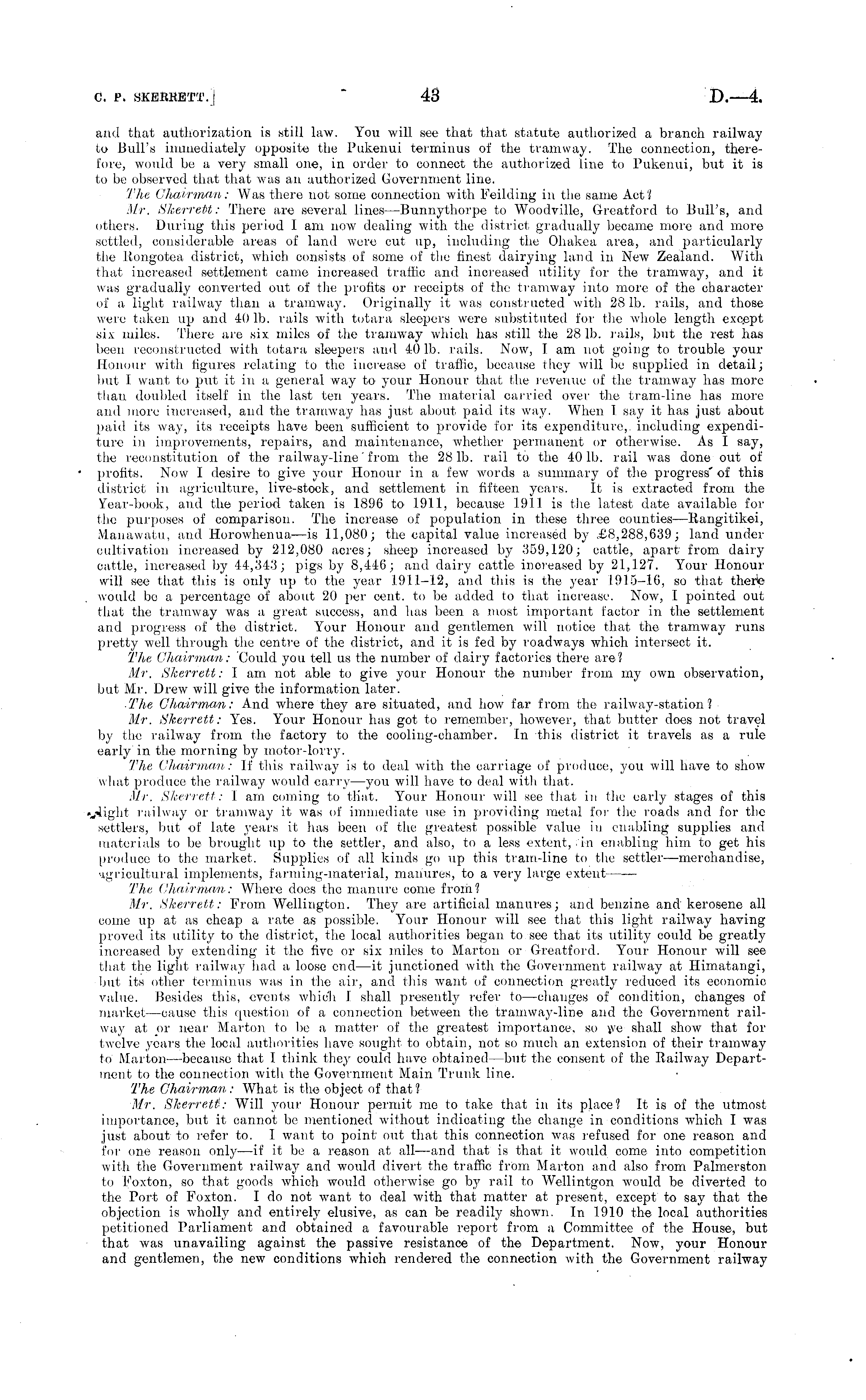 and that authorization is still law. You will see that that statute authorized a branch railway to Bull's immediately opposite the Pukenui terminus of the tramway. The connection, therefore, would bo a very small one, in order to connect the authorized line to Pukenui, but it is to be observed that that was an authorized Government line. The Chairman: Was there not some connection with Feilding in the same Act? Mr. Skerrett: There are several lines —Bunnythorpe to Woodville, Greatford to Hull's, and others. During this period lam now dealing with the district gradually became more and more settled, considerable areas of land were cut up, including the Ohakea area, and particularly the Rongotea district, which consists of some of the finest dairying land in New Zealand. With that increased settlement came increased traffic and increased utility for the tramway, and it was gradually converted out of the profits or receipts of the tramway into more of the character of a light railway than a tramway. Originally it was constructed with 28 lb. rails, and those were taken up and 40 lb. rails with totara sleepers were substituted for the whole length except six miles. There are six miles of the tramway which has still the 28 lb. rails, but the rest has been reconstructed with totara sleepers and 401b. rails. Now, 1 am not going to trouble your Honour with figures relating to the increase of traffics, because they will be supplied in detail; but T want to- put it in a general way to your Honour that the revenue of the tramway has more than doubled itself in the last ten years. The material carried over the tram-line has more and more increased, and the tramway has just about paid its way. When 1 say it has just about paid its way, its i/eceipts have been sufficient to provide for its expenditure,, including expenditure in improvements, repairs, and maintenance, whether permanent or otherwise. As I say, the reoonstitution of the railway-line' from the 28 Ib. rail to the 401b. rail was done out of profits. Now I desire to give your Honour in a few words a summary of the progress'of this district in agriculture, live-stock, and settlement in fifteen years. It is extracted from the Year-book, and the period taken is 1896 to 1911, because 1911 is the latest date available for the purposes of comparison. The increase of population in these three counties— Rangitikei, Manawatu, and Horowhenua —is 11,080; the capital value increased by .£8,288,639; land under cultivation increased by 212,080 acres; sheep increased by .'559,120; cattle, apart from dairy cattle, increased by 44,343; pigs by 8,446; and dairy cattle increased by 21,127. Your Honour will see that this is only up to the year 1911-12, and this is the year 1915-16, so that therte would bo a percentage of about 20 per cent, to be added to that increase. Now, I pointed out that the tramway was a great success, and has been a most important factor in the settlement and progress of the district. Your Honour and gentlemen will notice that the tramway runs pretty well through the centre of the district, and it is fed by roadways which intersect it. The Chairman: Could you tell us the number of dairy factories there are? Mr. Skerrett: 1 am not able to give your Honour the number from my own observation, but Mr. Drew will give the information later. The Chairman: And where they are situated, and how far from the railway-station 1 Mr. Skerrett: Yes. Your Honour has got to remember, however, that butter does not travel by the railway from the factory to the cooling-chamber. In this district it travels as a rule early in the morning by motor-lorry. The Chairman: If this railway is to deal with the carriage of produce, you will have to show what produce the railway would carry —you will have to deal with that. Mr. Skerrett: I am coming to that. Your Honour will see that in the early stages of this •jiight railway or tramway it was of immediate use in providing metal for the roads and for the settlers, but of late years it has been of the greatest possible value in enabling supplies and materials to be brought up to the settler, and also, to a less extent, in enabling him to get his produce to the market. Supplies of all kinds go up this train-line to the settler—merchandise, agricultural implements, farming-material, manures, to a very large extent — The Chairman : Where does tho manure come from 1 Mr. Skerrett: From Wellington. They are artificial manures; and benzine and kerosene all come up at as cheap a rate as possible. Your Honour will see that this light railway having proved its utility to the district, the local authorities began to see that its utility could be greatly increased by extending it tho five or six miles to Marton or Greatford. Your Honour will see that the light railway had a loose end —it junctioned with the Government railway at Himatangi, but its other terminus was in the air, and this want of connection greatly reduced its economic value. Besides this, events which I shall presently refer to —changes of condition, changes of market —cause this question of a connection between the tramway-line and the Government railway at or near Marton to be a matter of the greatest importance, so we shall show that for twelve years the local authorities have sought to obtain, not so much an extension of their tramway to Marton—because that I think they could have obtained —but the consent of the Ilailway Department to the connection witli the Government Main Trunk line. The Chairman : What is the object of that ? Mr. Skerrett: Will your Houour permit mo to take that in its place? It is of the utmost importance, but it cannot be mentioned without indicating the change in conditions which I was just about to refer to. 1 want to point out that this connection was refused for one reason and for one reason only —if it be a reason at all—and that is that it would come into competition with the Government railway and would 