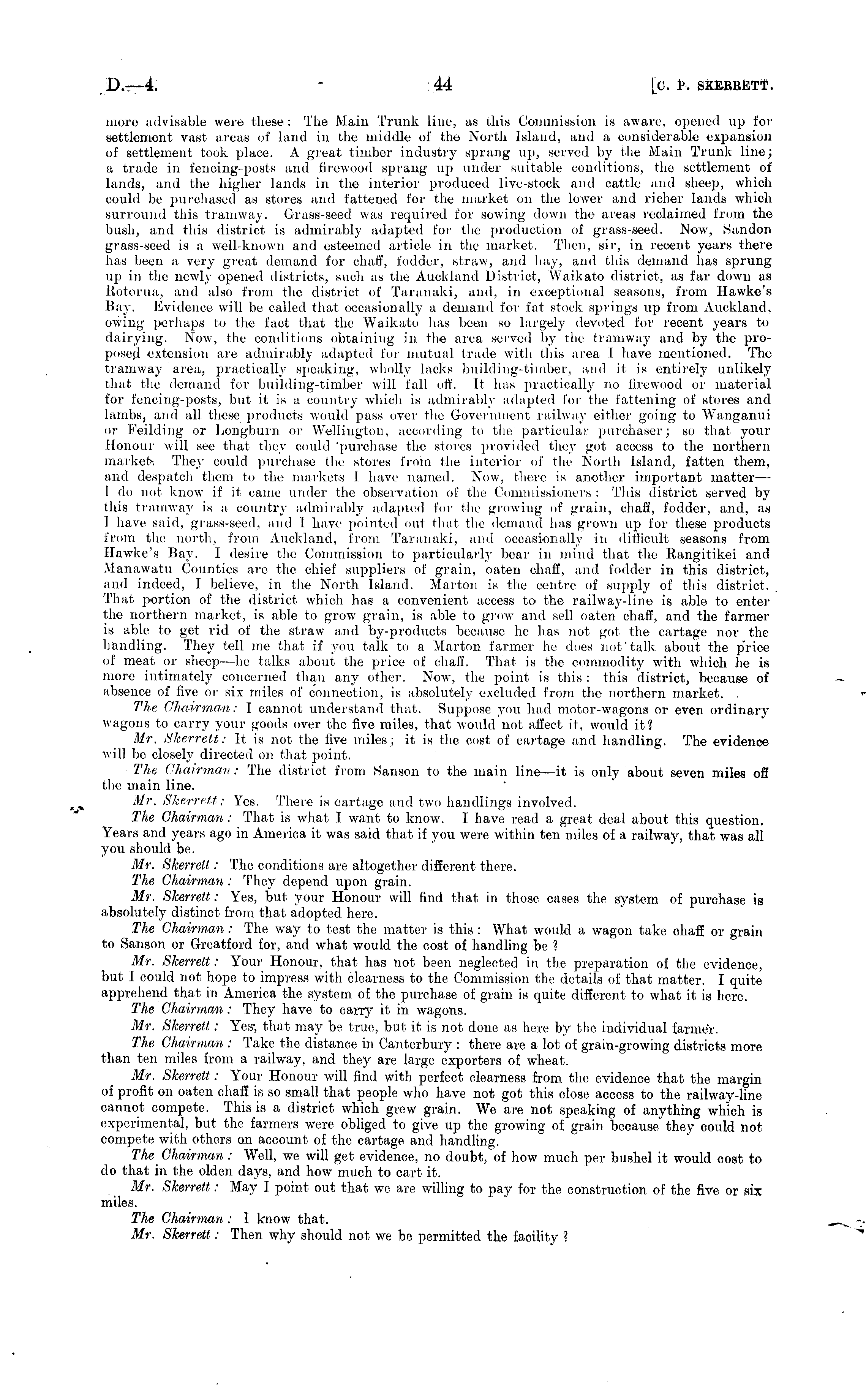 more advisable were these : The Main Trunk line, as this Commission is aware, opened up for settlement vast areas of land in the middle of the .North Island, and a considerable expansion of settlement took place. A great timber industry sprang up, served by the Main Trunk line; a trade in fencing-posts and firewood sprang up under suitable conditions, the settlement of lands, and the higher lands in the interior produced live-stock and cattle and sheep, which could be purchased as stores and fattened for the market on the lower and richer lands which surround this tramway. Grass-seed was required for sowing down the areas reclaimed from the bush, and this district is admirably adapted for the production of grass-seed. Now, Sandon grass-seed is a well-known and esteemed article in the market. Then, sir, in recent years there has been a very great demand for chaff, fodder, straw, and hay, and this demand has sprung up in the newly opened districts, such as the Auckland District, Waikato district, as far down as Botorua, and also from the district of Taranaki, and, in exceptional seasons, from Hawke's Bay. Evidence will be called that occasionally a demand for fat stock springs up from Auckland, owing perhaps to the fact that the Waikato has been so largely devoted for recent years to dairying. Now, the conditions obtaining in the area served by the tramway and by the proposed extension are admirably adapted for mutual trade with this area I have mentioned. Tile tramway area, practically speaking, wholly lacks building-timber, and it is entirely unlikely that the demand for building-timber will fall off. It has practically no firewood or material for fencing-posts, but it is a country which is admirably adapted for the fattening of stores and lambs, and all these products would pass over the Government railway either going to Wanganui or Feilding or Longburn or Wellington, according to the particular purchaser; so that your Honour will see that they could 'purchase the stores provided they got access to the northern market-. They could purchase the stores from the interior of the North Island, fatten them, and despatch them to the markets 1 have named. Now, there is another important matter — I do not know if it came under the observation of the Commissioners : This district served by this tramway is a country admirably adapted fm- the growing of grain, chaff, fodder, and, as 1 have said, grass-seed, and I have pointed out that the demand has grown up for these prodticts from the north, from Auckland, from Taranaki, and occasionally in difficult seasons from Hawke's Bay. I desire the Commission to particularly bear in mind that the Bangitikei and Manawatu Counties are the chief suppliers of grain, oaten chaff, and fodder in this district, and indeed, I believe, in the North Island. Marton is the centre of supply of this district. That portion of the district which has a convenient access to the railway-line is able to enter the northern market, is able to grow grain, is able to grow and sell oaten chaff, and the farmer is able to get rid of the straw and by-products because he has not got the cartage nor the handling. They tell me that if you talk to a Marton farmer he does not'talk about the p'rice of meat or sheep—he talks about the price of chaff. That is the commodity with which he is more intimately concerned than any other. Now, the point is this : this district, because of absence of five or six miles of connection, is absolutely excluded from the northern market. The Chairman: I cannot understand that. Suppose you had motor-wagons or even ordinary wagons to carry your goods over the five miles, that would not affect it, would it? Mr. Skerrett: It is not the five miles; it is the cost of cartage and handling. The evidence will be closely directed on that point. The Chairman .- The district from Sanson to the main line —it is only about seven miles off the main line. Mr. Skerrett: Yes. There is cartage and two handlings involved. The Chairman,: That is what I want to know. I have read a great deal about this question. Years and years ago in America it was said that if you were within ten miles of a railway, that was all you should be. Mr. Skerrett: The conditions are altogether different there. The Chairman : They depend upon grain. Mr. Skerrett: Yes, but your Honour will find that in those cases the system of purchase is absolutely distinct from that adopted here. The Chairman : The way to test the matter is this : What would a wagon take chaff or grain to Sanson or Greatford for, and what would the cost of handling be ? Mr. Skerrett: Your Honour, that has not been neglected in the preparation of the evidence, but I could not hope to impress with clearness to the Commission the details of that matter. I quite apprehend that in America the system of the purchase of grain is quite different to what it is here. The Chairman: They have to carry it in wagons. Mr. Skerrett: Yes- that may be true, but it is not done as here by the individual fanner. The Chairman : Take the distance in Canterbury : there are a lot of grain-growing districts more than ten miles from a railway, and they are large exporters of wheat. Mr. Skerrett: Your Honour will find with perfect clearness from, the evidence that the margin of profit on oaten chaff is so small that people who have not got this close access to the railway-line cannot compete. This is a district which grew grain. We are not speaking of anything which is experimental, but the farmers were obliged to give up the growing of grain because they could not compete with others on aocount of the cartage and handling. The _ Chairman : Well, we will get evidence, no doubt, of how much per bushel it would cost to do that in the olden days, and how much to cart it. Mr. Skerrett: May I point out that we are willing to pay for the construction of the five or six miles. The Chairman : I know that. Mr. Skerrett: Then why should not we he permitted the fac