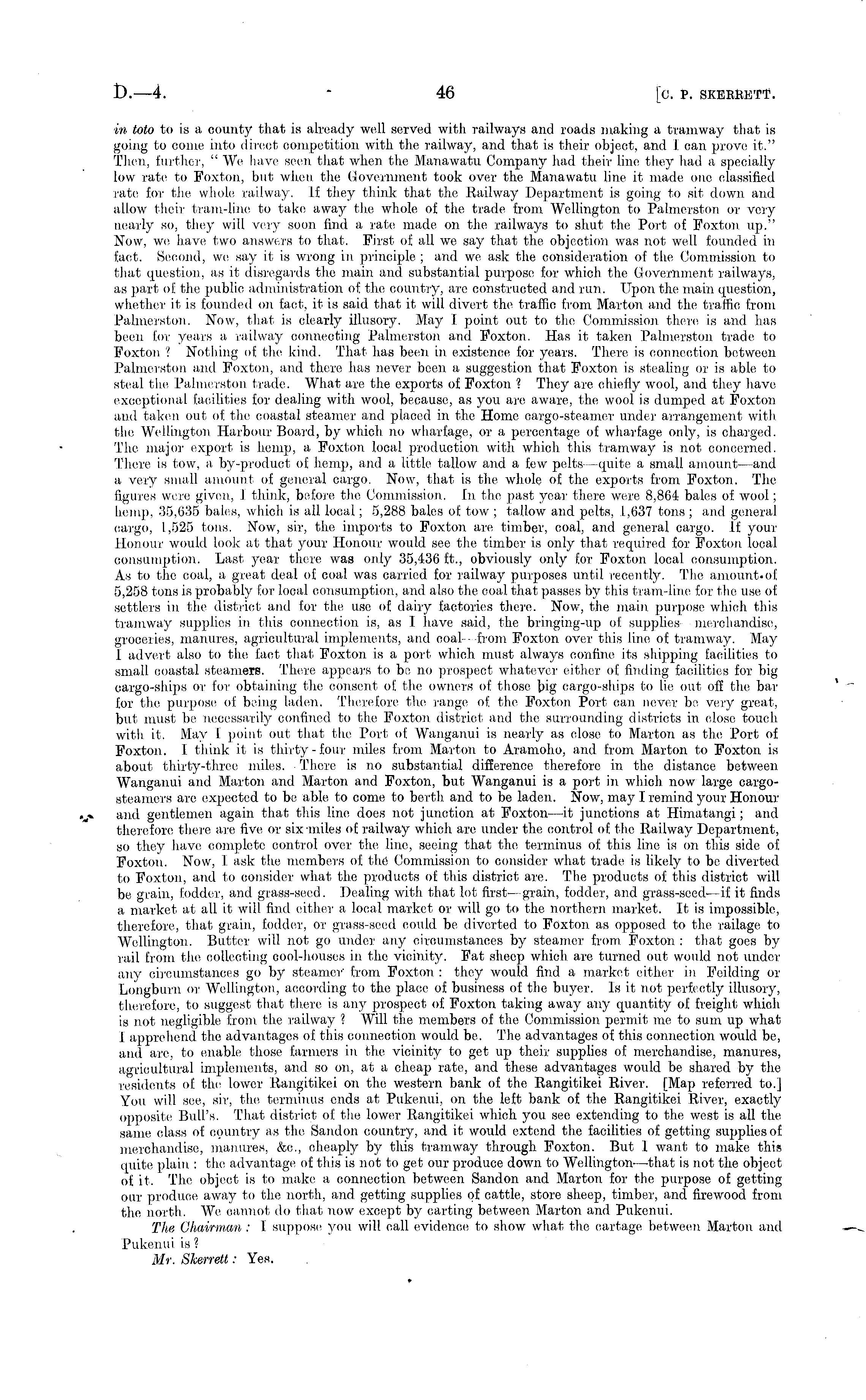 in toto to is a county that is already well served with railways and roads making a tramway that is going to come into direct competition with the railway, and that is their object, and I can prove it." Then, further, " We have seen that when the Manawatu Company had their line they had a specially low rate to Foxton, but when the Government took over the Manawatu line it made one classified rate for the whole railway. If they think that the Railway Department is going to sit down and allow their tram-line to take away the whole of the trade from Wellington to Palmcrston or very nearly so, they will very soon find a rate made on the railways to shut the Port of Foxton up.". Now, wo have two answers to that. First of all we say that the objection was not well founded in fact. Second, we say it is wrong in principle ; and we. ask the consideration of the Commission to that question, as it disregards the main and substantial purpose for which the Government railways, as part of the public administration of the country, are constructed and run. Upon the main question, whether it is founded on fact, it is said that it will divert the traffic from Marton and the traffic from Palmerston. Now, that is clearly illusory. May I point out to the Commission, there is and has been for years a railway connecting Palmerston and Foxton. Has it taken Palmerston trade to Foxton ? Nothing of the kind. That has been in existence for years. There is connection between Palmerston and Foxton, and there has never been a suggestion that Foxton is stealing or is able to steal the, Palmerston trade. What are the exports of Foxton ? They are chiefly wool, and they have exceptional facilities for dealing with wool, because, as you are aware, the wool is dumped at Foxton and taken out of the coastal steamer and placed in the Home cargo-steamer under arrangement with the Wellington Harbour Board, by which, no wharfage, or a percentage of wharfage only, is charged. The major export is hemp, a Foxton local production with which, this tramway is not concerned. There is tow, a by-product of hemp, and a little tallow and a few pelts —quite a small amount —and a very small amount of general cargo. Now, that is the whole of the exports from Foxton. The figures were given, 1 think, before the Commission. In. the past year there were 8,864 bales of wool; hemp, 35,635 bales, which is all local; 5,288 bales of tow ; tallow and pelts, .1,637 tons ; and general cargo, 1,525 tons. Now, sir, the imports to Foxton are timber, coal, and general cargo. If your Honour would look at that your Honour would see the timber is only that required for Foxton. local consumption. Last year there was only 35,436 ft., obviously only for Foxton local consumption. As to the coal, a great deal of coal was carried for railway purposes until recently. The amount.of 5,258 tons is probably for local consumption, and also the coal that passes by this tram-line Cor the use of settlers in the district and for the use of dairy factories there. Now, the main purpose which this tramway supplies in this connection is, as I have said, the bringing-up of supplies merchandise, groceries, manures, agricultural implements, and coal- from Foxton over this line of tramway. May I advert also to the fact that Foxton is a port which must always confine its shipping facilities to small coastal steamers. There appeal's to be no prospect whatever either of finding facilities for big cargo-ships or for obtaining the consent of the owners of those big cargo-ships to lie out off the bar for the purpose of being laden. Therefore the range of the Foxton Port can never bo very great, but must be necessarily confined to the Foxton district and the surrounding districts in close touch with it. May I point out that the Port of Wanganui is nearly as close to Marton as the Port of Foxton. I think it is thirty-four miles from Marton to Aramoho, and from Marton to Foxton is about thirty-three miles. There is no substantial difference therefore in the distance between Wanganui and Marton and Marton and Foxton, but Wanganui is a port in which now large cargosteamers are expected to be able to come to berth, and to be laden. Now, may I remind your Honour iy» and gentlemen again that this line does not junction at Foxton —it junctions at Himatangi; and therefore there are five or six -miles of railway which are under the control of the Railway Department, so they have complete control over the line, seeing that the terminus of this line is on this side of Foxton. Now, I ask the members of the" Commission to consider what trade is likely to be diverted to Foxton, and to consider what the products of this district are. The products of this district will be grain, fodder, and grass-seed. Dealing with that lot first'—grain, fodder, and grass-seed—if it finds a market at all it will find either a local market or will go to the northern market. It is impossible, therefore, that grain, fodder, or grass-seed could, be diverted to Foxton as opposed to the railage to Wellington. Butter will not go under any circumstances by steamer from Foxton : that goes by rail from the collecting cool-houses in the vicinity. Fat sheep which are turned out would not under any circumstances go by steamer' from Foxton : they would find a market either in Feilding or Longburn or Wellington, according to the place of business of the buyer. Is it not perfectly illusory, therefore, to suggest that there is any prospect of Foxton taking away any quantity of freight which is not negligible from the railway ? Will the members of the Commission permit me to sum up what I apprehend the advantages of this connection would be. The advantages of this connection would be, and arc, to enable those farmers in the vicinity to get up their supplies of merchandise, manures, agricultural implements, and so on, at a cheap rate, and these advantages would be shared by the residents of the lower Rangitikei on the western bank of
