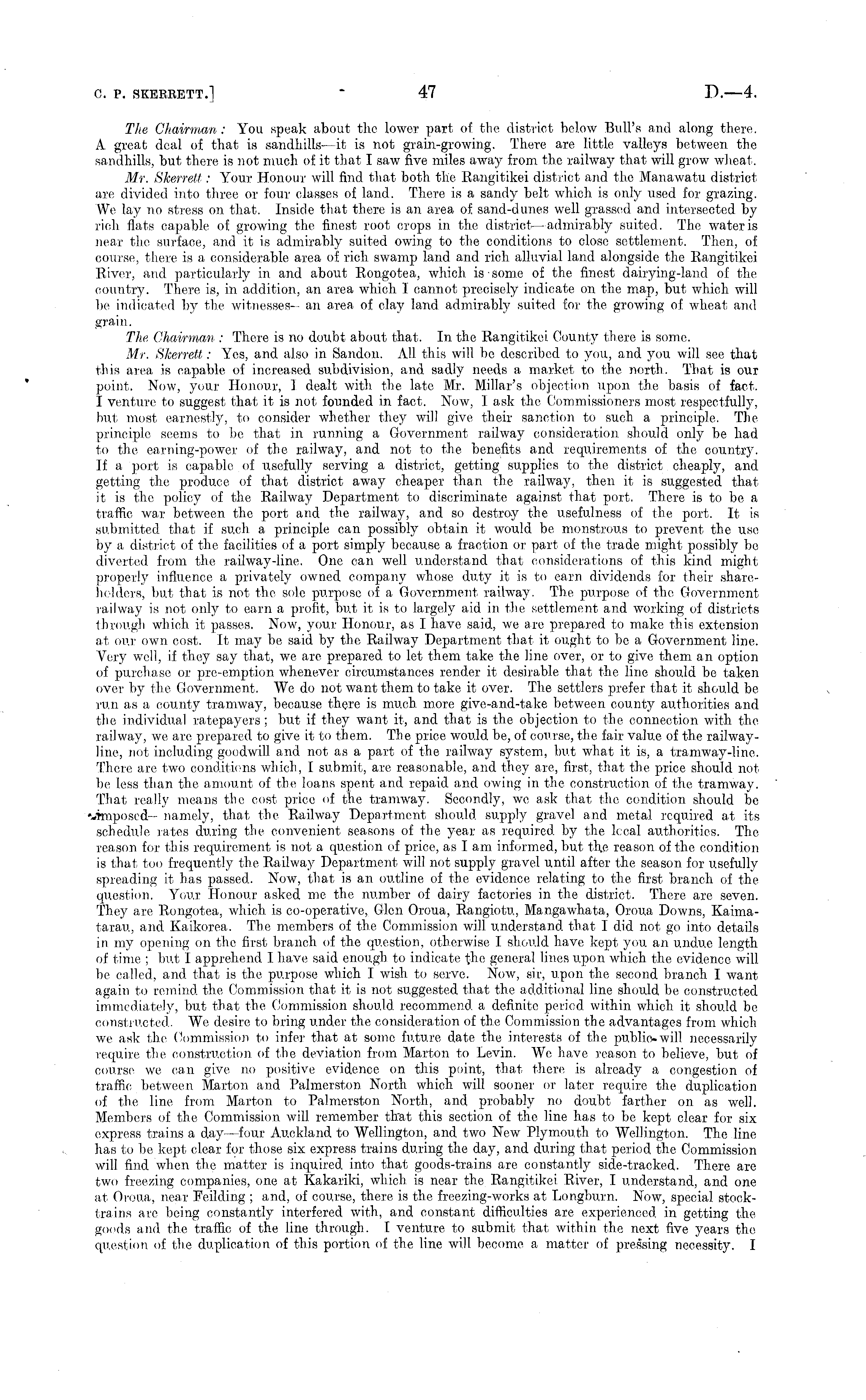 The Chairman: You speak about the lower part of the district below Bull's and along there. A great deal of that is sandhills- it is not grain-growing. There are little valleys between the sandhills, but there is not much of it that I saw five miles away from the railway that will grow wheat. Mr. Skerrett : Your Honour will find that both the Kangitikei district and the Manawatu district are divided into three or four classes of land. There is a sandy belt which, is only used for grazing. We lay no stress on that. Inside that there is an area of sand-dunes well grassed and intersected by rich flats capable of growing the finest root crops in the district—admirably suited. The water is near the surface, and it is admirably suited owing to the conditions to close settlement. Then, of course, there is a considerable area of rich swamp land and rich alluvial land alongside the Kangitikei Eiver, and particularly in and about Bongotea, which, is some of the finest dairying-land of the country. There is, in addition, an area which 1 cannot precisely indicate on the map, but which will be indicated by the witnesses—an area of clay land admirably suited for the growing of wheat and grain. The, Chairman : There is no doubt about that. In the Rangitikei County there is some. Mr. Skerrett: Yes, and also in Sandon. All this will be described to you, and you will see that this area is capable of increased subdivision, and sadly needs a market to the north. That is our point. Now, your Honour, I dealt with the late Mr. Millar's objection upon the basis of fact. I venture to suggest that it is not founded in fact. Now, 1 ask the Commissioners most respectfully, hut most earnest!)', to consider whether they will give their sanction to such a principle. The principle seems to be that in running a Government railway consideration should only be had to the earning-power of the railway, and not to the benefits and requirements of the country. If a port is capable of usefully serving a district, getting supplies to the district cheaply, and getting the produce of that district away cheaper than the railway, then it is suggested that it is the policy of the Eailway Department to discriminate against that port. There is to be a traffic war between the port and the railway, and so destroy the usefulness of the port. It is submitted that if such a principle can possibly obtain it would be monstrous to prevent the use by a district of the facilities of a port simply because a fraction or part of the trade might possibly be diverted from the railway-line. One can well understand that considerations of this kind might properly influence a privately owned company whose duty it is to earn dividends for their shareholders, but that is not the sole purpose of a Government railway. The purpose of the Government railway is not only to earn a profit, but it is to largely aid in the settlement and working of districts through which it passes. Now, your Honour, as I have said, we are prepared to make this extension at our own cost. It may be said by the Eailway Department that it ought to be a Government line. Very well, if they say that, we are prepared to let them take the line over, or to give them an option of purchase or pre-emption whenever circumstances render it desirable that the line should be taken, over by the Government. We do not want them to take it over. The settlers prefer that it should be run as a county tramway, because there is much more give-and-take between county authorities and the individual ratepayers; but if they want it, and that is the objection to the connection with the railway, we are prepared to give it to them. The price would be, of course, the fair value of the railwayline, not including goodwill and not as a part of the railway system, but what it is, a tramway-line. There are two conditions which, I submit, are reasonable, and they are, first, that the price should not be less than the amount of the loans spent and repaid and owing in the construction of the tramway. That really means the cost price of the tramway. Secondly, we ask that the condition should be lamposed— namely, that the Eailway Department should supply gravel and metal required at its schedule rates during the convenient seasons of the year as required by the lecal authorities. The reason for this requirement is not a question of price, as I am informed, but the reason of the condition is that too frequently the Eailway Department will not supply gravel until after the season for usefully spreading it has passed. Now, that is an outline of the evidence relating to the first branch, of the question. Your Honour asked me the number of dairy factories in the district. There are seven. They are Eongotea, which is co-operative, Glon Oroua, Eangiotu, Mangawhata, Oroua Downs, Kaimatarau, and Kaikorea. The members of the Commission will understand that I did not go into details in my opening on the first branch of the question, otherwise I should have kept you an undue length of time ; but I apprehend 1 have said enough to indicate the general lines upon which the evidence will be called, and that is the purpose which I wish to servo. Now, sir, upon the second branch I want again to remind the Commission that it is not suggested that the additional line should be constructed immediately, but that the Commission should recommend a definite period within which it should be constructed. We desire to bring under the consideration of the Commission the advantages from which we ask the Commission to infer that at some future date the interests of the public-will necessarily require the construction of the deviation from Marton to Levin. We have reason to believe, but of course we can give no positive evidence on this point, that there, is already a congestion of traffic between Marton and Palmerston North which will sooner or later require the duplication of the line from Marton to Palmerston North, and probably no doubt farther