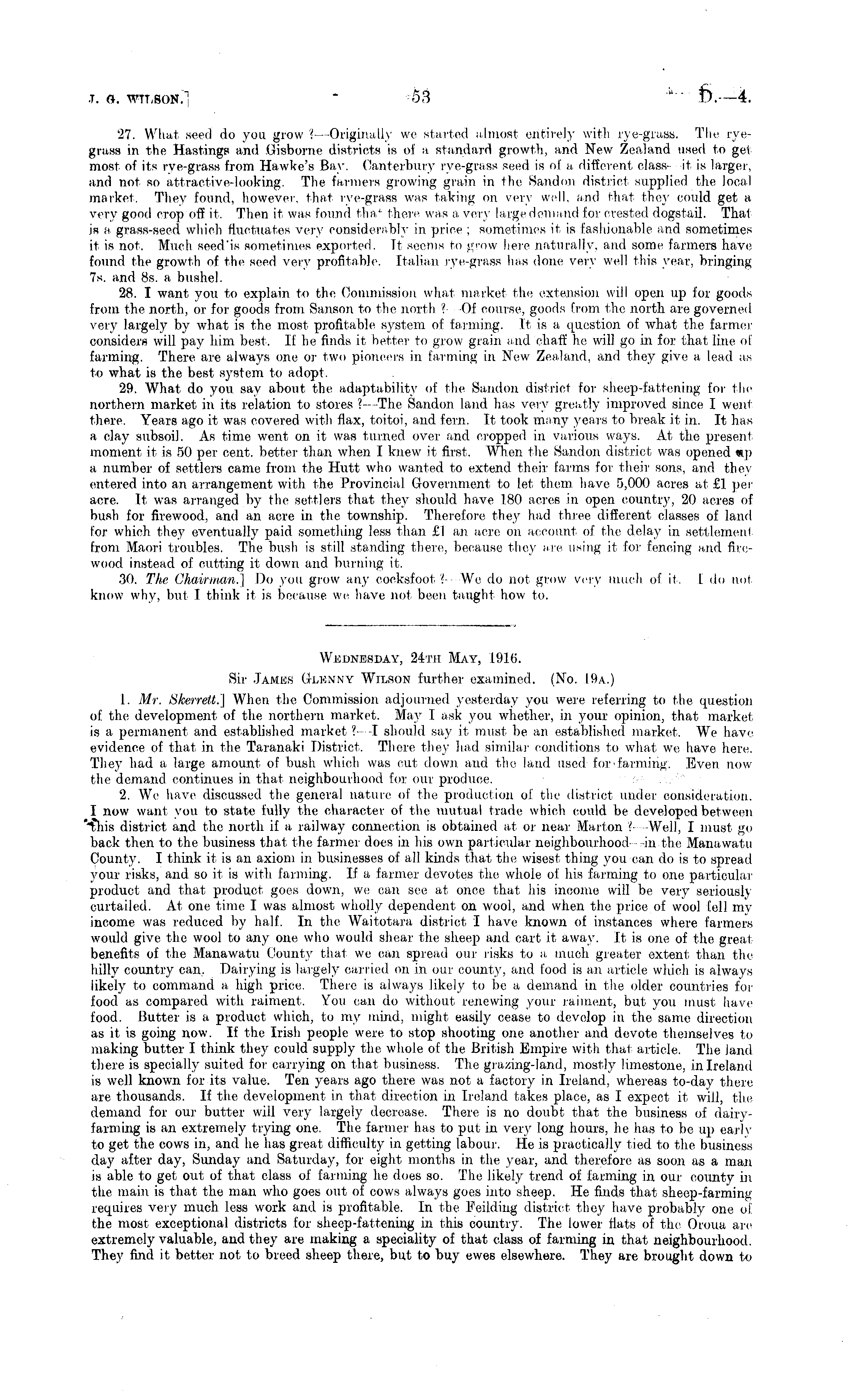 Wednesday, 24th May, L 916. Sir James Glenny Wilson further examined, (No. Ut.\.) 1. Mr. Skerrett.] When the Commission adjourned yesterday you were referring to the question of the development of the northern market. May I ask you whether, in your opinion, that market is a permanent and established market ?■ I should say it must be at established market; We have evidence of that in the Taranaki District. There they had similar conditions to what we have here. They had a large amount of bush which was cut down and Hie land used for- farming. Even now the demand continues in that neighbourhood for our produce. 2. We have discussed the general nature of the production of tie district under consideration. I now want you to state fully the character of the mutual trade which could be developed between '"fliis district and the north if a railway connection is obtained at or near Marton ?■ -Well, I must go back then to the business that the farmer does in his own particular neighbourhood in the Manawatu County. I think it is an axiom in businesses of all kinds that the wisest thing you can do is to spread 3'our risks, and so it is with farming. If a, farmer devoles ilie whole of his farming to one particular product and that product goes down, we can see at once that, his income will be very seriously curtailed. At one time I was almost wholly dependent on wool, and when the price of wool fell my income was reduced by half. In the Waitotara district I have known of instances where farmers would give the wool to any one who would shear the sheep and cart il away. It is one of the greal benefits of the Manawatu County that we can spread our risks to a much greater extent than the hilly country can, Dairying is largely carried on in our county, and food is an article, which is always likely to command a high price. There is always likely to be a demand in Ihe older countries for food as compared with raiment. You can do without renewing your raiment, but you miisi have food. Butter is a product which, to my mind, might easily cease to develop in the same direction as it is going now. If the Irish people were to stop shooting one another and devote themselves to making butter I think they could supply the whole of the British Empire with thai article. The land there is specially suited tor carrying on that business. The grazing-land, mostly limestone, in Ireland is well known for its value. Ten years ago there was not a factory in Ireland, whereas to-day there are thousands. If the development in that direction in Ireland takes place, as I expect it- will, the demand for our butter will very largely decrease. There is no doubt that the business of dairyfarming is an extremely trying one. The farmer has to put in long hours, he has to be up early to get the cows in, and he has greal difficulty in getting labour. He is practically tied to the business day after day, Sunday and Saturday, for eight months in the year, and therefore as soon as a man is able to get out of that class of farming he does so. The. likely trend of. farming in our county in the main is that the man who goes out of cows always goes into sheep. He finds that sheep-farming requires very much less work and is profitable. In the Feuding district they have probably one of the most exceptional districts for sheep-fattening in this country. The lower flats of the Orotia are extremely valuable, and they are making a speciality of that class of farming in that neighbourhood. They find it better not to breed sheep there, but to buy ewes elsewhere. They are brought down to