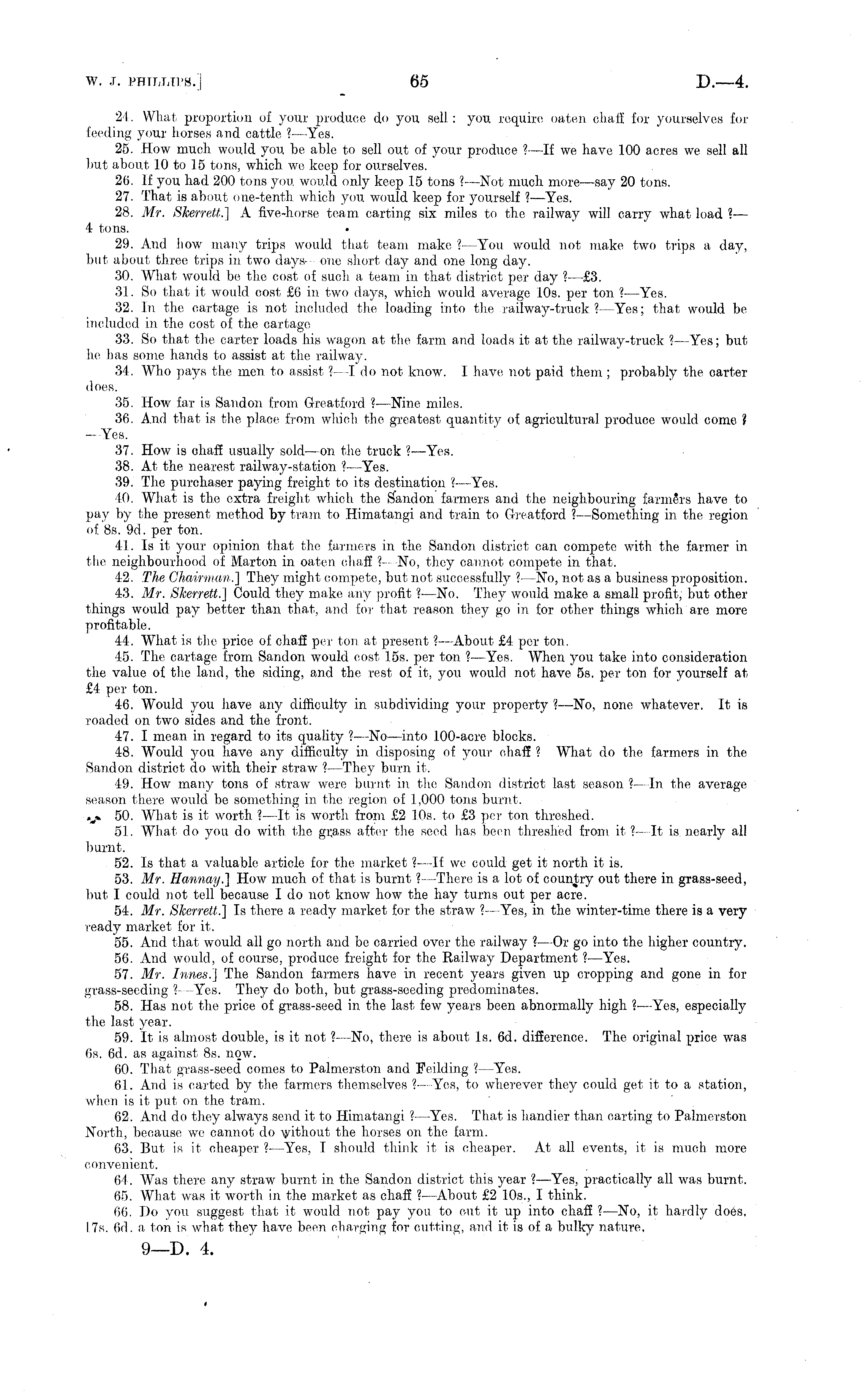 21. What proportion of your produce do you sell : you, require oaten chaff for yourselves for feeding your horses and cattle ?—Yes. 25. How much would you be able to sell out of your produce ?— If we have 100 acres we sell all but about 10 to 15 tons, which we keep for ourselves. 26. If you had 200 tons you would only keep 15 tons ? —Not much more —say 20 tons. 27. That is about one-tenth which you would keep for yourself ? —Yes. 28. Mr. Skerrelt.] A five-horse team carting six miles to the railway will carry what load ?— 4 tons. • 29. And how many trips would that team make ? —You would not make two trips a day, but about three trips in two days- one short day and one long day. 30. What would be the cost of such a team in that district per day ?—£3. 31. So that it would cost £6 in two days, which would average 10s. per ton ?—Yes. 32. In the cartage is not included the loading into the railway-truck?— Yes; that would be included in the cost of the cartage 33. So that the carter loads his wagon at the farm and loads it at the railway-truck ? —Yes; but he has some hands to assist at the railway. 34. Who pays the men to assist ?—I do not know. I have not paid them ; probably the carter does. 35. How far is Sand on from Greatford ? —Nine miles. 36. And that is the place from which the greatest quantity of agricultural produce would come ? —Yes. 37. How is ohaff usually sold—on the truck ?—Yes. 38. At the nearest railway-station ? —Yes. 39. The purchaser paying freight to its destination ? -Yes. 40. What is the extra freight which the Sandon farmers and the neighbouring farmers have to pay by the present method by tram to Himatangi and train to Greatford ? —Something in the region of Bs. 9d. per ton. 41. Is it your opinion that the farmers in the Sandon district can compete with the farmer in the neighbourhood of Marton in oaten ohaff ?- No, they cannot compete in that. 42. The Chairman.] They might compete, but not successfully ?—No, not as a business proposition. 43. Mr, Skerrett.] Could they make any profit ? —No. They would make a small profit, but other things would pay better than that, and for that reason they go in for other things which are more profitable. 44. What is the price of chaff per ton at present ?--■ About £4 per ton. 45. The cartage from Sandon would cost 15s. per ton ? —Yes. When you take into consideration the value of the land, the siding, and the rest of it, you would not have ss. per ton for yourself at £4 per ton. 46. Would you have any difficulty in subdividing your property ?—No, none whatever. It is roaded on two sides and the front. 47. I mean in regard to its quality ?—No—into 100-acre blocks. 48. Would you have any difficulty in disposing of your chaff ? What do the farmers in the Sandon district do with their straw ?—They burn it. 49. How many tons of straw were burnt in the Sandon district last season? —In the average season there would be something in the region of 1,000 tons burnt. v 50. What is it worth %— lt is worth from £2 10s. to £3 per ton threshed. 51. What do you do with the grass after the seed has been threshed from it ?--It is nearly all burnt. 52. Is that a valuable article for the market ?—lf we could get it north it is. 53. Mr. Hannoy.l How much of that is burnt ? —There is a lot of country out there in grass-seed, but I could not tell because I do not know how the hay turns out per acre. 54. Mr. SJcerrett.] Is there a ready market for the straw ? —Yes, in the winter-time there is a very ready market for it. 55. And that would all go north and be carried over the railway ? —Or go into the higher country. 56. And would, of course, produce freight for the Railway Department ?—Yes. 57. Mr. Innes.] The Sandon farmers have in recent years given up cropping and gone in for grass-seeding ? —Yes. They do both, but grass-seeding predominates. 58. Has not the price of grass-seed in the last few years been abnormally high ? —Yes, especially the last year. 59. It is almost double, is it not ? —No, there is about Is. 6d. difference. The original price was 6s. 6d. as against Bs. now. 60. That grass-seed comes to Palmerston and Fcilding ?—Yes. 61. And is carted by the farmers themselves ?- Yes, to wherever they could get it to a station, when is it put on the tram. 62. And do they always send it to Himatangi ?—Yes. That is handier than carting to Palmerston North, because we cannot do without the horses on the farm. 63. But is it cheaper ? —Yes, I should think' it is cheaper. At all events, it is much more convenient. 64. Was there any straw burnt in the Sandon district this year ?—Yes, practically all was burnt. 65. What was it worth in the market as chaff ? —About £2 10s., I think. (i(i. Do you suggest that it would not pay you to out it up into chaff ? —No, it hardly does. 17s. 6d. a ton is what they have been charging for cutting, and it is of a bulky nature.