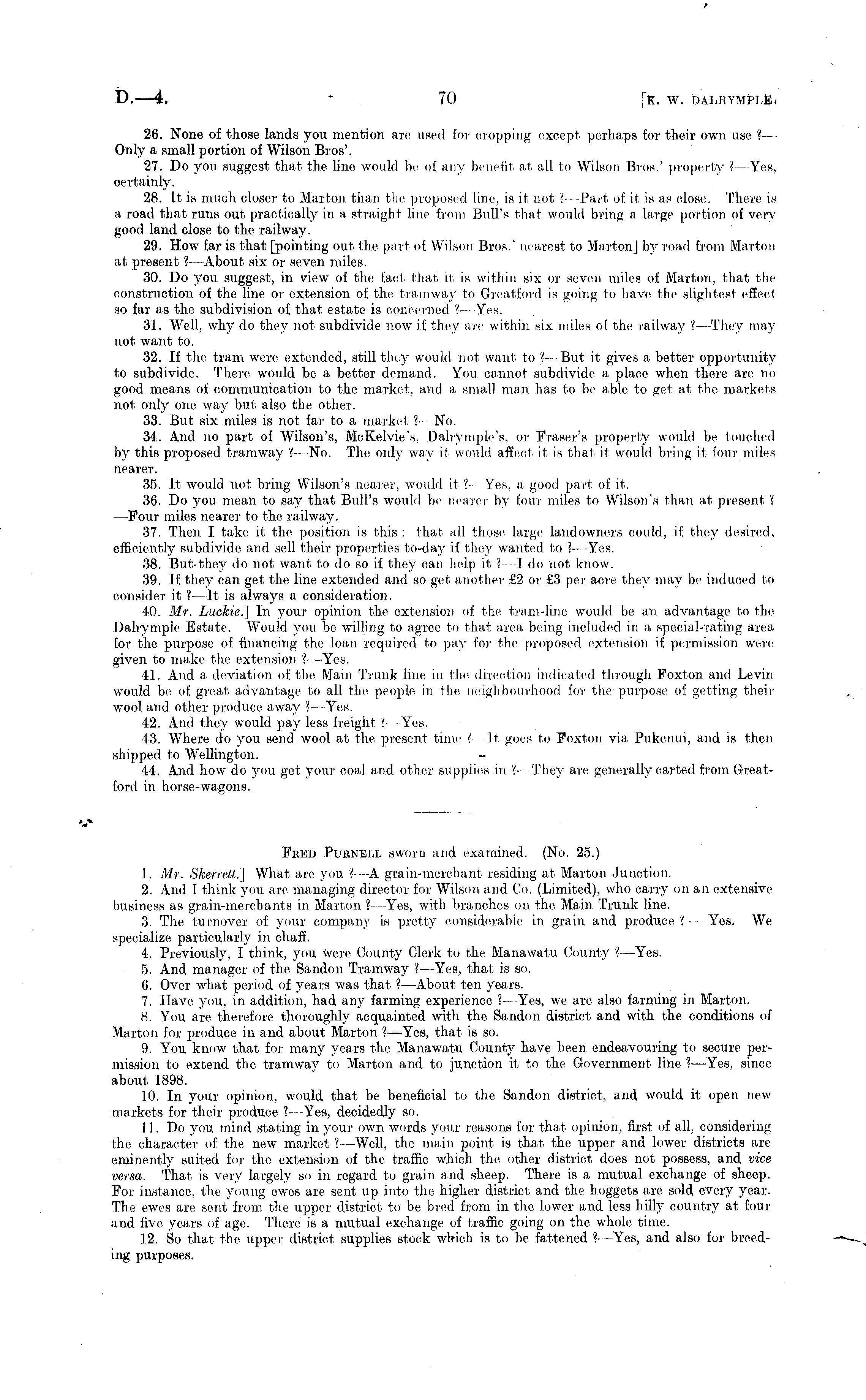 Fred Pubnell sworn and examined. (No. 25.) .1. Mr. SkerreU.\ What are you ?■ —A grain-merchant residing at Marton Junction. 2. And I think you are managing director for Wilson and Co. (Limited), who carry on an extensivebusiness as grain-merchants in Marton ?■ —Yes, with, branches on the Main Trunk line. 8. The turnover of your company Ls pretty considerable in grain and produce '{ — Yes. We specialize particularly in chaff. 4. Previously, I think, you were County Clerk to the Manawatu County ?—Yes. 5. And manager of the Sandon Tramway ?—Yes, that is so. 6. Over what period of years was that ?—About ten years. 7. Have you, in addition, had any farming experience ? —Yes, we are also farming in Marton. 8. You are therefore thoroughly acquainted with the Sandon district and with the conditions of Marton for produce in and about Marton ?—Yes, that is so. 9. You know that for many years the Manawatu County have been endeavouring to secure permission to extend the tramway to Marton and to junction it to the Government line ? —Yes, since about 1898. 10. In your opinion, would that be beneficial to the Sandon district, and would it open new markets for their produce ?—Yes, decidedly so. I 1. Do you mind stating in your own words your reasons for that opinion, first of all, considering the character of the new market ? —Well, the main point is that the upper and lower districts are eminently suited for the extension of the traffic which the other district does not possess, and vice versa. That is very largely so in regard to grain and sheep. There is a mutual exchange of sheep. For instance, the young ewes are sent up into the higher district and the hoggets are sold every year. The ewes are sent from the upper district to be bred from in the lower and less hilly country at four and five years of age. There is a mutual exchange of traffic going on the whole time. 12. So that the upper district supplies stock winch is to be fattened ?— Yes, and also for breeding purposes.