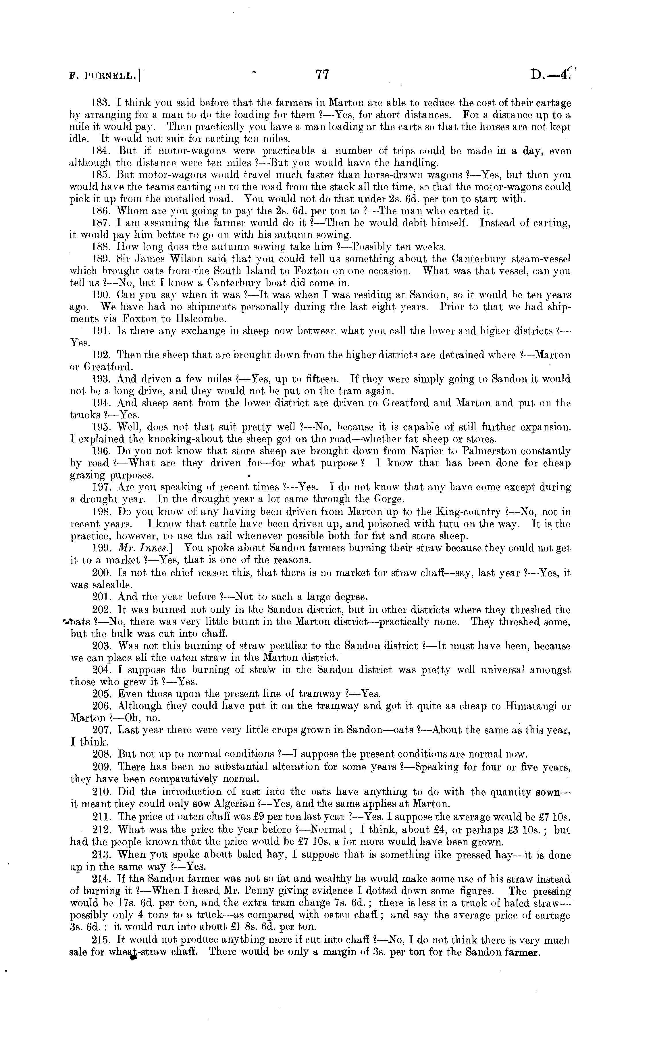 1.83. I think you said before that the farmers in Marton are able to reduce the cost of their cartage by arranging for a man to do the loading for them ? —Yes, for short distances. For a distance up to a mile it would pay. Then practically you have a man loading at the carts so that the horses are not kept idle. It would not suit for carting ten miles. 184. But if motor-wagons were practicable a number of trips could be made in a day, even although the distance were ten miles ? -But you would have the handling. 185. But motor-wagons would travel much faster than horse-drawn wagons ?—Yes, but then you would have the. teams carting on to the road from the stack all the time, so that the motor-wagons could pick it up from the metalled road. You would not do that under 2s. 6d. per ton to start with. .186. Whom are you going to pay the 2s. 6d. per ton to ? --The man who carted it. 187. lam assuming the farmer would do it ? —Then he would debit himself, instead of carting, it would pay him better to go on with his autumn sowing. 188. How long does the autumn, sowing take him. ?— Possibly ten weeks. 189. Sir James Wilson said that you could tell us something about the Canterbury steam-vessel which brought oats from the South Island to Foxton on one occasion. What was that vessel, can you tell us ? —No, but I know a Canterbury boat did come in. 1.90. Can you say when it was ? —it was when I was residing at Sandon, so it would be ten years ago. We have had no shipments personally during the last eight years. Prior to that we had shipments via Foxton to Hal.combe. 191. Is there any exchange in sheep now between what you call the lower and higher districts ?— Yes. .192. Then the sheep that are brought down from the higher districts are detrained where V —Marton or Greatford. 103. And driven a few miles ?—Yes, up to fifteen. If they were simply going to Sandon it would not be a long drive, and they would not be put on the tram again. .194. And sheep sent from the lower district are driven to Greatford and Marton and put on the trucks ?■—Yes. 195. Well, does not that suit pretty well ? —No, because it is capable of still further expansion. I explained the knooking-about the sheep got on the road—-whether fat sheep or stores. 196. Do you not know that store sheep are brought down from Napier to Palmerston constantly by road ? —What are they driven for—for what purpose ? 1 know that has been done for cheap grazing purposes. 197. Are you speaking of recent times ?— Yes. 1. do not know that any have come except during a drought year. In the drought year a lot came through the Gorge. 198. Do you know of any having been driven from Marton up to the King-country ? —No, not in recent years. 1 know that cattle have been driven up, and poisoned with tutu on the way. it is the practice, however, to use the rail whenever possible both for fat and store sheep. 199. Mr. Innes.] You spoke about Sandon farmers burning their straw because they could not get it to a market ? —Yes, that is one of the reasons. 200. Is not the chief reason this, that there is no market for straw chaff —say, last year ? —Yes, it was saleable.. 20.1. And the year before ?—Not to such a large degree. 202. it was burned not only in the Sandon district, but in other districts where they threshed the •-Tiats ? —No, there was very little burnt in the Marton district —practically none. They threshed some, but the bulk was cut into chaff. 203. Was not this burning of straw peculiar to the Sandon district ?—it must have been, because we can place all the oaten straw in the Marton. district. 204. I suppose the burning of stra\v in the Sandon district was pretty well universal amongst those who grew it ?—Yes. 205. Even those upon the present line of tramway ?—Yes. 206. Although they could have put it on the tramway and got it quite as cheap to Himatangi or Marton ? —Oh, no. 207. Last year there were very little crops grown in Sandon —oats ?—About the same as this year, I think. 208. But not up to normal conditions % —I suppose the present conditions are normal now. 209. There has been no substantial alteration for some years ? —Speaking for four or five years, they have been comparatively normal. 210. Did the introduction of rust into the oats have anything to do with the quantity sown — it meant they could only sow Algerian ? —Yes, and the same applies at Marton. 211. The price of oaten chaff was £9 per ton last year ? —Yes, I suppose the average would be £7 10s. 212. What was the price the year before ?—Normal ; 1 think, about £4, or perhaps £3 10s. ; but had the people known that the price would be £7 10s. a lot more would have been grown. 213. When you spoke about baled hay, 1 suppose that is something like pressed hay—it is done up in the same way ? —Yes. 214. If the Sandon farmer was not so fat and wealthy he would make some use of his straw instead of burning it ? —When I heard Mr. Penny giving evidence I dotted down some figures. The pressing would be 17s. 6d. per ton, and the extra tram charge 7s. 6d- ; there is less in a truck of baled straw — possibly only 4 tons to a truek —as compared with oaten chaff; and say the average price of cartage 3s. 6d. : it would run into about £1 Bs. 6d. per ton. 215. it would not produce anything more if cut into chaff ?—No, 1 do not think there is very much sale for chaff. There would be only a margin of 3s. per ton for the Sandon farmer.