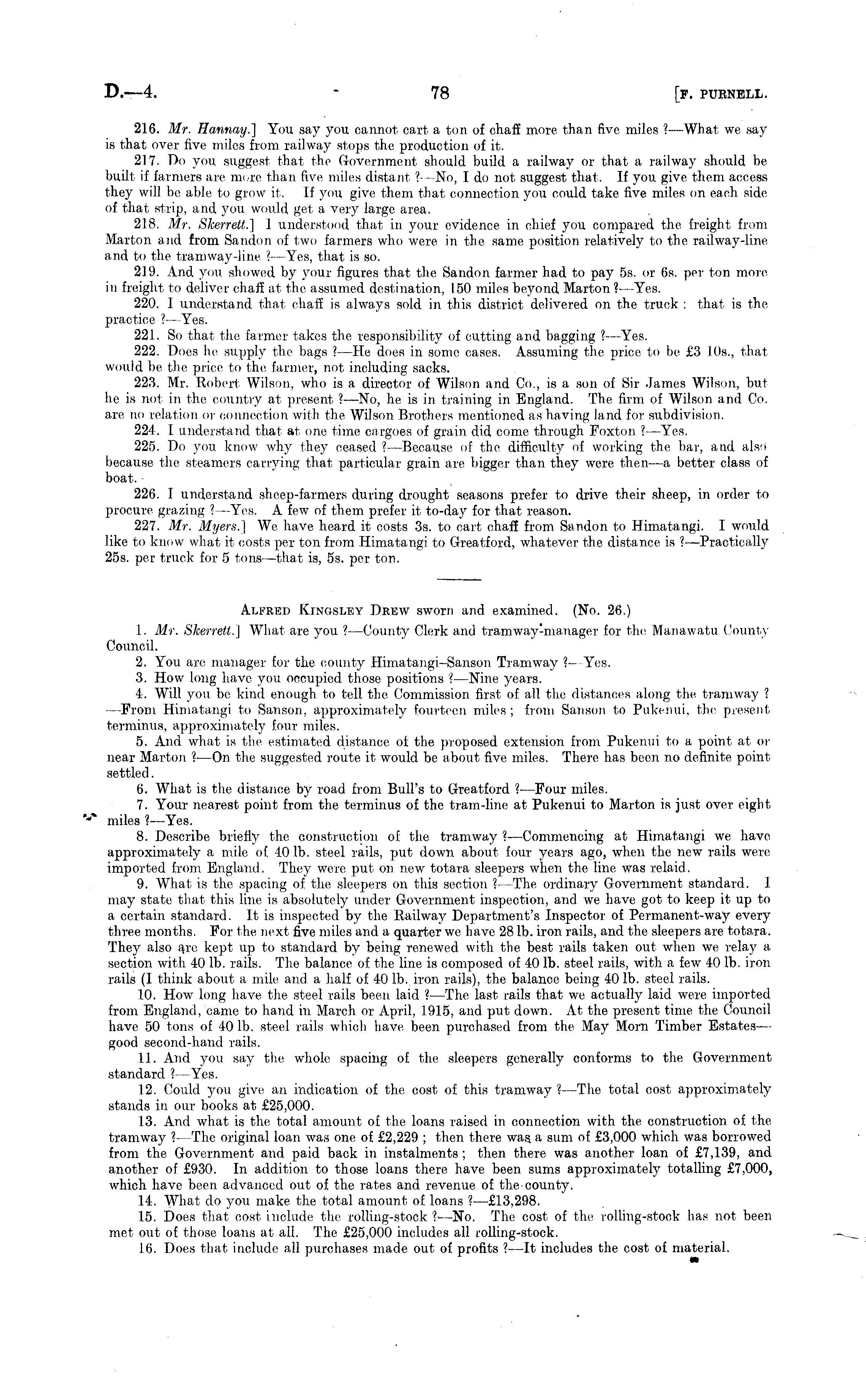 216. Mr. Hannay.] You say you cannot cart a ton of chaff more than five miles ? —What we say is that over five miles from railway stops the production of it. 217. Do you suggest, that the Government should build a railway or that a railway should be built if farmers are more than five miles distant ?- -No, Ido not suggest that. If you give them access they will be able to grow it. If you give them that connection you could take five miles on each side of that strip, and you would get a very large area. 218. Mr. Skerrett.] 1 understood that in your evidence in chief you compared the freight from Marton and from Sandon of two farmers who were in the same position relatively to the railway-line and to the tramway-line ? —Yes, that is so. 219. And you showed by your figures that the Sandon farmer had to pay ss. or 6s. per ton more in freight to deliver chaff at the assumed destination, 150 miles beyond Marton? —Yes. 220. 1 understand that chaff is always sold in this district delivered on the truck : that is the practice ?—Yes. 221. So that the farmer takes the responsibility of cutting and bagging ? —Yes. 222. Does he supply the bags ? —He does in some cases. Assuming the price to be £3 10s., that would be the price to the farmer, not including sacks. 223. Mr. Robert Wilson, who is a director of Wilson and Co., is a son of Sir James Wilson, but he is not in the country at present ? —No, he is in training in England. The firm of Wilson and Co. are no relation or connection with the Wilson Brothers mentioned as having land for subdivision. 224. I understand that at one time cargoes of grain did come through Foxton ? —Yes. 225. Do you know why they ceased ? —Because of the difficulty of working the bar, and also because the steamers carrying that particular grain are bigger than they were then—a better class of boat. 226. I understand sheep-farmers during drought seasons prefer to drive their sheep, in order to procure grazing ?—Yes. A few of them prefer it to-day for that reason. 227. Mr. Myers.'] We have heard it costs 3s. to cart chaff from Sandon to Himatangi. I would like to know what it costs per ton from Himatangi to Greatford, whatever the distance is ?—Practically 255. per truck for 5 tons —that is, ss. per ton. Alfred Kingsley Drew sworn and examined. (No. 26.) 1. Mr. Skerretl.) What are you ? —County Clerk and tramway-manager for the Manawatu County Council. 2. You are manager for the county Himatangi-Sanson Tramway ?— Yes. 3. How long have you occupied those positions ?—Nine years. 4. Will you be kind enough to tell the Commission first of all the distances along the tramway ? —From Himatangi to Sanson, approximately fourteen miles; from Sanson to Pukenui, the present terminus, approximately four miles. 5. And what is the estimated distance ot the proposed extension from Pukenui to a point at or near Marton ?■—On the suggested route it would be about five miles. There has been no definite point; settled. 6. What is the distance by road from Bull's to Greatford ?—Four miles. 7. Your nearest point from the terminus of the tram-line at Pukenui to Marton is just over eight *-*' miles?— Yes. 8. Describe briefly the construction of the tramway ? —Commencing at Himatangi we have approximately a mile of. 40 lb. steel rails, put down about four years ago, when the new rails were imported from England. They wore put on new totara sleepers when the line was relaid. 9. What is the spacing of the sleepers on this section ? —The ordinary Government standard. I may state that this line is absolutely under Government inspection, and we have got to keep it up to a certain standard. It is inspected by the Railway Department's Inspector of Permanent-way every three months. For the next five miles and a quarter we have 28 lb. iron rails, and the sleepers are totara. They also a,re kept up to standard by being renewed with the best rails taken out when we relay a section with 40 lb. rails. The balance of the line is composed of 40 lb. steel rails, with a few 40 lb. iron rails (I think about a mile and a half of 40 lb. iron rails), the balance being 40 lb. steel rails. 10. How long have the steel rails been laid ? —The last rails that we actually laid were imported from England, came to hand in March or April, 1915, and put down. At the present time the Council have 50 tons of 40 lb. steel rails which have been purchased from the May Morn Timber Estates — good second-hand rails. 11. And you say the whole spacing of the sleepers generally conforms to the Government standard ? —Yes. 12. Could you give an indication of the, cost of this tramway?— The total cost approximately stands in our books at £25,000. 13. And what is the total amount o£ the loans raised in connection with the construction of the tramway ? —The original loan was one of £2,229 ; then there was. a sum of £3,000 which was borrowed from the Government and paid back in instalments ; then there was another loan of £7,139, and another of £930. In addition to those loans there have been sums approximately totalling £7,000, which have been advanced out of the rates and revenue of the county. 14. What do you make the .total amount of loans ?—£13,298. 15. Does that cost include the rolling-stock V —No. The cost of the rolling-stock has not been met out of those loans at all. The £25,000 includes all rolling-stock. 1.6. Does that include all purchases made out of profits ?—lt includes the cost of material.