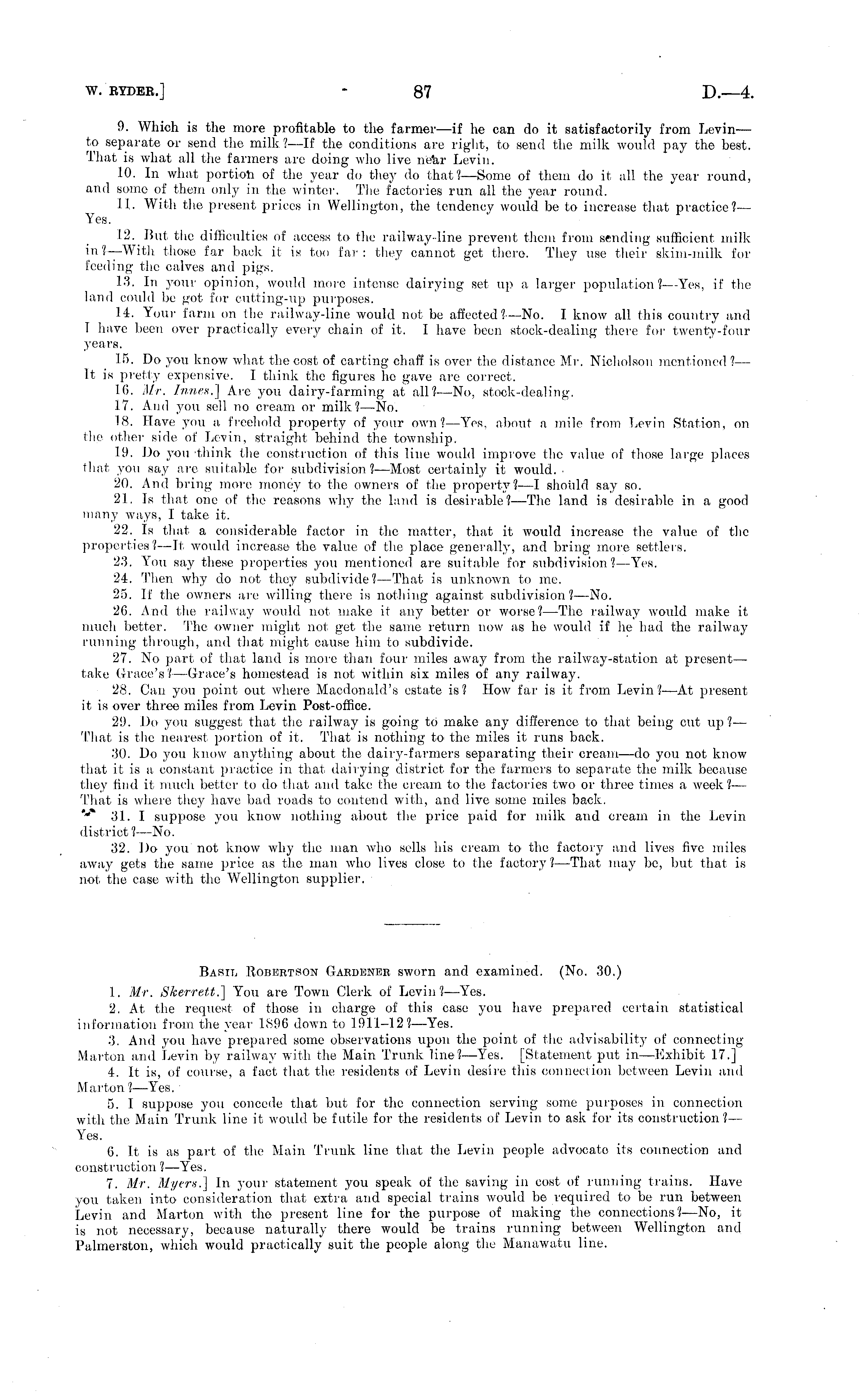 BastT; Robertson Gardener sworn and examined. (No. 30.) 1. Mr. Skerrett.] You are Town Clerk of Levin?— Yes. 2. At the request of (hose in charge of this case you have prepared certain statistical information from the year 1896 down to 1911-12? — Yes. 3. And you have prepared some observations upon the point of the advisability of connecting Marton and Levin by railway with the Main Trunk line? — Yes. [Statement put in — Exhibit 17.] 4. It is, of course, a fact that the residents of Levin desire this connection between Levin and Marton ?—Yes. ■ 5. I suppose you concede that but for the connection serving some purposes in connection with the Main Trunk line it would be futile for the residents of Levin to ask for its construction?— Yes. G. It is as part of the Main Trunk line that the Levin people advocate its connection and construction ?—Yes. 7. Mr. Myers.] In your statement you speak of the saving in cost of running (rains. Have you taken into consideration that extra and special trains would bo required to be run between Levin and Marton with tho present line for the purpose of making the connections? —No, it is not necessary, because naturally there would be trains running between Wellington and Palmerston, which would practically suit the people along the Manawatu line.